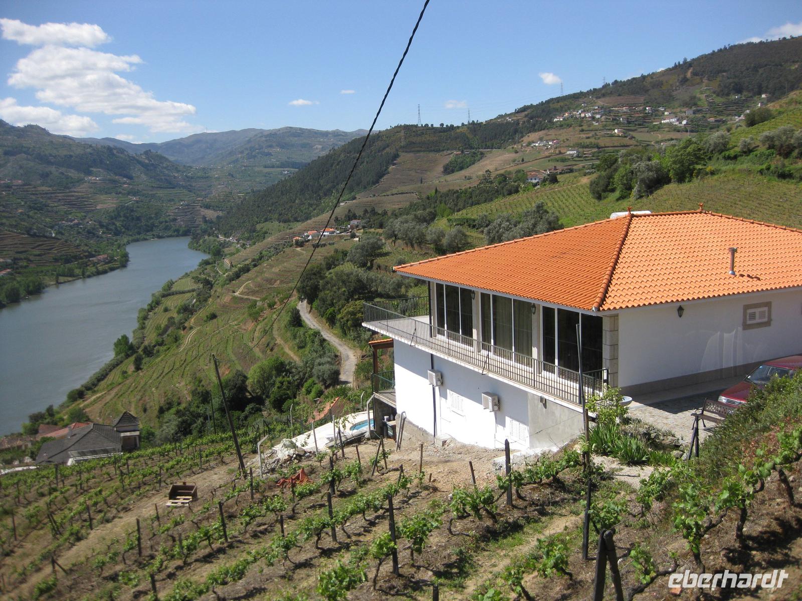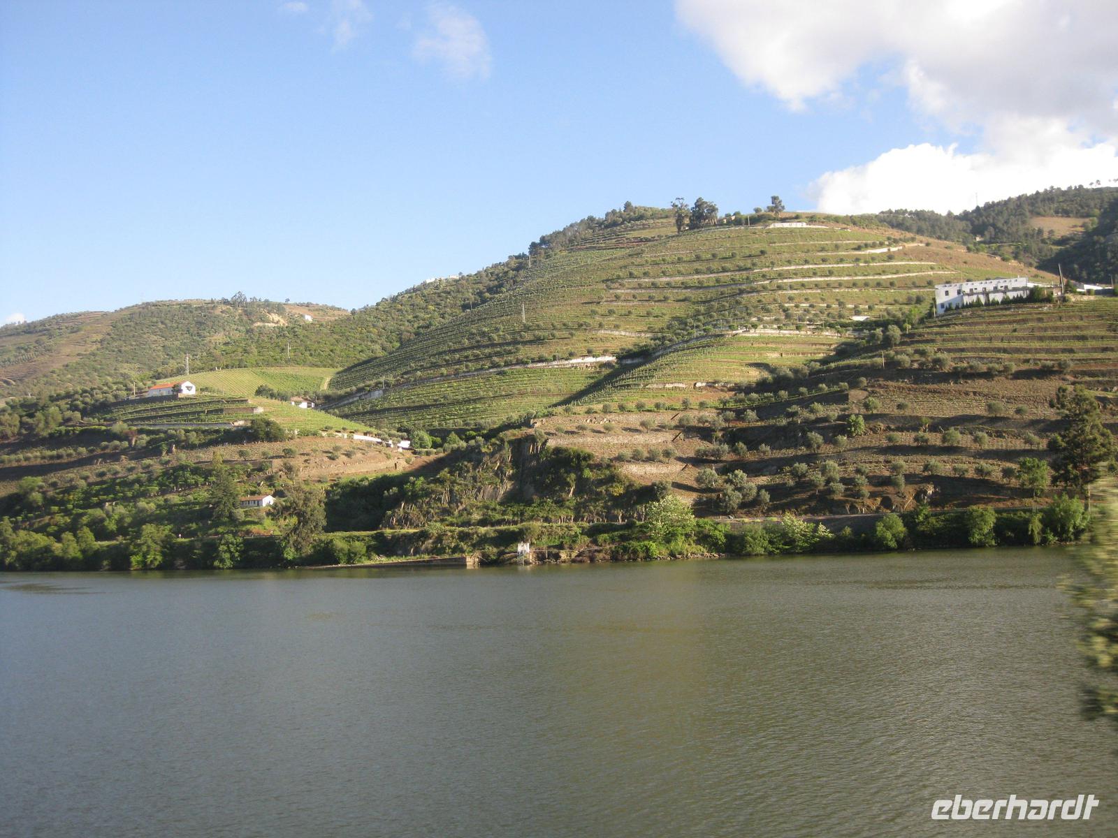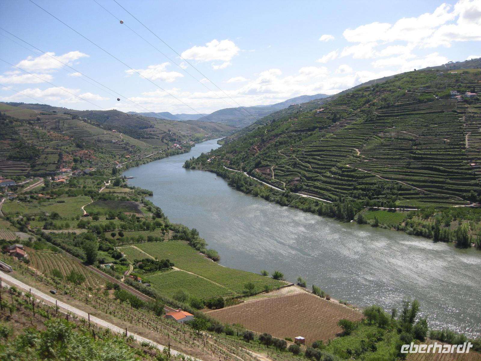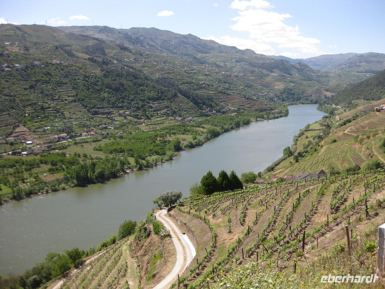 Dann kommen wir in das Weinanbaugebiet am Douro, es wurde zum Weltkulturerbe der Unesco erklärt. Hier wachsen die Rebstöcke für den Portwein. Das Zusammenwirken der Schieferfelsen im Boden, die hier vertikal angeordnet sind, der Fluß mittendrin und die vielen Sonnentage im Jahr begünstigen dieses Gebiet und lassen die Weintrauben für den Portwein reifen. Am Aussichtspunkt halten wir und genießen den Blick über diese wundervolle Landschaft. Überall sind Qintas, die für diese Gegend typischen Herrenhäuser, zu sehen.