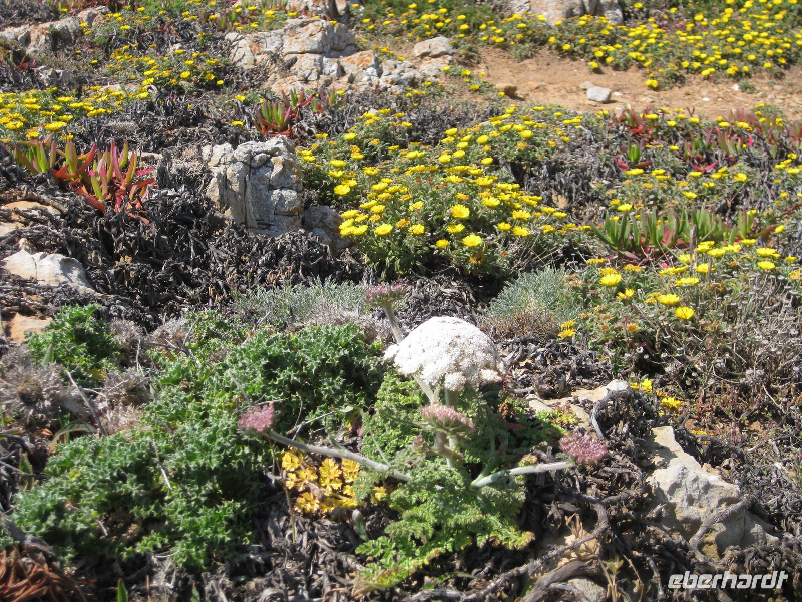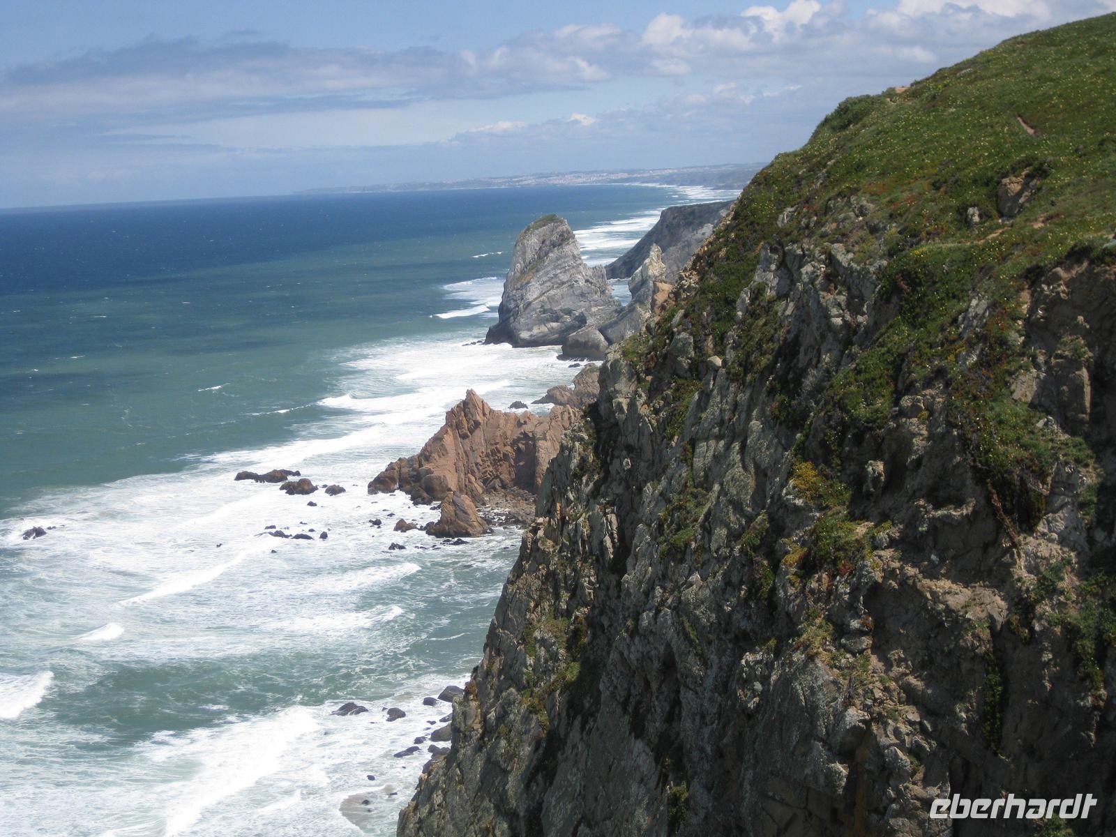 Dann geht unsere Fahrt weiter durch eine sehr reizvolle Landschaft bis zum westlichsten Punkt von Europa, dem Cabo da Roca an der Atlantikküste. Wir lassen uns die Atlantikbrise um die Nase wehen und genießen die tollen Ausblicke auf die Küste und den Ozean. Mittagsblumen, Steinnelken und andere Blumen, die das rauhe Klima vertragen, schmücken dieses besondere Fleckchen Erde. Wir halten diesen Moment mit einem Foto von unserer Reisegruppe fest.