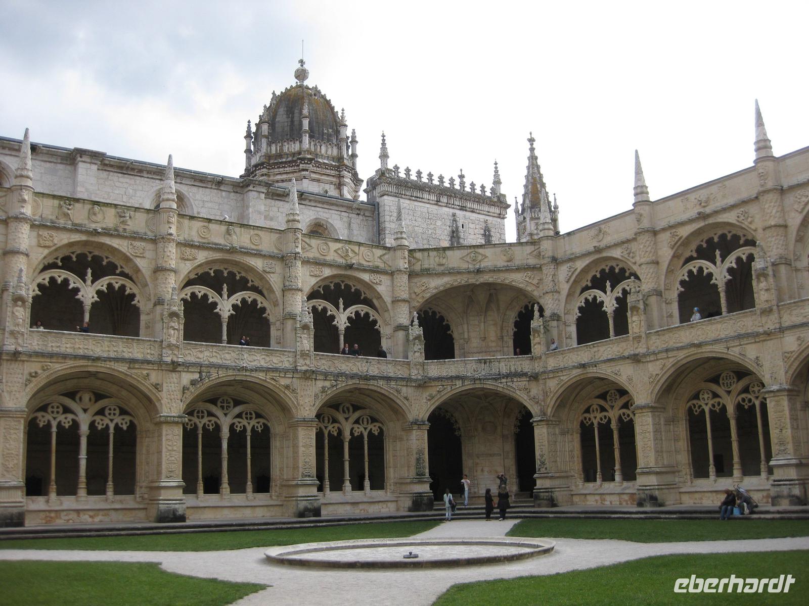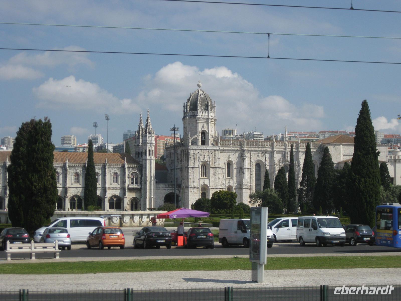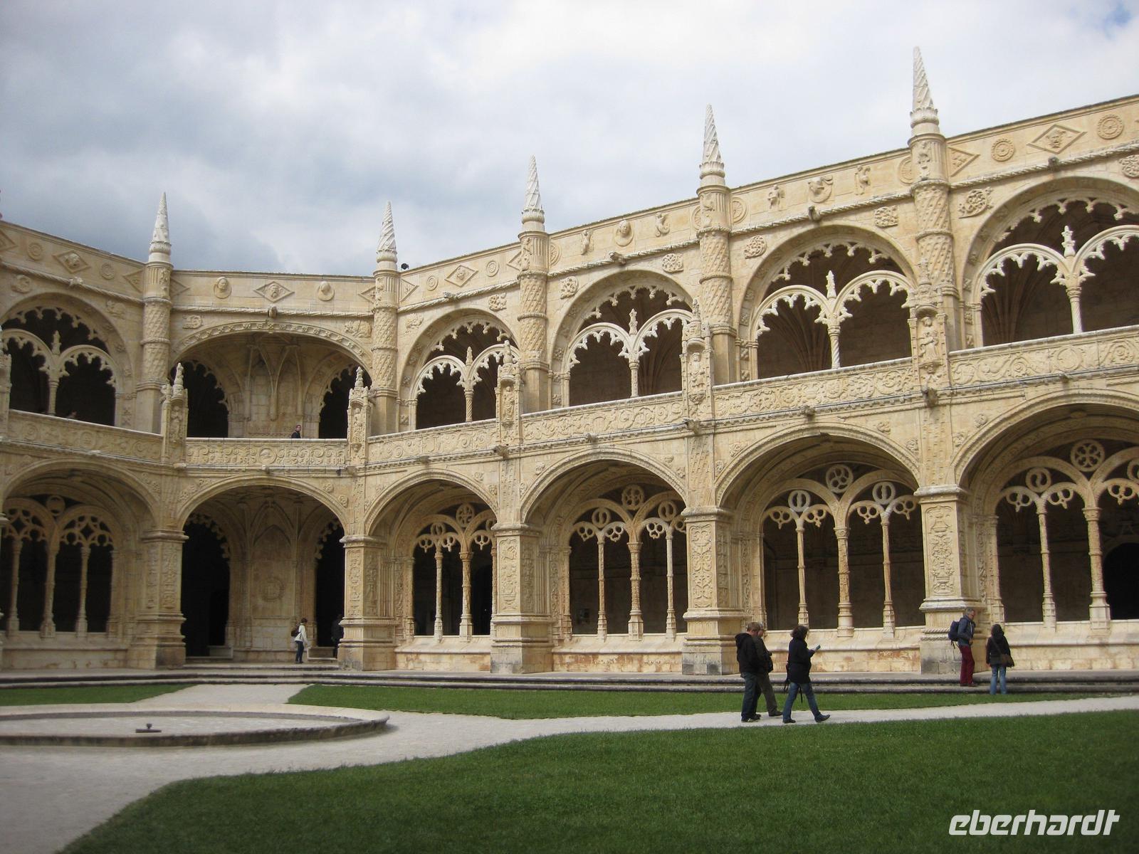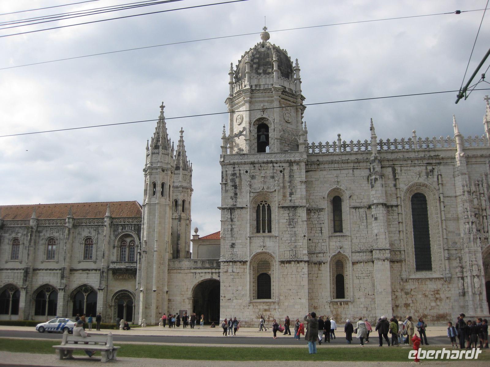 Nach 15.00 Uhr fahren wir weiter in Richtung Lissabon. Wir fahren durch Estoril, das sich gleich an Cascais anschließt und dann geht es an der Atlantikküste und später am Tejoufer entlang bis zum Mosteiro dos Jeronimos im Stadtteil Belem von Lissabon. Wir besichtigen diese gewaltige Anlage mit ihrer 300 m breiten Fassadenfront, der Hallenkirche und dem doppelstöckigen Kreuzgang. Es ist ein Bauwerk der Manuelinik, einer portugisischen Variante der Spätgotik. Das Mosteiro dos Jernimos beherbergt die Sarkophage von dem Seefahrer Vasco da Gama, dem Nationaldichter Luis de Camoes und einigen portugisischen Königen. Eine besondere Sehenswürdigkeit ist der doppelstöckige Kreuzgang. Gut dass wir Elsa wieder "im Ohr" haben, denn sonst wäre es schwierig, Elsas Erläuterungen zu hören.