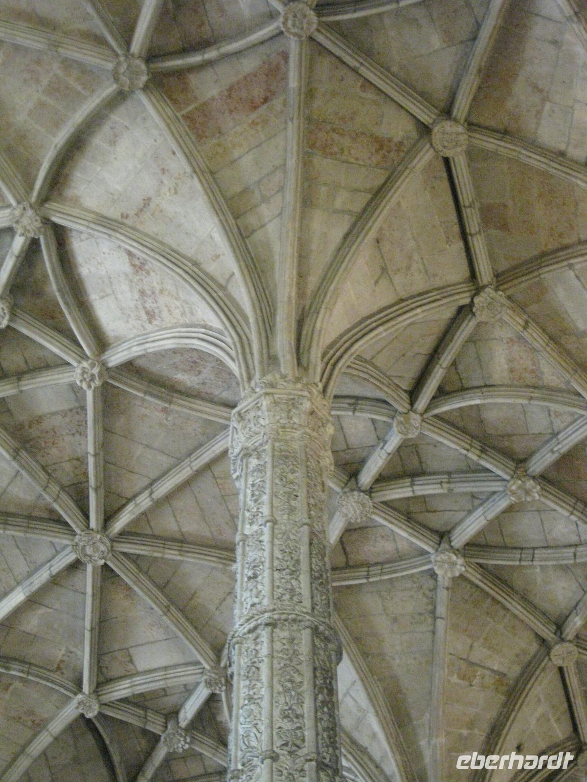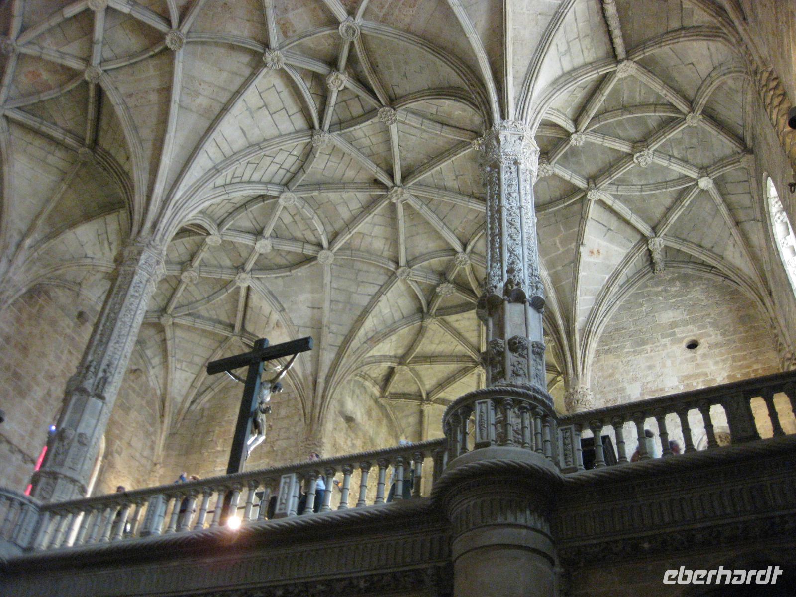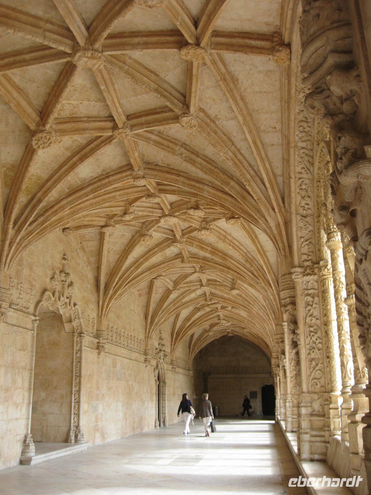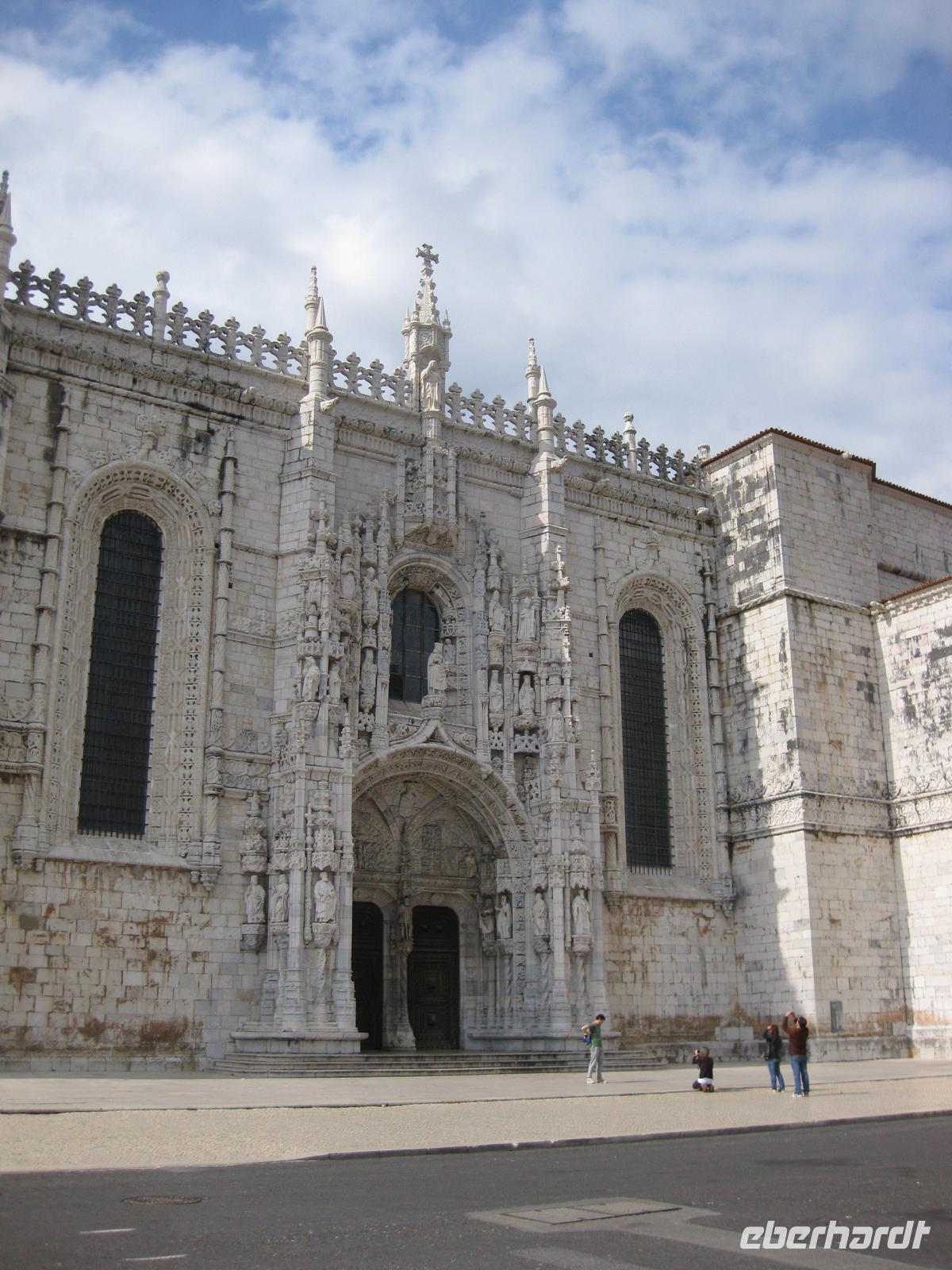 Nach 15.00 Uhr fahren wir weiter in Richtung Lissabon. Wir fahren durch Estoril, das sich gleich an Cascais anschließt und dann geht es an der Atlantikküste und später am Tejoufer entlang bis zum Mosteiro dos Jeronimos im Stadtteil Belem von Lissabon. Wir besichtigen diese gewaltige Anlage mit ihrer 300 m breiten Fassadenfront, der Hallenkirche und dem doppelstöckigen Kreuzgang. Es ist ein Bauwerk der Manuelinik, einer portugisischen Variante der Spätgotik. Das Mosteiro dos Jernimos beherbergt die Sarkophage von dem Seefahrer Vasco da Gama, dem Nationaldichter Luis de Camoes und einigen portugisischen Königen. Eine besondere Sehenswürdigkeit ist der doppelstöckige Kreuzgang. Gut dass wir Elsa wieder "im Ohr" haben, denn sonst wäre es schwierig, Elsas Erläuterungen zu hören.