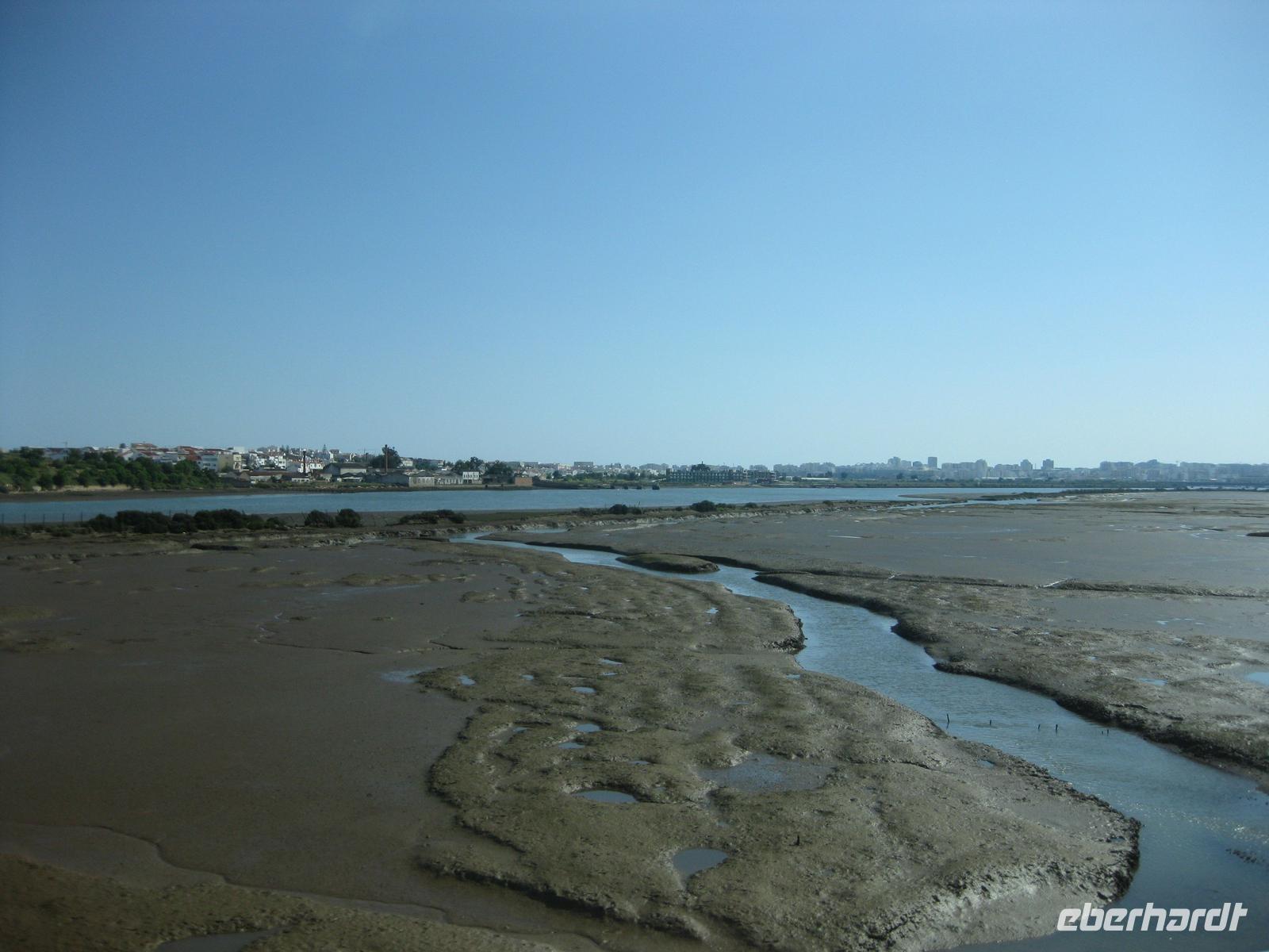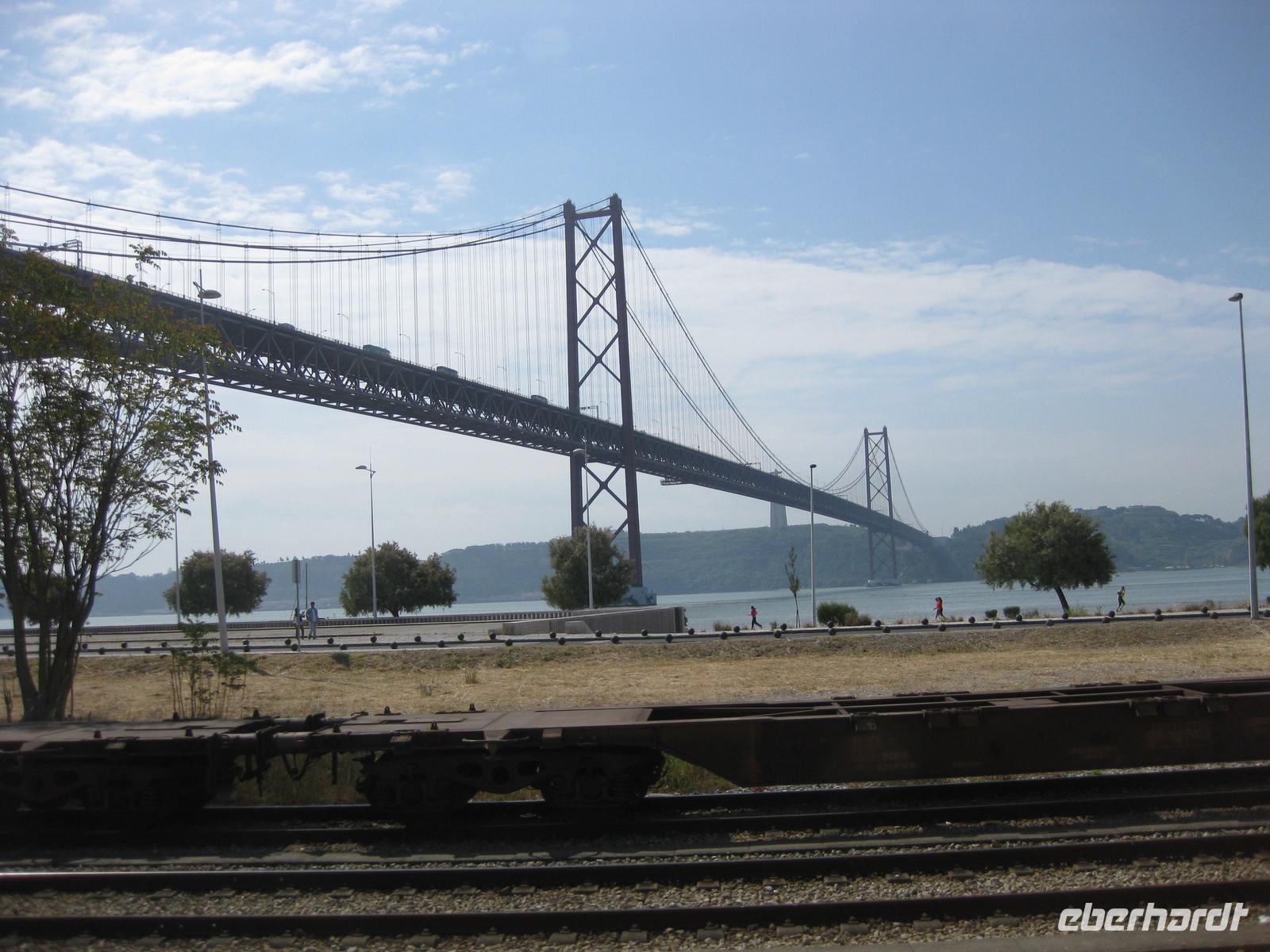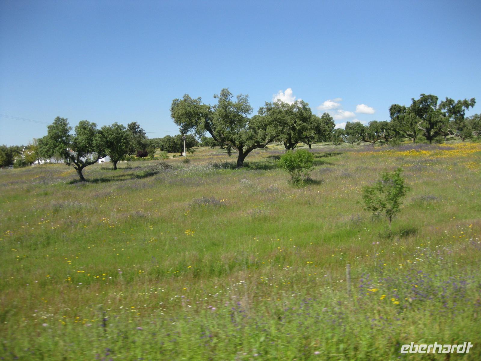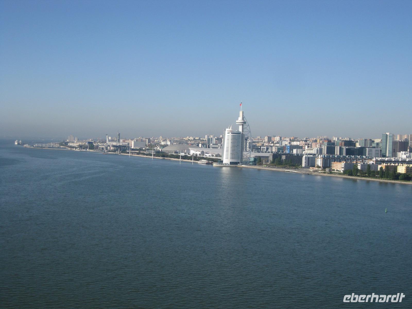 Nach dem Frühstück um 8.30 Uhr ist unser Fahrer Victor mit dem Bus am Hotel. Wir verladen das Gepäck und ab geht die Fahrt. Wir fahren am Flughafen und am Park der Nationen, dem Gelände der Weltausstellung vorbei. Dann überqueren wir den Tejo auf der Vasco da Gama Brücke. Diese entstand im Vorfeld der Weltausstellung 1998 und ist mit 17,2 km Gesamtlänge die längste Brücke Europas. Die Hauptdurchfahrt der Brücke besteht aus einer Schrägseilbrückenkostruktion. Die Fahrt auf der Brücke über den Tejo dauert ungefähr 15 Minuten. Am anderen Ufer sind wir in der Provinz Alentejo, deren Bild durch endlose Weiten, weiße Dörfer, Getreidefelder, Ölplantagen und Tierherden geprägt ist.