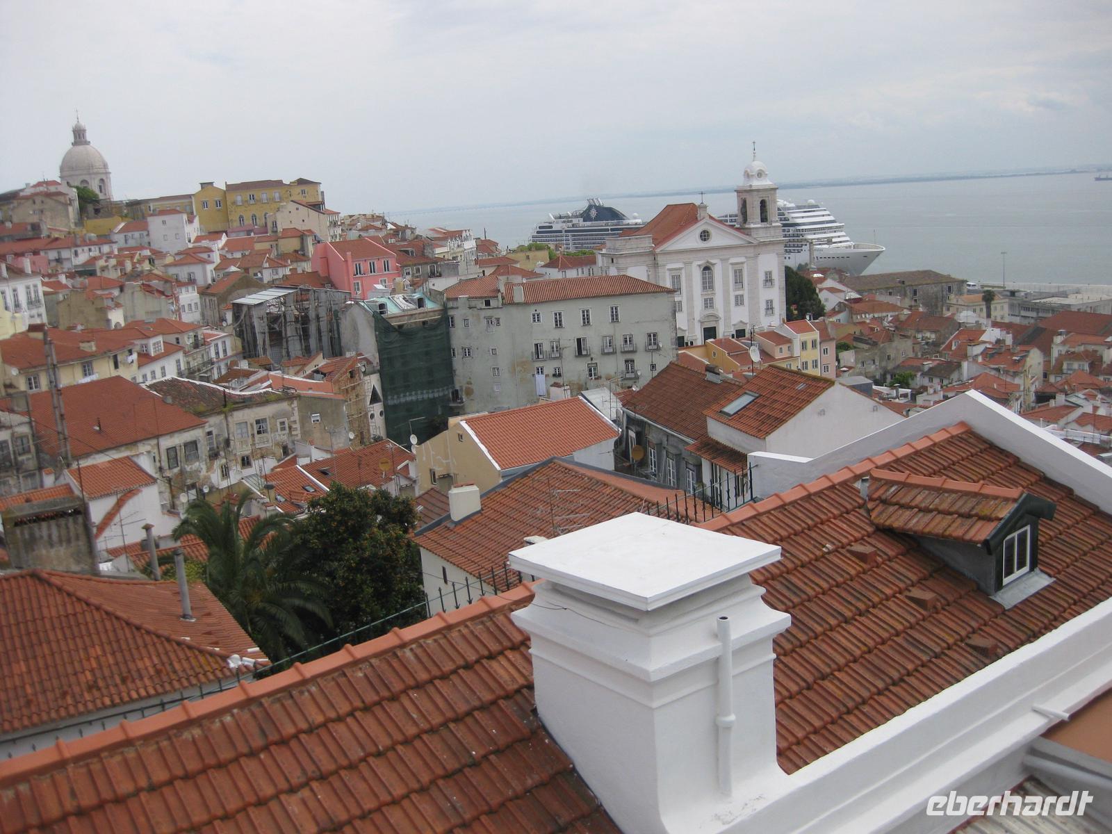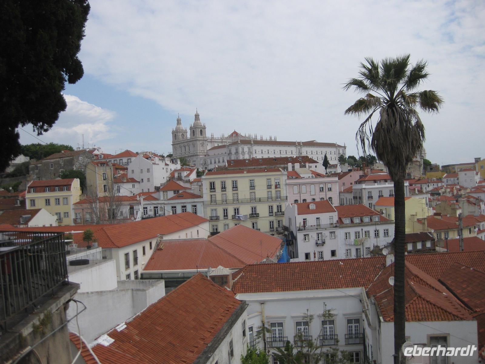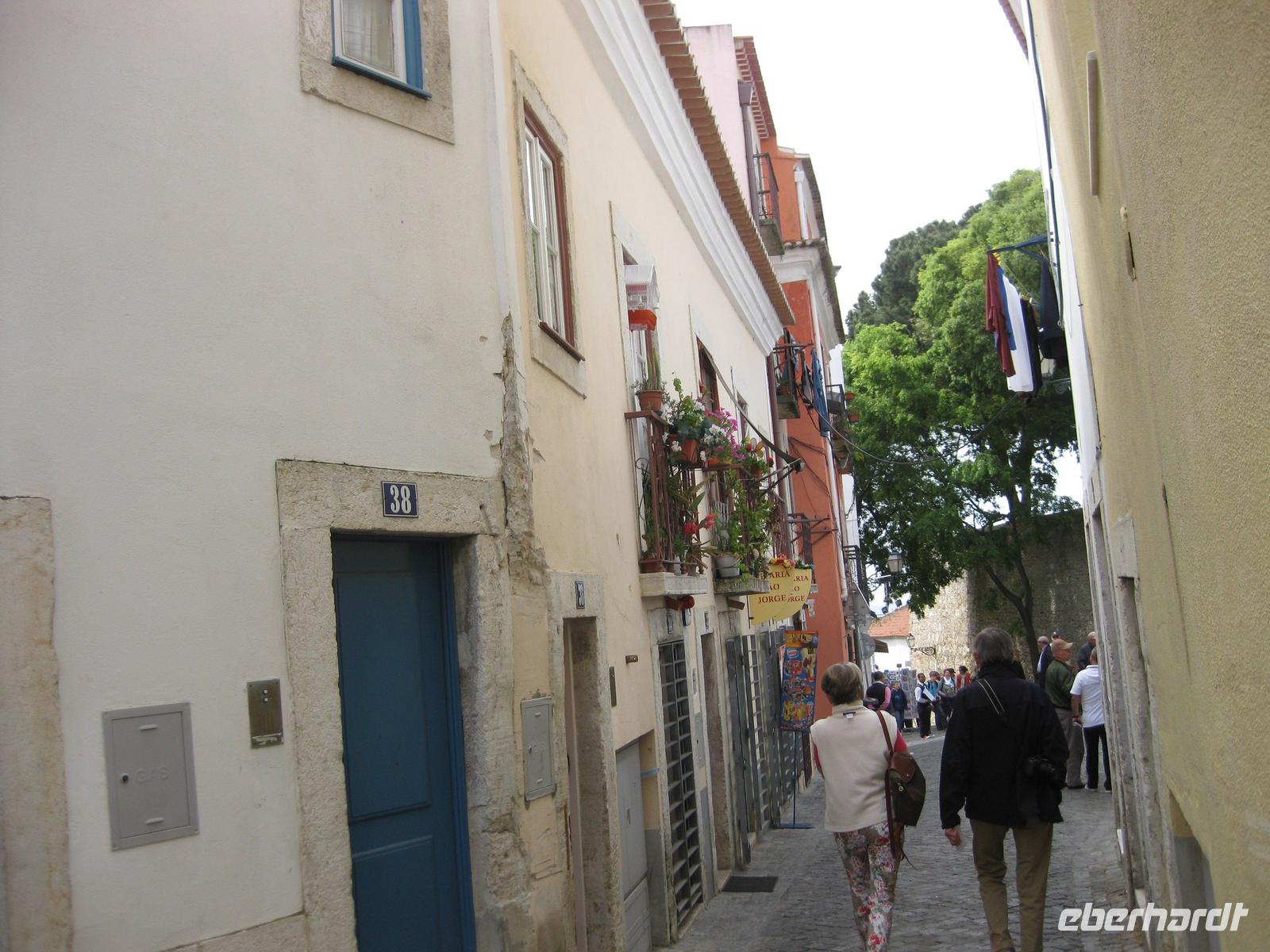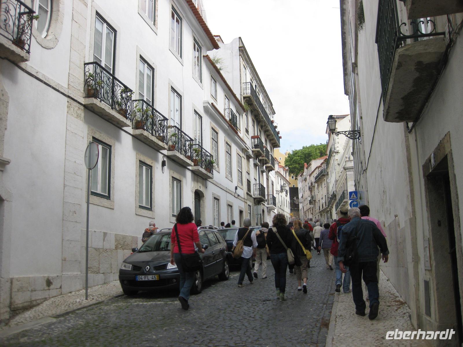 Dann geht es weiter wieder in die Stadt hinein. An der Kathedrale Se verlassen wir unseren Bus und weiter geht es zu Fuß. Wir sehen die Electrico 28, die berühmte alte Straßenbahn, die durch Lissabon fährt. Wir kommen zur Burg Sao Jorge, die heute leider geschlossen ist und laufen weiter bis zum Portas do Sol, von dem aus wir einen phantastischen Blick über die Alfama, Lissabons ältesten Stadteil, bis hin zum Tejo haben. Dann steigen wir hinab in die Alfama und kommen am Tejo wieder raus. In der Rua Augusta verabschieden wir uns zur Mittagspause. Hier gibt es viele Restaurants, Cafes und Snackbars.