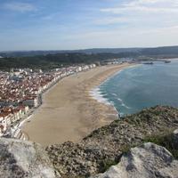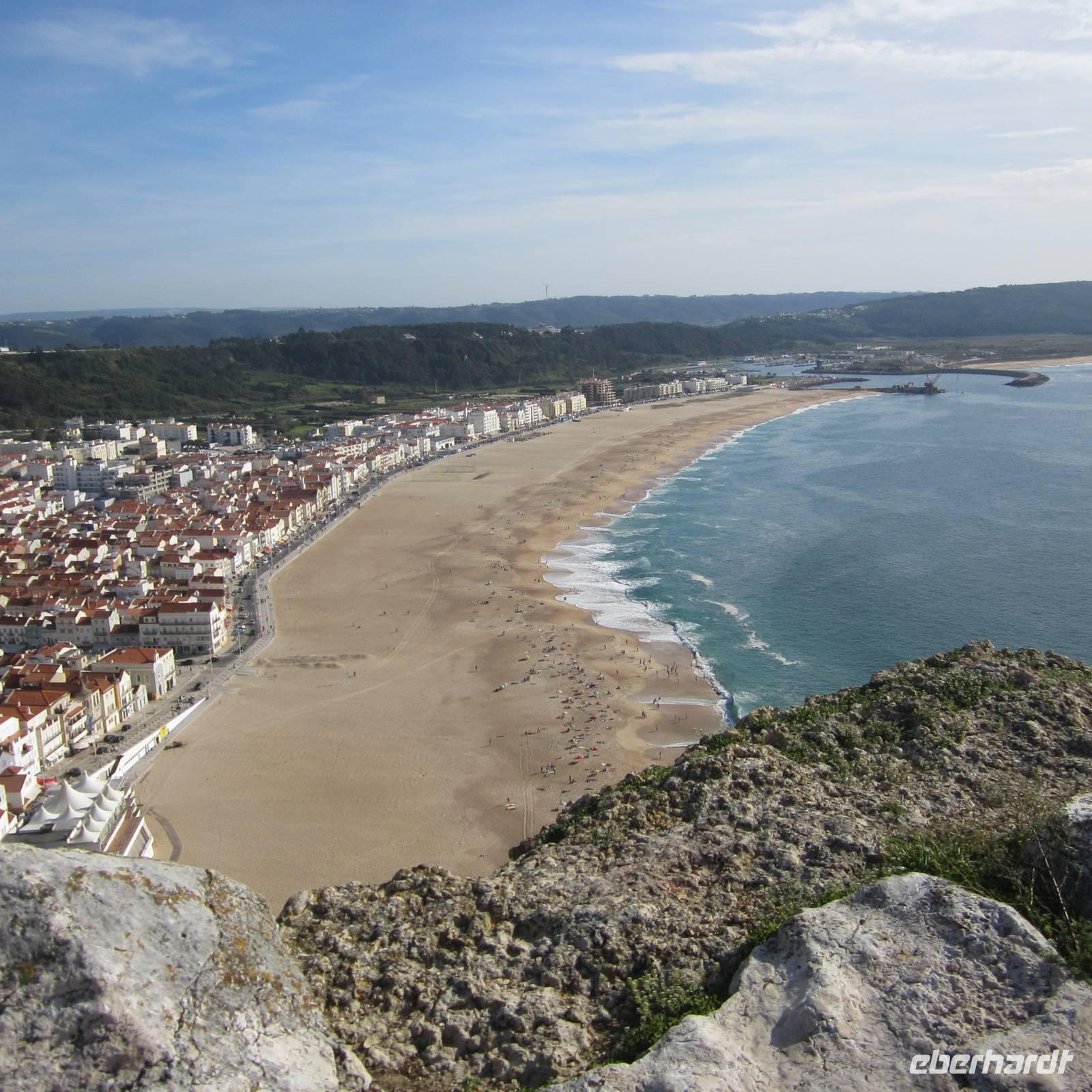 Beeindruckt fahren wir weiter nach Nazaré. Wunderschöne lange Sandstrände und stürmische Atlantik-Wellen laden zum Baden ein, wozu heute etwas Mut gehört. Ich habe für jeden Gast ein kleines Handtuch mit portugiesischen Motiven im Gepäck, damit das Baden auch möglich ist, denn einige Gäste wollen es wagen. Unsere Gäste freuen sich sehr darüber. Wir verbringen unsere Mittagspause hier. Ein Fotostopp im Ortsteil Sítio oberhalb der 110 m hohen Steilküste eröffnet uns einen atemberaubenden Blick auf den Ort.