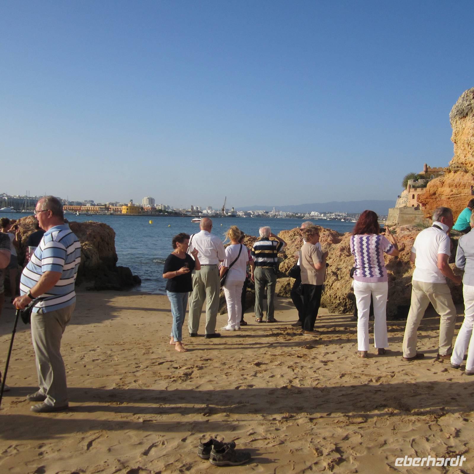 Danach fahren wir nach Lagos. Palmen, Strand, Yachthafenversprechen einen schönen Urlaub. Leider ist heute keine Bootsfahrt durch die Grotten möglich, denn die Wellen des Atlantiks sind zu kräftig und gefährlich für die wendigen Boote. Luisa zeigt uns die Stadt, beginnend am Denkmal von Heinrich dem Seefahrer, vorbei an der Delegacao da Alfândega, ein Zeugnis der dunklen Seite der portugiesischen Geschichte, denn hier wurden erstmals Sklaven verkauft. Daneben stehen als steinerne Zeugen die Igreja de Santo Antonio und unweit die Kirche Santa Maria. Nach unserer Freizeit in diesem gemütlichen Ort fahren wir weiter nach Portimao.