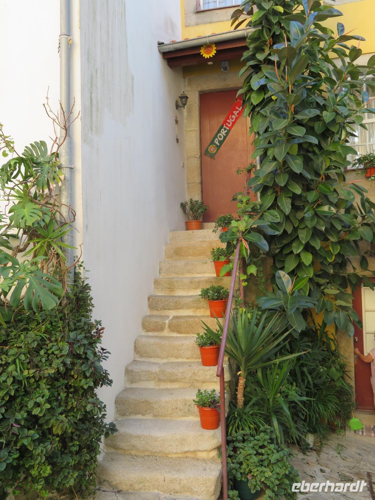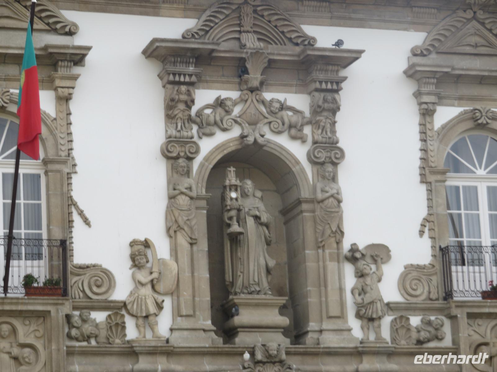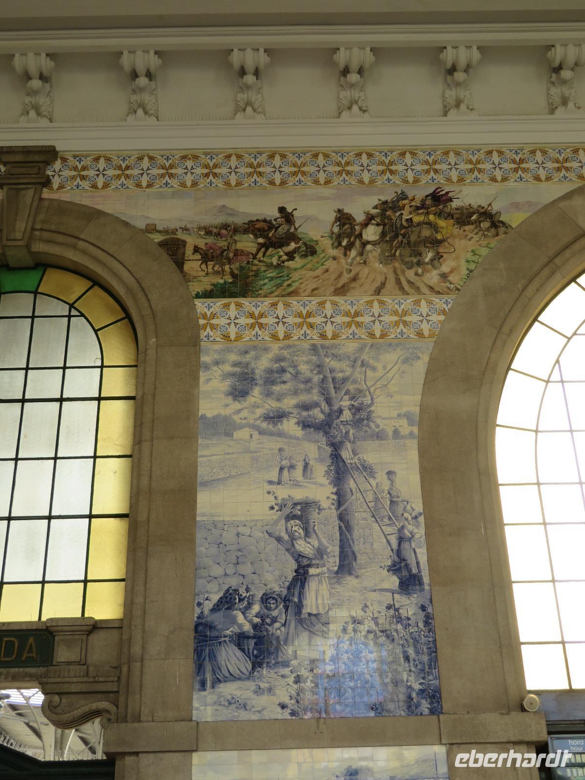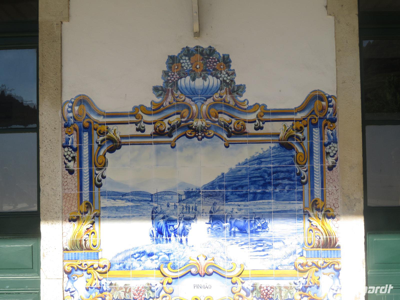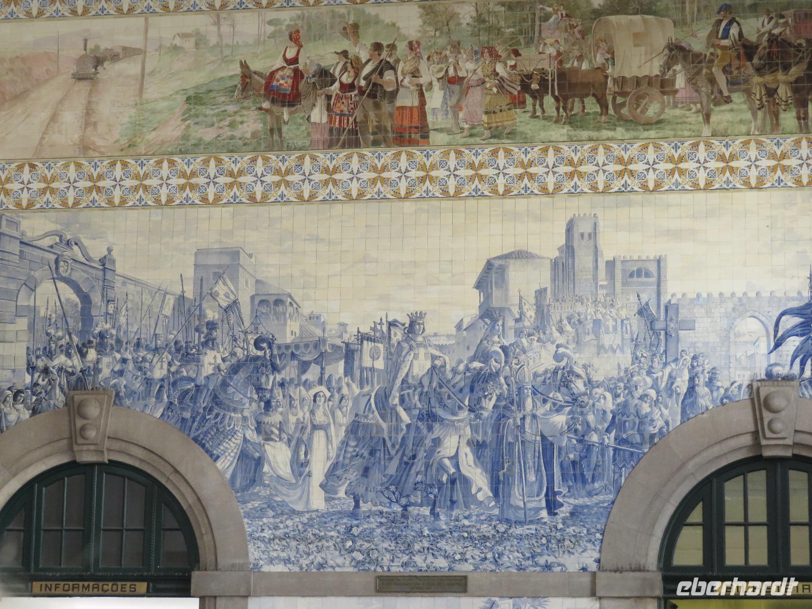 Anschließend liefen wir weiter zum Rathaus der Stadt und zum Reiterdenkmal Königs Dom Pedro IV. Weiter, vorbei an typischen mit Kacheln geschmückten Häusern zum Bahnhof Sao Bente. Die Eingangshalle ist mit wunderschönen Kacheln verziert. Jorge Calaco hat dort 1930 mit den Werken „Marienprozession von Lamego" und dem „Pilgerzug zu Ehren von Sao Torcato in Guimaraes" den Bahnhof geschmückt.