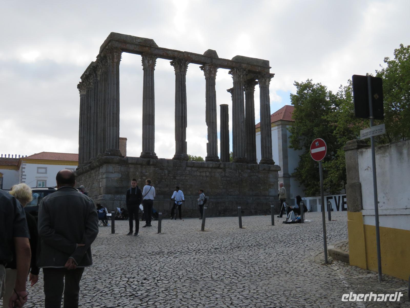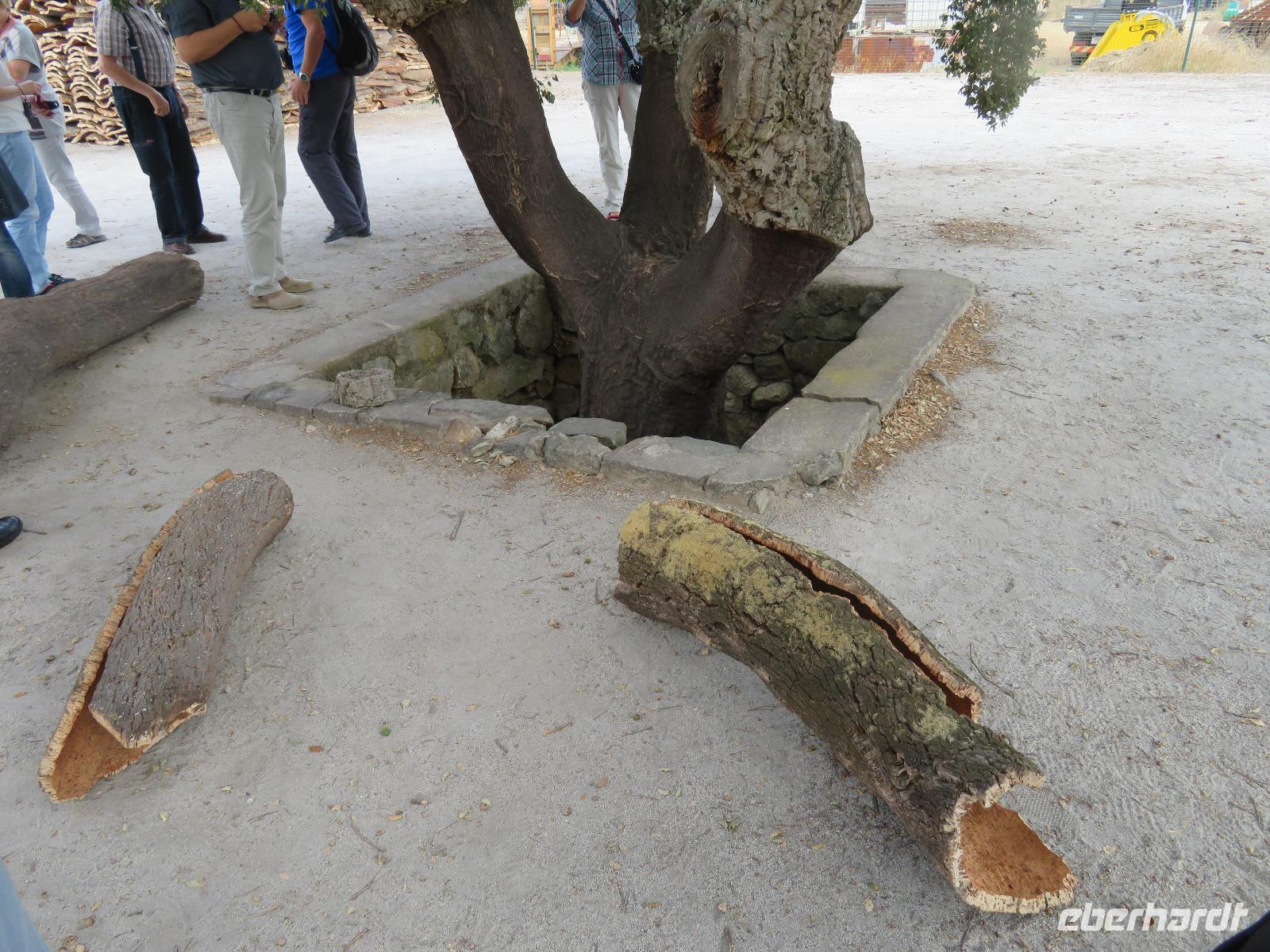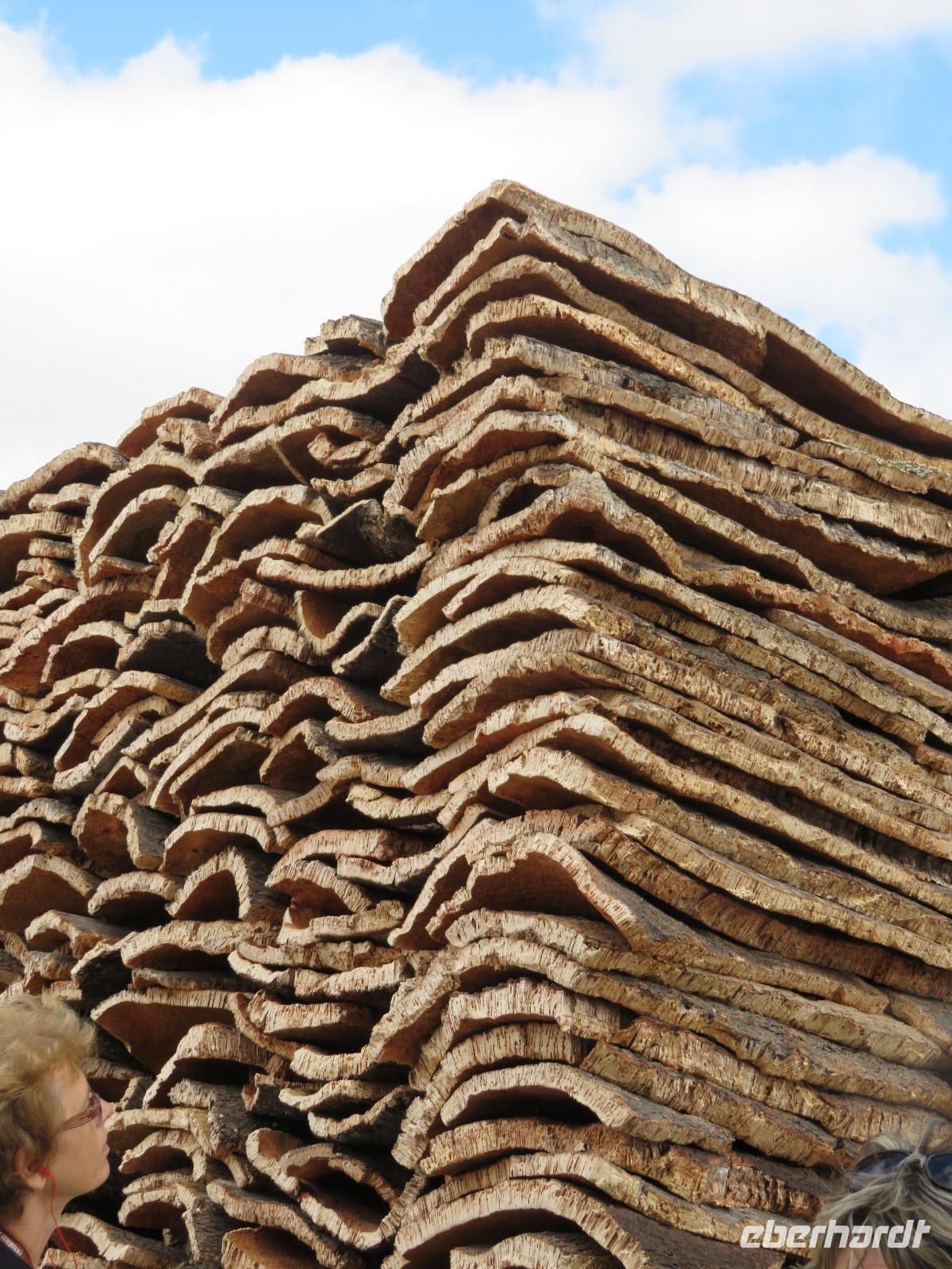 Auf dem Weg zur Fabrik zeigte uns Isabell die Korkeichen und wir sahen auch welche die bereits geschält wurden. In der Fabrik konnten sehen wie der geschälte Kork sortiert, weiterverarbeitet und angewendet wird. Wir entdeckten, dass aus Kork Lampen, Taschen, Schuhe, Stoffe, Kerzenständer, Möbel und vieles mehr gemacht werden kann. Wir fuhren weiter in den Süden nach Évora. Hier machten wir halt und spazierten bis zum Ortskern. Zuerst entdeckten wir das Templo Romano das Wahrzeichen der Stadt. Es ist das einzig erhaltene Beispiel eines römischen Tempels auf der Iberischen Halbinsel. Wir spazierten weiter zur Kathedrale Sé de Santa Maria von Évora. Diese frühgotische Kathedrale gilt als eine der schönsten Portugals. Anschießend spazierten wir bis zur Knochenkapelle. In dieser Kirche sind die Gebeine von mehr als 5000 Toten verarbeitet. Wände, Pfeiler und Bogen wurden kunstvoll aus menschlichen Knochen gestaltet. Hier im Ortskern verbrachten wir auch unsere Mittagspause bei strahlendem Sonnenschein.