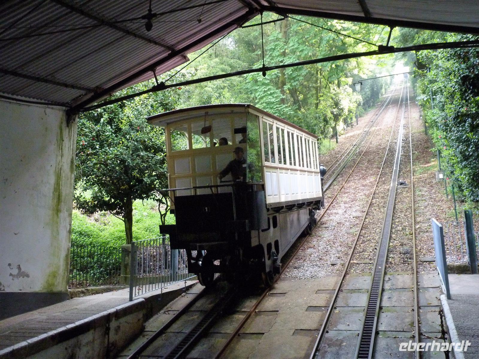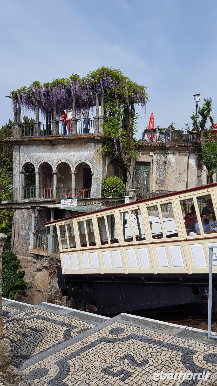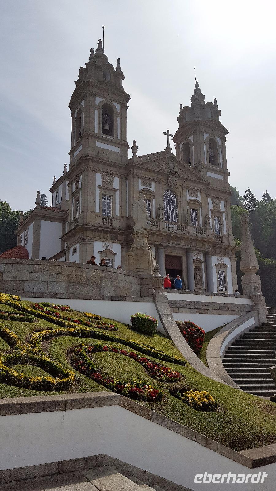 Weiter ging die Fahrt nach Bom Jesus einen Heiligtum in Tenões , außerhalb der Stadt Braga mit einer monumentalen, barocken Treppe , 116 Meter lang = 881 Stufen. Sein Name bedeutet guter Jesus des Berges. Unsere Gruppe wählte jedoch den bequemeren Weg mit der Alten Zahnradbahn. Der Bau der Anlage begann im Jahre 1722. Die Pilgerstätte entstand am Standort einer Kapelle aus dem 14. Jahrhundert. Die neoklassizistische Kirche liegt inmitten eines großen Parks mit Waldbestand, üppiger Blumenpracht und einem kleinen See. Mit der Bergterrasse und der imposanten breiten barocken Treppenanlage in drei Abschnitten gilt Bom Jesus do Monte als schönste Wallfahrtskirche Portugals, wenn nicht weltweit.