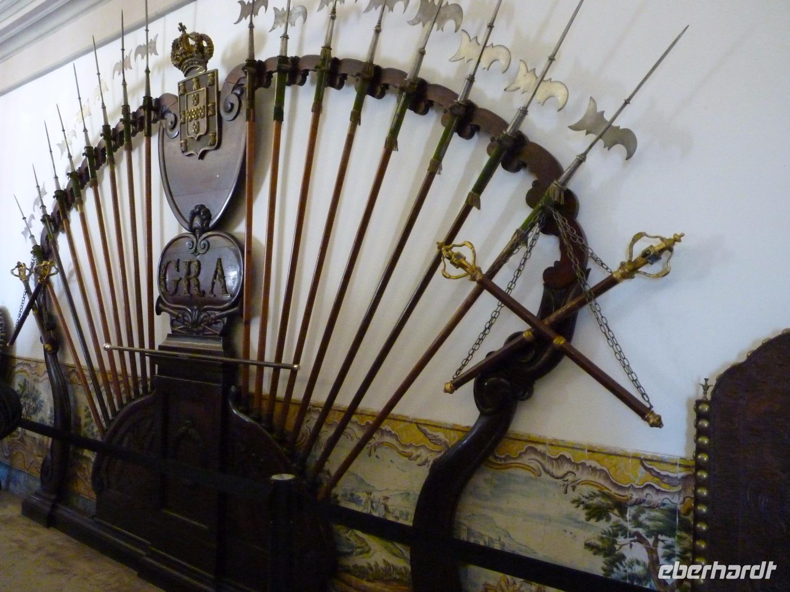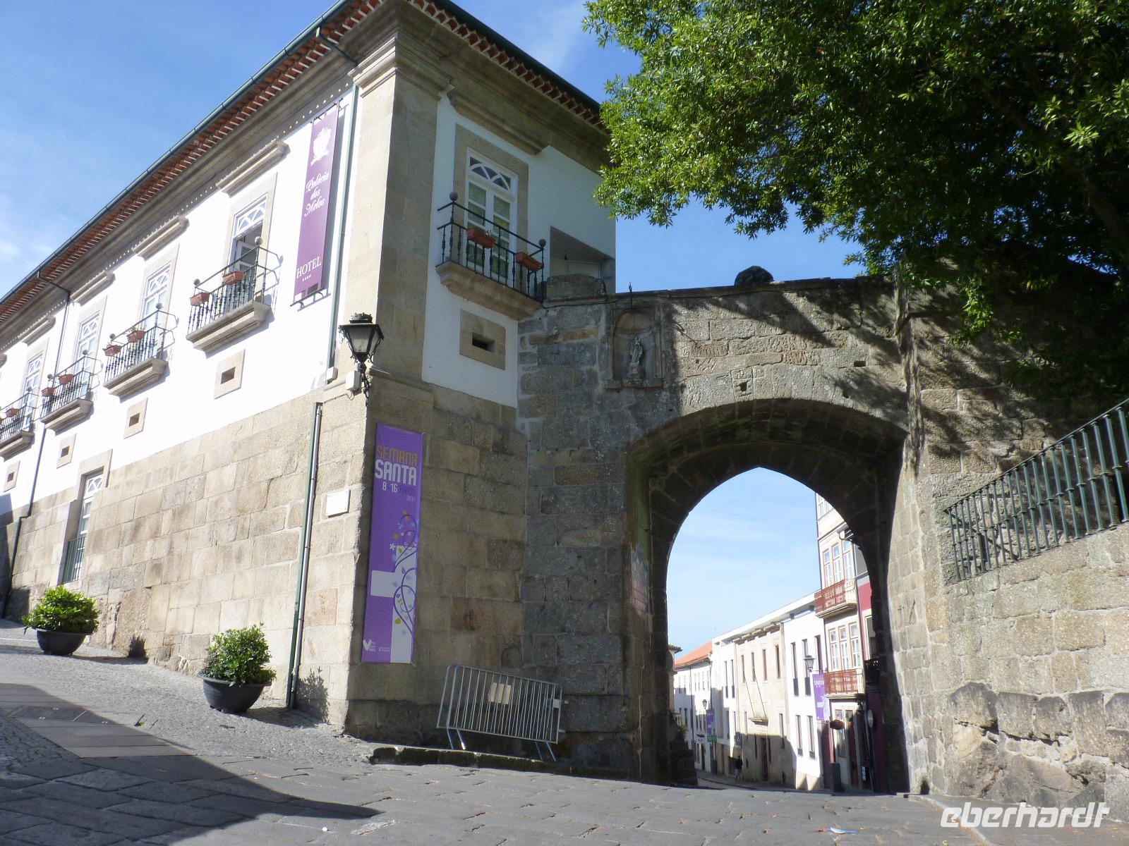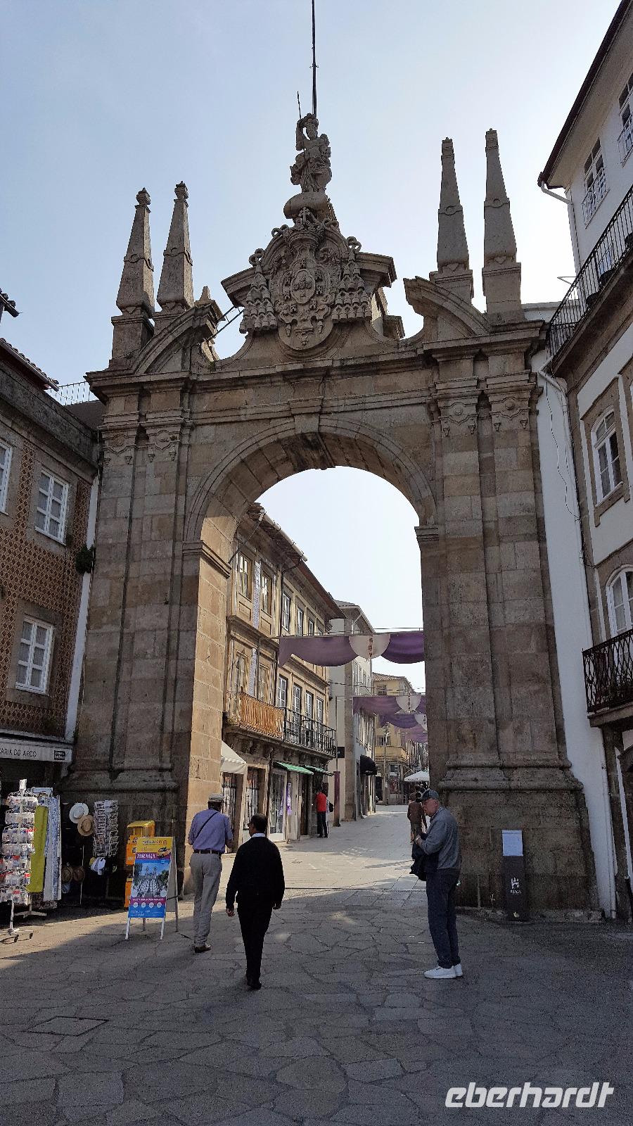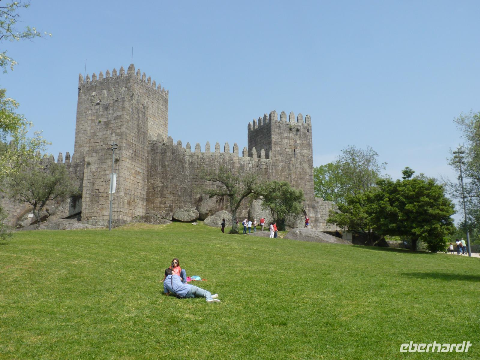 Für den heutigen Tag stand noch Guimaraes auf dem Programm. Hier soll Alfons I., der erste König Portugals, geboren sein, weswegen sie die erste Hauptstadt des Landes war und als „Wiege der Nation" gilt. Die alte romanische Burg wurde in der Mitte des 10. Jahrhunderts auf Anweisung der galizischen Gräfin Mumadona gebaut. Der Bergfried (Torre de Menagem) hat eine Höhe von 27 m. Heute tummeln sich in der Parkanlage rund um die Burg viele Familien und genießen die Sonnenstrahlen. Im Burghof hatte man Stände aufgebaut und man konnte sich an Speisen, nach althergebrachter Rezeptur zubereitet, laben.