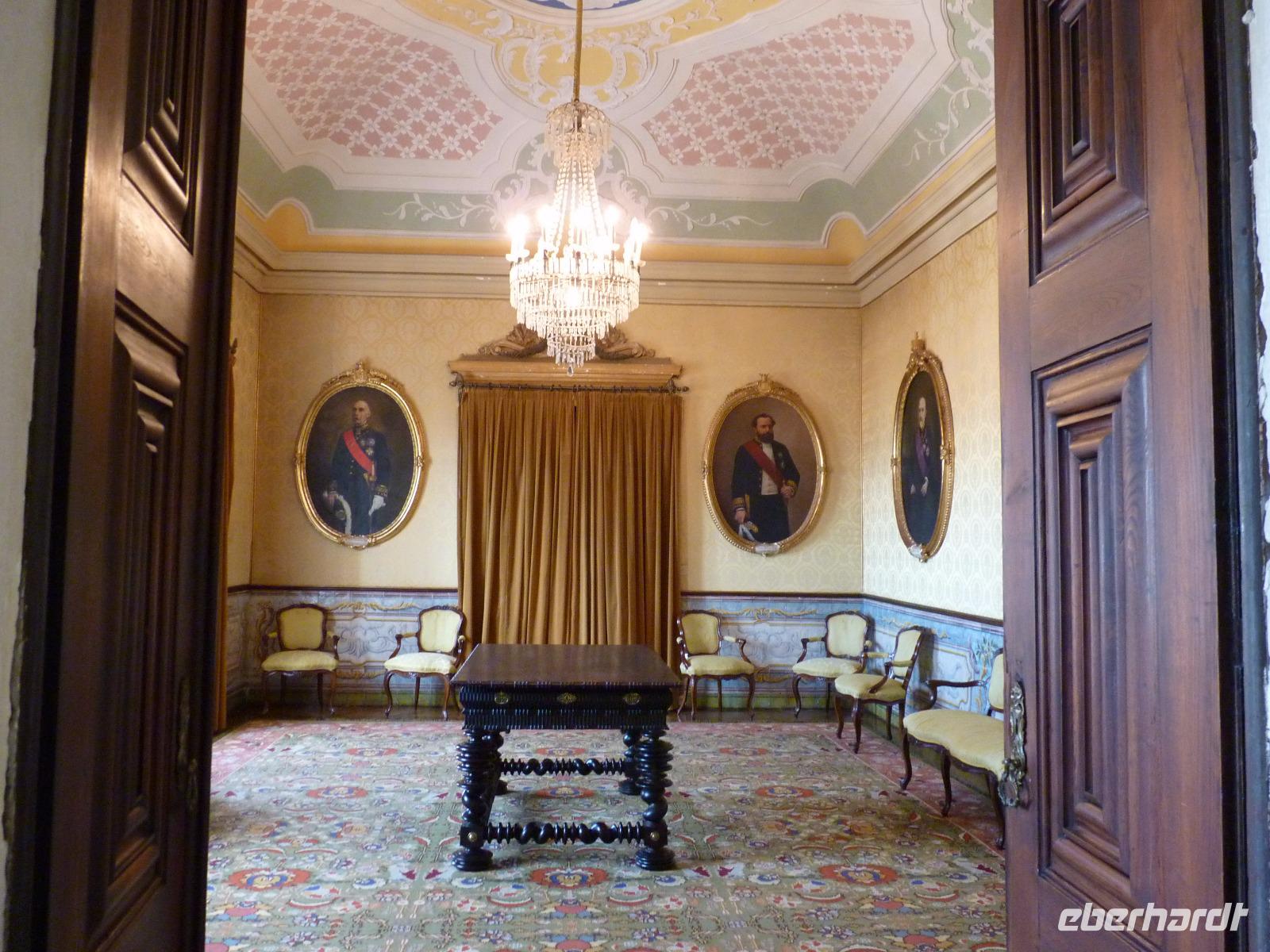 Das „Märchenschloss" verbindet verschiedene historisierende Baustile, wie Neorenaissance, Neogotik, Neo-Manuelinik und maurische Bauelemente. Im Innenraum finden sich an Barock und Rokoko gemahnende Stuck-Ensembles, ein monumentaler Triton und Trompe-l'œil-Malereien. Beeindruckend sind die zahlreichen Räume mit ihrer vollständigen Inneneinrichtung aus dem 19. Jahrhundert. Ludwig von Bayern wurde durch diesen Palast inspiriert zum Bau von Neuschwanstein.