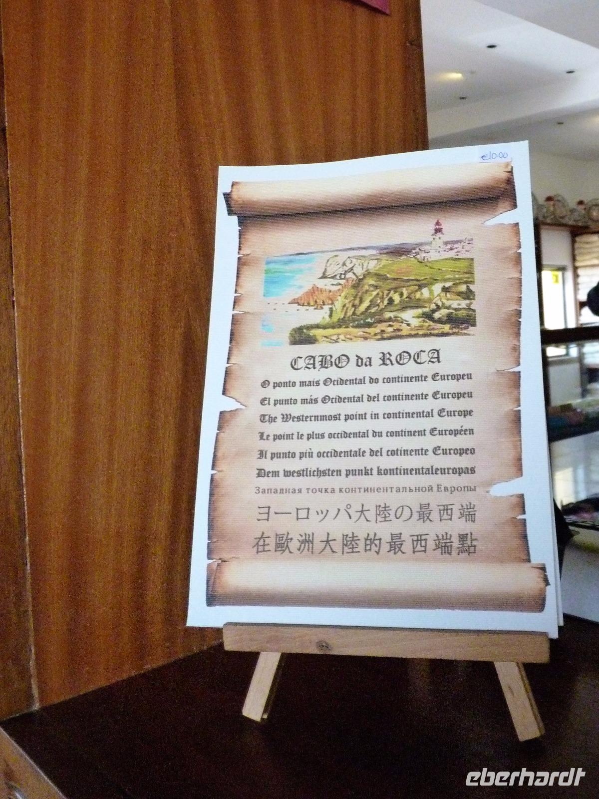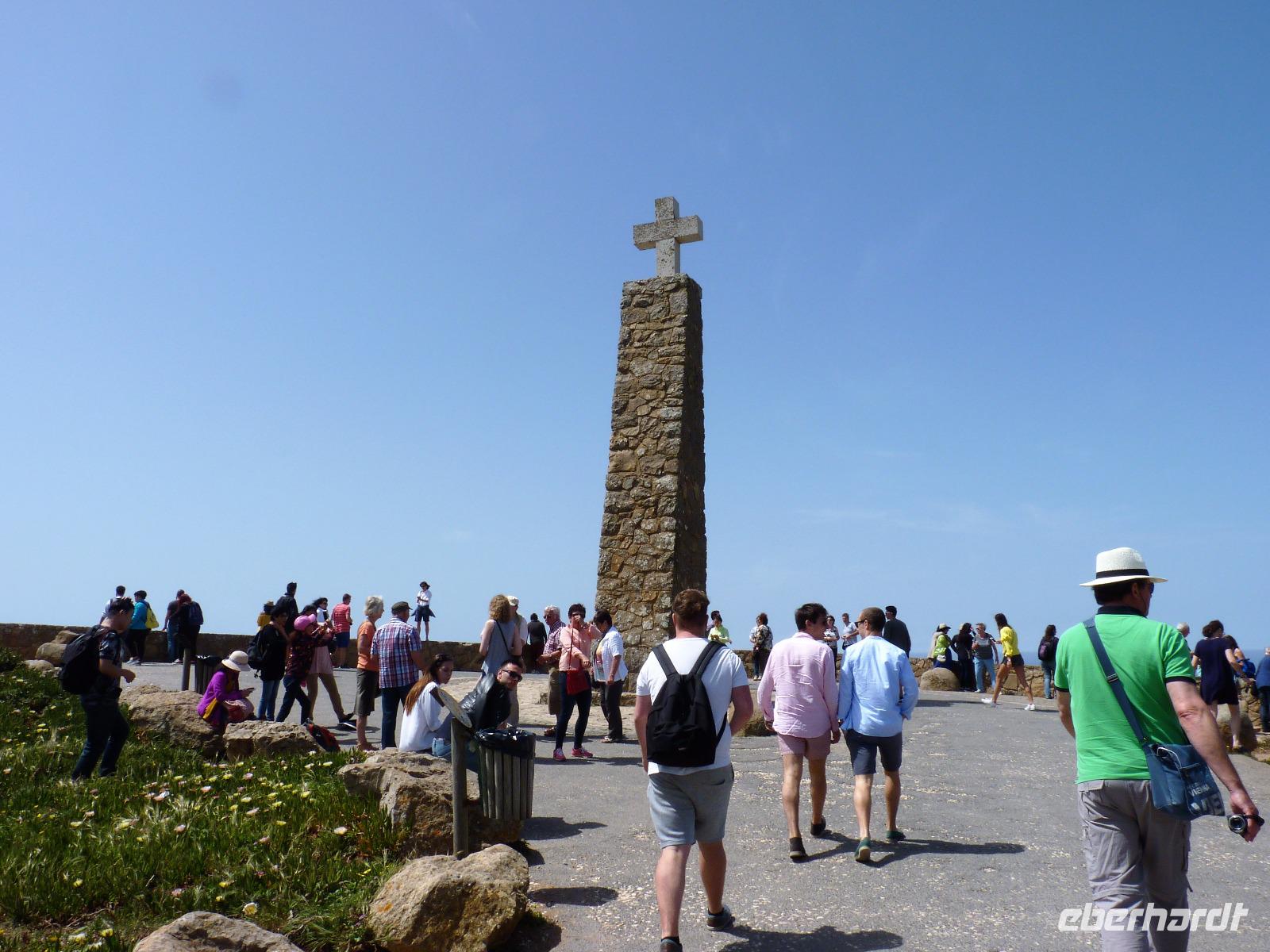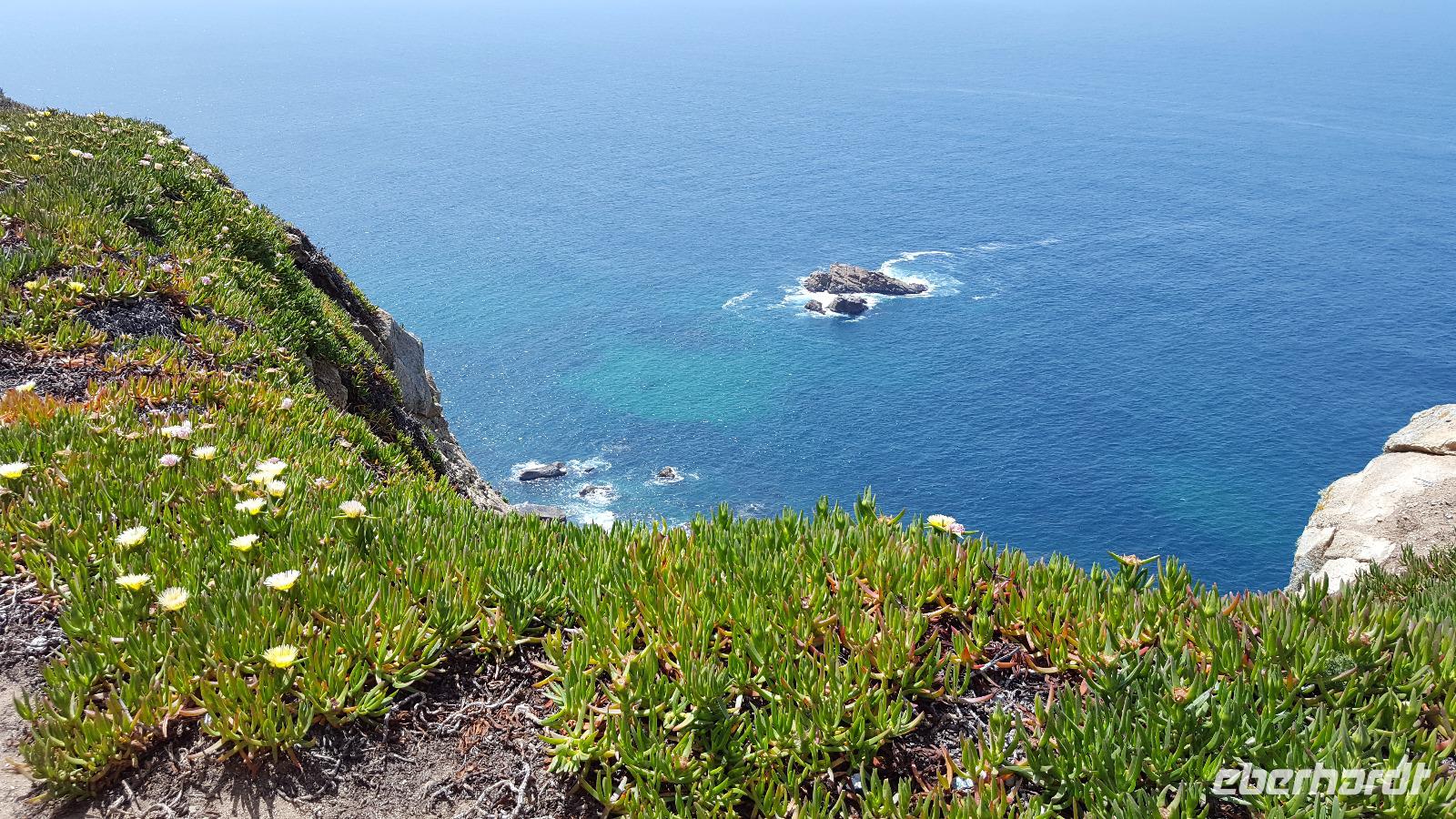 Eine Parkanlage um das Schloss wurden ähnlich historisierend gestaltet wie der Schlossbau. Durch Unmengen von Touristen spazierten wir zurück zum Bus. Jetzt wollten wir den westlichste Punkt des Festlands des europäischen Kontinents erkunden- Cabo Roca am Atlantik und 140 müM gelegen. Die Hänge sind invasionsartig mit der Essbaren Mittagsblume (Carpobrotus edulis) bewachsen. In den Felswänden nisten seltene Wanderfalken (Falco peregrinus) und Turmfalken (Falco tinnunculus). Der portugiesische Nationaldichter Luís de Camões hat passend den Ort mit folgenden Worten beschrieben: Hier... Wo die Erde endet und das Meer beginnt... (Aqui... onde a terra se acaba e o mar começa). Ordendlich durchgeweht ging es nach Cascais.