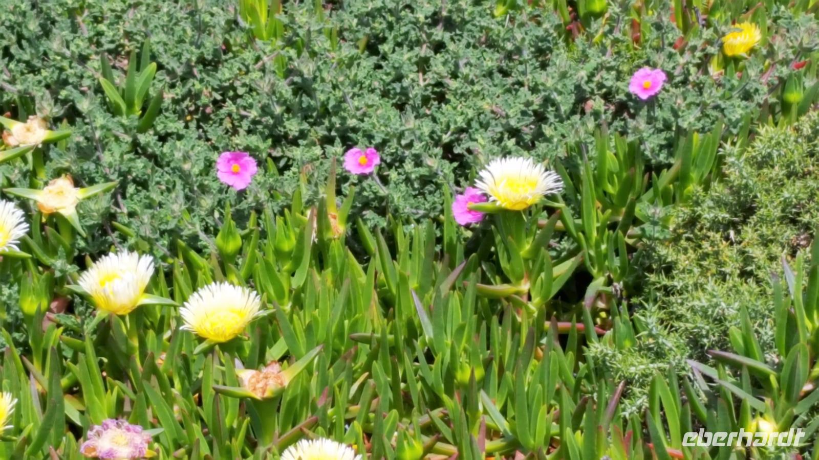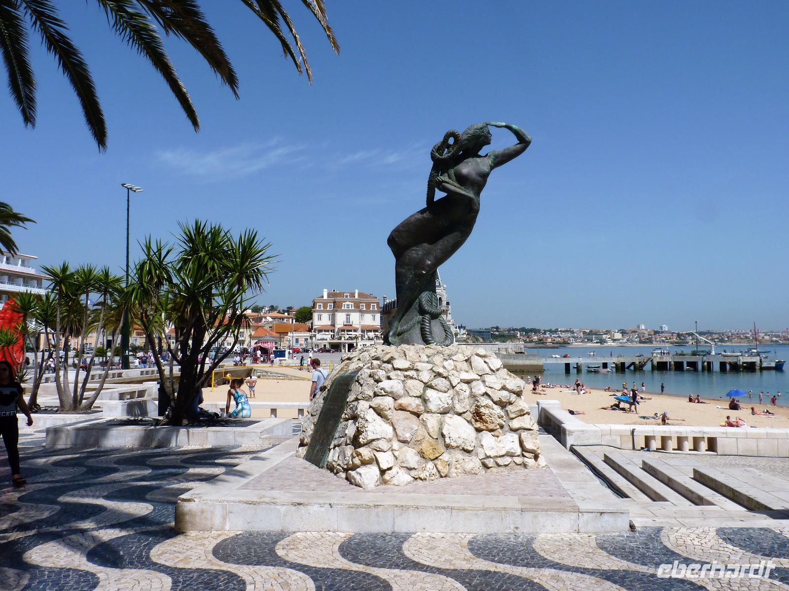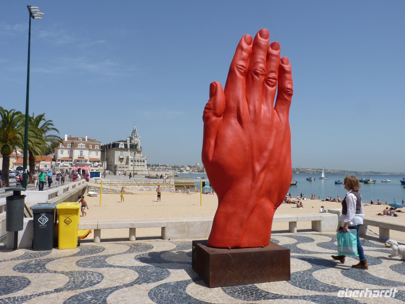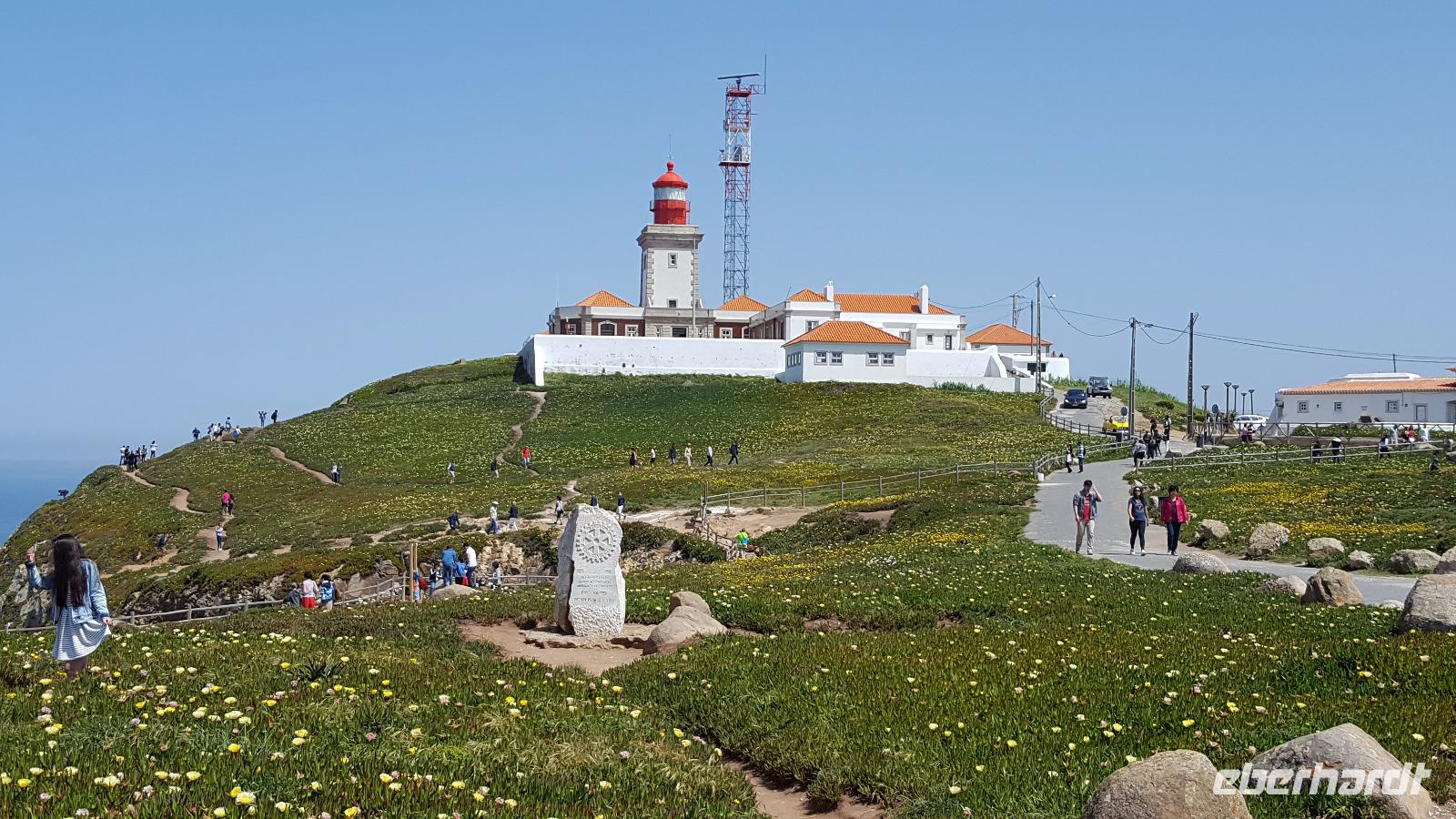 Eine Parkanlage um das Schloss wurden ähnlich historisierend gestaltet wie der Schlossbau. Durch Unmengen von Touristen spazierten wir zurück zum Bus. Jetzt wollten wir den westlichste Punkt des Festlands des europäischen Kontinents erkunden- Cabo Roca am Atlantik und 140 müM gelegen. Die Hänge sind invasionsartig mit der Essbaren Mittagsblume (Carpobrotus edulis) bewachsen. In den Felswänden nisten seltene Wanderfalken (Falco peregrinus) und Turmfalken (Falco tinnunculus). Der portugiesische Nationaldichter Luís de Camões hat passend den Ort mit folgenden Worten beschrieben: Hier... Wo die Erde endet und das Meer beginnt... (Aqui... onde a terra se acaba e o mar começa). Ordendlich durchgeweht ging es nach Cascais.