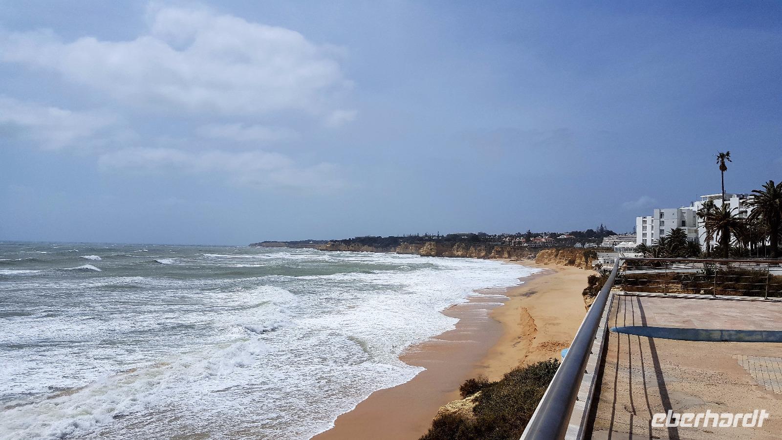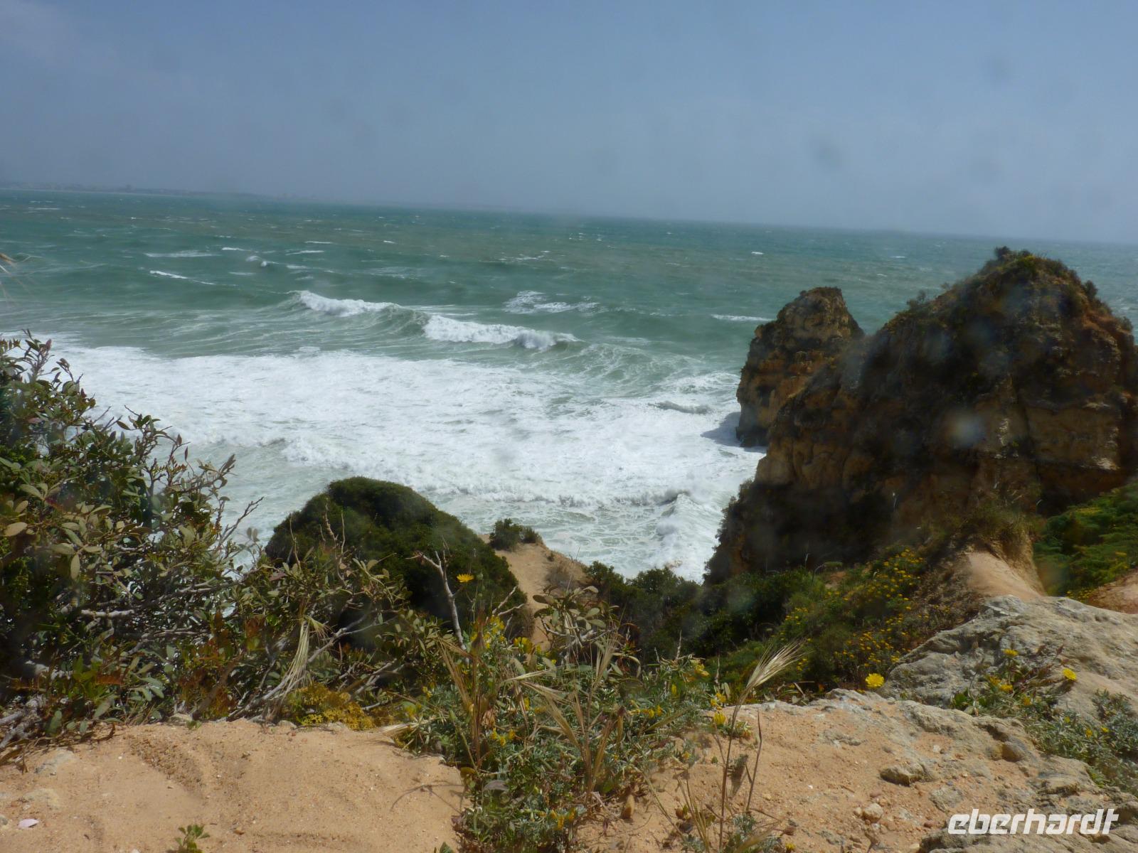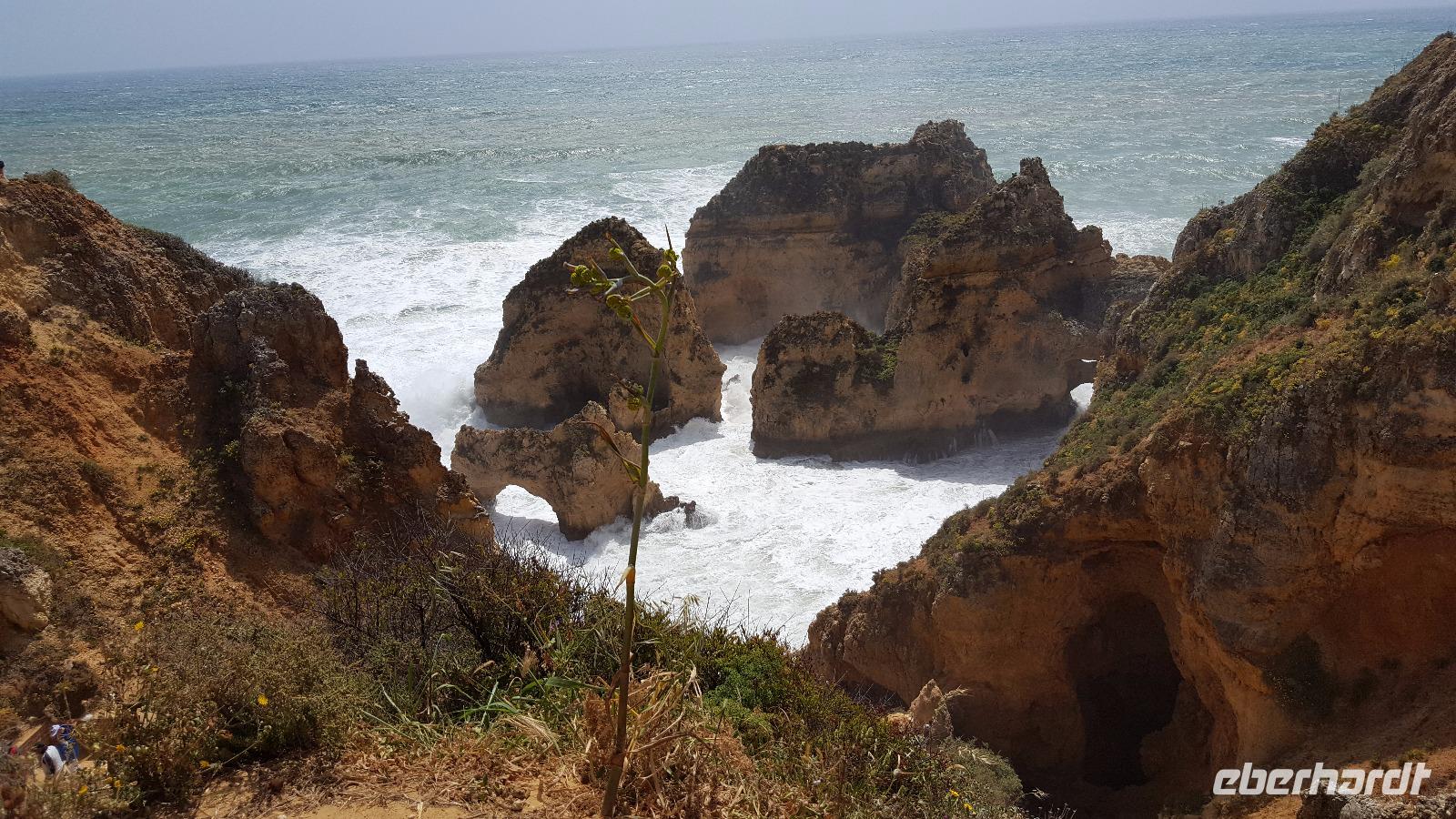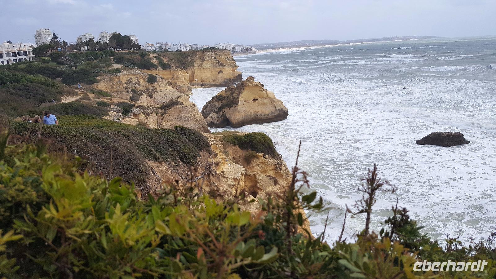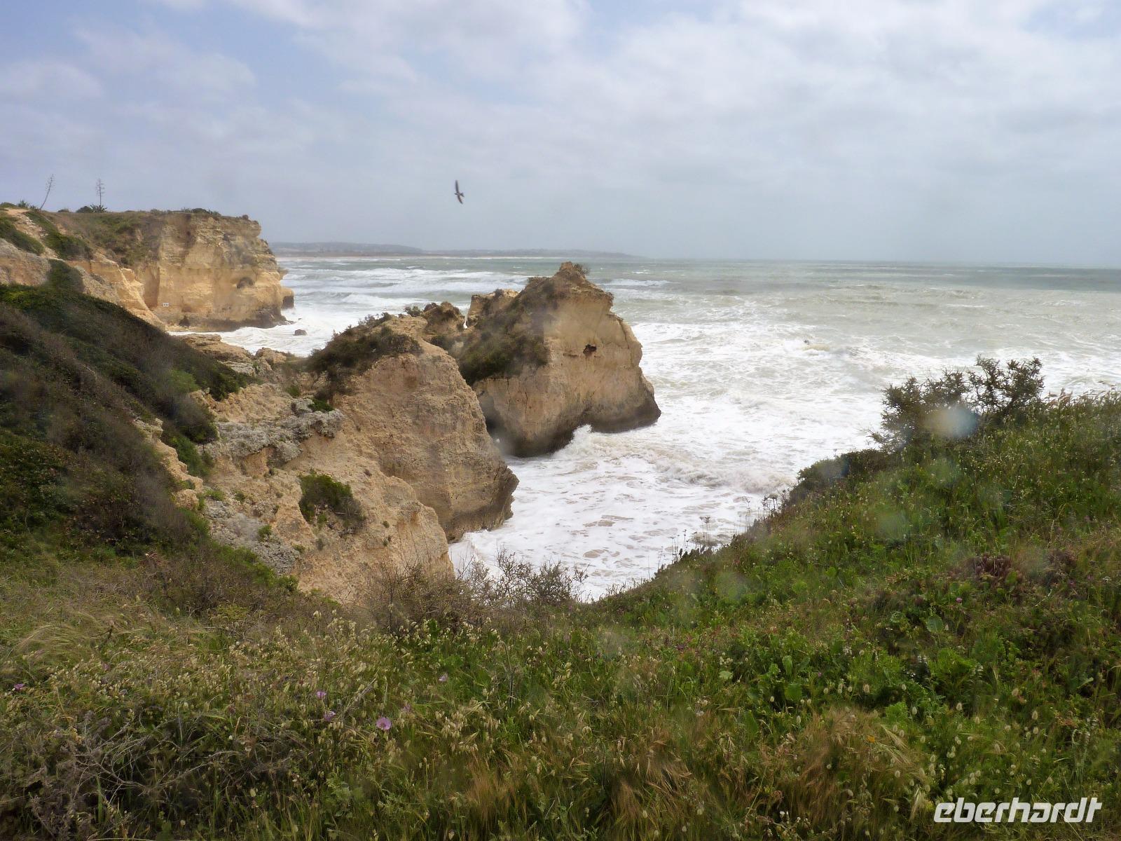Wunderschöne Panoramablicke gab es beim Spazieren entlang der Kalksteinklippen bei stürmischer See. Nicht umsonst ist die Algarve ein Surferparadies. Ca. 3,6 Kilometer westlich von Armação de Pêra befindet sich eine malerische kleine Kapelle Nossa Senhora da Rocha, auf einer Landspitze gelegen.