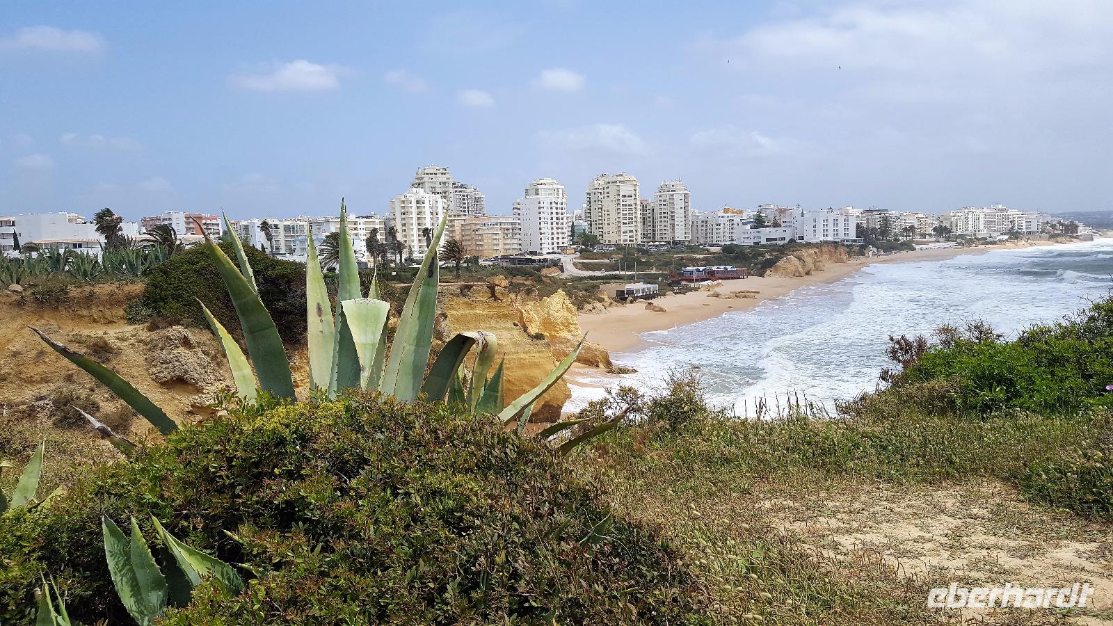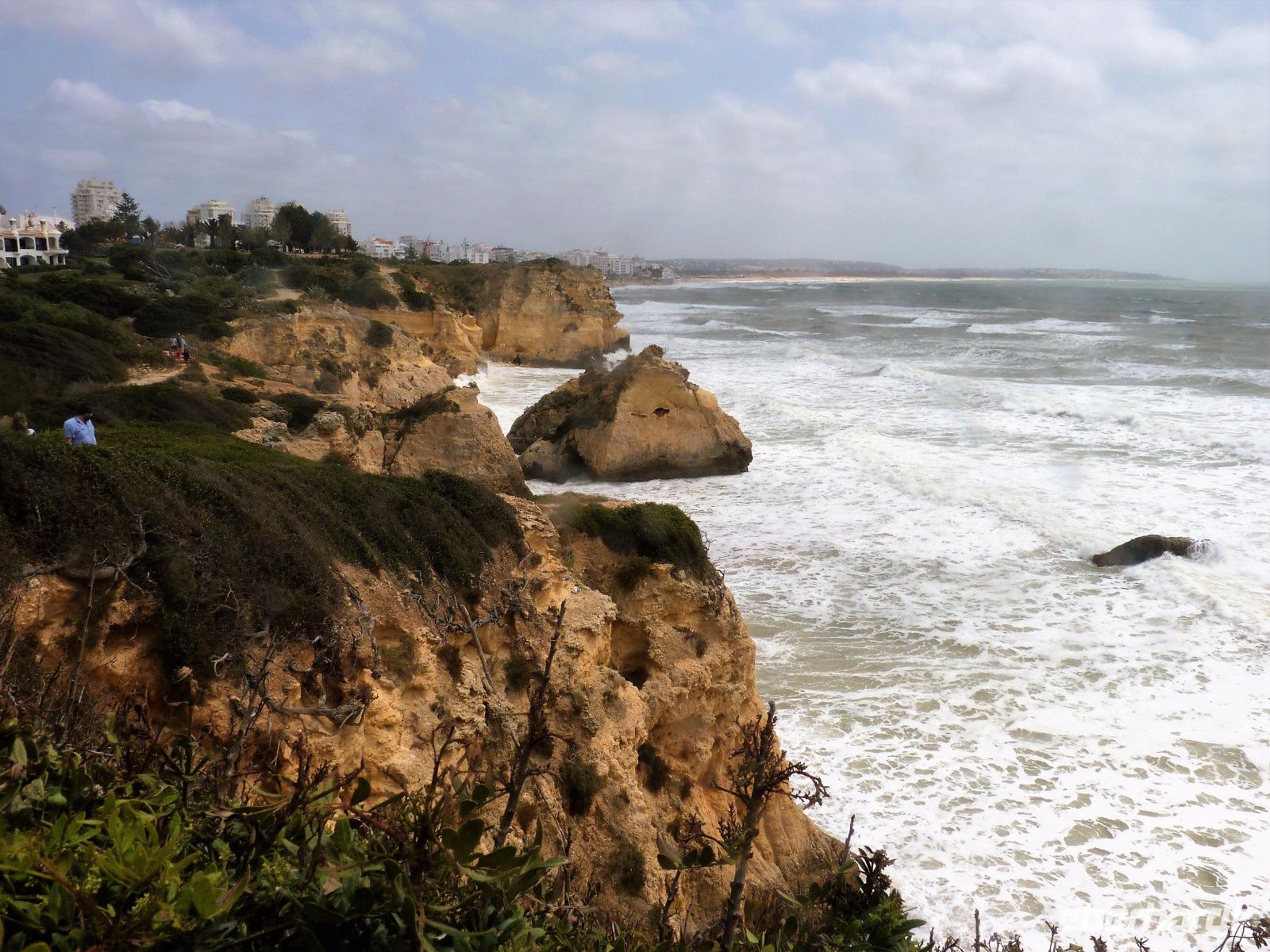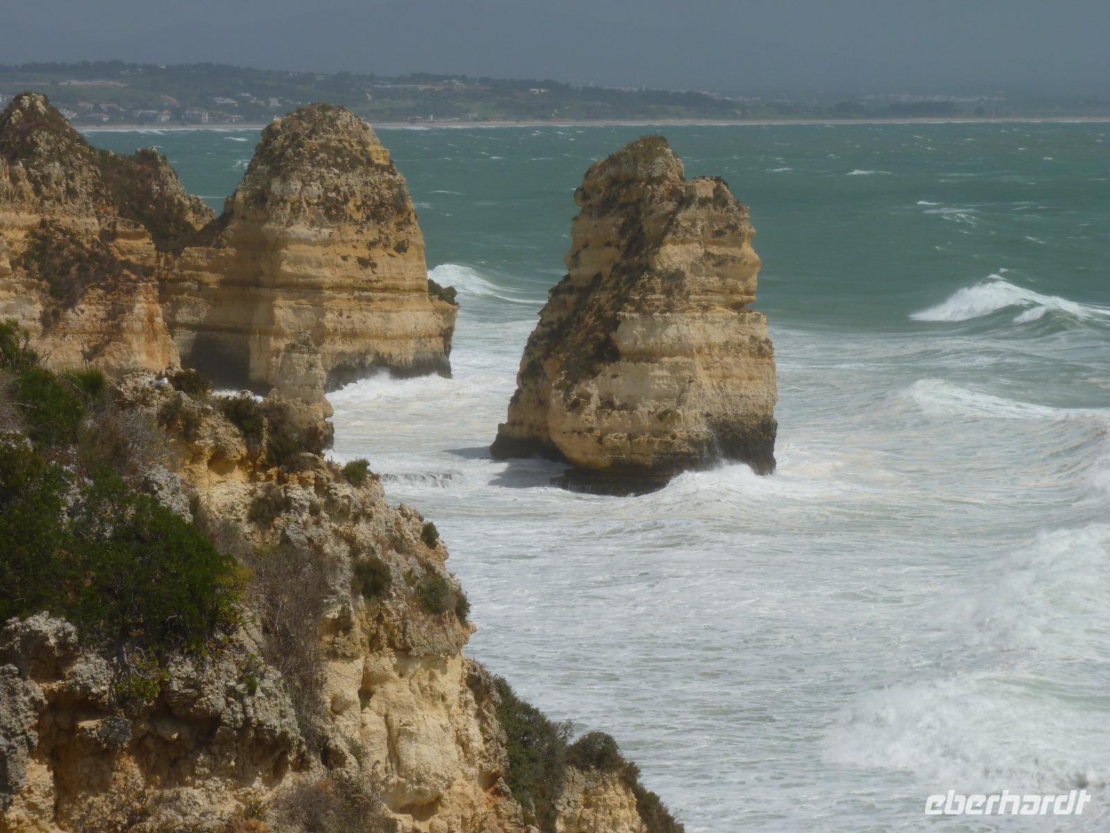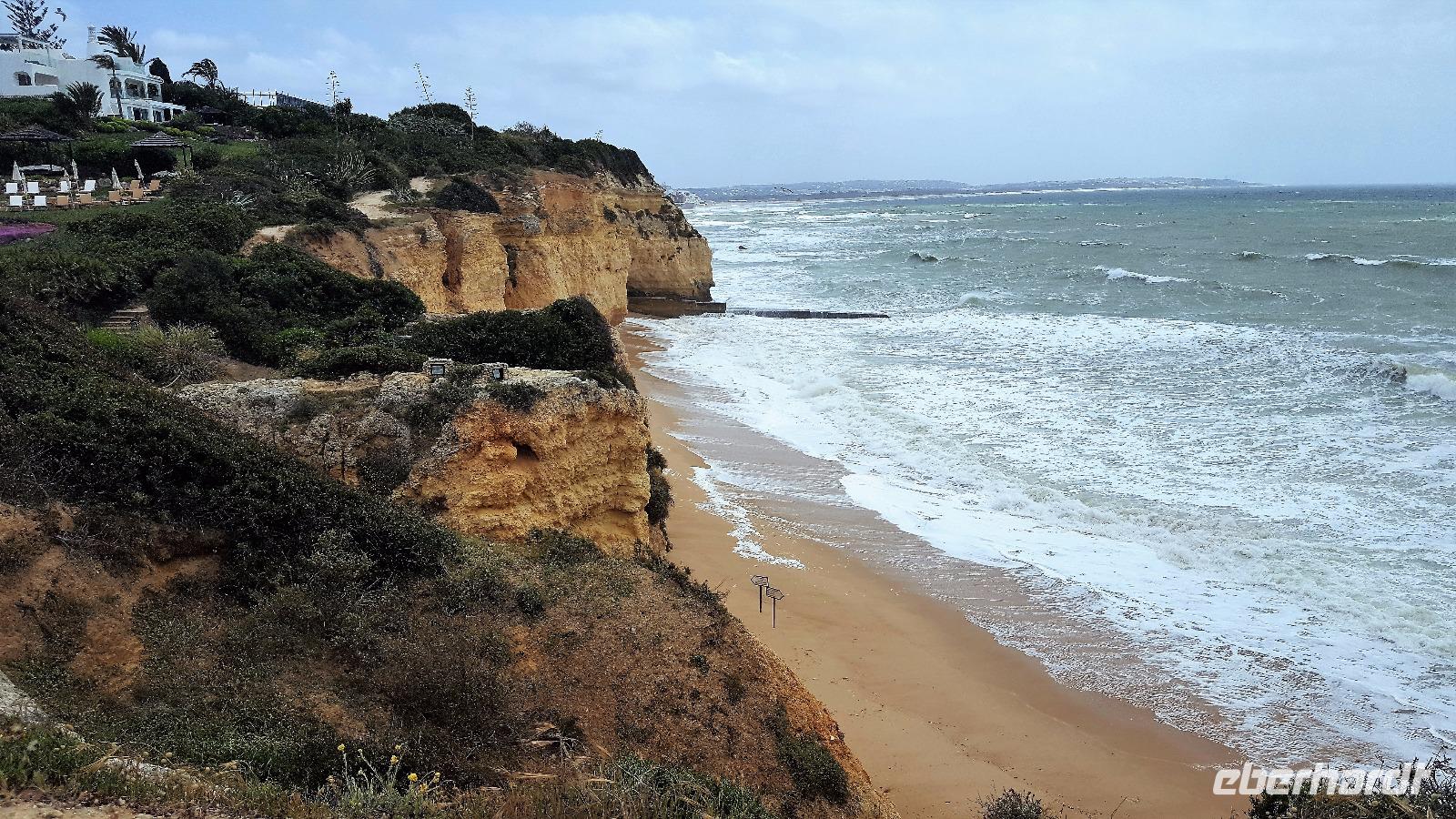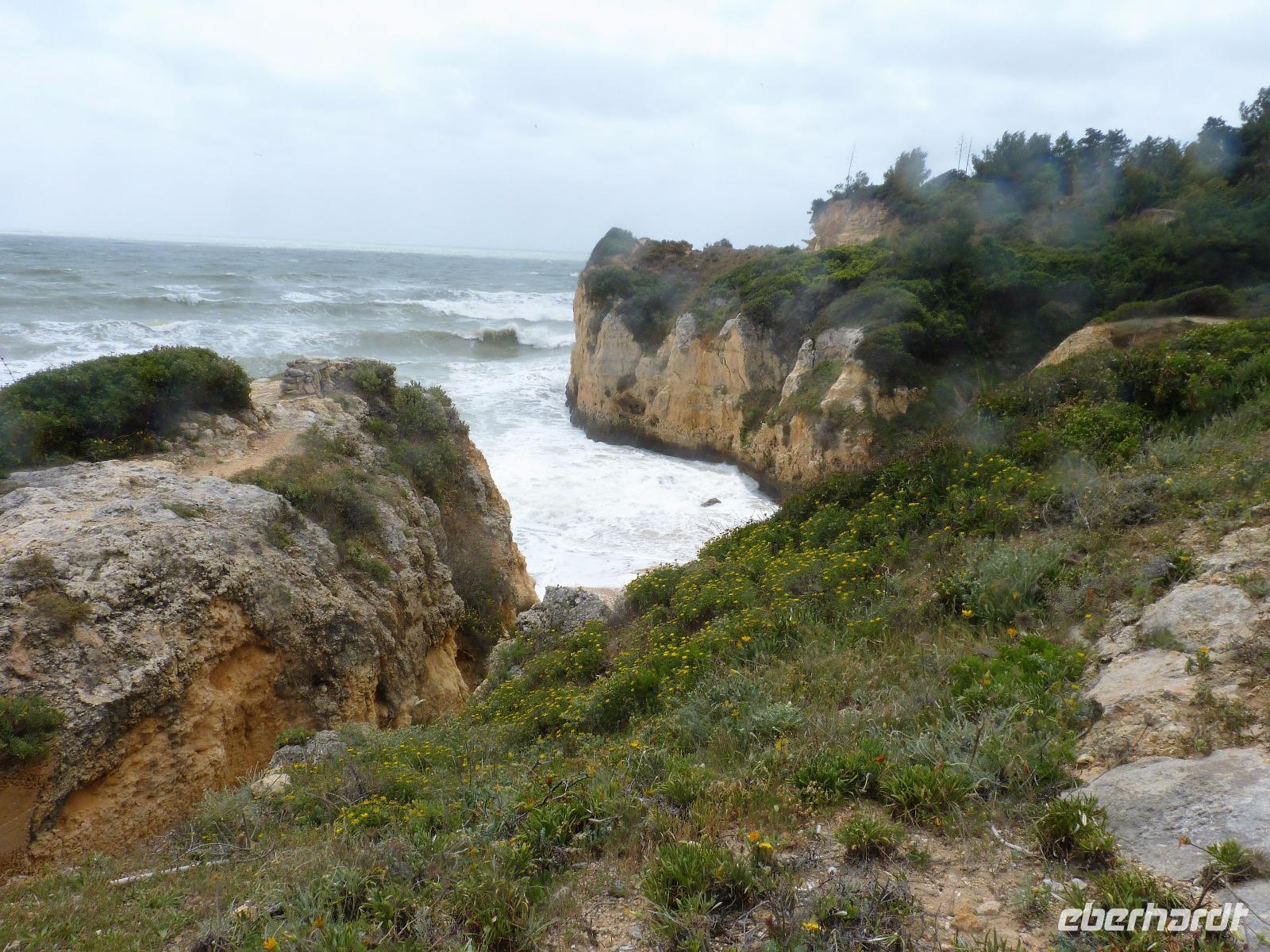 Wunderschöne Panoramablicke gab es beim Spazieren entlang der Kalksteinklippen bei stürmischer See. Nicht umsonst ist die Algarve ein Surferparadies. Ca. 3,6 Kilometer westlich von Armação de Pêra befindet sich eine malerische kleine Kapelle Nossa Senhora da Rocha, auf einer Landspitze gelegen.