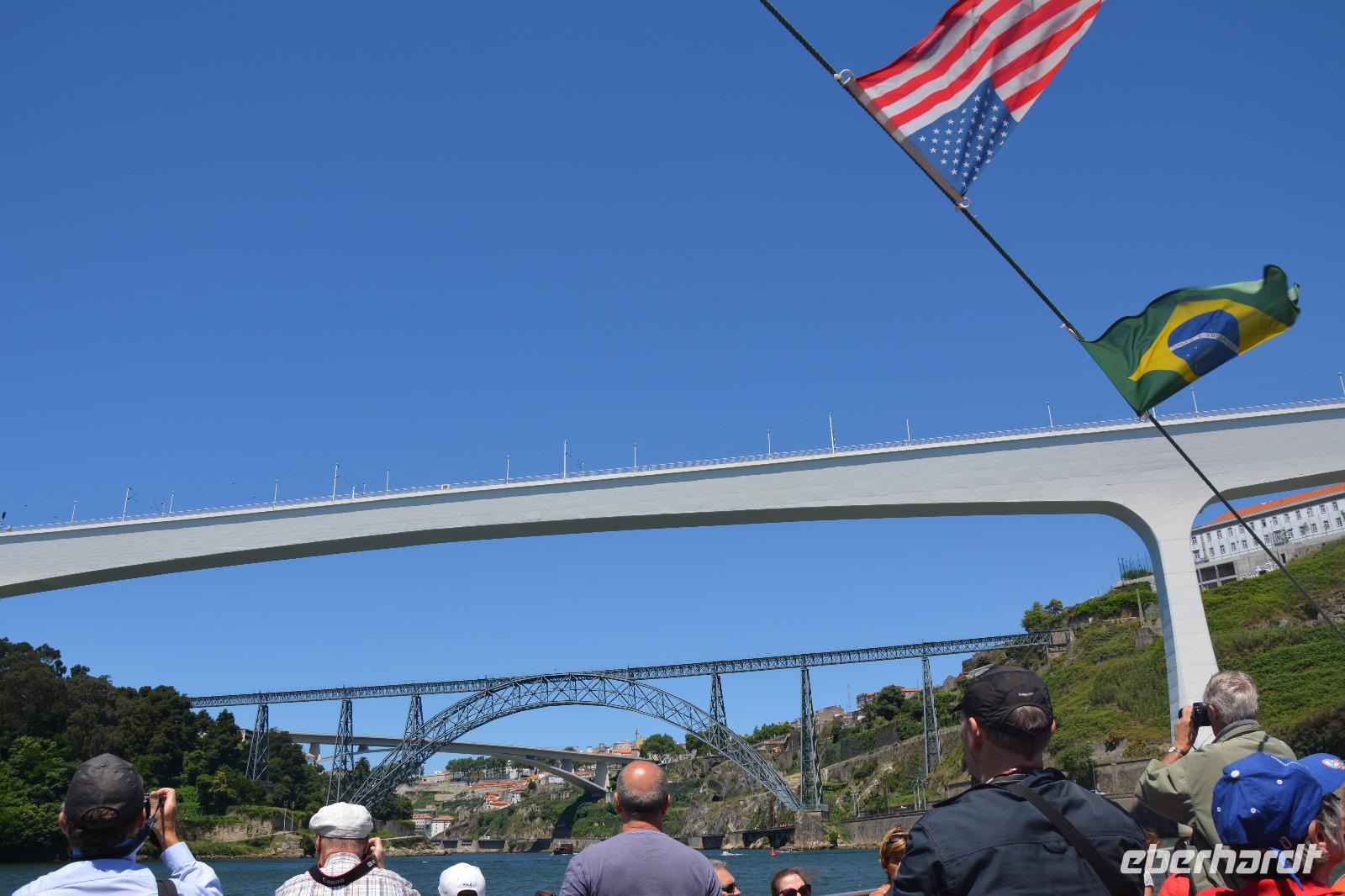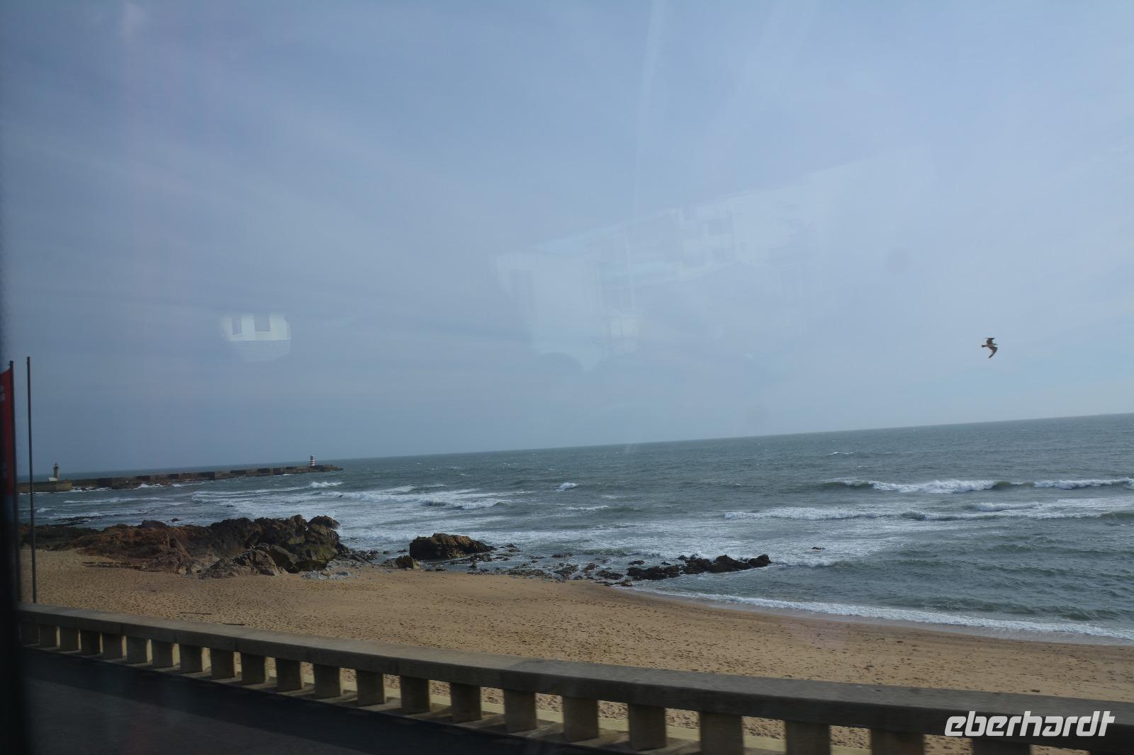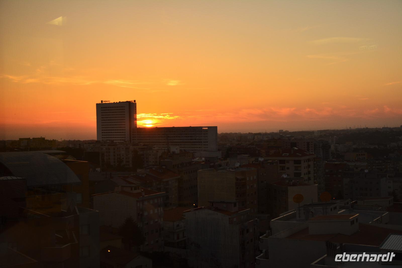 Unser Busfahrer brachte uns ersteinmal in das Zentrum der Stadt, wo wir am Centro Português de Fotografia ausstiegen. Alle mit Audioguide ausgestattet, machten wir uns auf den Weg durch die Stadt, wobei Maria uns allerhand wissenswerte Fakten zur Stadt und den einzelnen Sehenswürdigkeiten lieferte. Von hier aus sahen wir natürlich schon den Torre dos Clérgos (Kleriker-Turm), aber wir machten noch einen kleinen Abstecher über die Rua do Dr. Ferreira da Silva zum neogothischen Gebäude der Buchhandlung Livaria Lello, wo man auch einen kleinen Blick auf die Carmo- und Carmelitas-Kirchen erhaschen konnte. Danach ging es aber zur Besichtigung des Torre dos Clérigos, einem wichtigen Wahrzeichen Portos. Er ist der Glockenturm der barocken Kleriker-Kirche, deren herrliche Ansicht man eigentlich erst richtig on der Rua dos Clérigos aus betrachten kann, die wir dann auch runter spazierten. So gelangten wir zum Praça da Liberdade, dem Platz der Freiheit. Nach einem kurzen Reinschauen in die Katholische Kirche Igreja de Santo António dos Congregados liefen wir weiter zum Bahnhof Porto São Bento. Diese mit den typischen blau weißen Azulejos verkleidete Eingangshalle des Bahnhofs entstand um 1900, und zeigt wichtige Elemente des portugiesischen Königshauses. Aus dem emsigen Gedrängel des Bahnhofs ging es nun den Berg hoch zur Kathedrale von Porto. Nach einer kurzen Besichtigung der durch einen Gottesdienst stark gefüllten Kathedrale, liefen wir weiter vorbei an dem mittelalterlichem Turm Torre de Rua de D. Pedro Pitões und kamen wenige Schritte später zu einer Art Aussichtspunkt. Hier hatte man neben der Igreja de São Lourenço schon einen netten Ausblick auf die Stadt am Duoro. Anschließend bummelten wir gemütlich durch ein paar enge Gassen und konnten die vielfältigen Häuser mit ihren bunten Türen, ihren herrlichen Balkonen und Azulejo bestückten Hauswänden bewundern. Durch die verwinkelten Gassen kamen wir schließlich wieder auf die Cais da Ribeira- ans Duoroufer. Hier meldete Maria uns zur Bootsfahrt auf dem Duoro an. Nachdem sich alle auf dem Boot verteilt hatten, legten wir ab und schipperten flussaufwärts. Nun fuhren wir unter einigen der bekanntesten Brücken Portos hinunter durch, wie zum Beispiel der Ponte Dom Luís I, der Ponte da Arrábida oder der Ponte do Infante; anschließend drehte das Boot und wir fuhren wieder zurück in Richtung Atlantik, konnten bis zur Mündung des Flusses schauen und nach einer Stunde Fahrt kamen wir wieder da an, wo wir schon eingestiegen waren. Jetzt war es mittlerweile 13 Uhr und Zeit für eine Mittagspause hier am wunderschönen Duoroufer. Hier gab es nicht nur eine Vielzahl an verschiedenen Restaurants, sondern auch Souvenirgeschäfte. Nach anderthalb Stunden trafen wir uns an der Bootsanlegestelle wieder, um gemeinsam über die Brücke Dom Luis I. zur Weinkellerei Burmester zu laufen. Hier bekamen wir durch Manuela eine Führung durch den Weinkeller und sehr interessante Erklärungen zur Herstellung, Lagerung und Einteilung der verschiedenen Portweine. So lernten wir über die roten Portweine, die keinen Sauerstoff während der Gärung bekommen, und deswegen ein fruchtiger vollmundiger Wein ist. Oder auch über die Tawny Portweine, deren gold-Karamellfarbe in kleineren Fässern zu Stande kommt, wo sie Luft bekommen und somit diese Farbe annehmen. Anschließend erfolgte dann die Verkostung eines weißen und roten Portweins, den man im Shop natürlich auch kaufen konnte. Anschließend gab es ein wenig Freizeit, um selbstständig die schöne Stadt zu entdecken. Gegen 19:30 Uhr waren wir auch alle wieder vollständig und konnten uns bei dem Abendessen in unserem Hotel über das Erlebte unterhalten. Das Essen war lecker, nur der doch für unseren deutschen Gaumen recht merkwürdig schmeckende Nachtisch, war nicht ganz unser Fall. Kurz nach 21 Uhr konnten wir sogar dank der schönen Lage des Restaurants im Dachgeschoss des Hotels den Sonnenuntergang über der Stadt sehen.