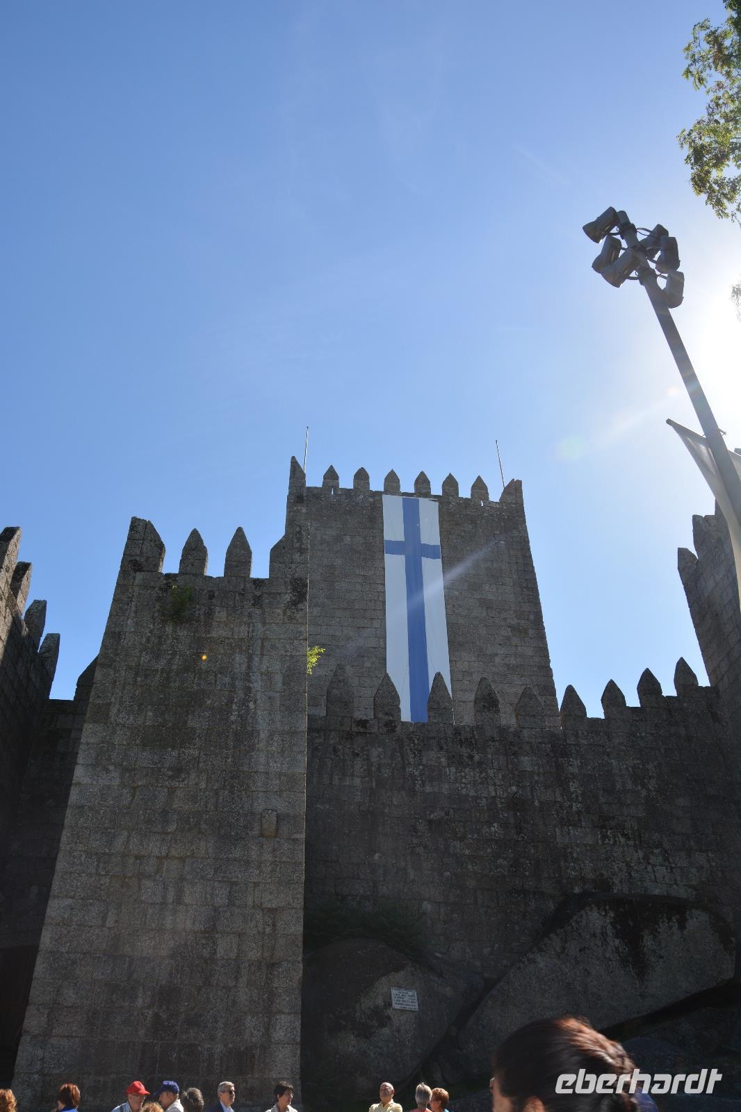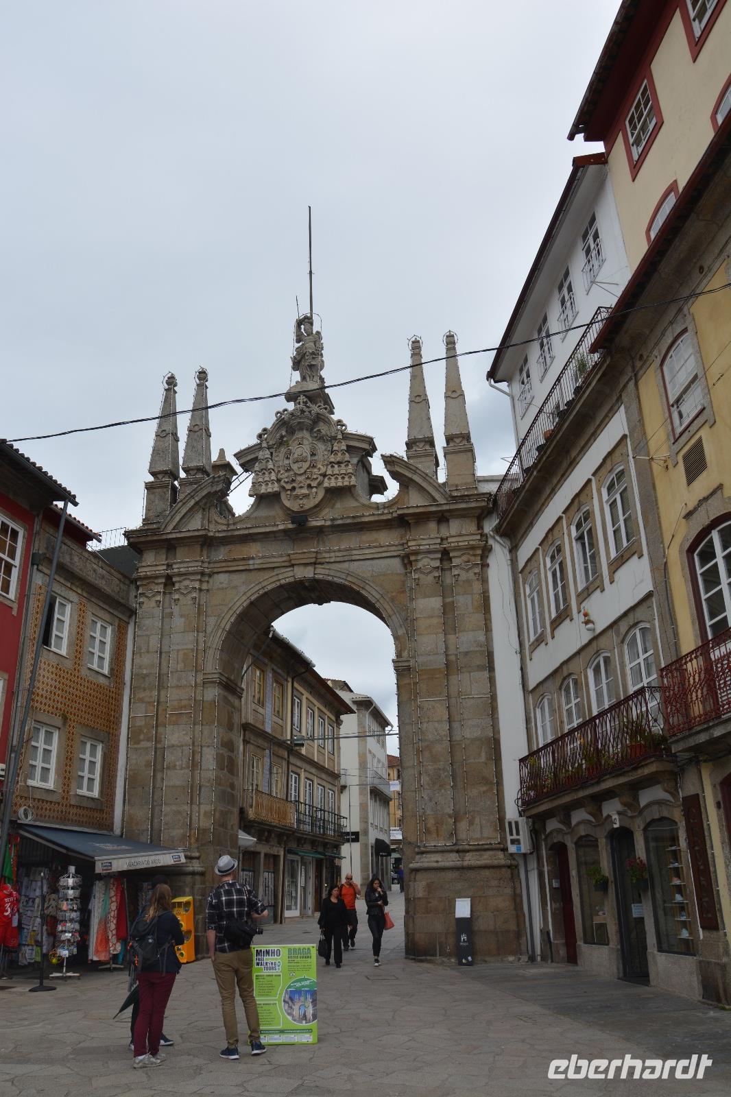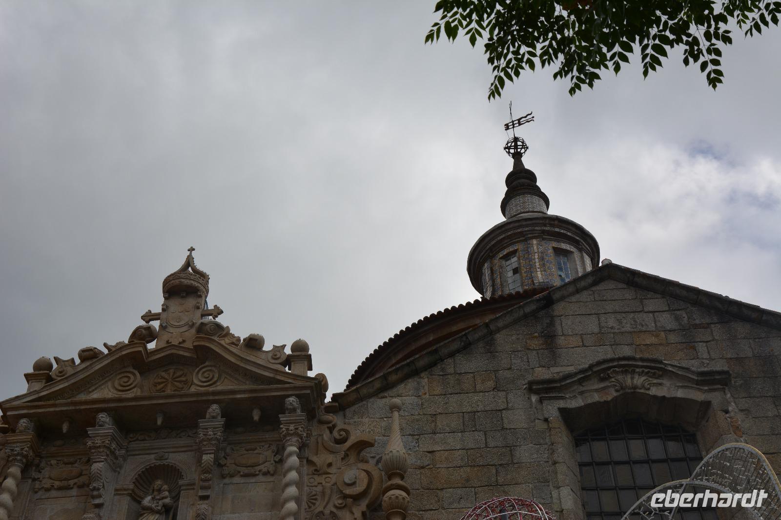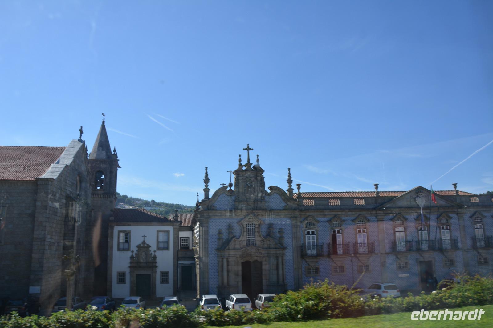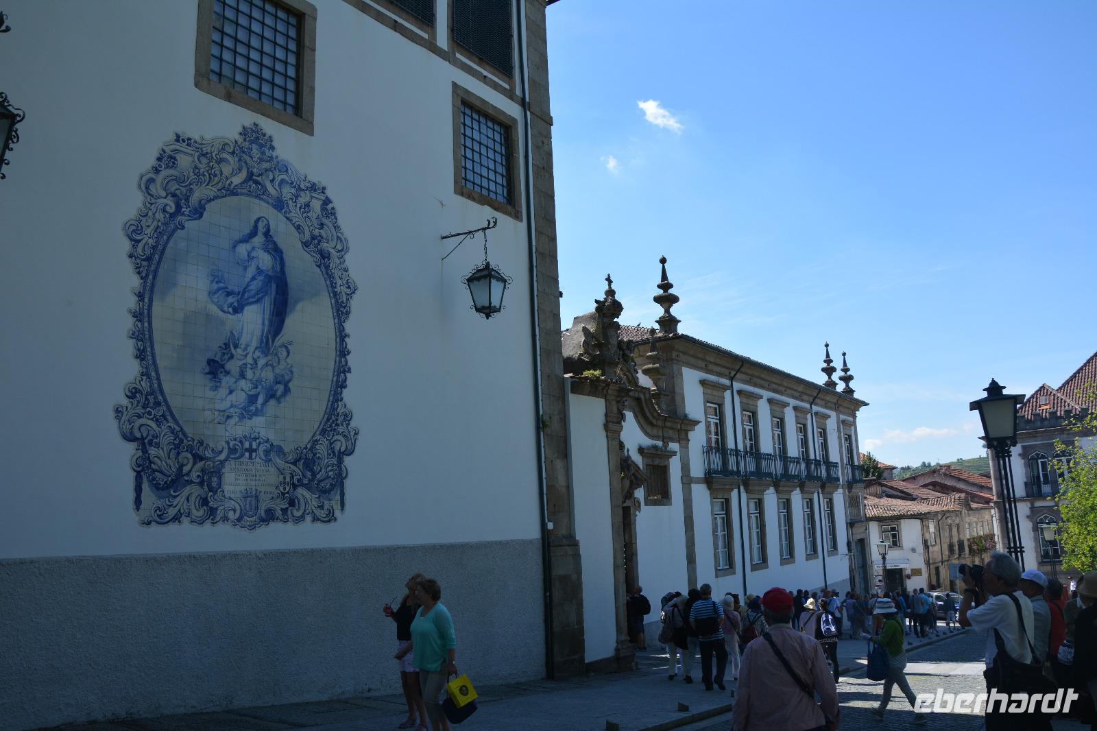 Nach einem gemütlichen Frühstück ist um 9 Uhr Abfahrt nach Guimarães. Durch die Fahrt durch Wälder von Eukalyptusbäumen, spricht Maria über Klima und Vegetation in Portugal. Nur eine Stunde später kommen wir in der UNESCO-Weltkulturerbestadt Guimarães an. Nach einer kurzen Toilettenpause liefen wir den Hügel hoch zu der Burg. Diese romanische Burg aus dem 10. Jahrhundert soll der Geburtsort des im 12. Jahrhundert geborenen ersten Königs von Portugal Alfons I. gewesen sein. Auch an der Capela São Miguel do Castelo, wo der König getauft wurde machten wir Halt. Nach einer Runde entlang der Burg kamen wir auf dem Rückweg auch wieder am Paço Dos Duques De Bragança vorbei, dem Palast des Königs. Anschließend spazierten wir die Straße runter vorbei an Largo Martins Sarmento, an der Kirche Capela a Virgem Maria, Senhora Nossa und dem Nonnenkloster Lar De Santa Estefânia vorbei. Weiter an dem Câmara Municipal de Guimarães vorbei, auf die Rua de Santa Maria, der mittelalterlichen Straße. Die hübsche Altstadt präsentierte sich uns bei der Besichtigung des Praça de São Tiago und dem Ölbaumplatz mit dem Alpendre, der quadratischen Säulenhalle. Hier besichtigten wir auch kurz die Igreja de Nossa Senhora da Oliveira. Hier war wieder eine schöne Gelegenheit sich ein nettes Plätzchen für die Mittagspause zu suchen oder die hübschen Gassen zu durchschlendern.Gegen 13:00 Uhr trafen wir uns dann alle bei der Bushaltestelle nahe der Igreja dos Santos-Passos und fuhren zu der Wallfahrtskirche nach Bom Jesus. Nur dreißig Minuten später standen wir vor dem Eingang zu der 1882 errichteten, ältesten Wasserballastbahn (Standseilbahn) der Welt, mit der wir den Berg hoch zur Kirche hinauffuhren. Nur wenige Minuten später sind wir oben, und steigen aus und können diesen herrlichen Ausblick kaum fassen. Maria sagte nach Ankunft einiges Wissenswertes und anschließend hatten wir genügend Zeit für individuelle Erkundungen der Kirche und der Anlage. Anschließend konnte man mit der Bahn wieder hinunterfahren oder die Via Sacra nach unten gehen. 570 Stufen bis ganz runter, wurden gezählt! Nachdem alle wieder im Bus saßen, konnten wir die Weiterfahrt nach Braga antreten. Bei Einfahrt in die Stadt Braga blicken uns 80er-Jahre Plattenbauten entgegen, die nicht sonderlich einladend aussahen, aber nach kurzer Fahrt erreichen wir das hübsche Innere der Stadt. Hier stiegen wir aus und unternahmen einen Nachmittagsspaziergang durch die Fußgängerzonen von Braga. Durch den Torbogen Arco da Nova Porta aus dem 16. Jahrhundert ging es vorbei an unzähligen Geschäften. Wir kamen an dem Episcopal Palace vorbei und dem herrlichen Rosengarten, an der Residence of the Crivos Casa dos Crivos und besichtigten die Igreja de Santa Cruz.