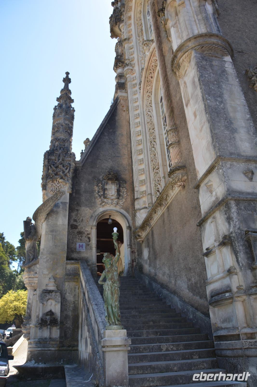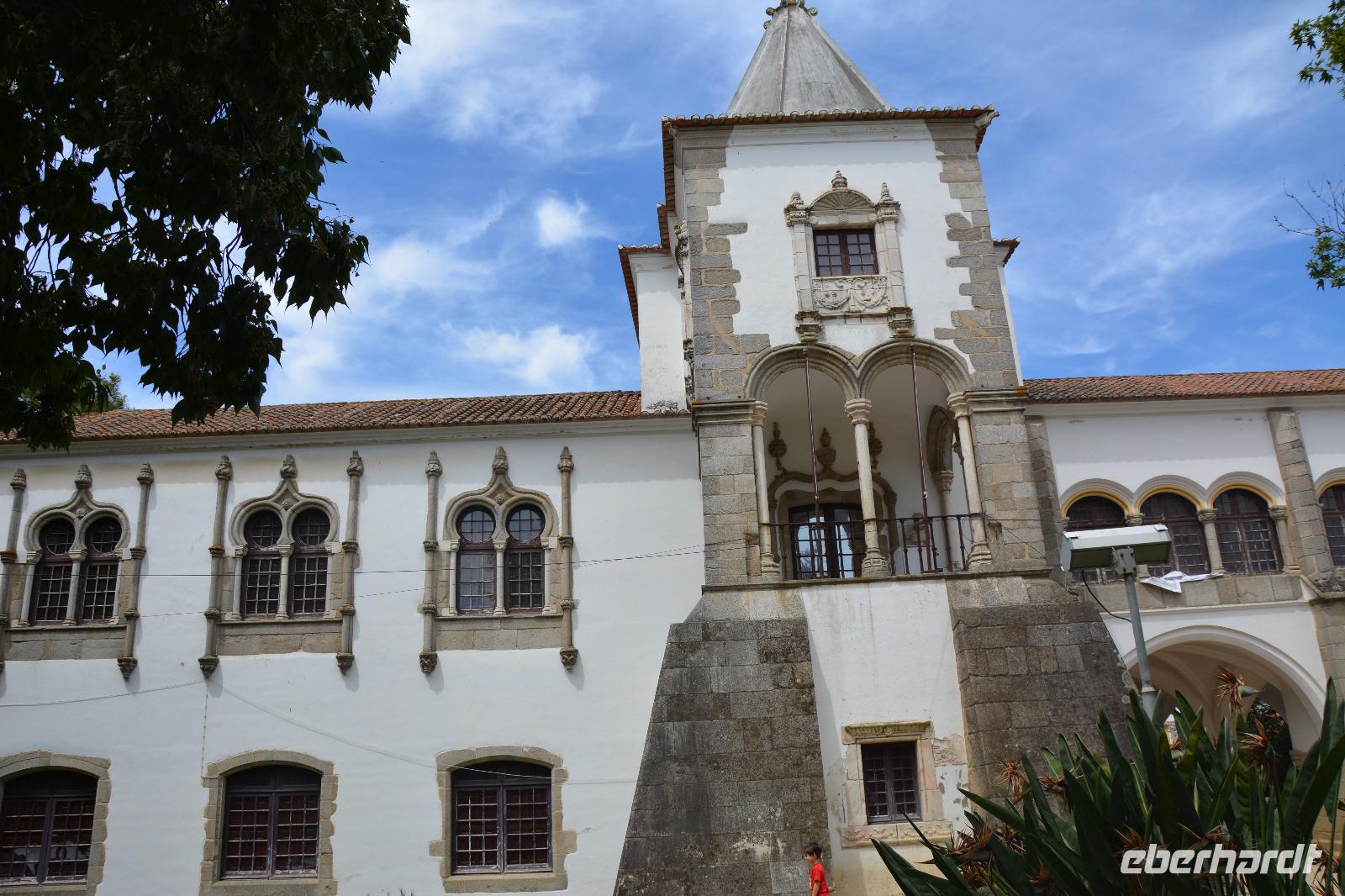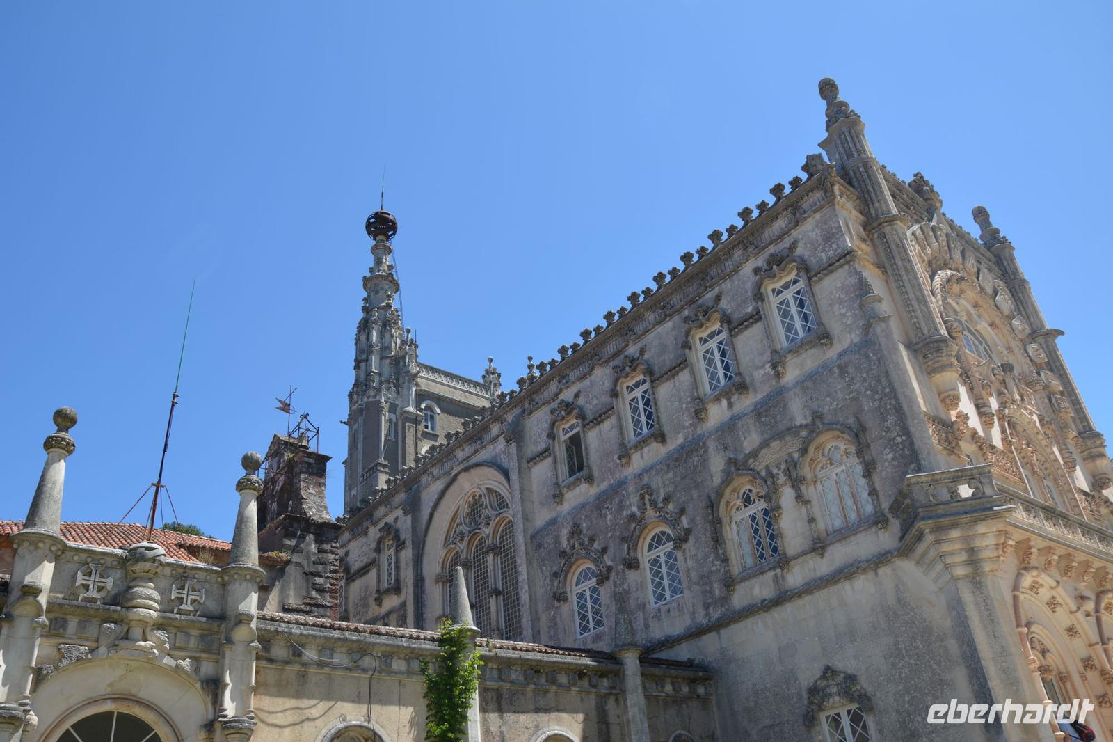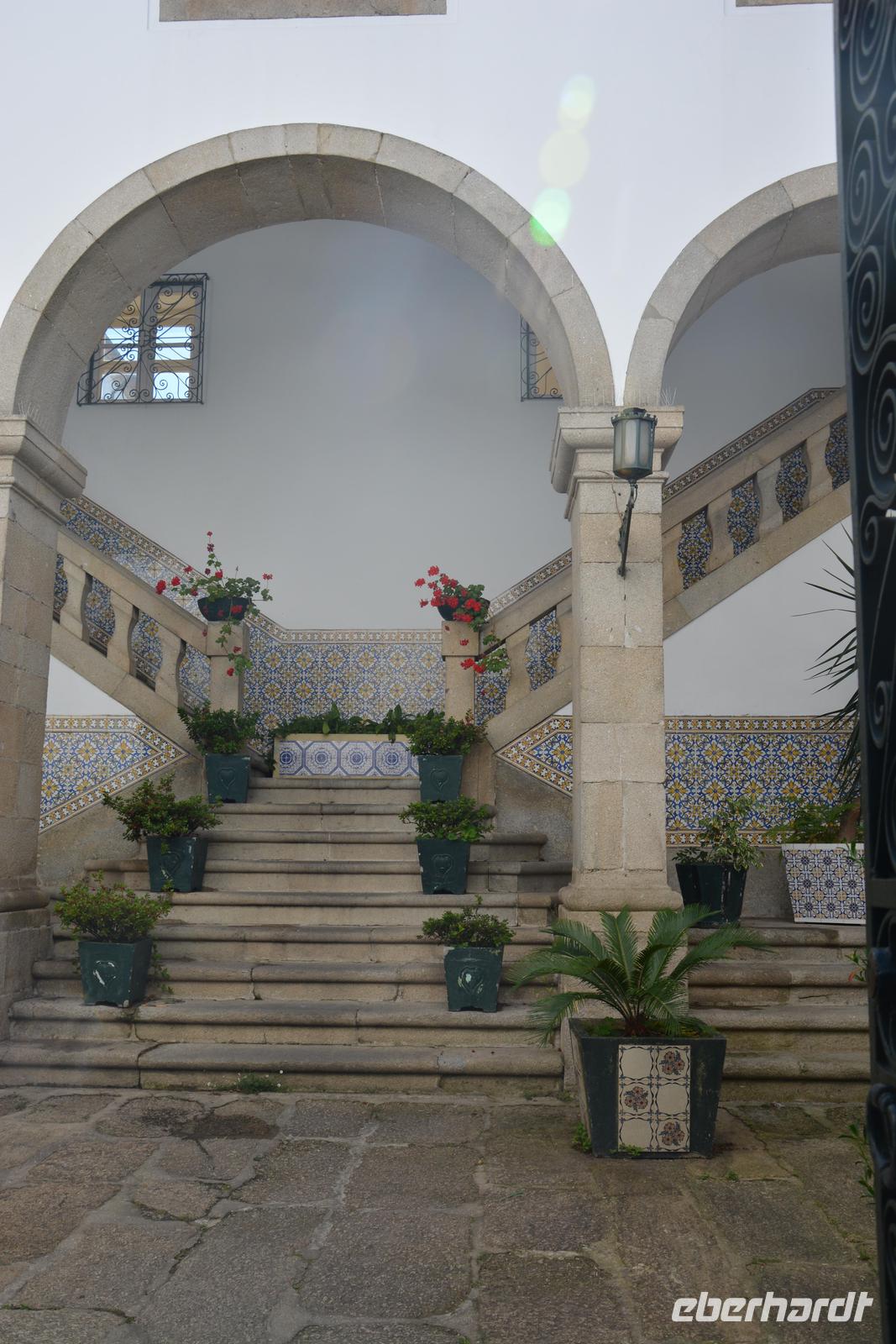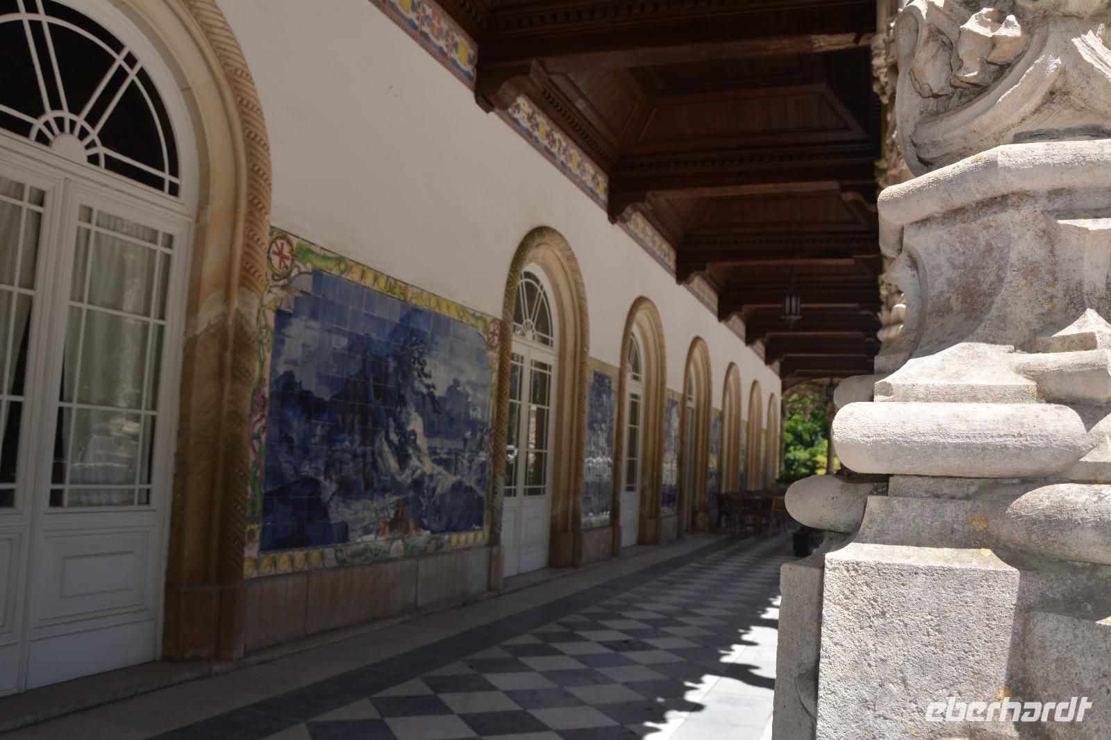 Nach einer Stunde Fahrt erreichen wir die Stadt Viseu mit seinen 200.000 Einwohnern. Wir stiegen am Jardim Tomás Ribeiro aus, ein schöner Platz mit einem Springbrunnen. Wir starten unseren Stadtspaziergang bergauf über Kopfsteinpflaster, vorbei am Jardim das Maes mit seinen herrlichen blau blühenden Hortensien hin zum Museu do Almeida Moreira mit seinen blau weißen Azulejokanten. Danach setzten wir unseren Gang an alten mit Kacheln besetzten Häusern zu den Kirchen fort. Wir besichtigten zuerst die Igreja da Misericordia und anschließend die Kathedrale von Viseu. Viele Schwalben flogen über unsere Köpfe, als wir durch die Gänge mit Azulejos geschmückten Wänden liefen. In der Kirche beeindruckten uns das herrliche gotische Deckengewölbe mit den Knoten, die zwei kunstvoll gearbeiteten Kanzeln und die Deckenmalerei bei dem goldenen Altar. Anschließend hatten wir noch kurz Zeit einen Blick in die imposante Kathedrale von Viseu, deren Baugeschichte auf das 11. Jahrhundert zurückreicht, zu werfen. Durch einen Rundgang kamen wir durch die Fußgängerzone bei unserem Ausstiegsplatz zurück. Nun hatten wir noch eine Viertelstunde Zeit, um einen Muntermachenden Kaffee zu trinken und ein Pastel zu naschen und dann wieder in den Bus zu steigen. Gegen 12 Uhr waren wir nicht mehr weit von unserem nächsten Ziel dem Wald von Buçaco entfernt. Der Weg ging kurvig einen Berg hinauf. Da wir in gemütlichem Tempo einem kleinen Traktor hinterher fuhren, konnten wir die Aussicht auf das herrlich bewaldete Gebiet genießen. Im Wald von Buçaco angekommen beeindruckte uns das wunderschöne Schloss, und während wir kurz Freizeit hatten, konnten wir das Schloss und dessen Parkanlage durchlaufen und umrunden, und somit die wunderschönen Details der Architektur bewundern.
