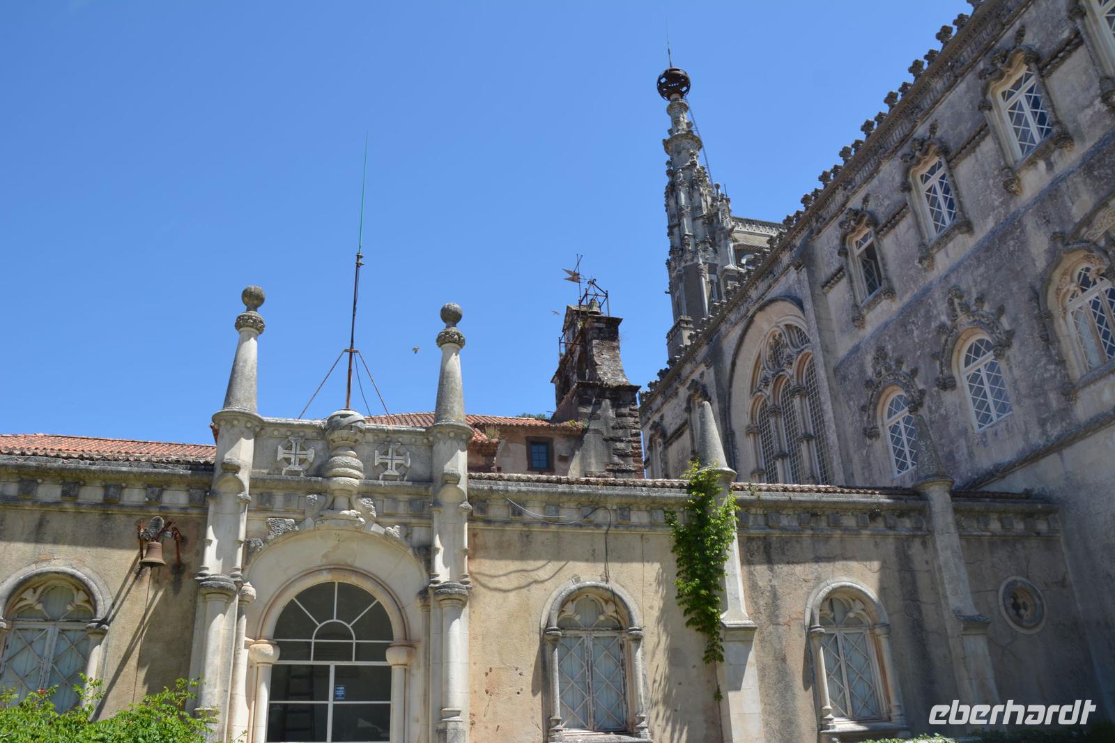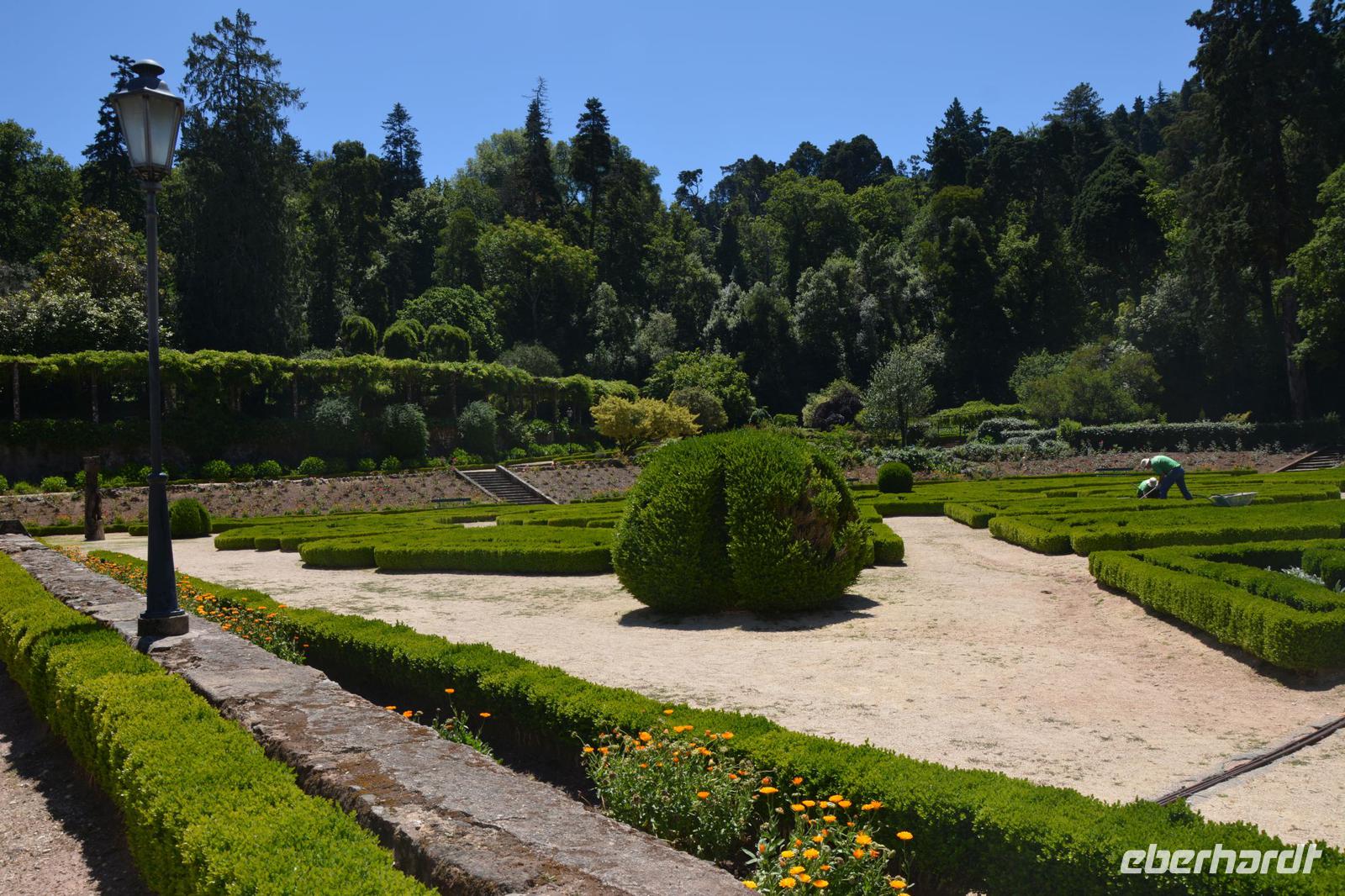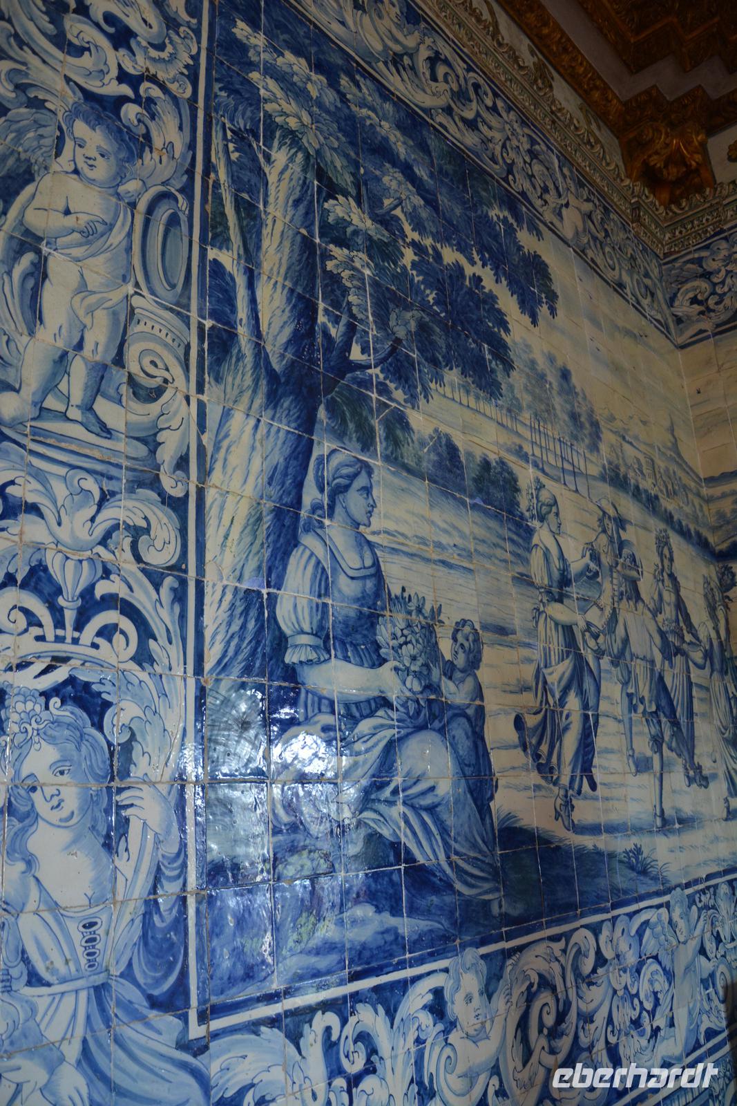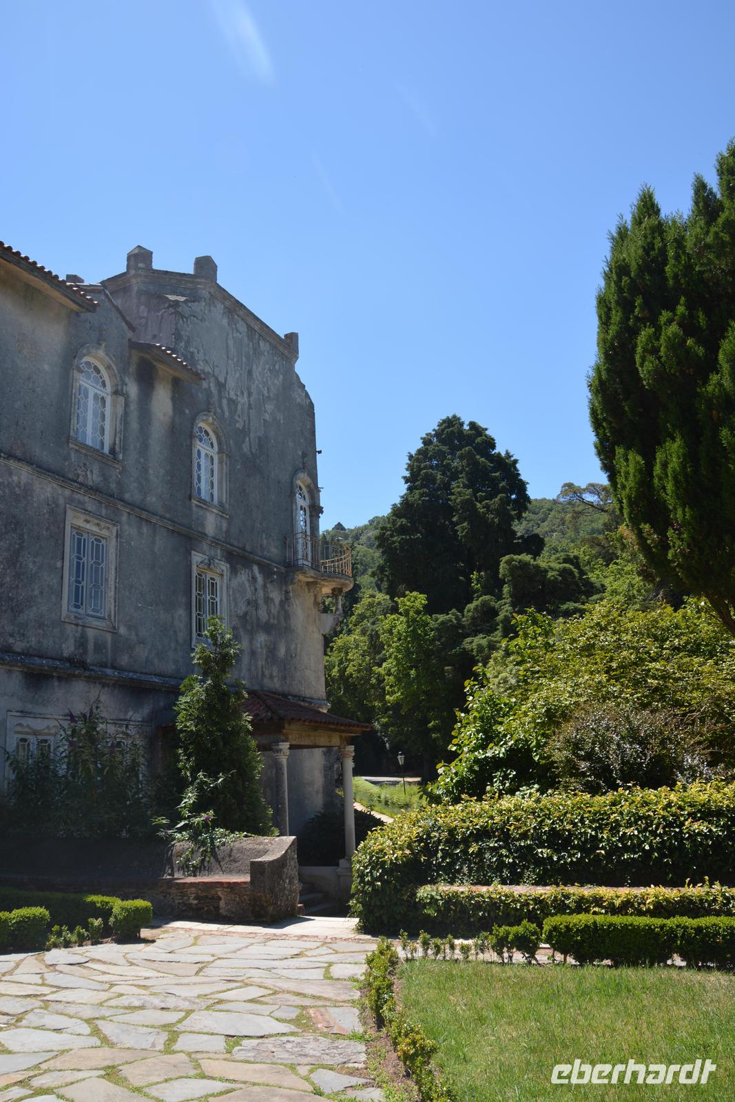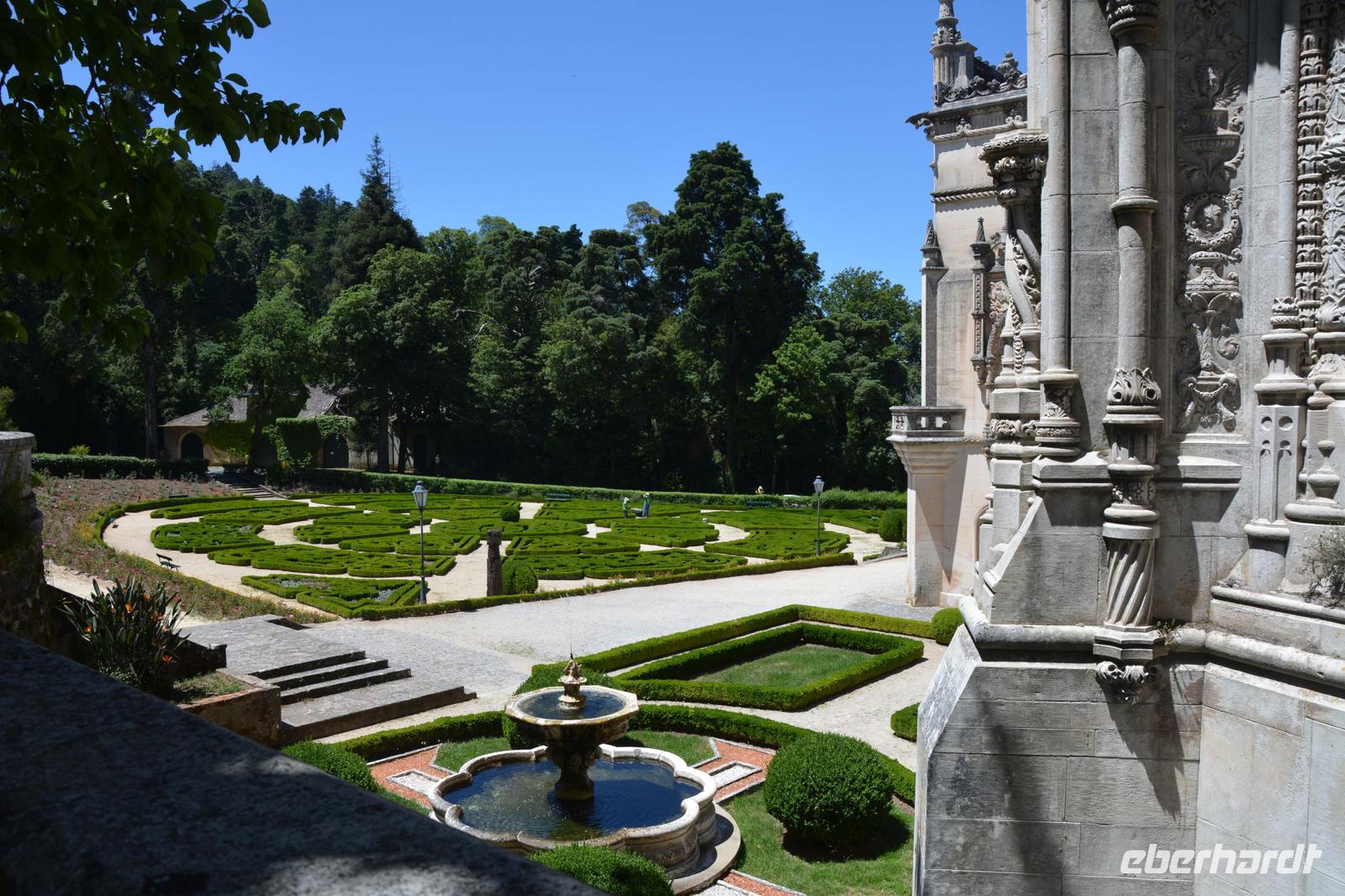 Nach einer Stunde Fahrt erreichen wir die Stadt Viseu mit seinen 200.000 Einwohnern. Wir stiegen am Jardim Tomás Ribeiro aus, ein schöner Platz mit einem Springbrunnen. Wir starten unseren Stadtspaziergang bergauf über Kopfsteinpflaster, vorbei am Jardim das Maes mit seinen herrlichen blau blühenden Hortensien hin zum Museu do Almeida Moreira mit seinen blau weißen Azulejokanten. Danach setzten wir unseren Gang an alten mit Kacheln besetzten Häusern zu den Kirchen fort. Wir besichtigten zuerst die Igreja da Misericordia und anschließend die Kathedrale von Viseu. Viele Schwalben flogen über unsere Köpfe, als wir durch die Gänge mit Azulejos geschmückten Wänden liefen. In der Kirche beeindruckten uns das herrliche gotische Deckengewölbe mit den Knoten, die zwei kunstvoll gearbeiteten Kanzeln und die Deckenmalerei bei dem goldenen Altar. Anschließend hatten wir noch kurz Zeit einen Blick in die imposante Kathedrale von Viseu, deren Baugeschichte auf das 11. Jahrhundert zurückreicht, zu werfen. Durch einen Rundgang kamen wir durch die Fußgängerzone bei unserem Ausstiegsplatz zurück. Nun hatten wir noch eine Viertelstunde Zeit, um einen Muntermachenden Kaffee zu trinken und ein Pastel zu naschen und dann wieder in den Bus zu steigen. Gegen 12 Uhr waren wir nicht mehr weit von unserem nächsten Ziel dem Wald von Buçaco entfernt. Der Weg ging kurvig einen Berg hinauf. Da wir in gemütlichem Tempo einem kleinen Traktor hinterher fuhren, konnten wir die Aussicht auf das herrlich bewaldete Gebiet genießen. Im Wald von Buçaco angekommen beeindruckte uns das wunderschöne Schloss, und während wir kurz Freizeit hatten, konnten wir das Schloss und dessen Parkanlage durchlaufen und umrunden, und somit die wunderschönen Details der Architektur bewundern.