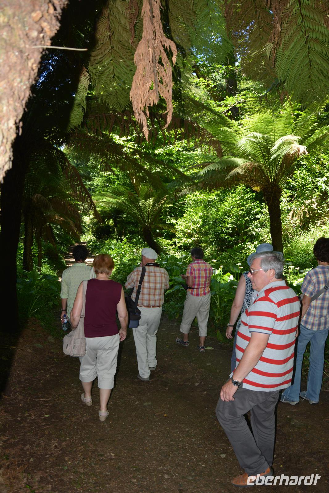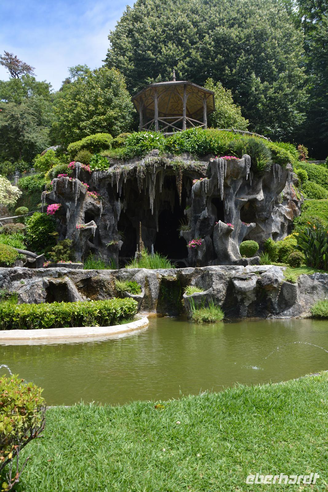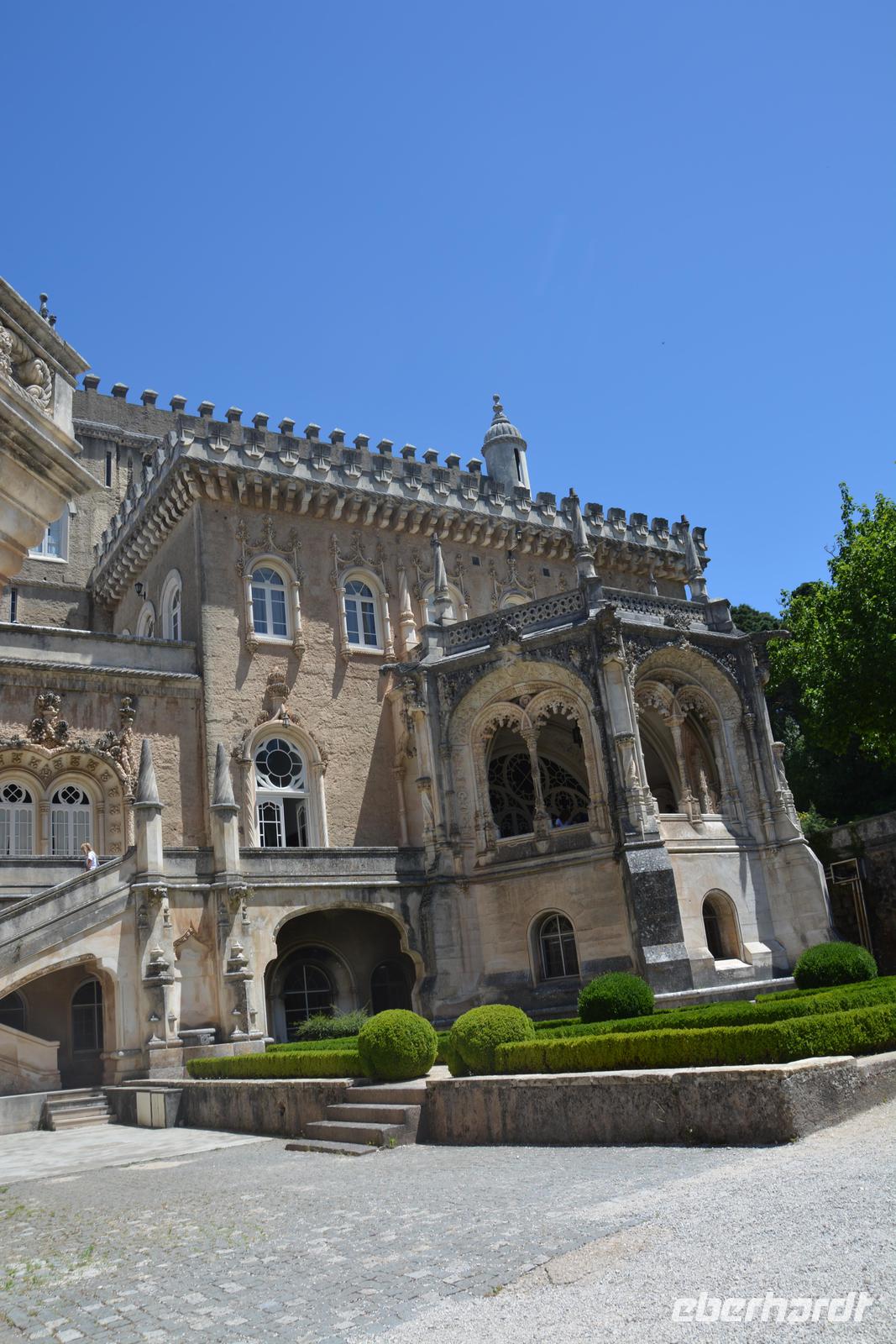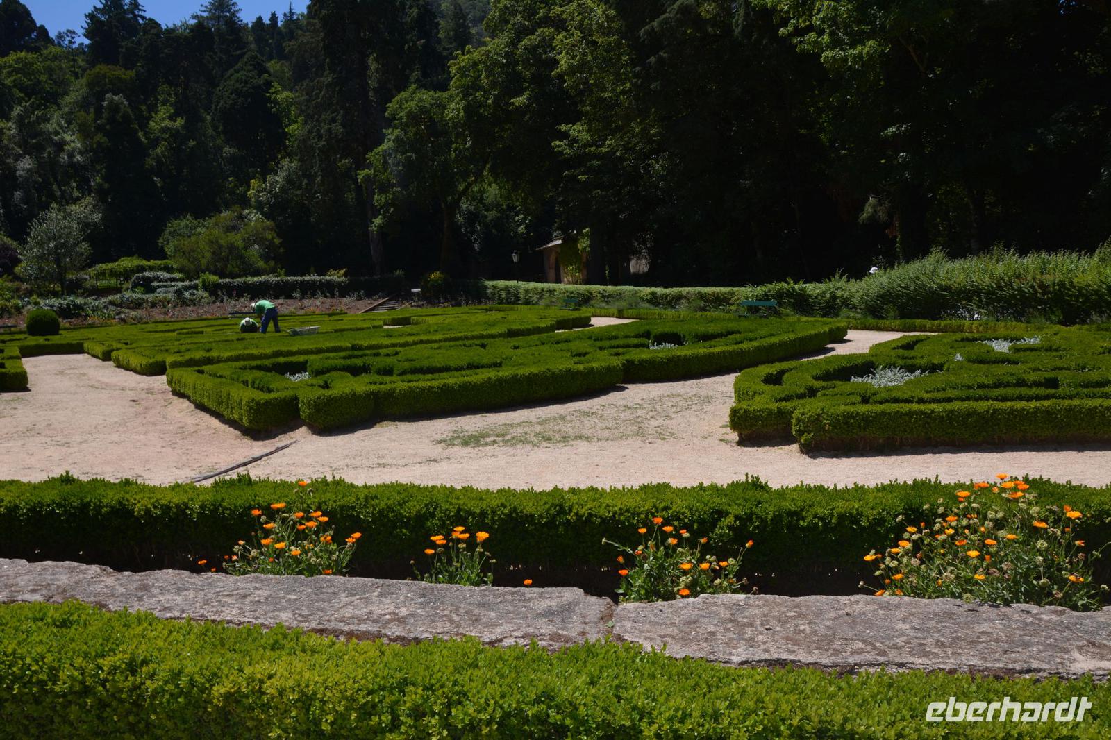 Nach einer Stunde Fahrt erreichen wir die Stadt Viseu mit seinen 200.000 Einwohnern. Wir stiegen am Jardim Tomás Ribeiro aus, ein schöner Platz mit einem Springbrunnen. Wir starten unseren Stadtspaziergang bergauf über Kopfsteinpflaster, vorbei am Jardim das Maes mit seinen herrlichen blau blühenden Hortensien hin zum Museu do Almeida Moreira mit seinen blau weißen Azulejokanten. Danach setzten wir unseren Gang an alten mit Kacheln besetzten Häusern zu den Kirchen fort. Wir besichtigten zuerst die Igreja da Misericordia und anschließend die Kathedrale von Viseu. Viele Schwalben flogen über unsere Köpfe, als wir durch die Gänge mit Azulejos geschmückten Wänden liefen. In der Kirche beeindruckten uns das herrliche gotische Deckengewölbe mit den Knoten, die zwei kunstvoll gearbeiteten Kanzeln und die Deckenmalerei bei dem goldenen Altar. Anschließend hatten wir noch kurz Zeit einen Blick in die imposante Kathedrale von Viseu, deren Baugeschichte auf das 11. Jahrhundert zurückreicht, zu werfen. Durch einen Rundgang kamen wir durch die Fußgängerzone bei unserem Ausstiegsplatz zurück. Nun hatten wir noch eine Viertelstunde Zeit, um einen Muntermachenden Kaffee zu trinken und ein Pastel zu naschen und dann wieder in den Bus zu steigen. Gegen 12 Uhr waren wir nicht mehr weit von unserem nächsten Ziel dem Wald von Buçaco entfernt. Der Weg ging kurvig einen Berg hinauf. Da wir in gemütlichem Tempo einem kleinen Traktor hinterher fuhren, konnten wir die Aussicht auf das herrlich bewaldete Gebiet genießen. Im Wald von Buçaco angekommen beeindruckte uns das wunderschöne Schloss, und während wir kurz Freizeit hatten, konnten wir das Schloss und dessen Parkanlage durchlaufen und umrunden, und somit die wunderschönen Details der Architektur bewundern.