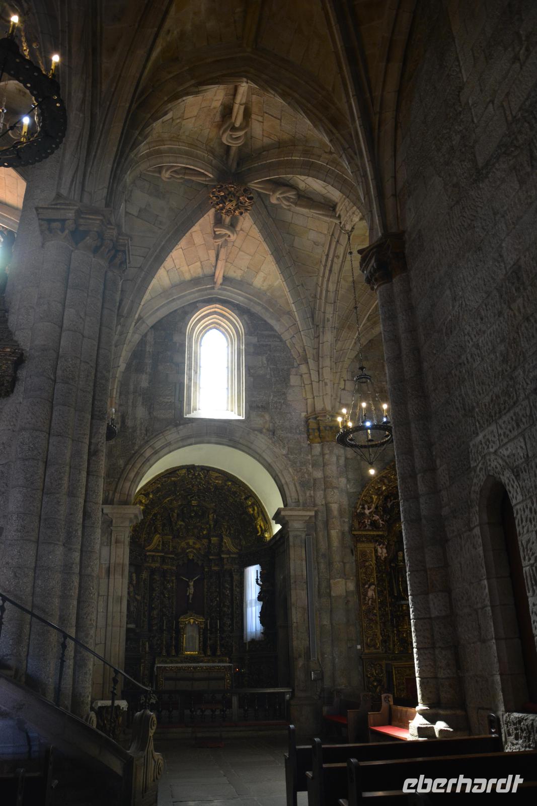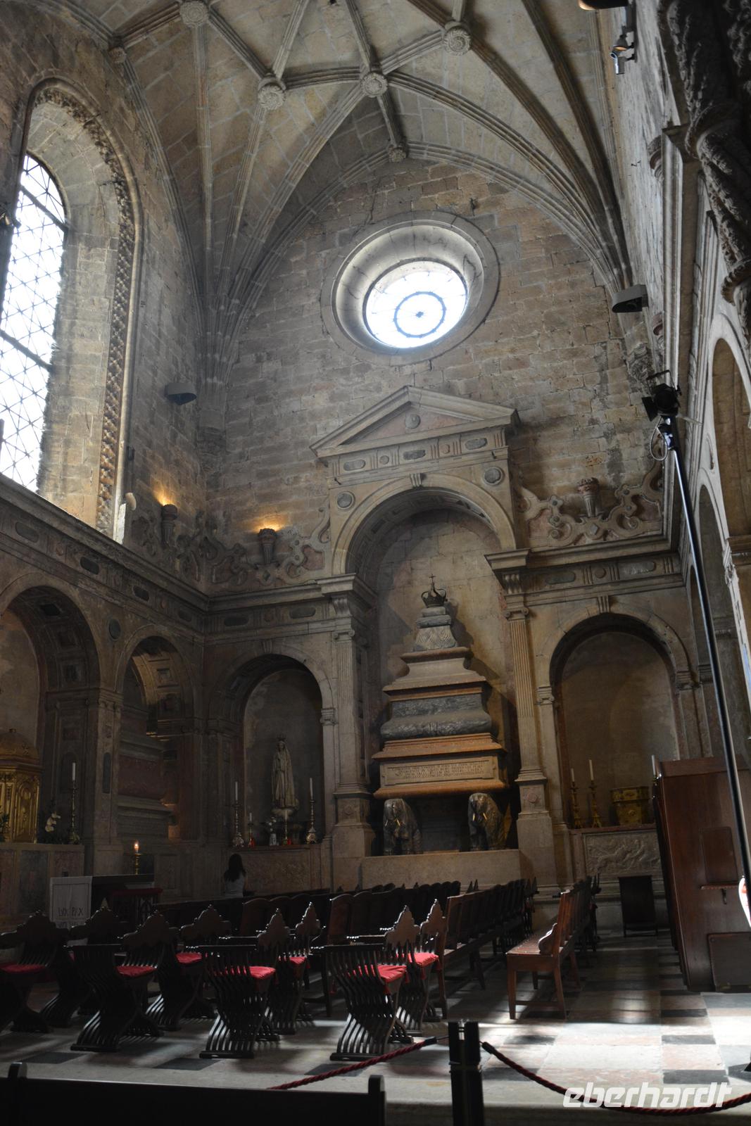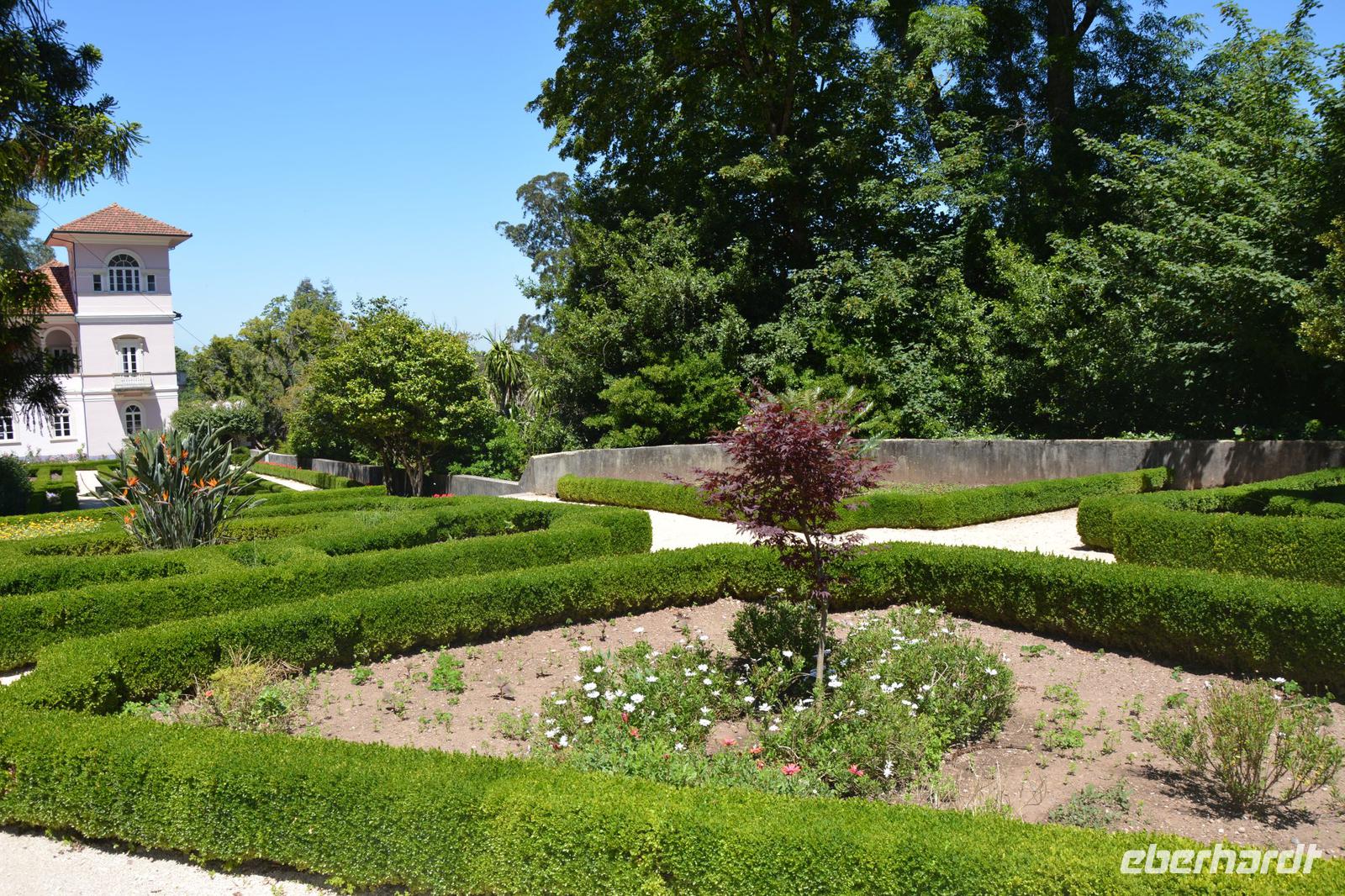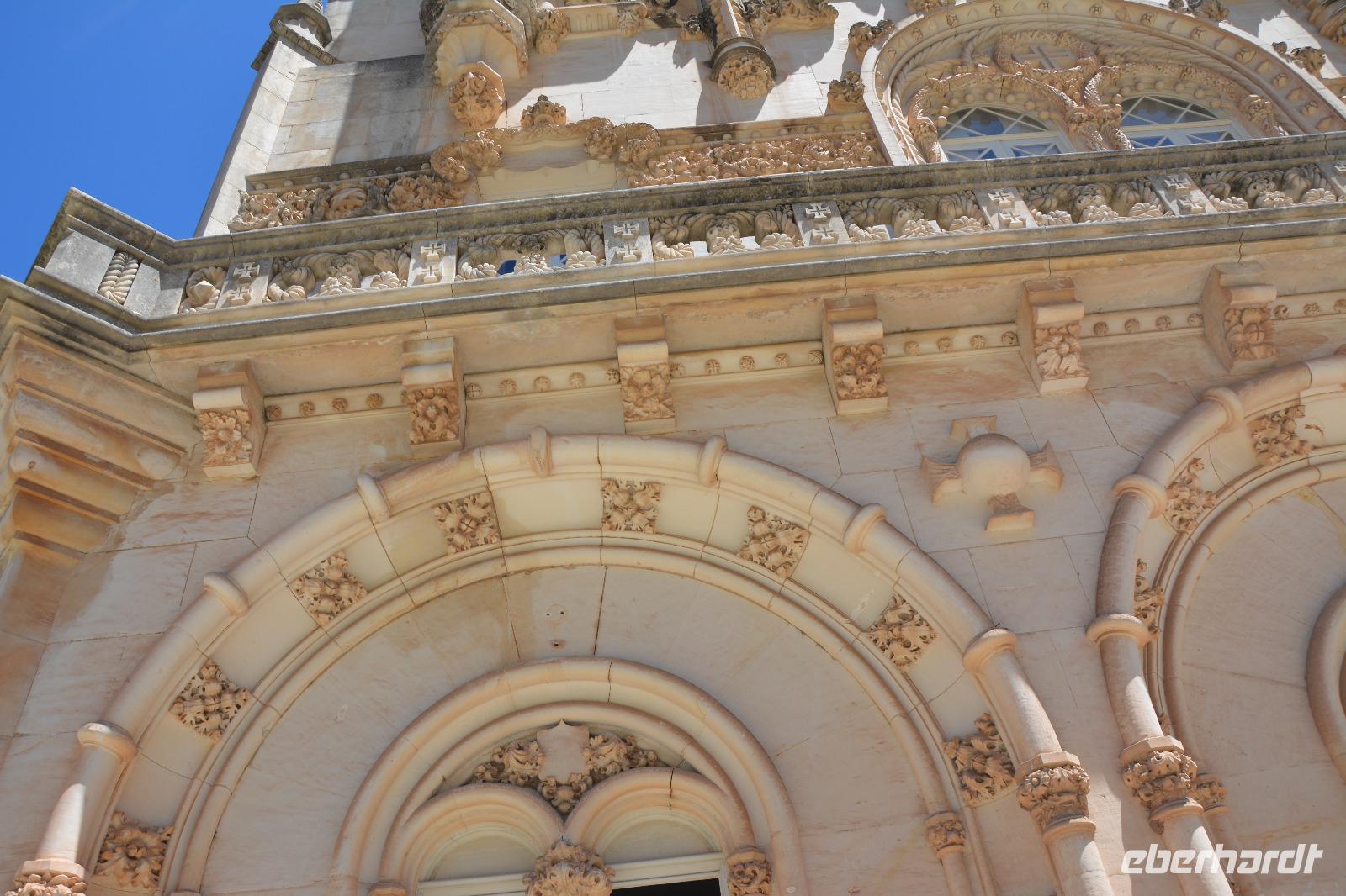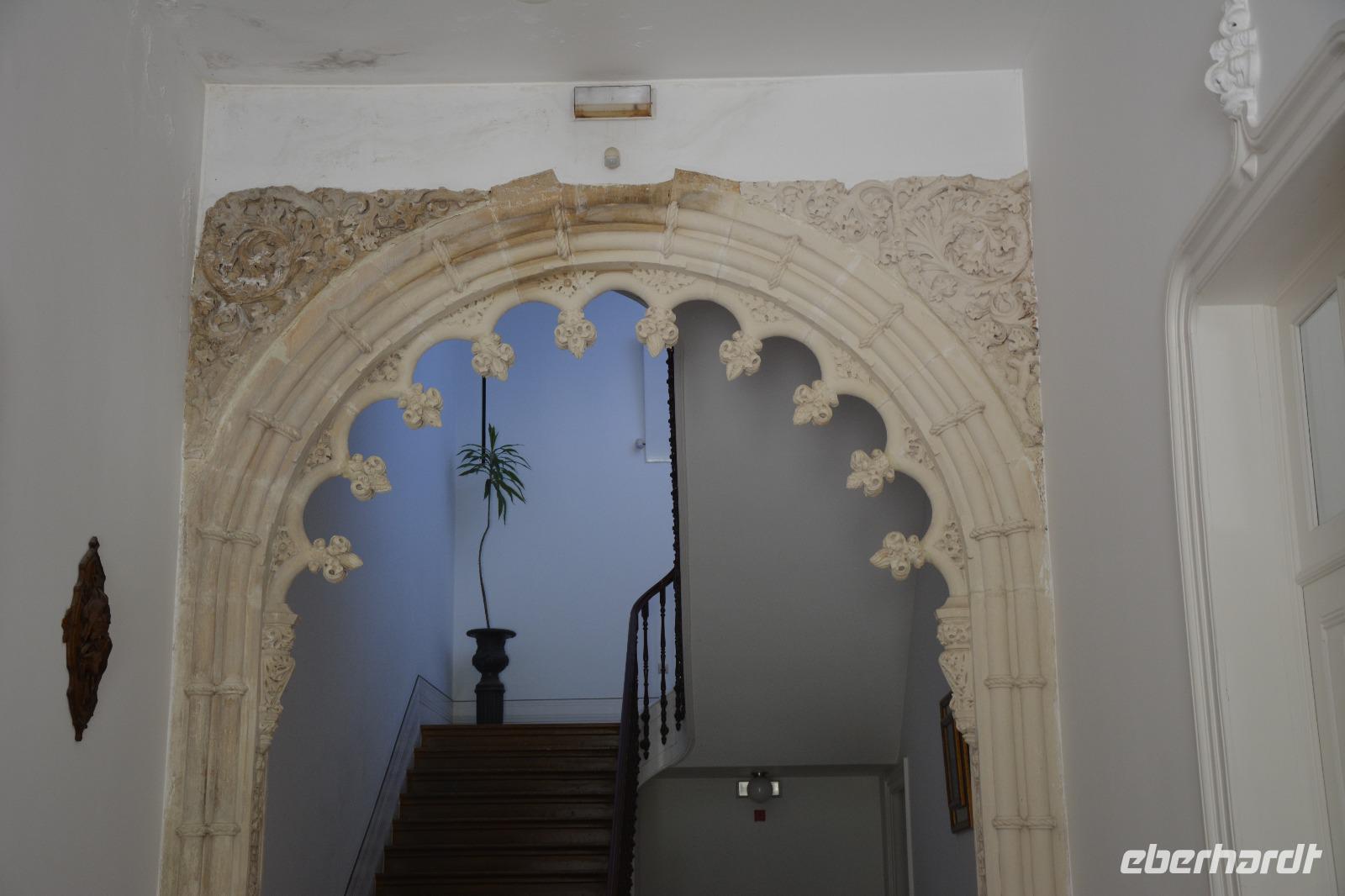 Nach einer Stunde Fahrt erreichen wir die Stadt Viseu mit seinen 200.000 Einwohnern. Wir stiegen am Jardim Tomás Ribeiro aus, ein schöner Platz mit einem Springbrunnen. Wir starten unseren Stadtspaziergang bergauf über Kopfsteinpflaster, vorbei am Jardim das Maes mit seinen herrlichen blau blühenden Hortensien hin zum Museu do Almeida Moreira mit seinen blau weißen Azulejokanten. Danach setzten wir unseren Gang an alten mit Kacheln besetzten Häusern zu den Kirchen fort. Wir besichtigten zuerst die Igreja da Misericordia und anschließend die Kathedrale von Viseu. Viele Schwalben flogen über unsere Köpfe, als wir durch die Gänge mit Azulejos geschmückten Wänden liefen. In der Kirche beeindruckten uns das herrliche gotische Deckengewölbe mit den Knoten, die zwei kunstvoll gearbeiteten Kanzeln und die Deckenmalerei bei dem goldenen Altar. Anschließend hatten wir noch kurz Zeit einen Blick in die imposante Kathedrale von Viseu, deren Baugeschichte auf das 11. Jahrhundert zurückreicht, zu werfen. Durch einen Rundgang kamen wir durch die Fußgängerzone bei unserem Ausstiegsplatz zurück. Nun hatten wir noch eine Viertelstunde Zeit, um einen Muntermachenden Kaffee zu trinken und ein Pastel zu naschen und dann wieder in den Bus zu steigen. Gegen 12 Uhr waren wir nicht mehr weit von unserem nächsten Ziel dem Wald von Buçaco entfernt. Der Weg ging kurvig einen Berg hinauf. Da wir in gemütlichem Tempo einem kleinen Traktor hinterher fuhren, konnten wir die Aussicht auf das herrlich bewaldete Gebiet genießen. Im Wald von Buçaco angekommen beeindruckte uns das wunderschöne Schloss, und während wir kurz Freizeit hatten, konnten wir das Schloss und dessen Parkanlage durchlaufen und umrunden, und somit die wunderschönen Details der Architektur bewundern.