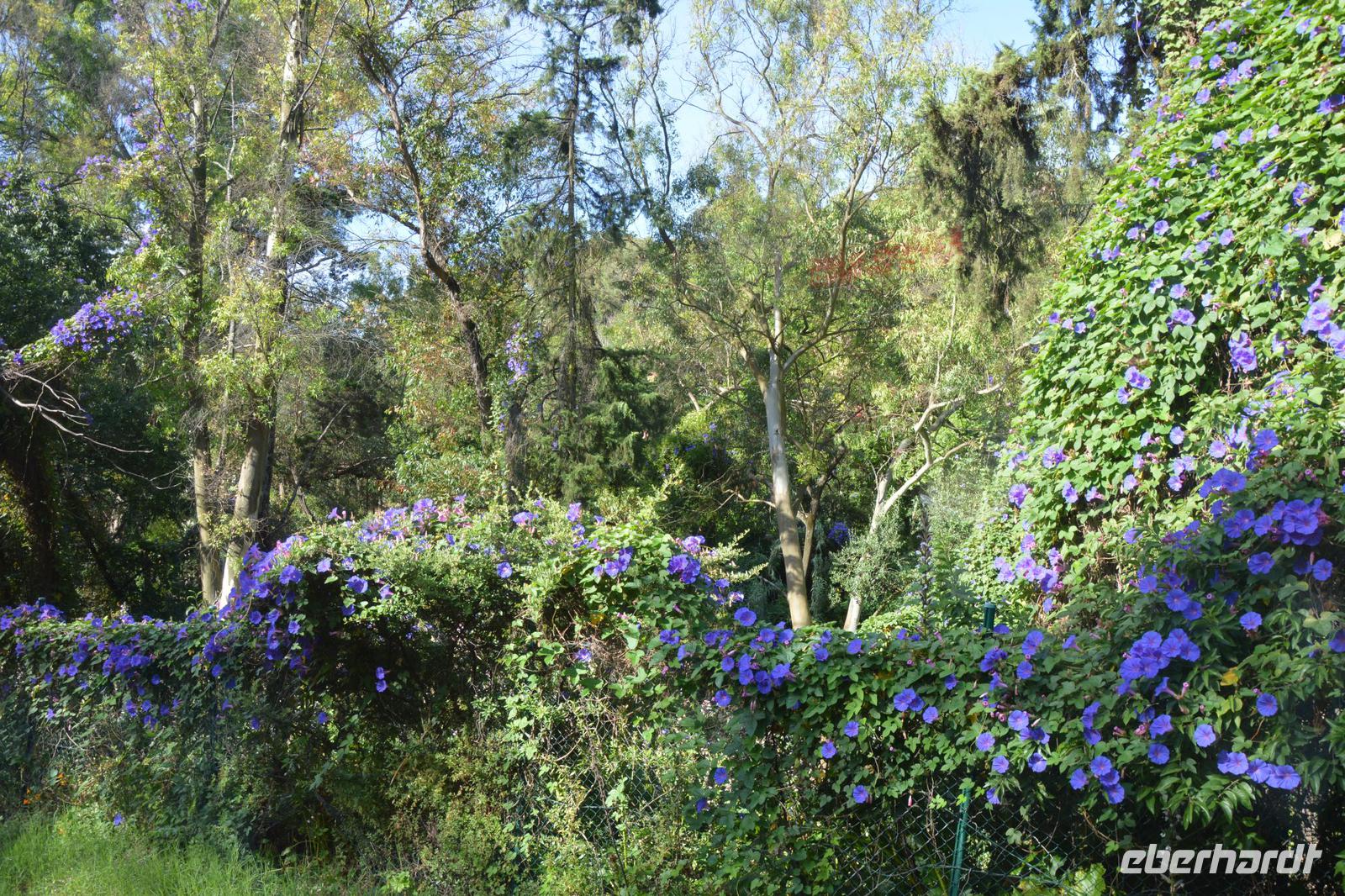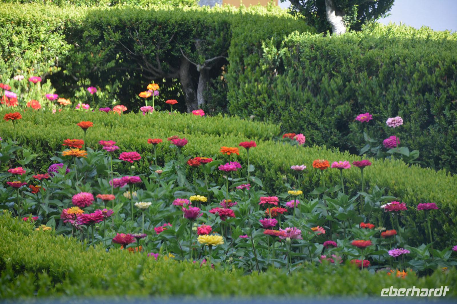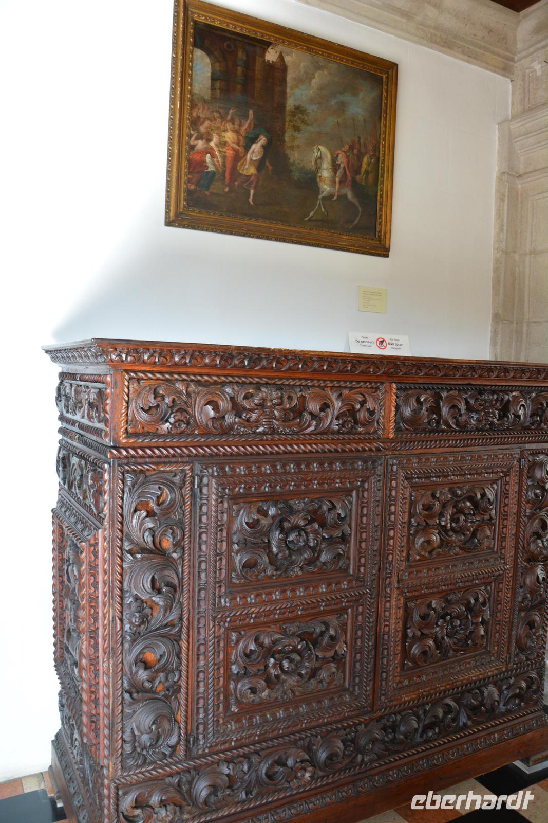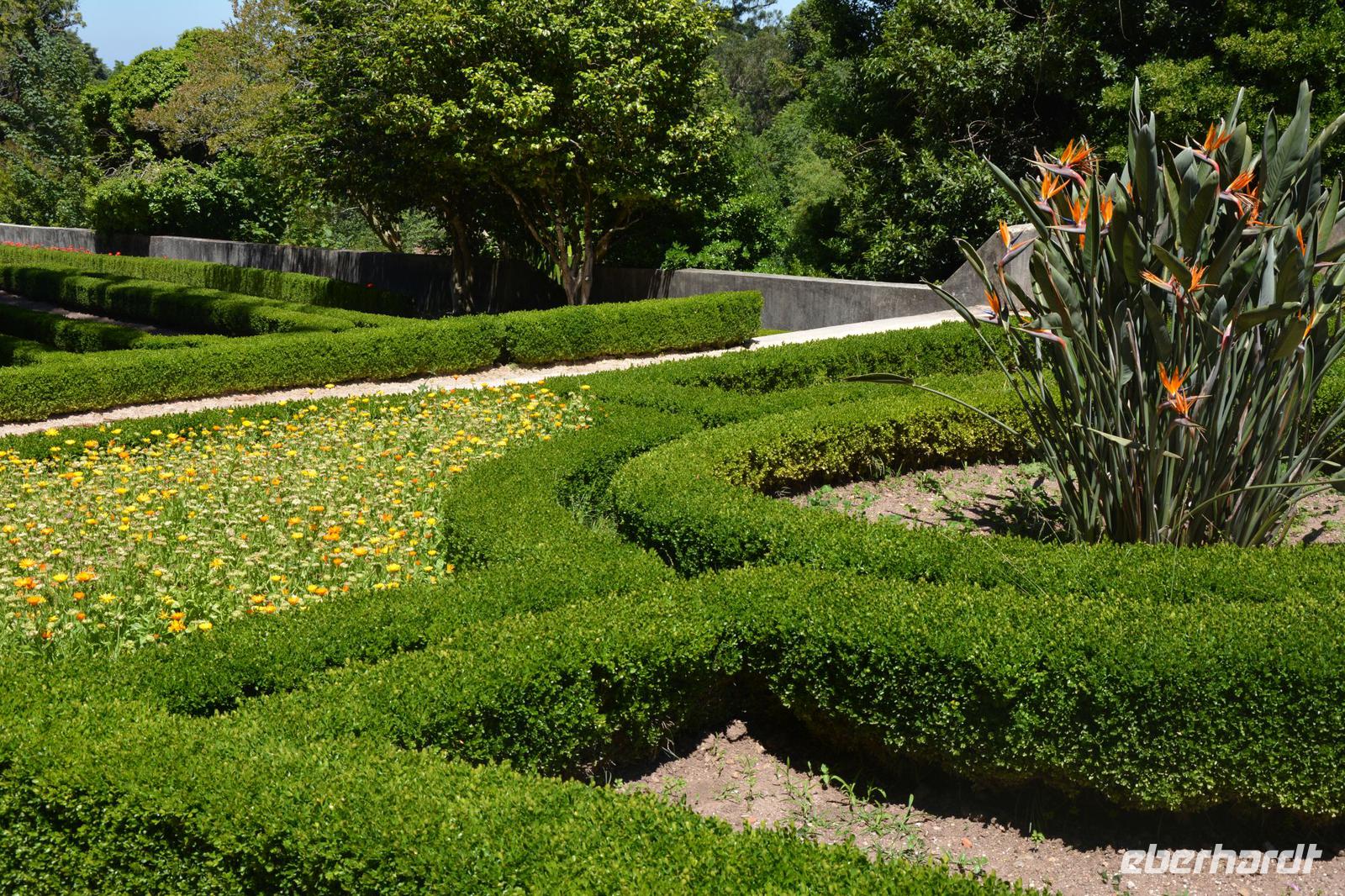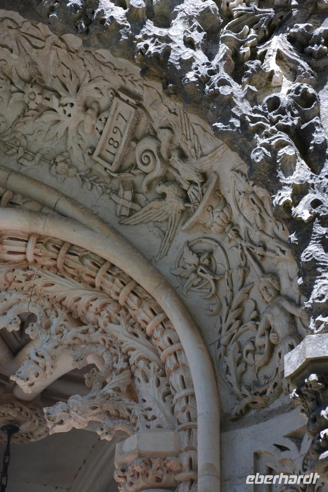 Nach einer Stunde Fahrt erreichen wir die Stadt Viseu mit seinen 200.000 Einwohnern. Wir stiegen am Jardim Tomás Ribeiro aus, ein schöner Platz mit einem Springbrunnen. Wir starten unseren Stadtspaziergang bergauf über Kopfsteinpflaster, vorbei am Jardim das Maes mit seinen herrlichen blau blühenden Hortensien hin zum Museu do Almeida Moreira mit seinen blau weißen Azulejokanten. Danach setzten wir unseren Gang an alten mit Kacheln besetzten Häusern zu den Kirchen fort. Wir besichtigten zuerst die Igreja da Misericordia und anschließend die Kathedrale von Viseu. Viele Schwalben flogen über unsere Köpfe, als wir durch die Gänge mit Azulejos geschmückten Wänden liefen. In der Kirche beeindruckten uns das herrliche gotische Deckengewölbe mit den Knoten, die zwei kunstvoll gearbeiteten Kanzeln und die Deckenmalerei bei dem goldenen Altar. Anschließend hatten wir noch kurz Zeit einen Blick in die imposante Kathedrale von Viseu, deren Baugeschichte auf das 11. Jahrhundert zurückreicht, zu werfen. Durch einen Rundgang kamen wir durch die Fußgängerzone bei unserem Ausstiegsplatz zurück. Nun hatten wir noch eine Viertelstunde Zeit, um einen Muntermachenden Kaffee zu trinken und ein Pastel zu naschen und dann wieder in den Bus zu steigen. Gegen 12 Uhr waren wir nicht mehr weit von unserem nächsten Ziel dem Wald von Buçaco entfernt. Der Weg ging kurvig einen Berg hinauf. Da wir in gemütlichem Tempo einem kleinen Traktor hinterher fuhren, konnten wir die Aussicht auf das herrlich bewaldete Gebiet genießen. Im Wald von Buçaco angekommen beeindruckte uns das wunderschöne Schloss, und während wir kurz Freizeit hatten, konnten wir das Schloss und dessen Parkanlage durchlaufen und umrunden, und somit die wunderschönen Details der Architektur bewundern.