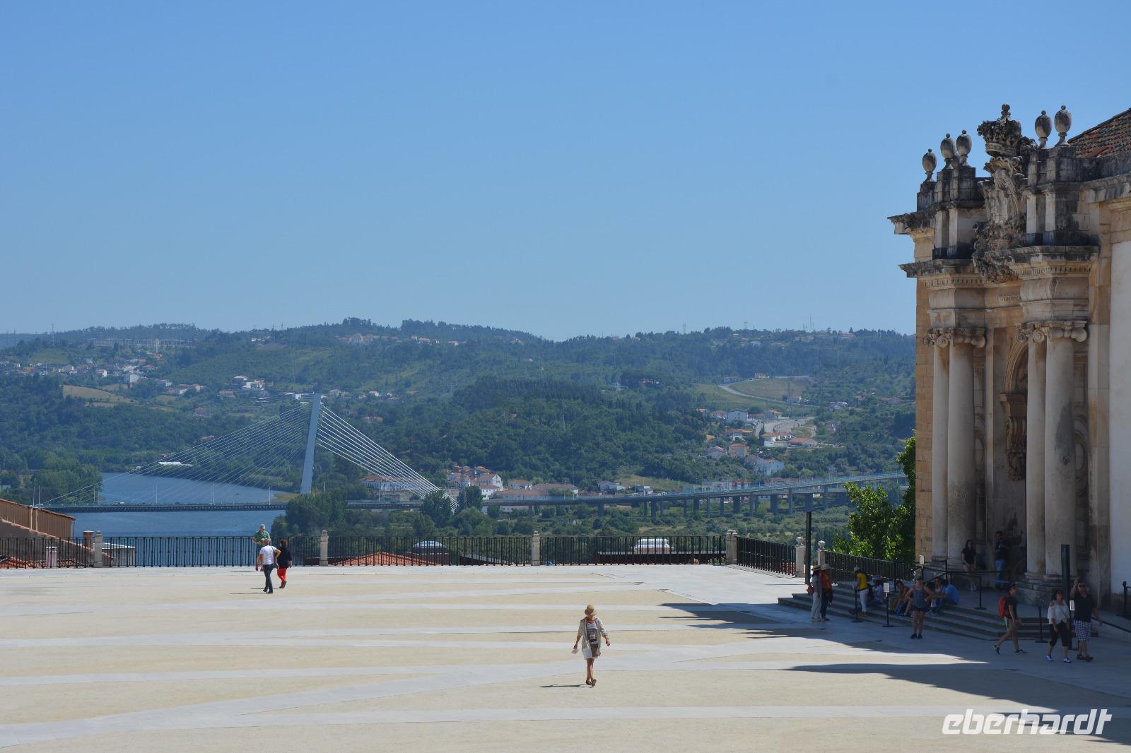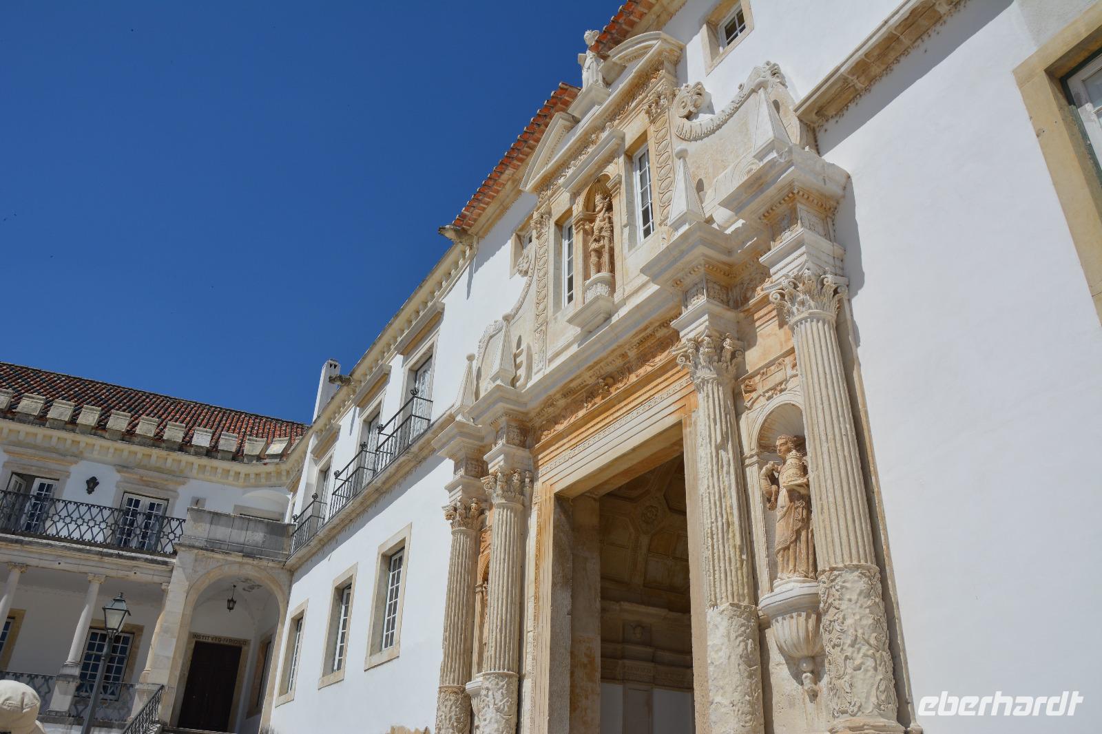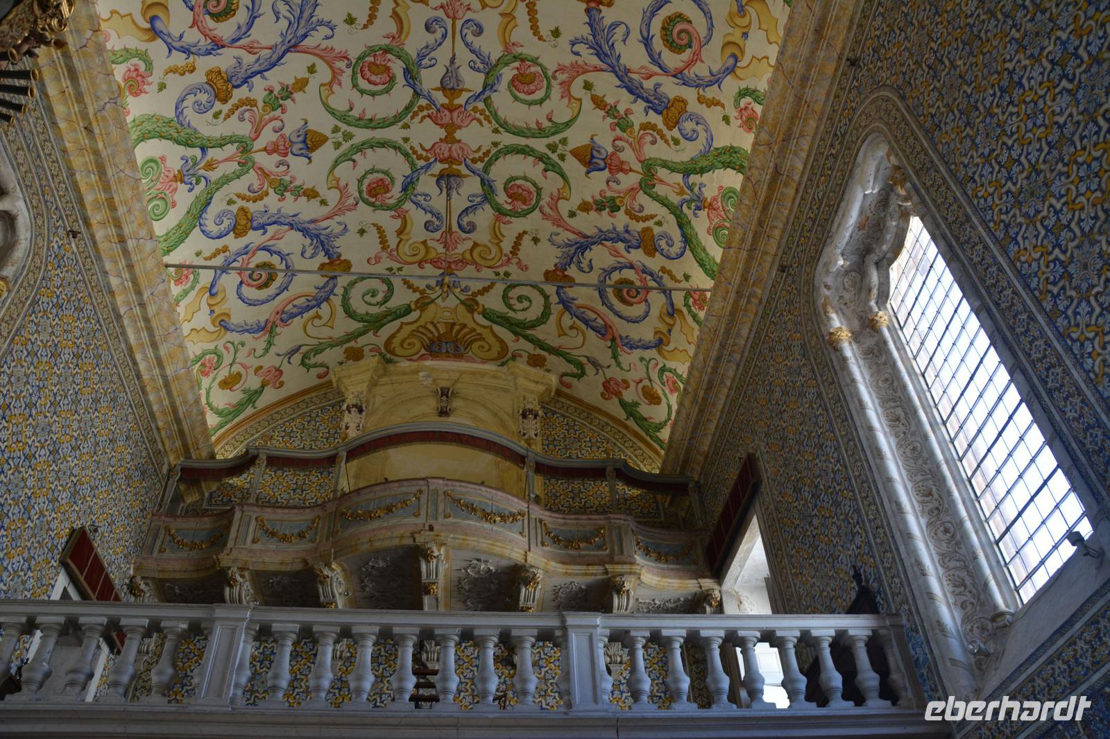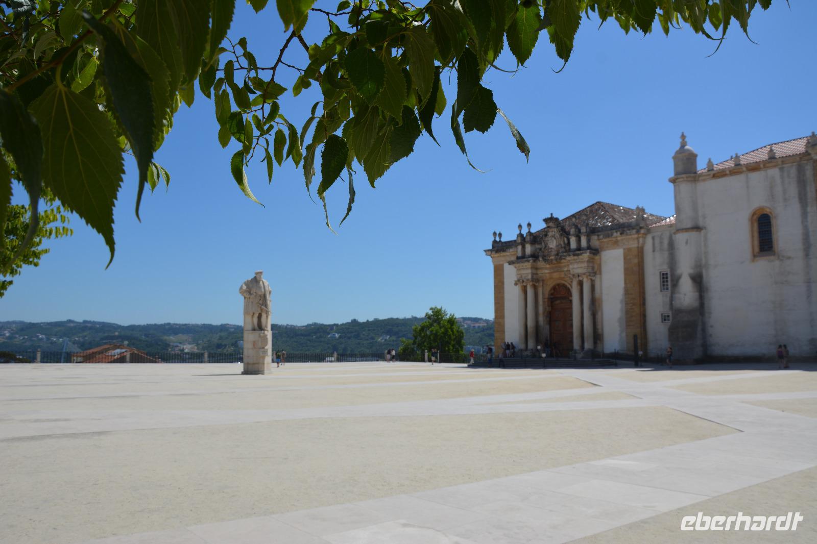 Anschließend trafen wir uns wieder am Bus zu einem gemeinsamen Spaziergang durch den Wald. Bei dem strahlenden Sonnenschein war es angenehm im Schutz der Bäume. Wir liefen an blühenden Callas, Palmen und Farnen vorbei hin zu einem kleinen Teich, wo ein Schwan und zwei Enten schwammen. Von da ging es weiter mit dem Bus nach Coimbra. Nach einer halben Stunde Fahrt erreichten wir über die Brücke Ponte de Santa Clara das Zentrum von Coimbra. Am Astoria Hotel sind wir dann ausgestiegen und noch gemeinsam durch die Fußgängerzone geschlendert, ehe sich jeder in eine andere Richtung für die Mittagspause bewegte. Hier gab es wieder einiges zu sehen, zahlreiche Geschäfte und Restaurants, ein paar Kirchen für die Kulturbegeisterten und das alles bei herrlichstem Wetter. Durch ein Essen gestärkt ging es mit dem Bus dann Richtung Universitätsgelände. Wir stiegen aus dem Bus aus und liefen zum Campus mit der berühmten alten Universitätsbibliothek von Coimbra, während uns Isabel über die Geschichte und Aktuelle geschehnisse der Universität informiert. Die im 13. Jahrhundert gegründete Universität begeisterte durch seine geschichtsträchtigen Mauern, die wir bei einem Rundgang der Gebäude erkundeten. Wir besuchten Vorbereitungsräume für Professoren, Sammelräume, mit Azulejos geschmückte Gänge. Wir lernten über die verschiedenen Farben der Fakultäten, die Funktionen der einzelnen Zimmer und konnten einen herrlichen Ausblick auf den Fluss Mondego und die Stadt Coimbra vom Außengang entlang des Universitätsgebäudes genießen. Auch die Universitätskirche Capela de S. Miguel mit seinem interessanten Stilmix aus ornamentaler Deckenmalerei in grün, blau und gold, der massiven goldverzierten Orgel, und den blau-weißen-gelben Azulejos an der Wand besuchten wir. Diese Kapelle wird auch heute noch zu besonderen Anlässen, wie der Doktorverteidigung oder für die Studentenfestwoche im Mai benutzt. 16:20 Uhr konnten wir dann auch als Gruppe in die Bibliothek rein. Strahlender Glanz erwartete uns. Dunkel, schwere Vorhänge dimmten das Licht in der Bibliothek auf ein Minimum, um die kostbaren alten Bücher zu schützen. Die im 18. Jahrhundert errichtete Bibliothek besteht aus drei Sälen, deren Decke mit einer speziellen Kuppelblicktechnik kunstvoll bemalt wurden. Braune massive glänzende Holztische mit goldenen Elementen standen in jedem Saal und der rote Teppich ließen wir auf uns wirken. Nach einigen Minuten in diesen prachtvollen Räumen gingen wir hinunter in das Sterngewölbe, wo ebenfalls viele Bücher ruhten. Diese hier sind auch von den Studenten benutzbar. Als wir wieder aus den kühlen Mauern der alten Universitätsgebäude nach draußen traten, empfing uns die Hitze draußen. Nun machten wir uns wieder auf den Weg zum Hotel. Nun hieß es wieder umständlich mit den Koffern nach oben fahren und für eine Nacht das Nötigste auspacken. Nach ein bisschen Freizeit trafen wir uns zur gewohnten Zeit zum Abendessen. Heute saßen wir an 2 Tischen á 6 Personen und genossen bei leckerem Wein das leckere Büffet.