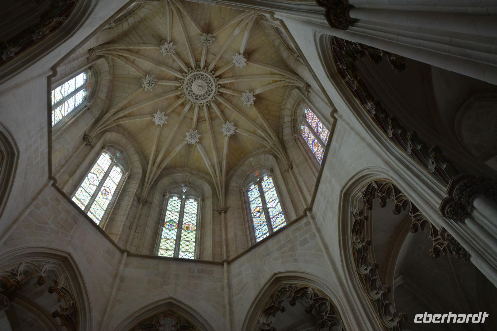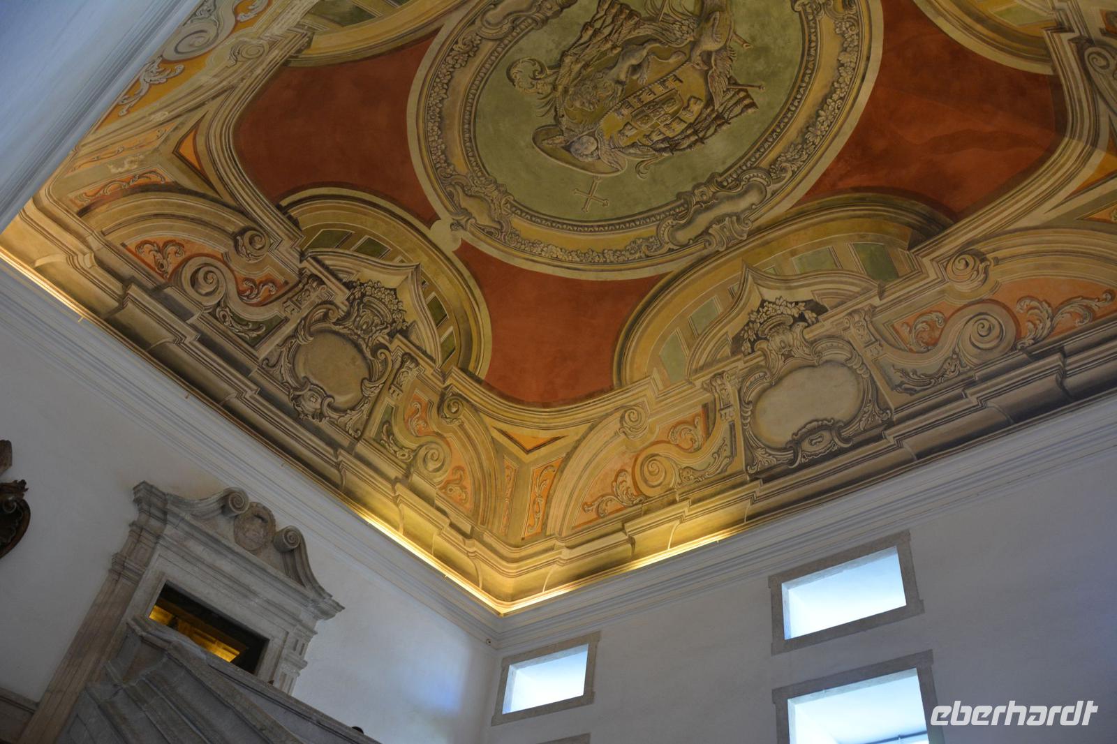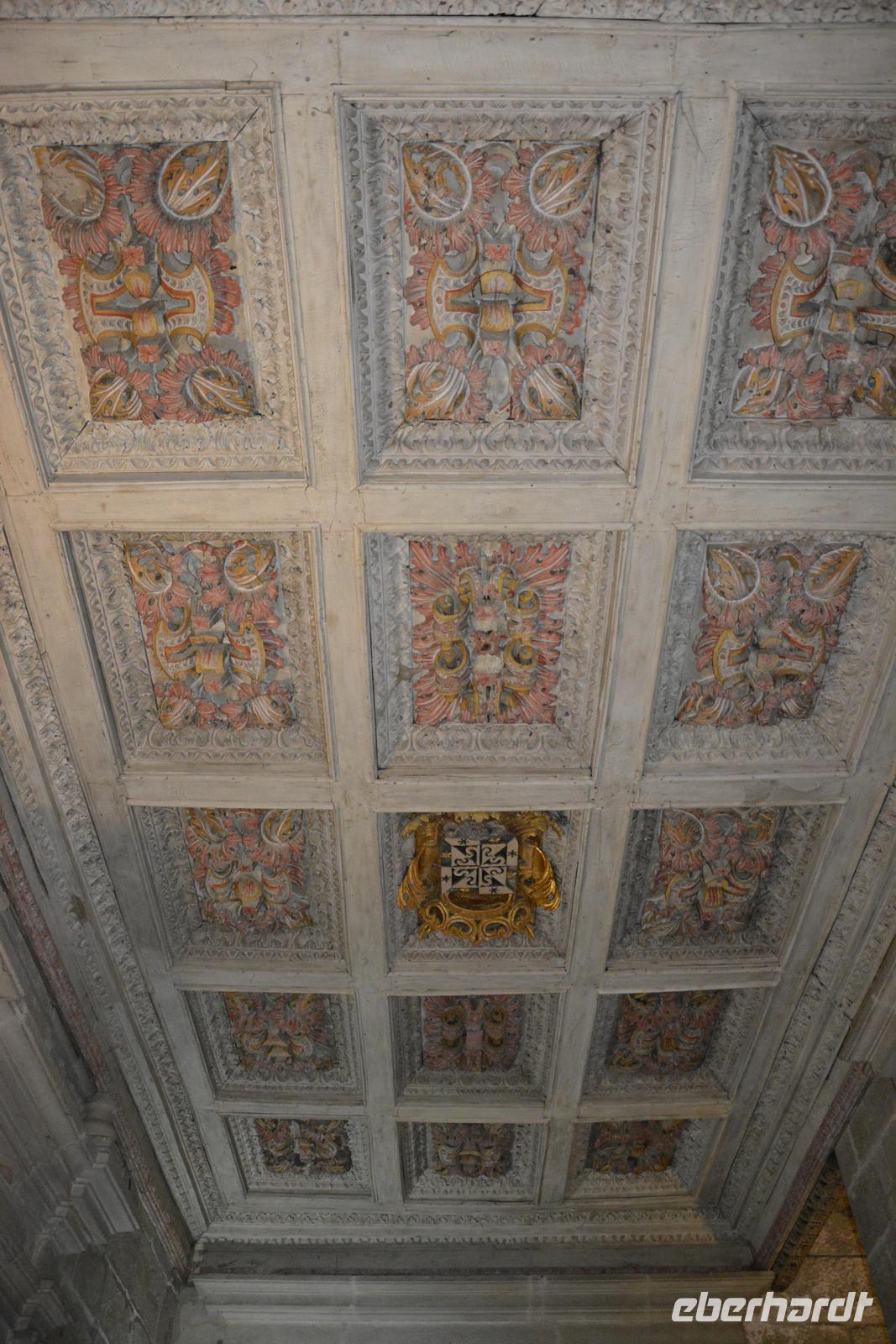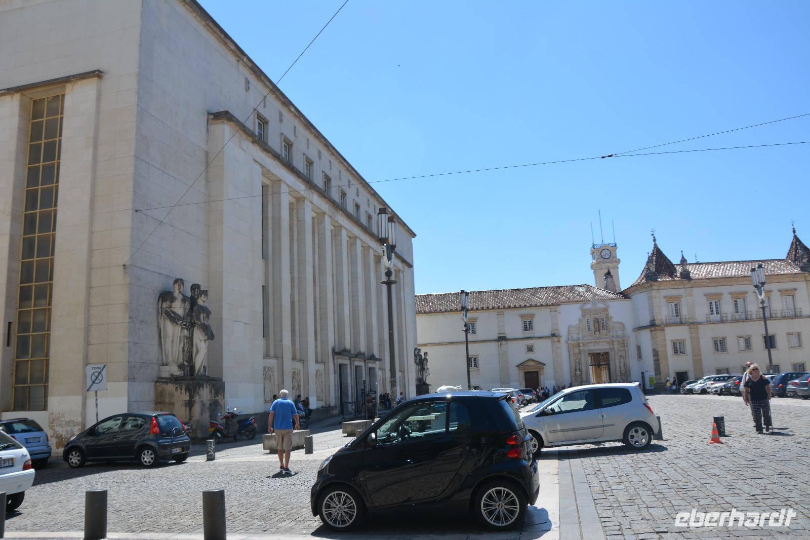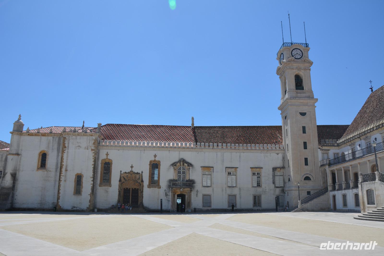Anschließend trafen wir uns wieder am Bus zu einem gemeinsamen Spaziergang durch den Wald. Bei dem strahlenden Sonnenschein war es angenehm im Schutz der Bäume. Wir liefen an blühenden Callas, Palmen und Farnen vorbei hin zu einem kleinen Teich, wo ein Schwan und zwei Enten schwammen. Von da ging es weiter mit dem Bus nach Coimbra. Nach einer halben Stunde Fahrt erreichten wir über die Brücke Ponte de Santa Clara das Zentrum von Coimbra. Am Astoria Hotel sind wir dann ausgestiegen und noch gemeinsam durch die Fußgängerzone geschlendert, ehe sich jeder in eine andere Richtung für die Mittagspause bewegte. Hier gab es wieder einiges zu sehen, zahlreiche Geschäfte und Restaurants, ein paar Kirchen für die Kulturbegeisterten und das alles bei herrlichstem Wetter. Durch ein Essen gestärkt ging es mit dem Bus dann Richtung Universitätsgelände. Wir stiegen aus dem Bus aus und liefen zum Campus mit der berühmten alten Universitätsbibliothek von Coimbra, während uns Isabel über die Geschichte und Aktuelle geschehnisse der Universität informiert. Die im 13. Jahrhundert gegründete Universität begeisterte durch seine geschichtsträchtigen Mauern, die wir bei einem Rundgang der Gebäude erkundeten. Wir besuchten Vorbereitungsräume für Professoren, Sammelräume, mit Azulejos geschmückte Gänge. Wir lernten über die verschiedenen Farben der Fakultäten, die Funktionen der einzelnen Zimmer und konnten einen herrlichen Ausblick auf den Fluss Mondego und die Stadt Coimbra vom Außengang entlang des Universitätsgebäudes genießen. Auch die Universitätskirche Capela de S. Miguel mit seinem interessanten Stilmix aus ornamentaler Deckenmalerei in grün, blau und gold, der massiven goldverzierten Orgel, und den blau-weißen-gelben Azulejos an der Wand besuchten wir. Diese Kapelle wird auch heute noch zu besonderen Anlässen, wie der Doktorverteidigung oder für die Studentenfestwoche im Mai benutzt. 16:20 Uhr konnten wir dann auch als Gruppe in die Bibliothek rein. Strahlender Glanz erwartete uns. Dunkel, schwere Vorhänge dimmten das Licht in der Bibliothek auf ein Minimum, um die kostbaren alten Bücher zu schützen. Die im 18. Jahrhundert errichtete Bibliothek besteht aus drei Sälen, deren Decke mit einer speziellen Kuppelblicktechnik kunstvoll bemalt wurden. Braune massive glänzende Holztische mit goldenen Elementen standen in jedem Saal und der rote Teppich ließen wir auf uns wirken. Nach einigen Minuten in diesen prachtvollen Räumen gingen wir hinunter in das Sterngewölbe, wo ebenfalls viele Bücher ruhten. Diese hier sind auch von den Studenten benutzbar. Als wir wieder aus den kühlen Mauern der alten Universitätsgebäude nach draußen traten, empfing uns die Hitze draußen. Nun machten wir uns wieder auf den Weg zum Hotel. Nun hieß es wieder umständlich mit den Koffern nach oben fahren und für eine Nacht das Nötigste auspacken. Nach ein bisschen Freizeit trafen wir uns zur gewohnten Zeit zum Abendessen. Heute saßen wir an 2 Tischen á 6 Personen und genossen bei leckerem Wein das leckere Büffet.