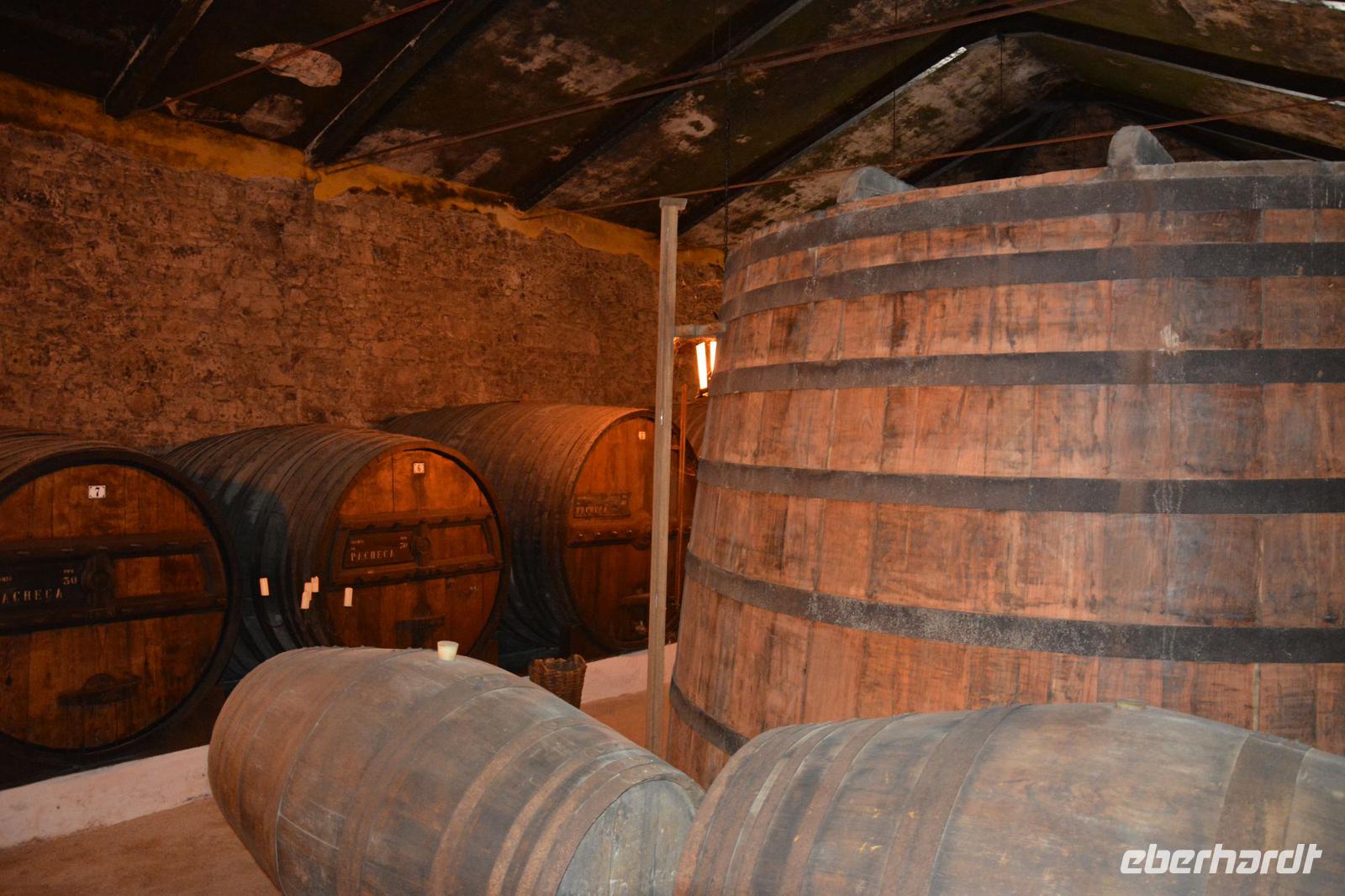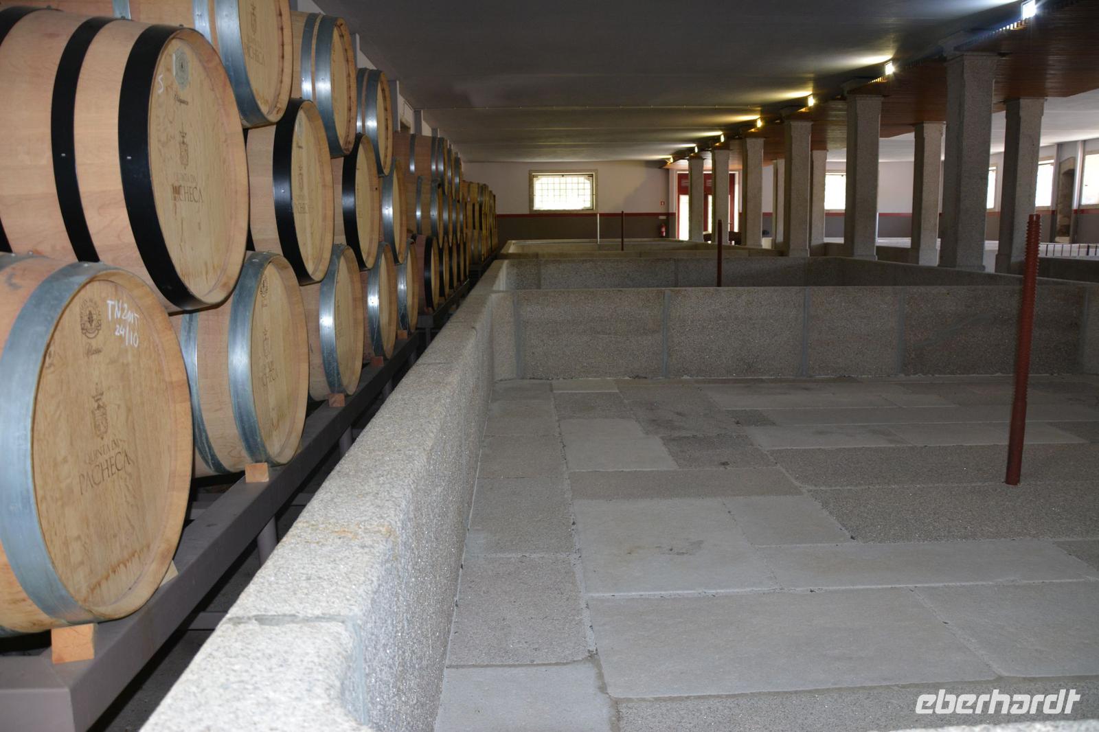 Heute hieß es auch schon wieder Abschiednehmen von Porto und mit gepackten Koffern setzten wir unsere Rundreise gen Süden fort. Nun setzten wir unsere Reise mit der für uns zweiten Reiseleiterin Isabel fort. Nach einer Begrüßung im Bus von Isabel, erklärte sie den Ablauf für heute. Zunächst machten wir uns auf den Weg nach Amarante. Allerdings steckten wir schon bald im Stau in der Nähe des FC Porto Stadions. Nach einer halben Stunde Fahrt erreichen wir die Randbezirke von Porto und überqueren den Fluss. Isabel beginnt ihre Erklärungen über Landwirtschaftswesen und Vegetation, während wir an zahlreichen Eukalyptus- und Kiefernbäumen vorbeikommen. Kurze Zeit später sind wir in dem kleinen Städtchen Amarante mit circa 10.000 Einwohnern. Wir liefen zielstrebig immer geradeaus, über die Ponte de São Gonçalo und den Fluss Rio Tamega hin zum Kloster de São Gonçalo. Isabel gab uns noch geschichtliche Hintergrundinformationen und erklärte die kunstvoll gestalteten Fassaden. Nachdem die Treffzeit am Bus wieder ausgemacht war, konnte man das interessante Innere, sowie den schönen Kreuzgang besichtigen. Ein wirklich schönes Kloster, welche durch die monumentale Fassade, die auffallenden Kassettendecken und den alten Kreuzgang beeindruckt. Mittlerweile hatten die Temperaturen eine schwülheiße Atmosphäre geschaffen und dementsprechend angenehm war dann das kühle Innere des Busses, als es weiter nach Peso da Régua ging. Wir durchfuhren unendlich aussehende Landschaften mit Olivenhainen und grüne Wälder auf Bergen. Isabel sprach über das Leben hier am Fluss Duoro in den Weinanbaugebieten und über das Demografische Probleme welches auch Portugal beeinflusst. Wir lernten, dass das Schiefergestein wichtig für den Weinbau im Duorotal ist. Über Serpentinenstraße fuhren wir durch die Weinanbauregionen, bis wir um die Mittagszeit in Peso da Régua ankamen. In der Nähe unseres Hotels am Fluss Duoro stiegen wir aus und verbrachten hier unsere Mittagspause. Nach fast zwei Stunden später trafen wir uns wieder an derselben Stelle und fuhren mit dem Bus in den kleinen Ort Pinhao. Vom anderen Ufer konnte man den Ort schon sehen und wie ein paar Boote in dem überschaulichen kleinen Hafen lagen. Wir stiegen direkt am Bahnhof in Pinhao aus, wo wir dann am Bahngleis stehend die Kachelbilder anschauen konnten. Doch schon einen Augenblick später kam der Zug angerattert und wir stiegen ein und nahmen in einem schon gut gefüllten Abteil Platz. So legten wir den Rückweg nach Peso da Régua mit dem wichtigen Fortbewegungsmittel der lokalen Bevölkerung zurück. Aus dem Zug erblickten wir wieder die weiten Weinlandschaften, einzelne Häuser und kleine Orte. In dem alten Zug roch es ein bisschen muffig, aber dies war auch eine interessante Erfahrung einen Teil der Strecke mit einem lokalen Verkehrsmittel zurückzulegen. Das Wasser des Duoros schimmerte in der strahlenden Sonne, und mal reflektierte es den wolkenfreien blauen Himmel, mal das Grün der herrlichen Vegetation der angebauten Weinstöcke. Als Isabel uns ein Zeichen gab, bedeutete dies, dass unsere Zugfahrt zu Ende war und wir stiegen wieder aus dem Zug in die Sonne. Nun hieß es mit dem Bus zum Weingut Pacheca fahren. Kurz nach um drei fuhren wir auf das schöne grüne Anwesen des in traditioneller Architektur des 18. Jahrhunderts erbauten Weingutes. Nach einer kurzen Toilettenpause, startete auch unsere Führung, wo der nette junge Mann uns eine kurze Geschichte des Weingutes erzählte und uns umherführte. Wir sahen die großen Granitmühlen, wo die Trauben für den Rot- und Roséwein gestampft werden. Unter anderem lernten wir, dass Rotwein für ganze 4 Stunden und Roséwein für 2 Stunden mit Füßen gestampft wird. Es wird nicht mit einer Presse gearbeitet, weil damit auch die Kerne zermahlen werden. Anschließend stiegen wir die Treppe in den muffig riechenden Weinkeller hinunter. Außer auf die schimmelige Decke, fiel unser Blick auf die zahlreichen dicken Weinfässer in verschiedenen Größen. In den großen Fässern sind 35.000 Liter und in den Kleineren rund 27.000 Liter Wein. Faszinierend war auch die Information, dass die alten Fässer, die für die Weinherstellung nicht mehr gut genug sind, nach Schottland für die Whiskeyherstellung geschickt werden und wenn die Fässer besonders langlebig sind, und sie für die Whiskeyherstellung auch nichts mehr taugen, dann nach circa 150 Jahren der Rumgewinnung in Kuba noch dienen können. Die älteste Flasche ,,Wein" in diesem Keller stammt aus dem Jahr 1903, welche nun aber nicht mehr Wein, sondern Essig ist. Portwein allerdings kann 100 Jahre überdauern. Nach dem interessanten Theorieteil hieß es nun, raus auf den Innenhof zur Weinverkostung! Diesmal durften wir vier Weine probieren: Der erste war ein Weißwein von 2016, der frisch, sehr leicht und lecker schmeckte. Ein prima Sommerwein. Der zweite war natürlich jetzt ein Rotwein ,,Superior Red 2014", welcher 12 Monate in französischer Eiche gereift war. Nun ging es wieder an den Portwein! Aber diesmal hatten wir auch die Möglichkeit einen Tawnywein zu probieren, einen 20 Jahre alten holzig riechenden starken Portwein. Als viertes und letztes verkosteten wir einen Vintage Port von 2012 ( beide waren 42€ die Flasche), welcher beerig riecht und gut zu Ziegenkäse oder dunkler Schokolade passt und ein starker geschmackvoller Dessertwein ist. Nach der Verkostung hatten wir noch Zeit, einen kleiner Gang über das Weingut zu machen, um nach ein paar Fotos zu schießen und dem kleinen Shop einen Besuch abzustatten, wo es die verkosteten Weine und noch weitere gute Tropfen zu kaufen gab. Gegen fünf Uhr abends machten wir uns dann schließlich auf den kurzen Weg zurück zum Hotel. Diesmal waren wir auch alle auf einer Etage untergebracht, weswegen wir im Aufzug nur einen Knopf drücken mussten. Um halb acht trafen wir uns dann nach einer Ruhepause im dritten Stock zum Abendessen. Von dem Restaurant hatte man durch die Glas