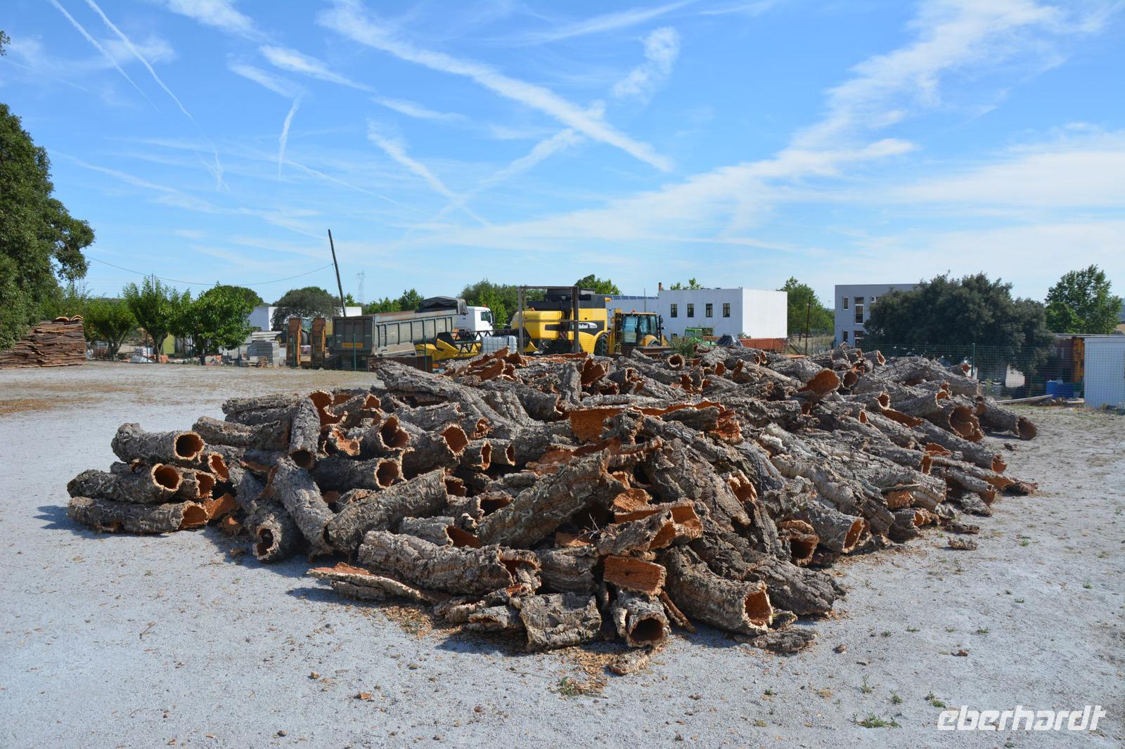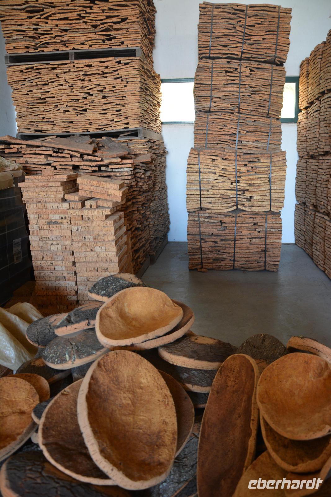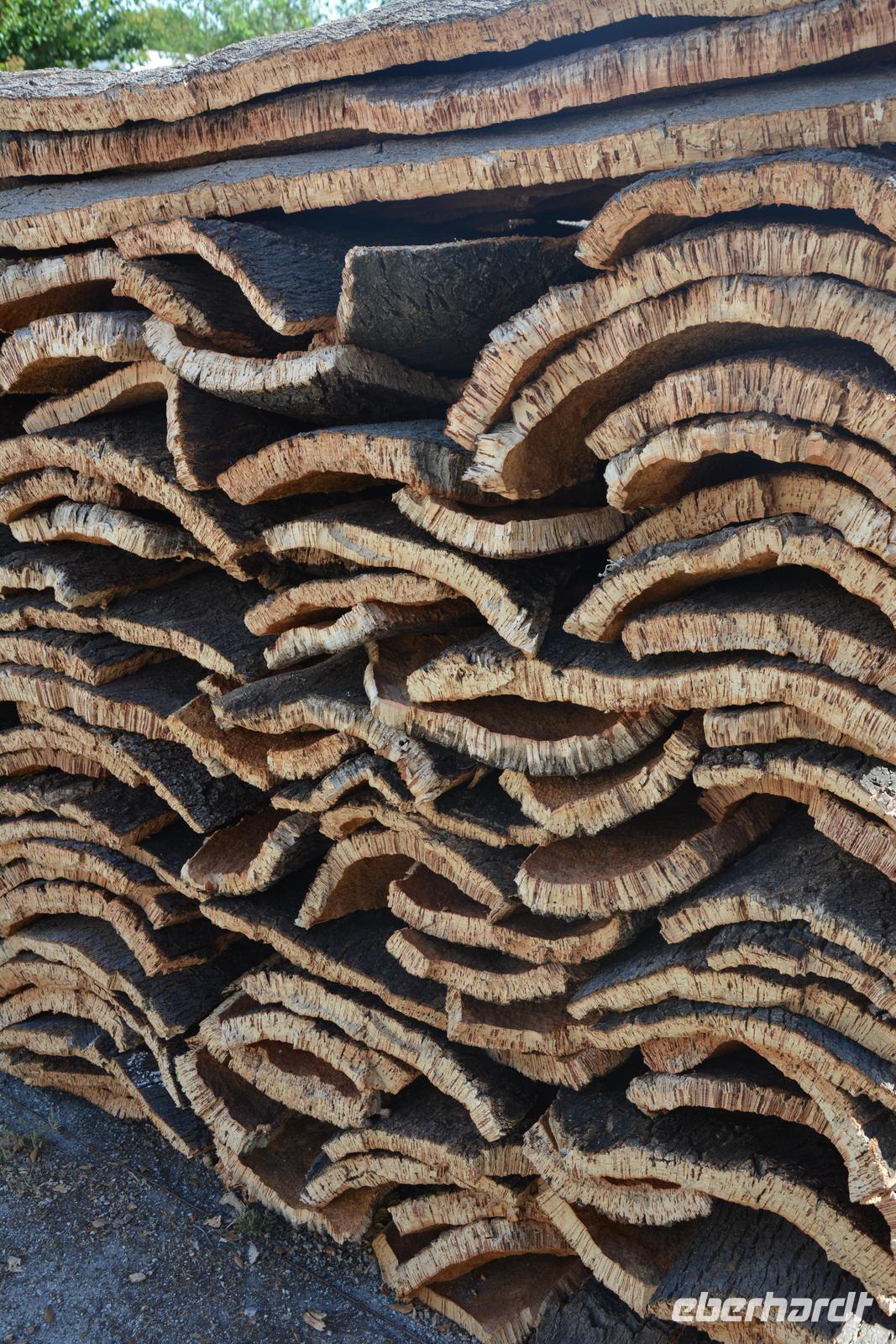 Wir fuhren durch unterschiedliche Landschaften mit Palmen oder unendlich grüne Weinfelder. Nach mehr als einer Stunde Fahrt machten wir eine kleine Toilettenpause, wo man sich die Beine vertreten konnte. Hier standen auch Korkeichen, bei denen man noch einmal genau sehen konnte, wo der Kork abgeschält wurde. Nicht nur hier bei der Pause, sondern auch im anschließenden Besuch einer Korkfabrik, erklärte uns Isabel die Prozesse, wie das mit der Korkherstellung läuft. Wir standen von vielen Haufen aufgestapelten Korkplatten, während wir lernten, dass der aktuelle Preis für Kork bei 15-30€ pro 15 kg liegt. In dem Shop konnten wir noch einmal die Vielfalt bestaunen, was aus Kork alles gemacht werden kann.