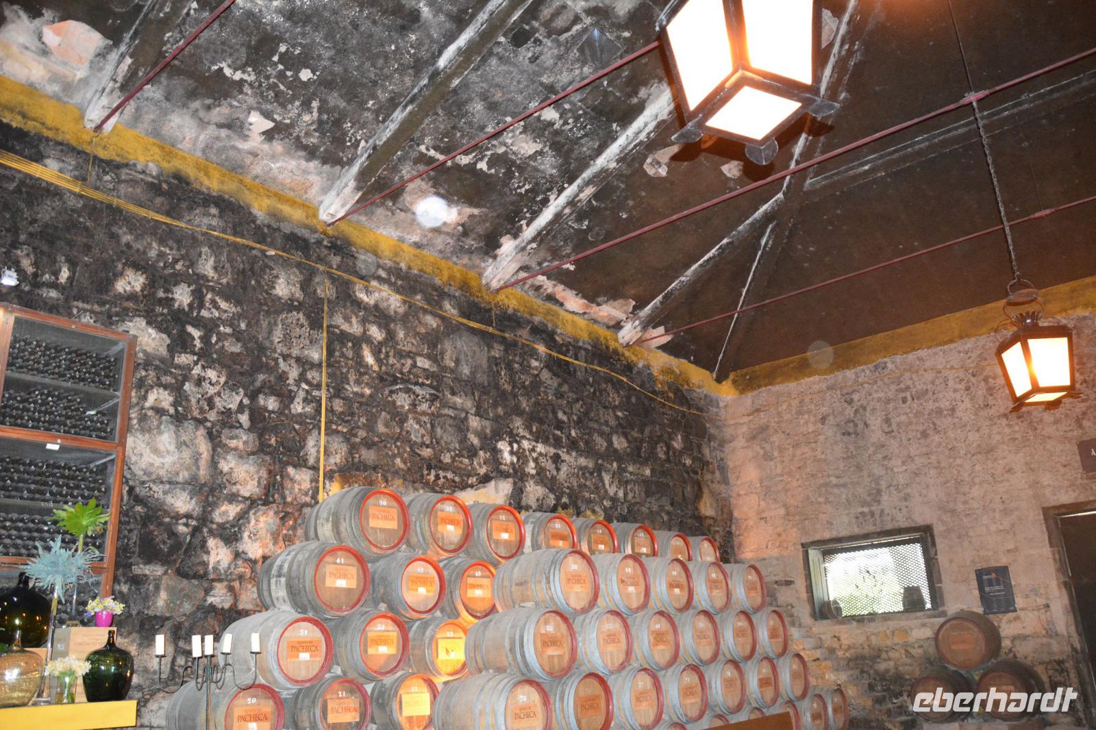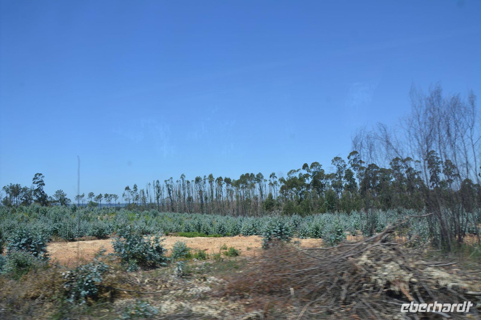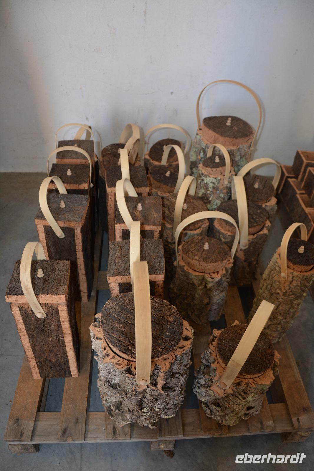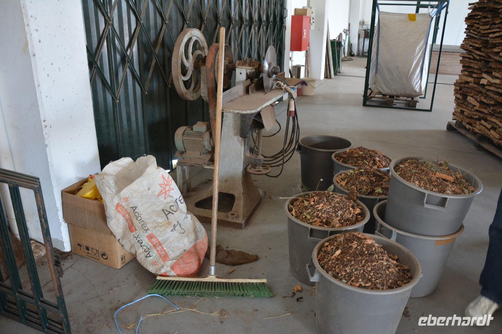 Wir fuhren durch unterschiedliche Landschaften mit Palmen oder unendlich grüne Weinfelder. Nach mehr als einer Stunde Fahrt machten wir eine kleine Toilettenpause, wo man sich die Beine vertreten konnte. Hier standen auch Korkeichen, bei denen man noch einmal genau sehen konnte, wo der Kork abgeschält wurde. Nicht nur hier bei der Pause, sondern auch im anschließenden Besuch einer Korkfabrik, erklärte uns Isabel die Prozesse, wie das mit der Korkherstellung läuft. Wir standen von vielen Haufen aufgestapelten Korkplatten, während wir lernten, dass der aktuelle Preis für Kork bei 15-30€ pro 15 kg liegt. In dem Shop konnten wir noch einmal die Vielfalt bestaunen, was aus Kork alles gemacht werden kann.