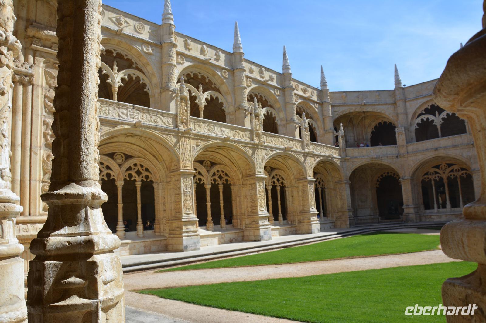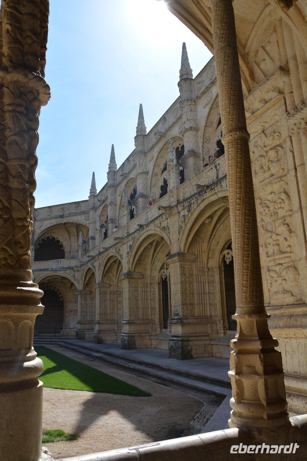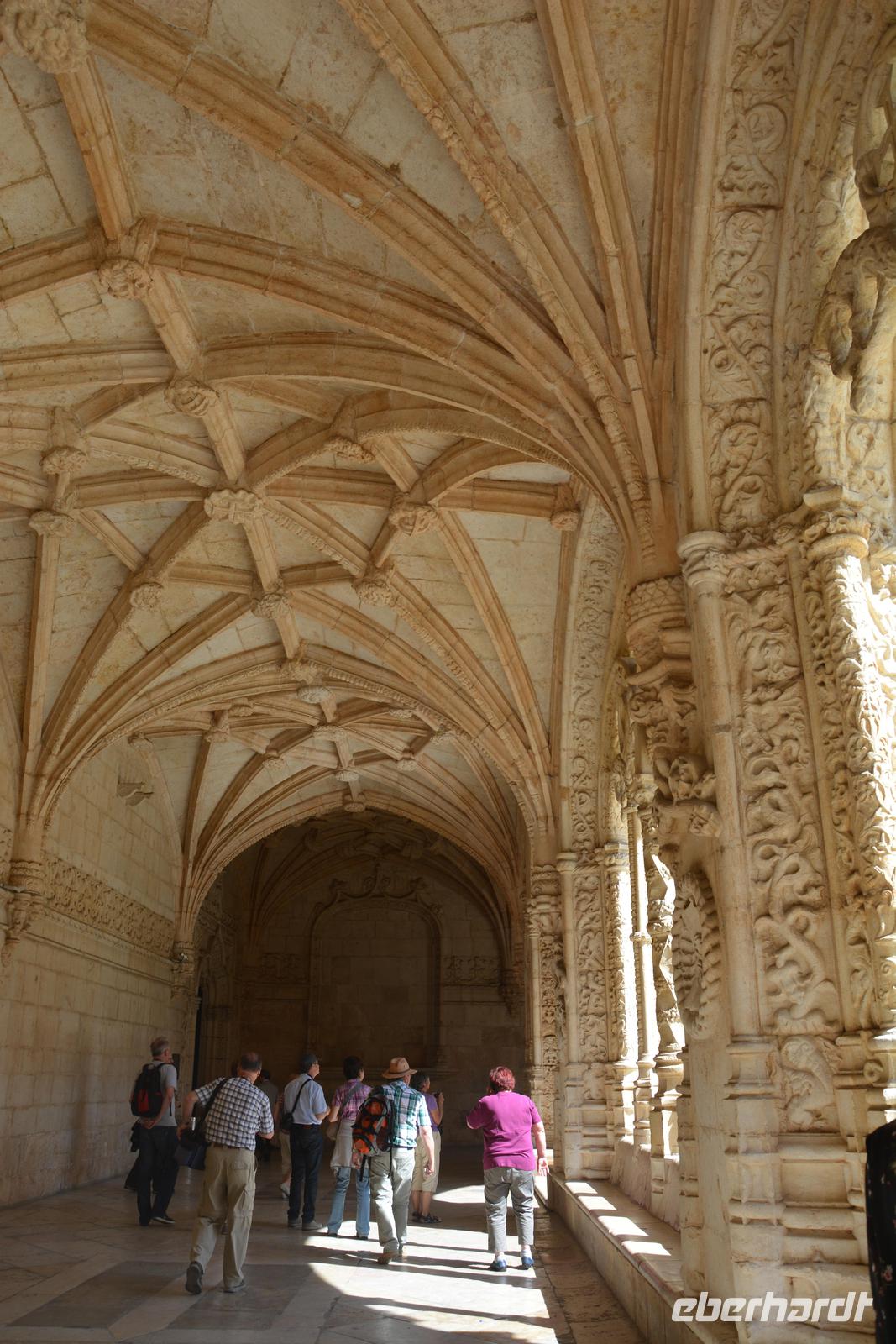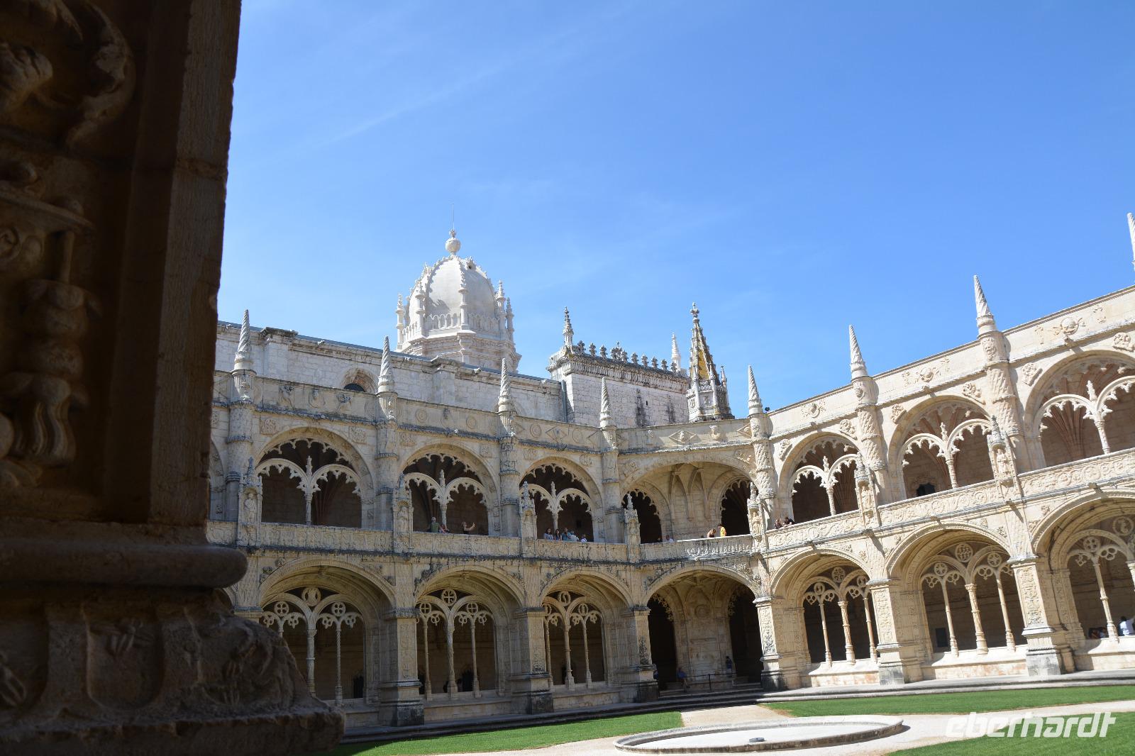 An unserem ersten Tag in Lissabon ging es nach dem stärkenden Frühstücksbuffet um neun Uhr los zur Stadterkundung. Wir durchfuhren das Viertel Campo pequeno, sahen das große Aquädukt mit seinen mächtigen Bögen, herrliche blau blühende Blumen, die an Zäunen sich langrankten, bis wir einen Hügel hinab direkt auf den Torre de Belem zufuhren. Doch dieser kam später an der Reihe. Unser erster Besichtigungsstopp war das Hieronymuskloster. Isabel erzählte von dem schweren Erdbeben 1755 und dem anschließenden verheerenden Brand, wovon das Hieronymuskloster jedoch verschont wurde. Am Kloster ausgestiegen bewunderten wir seine weiße glänzende Fassade. Nach einer kurzen Wartezeit, bis das Kloster öffnete, strömten wir mit den andern Touristen in das Innere. Wir liefen eine Runde durch das schöne Innere des Klosters. Als erstes ging es an dem Grab von dem portugiesischen Nationaldichter Luis de Camoues vorbei. Die Decke aus dem 16. Jahrhundert spiegelte gotische Kunst wieder, die nachgebildeten Glasfenster warfen ihr Muster auf den Boden, und das Grab von dem Seefahrer Vasco da Gama zeigte die Kunst der vielfältigen Verzierungen. In dem Kreuzgang sah man den Einfluss der maurischen Baukunst, und vor diesem schönen Hintergrund machten wir unser erstes Gruppenbild. Unsere Führung führte uns noch ein Stück weiter durch das Kloster, ehe wir dann einen halbe Stunde noch Freizeit hatten. Anschließend ging es am Porto de Lisboa vorbei, wo wir einen Fotostopp am Denkmal der Entdeckungen machten. Auch die beeindruckende große Windrose mit der Karte der Entdeckungen Portugals sahen wir, doch leider kaum im Ganzen, weil eine große Gruppe von Touristen direkt auf der Weltkarte stand. Nun ging es auch zu dem schon zuvor vorbeigefahrenen Torre de Belém. Dieser ehemalige Leuchtturm, der heute als Aussichtspunkt dient liegt direkt am Fluss Tejo. Von hier hat man auch einen Ausblick auf die Brücke des 25. April im Hintergrund. Pünktlich zur Mittagszeit ging es zu dem ursprünglichen Marktplatz Rossio, welcher zu den drei wichtigsten innerstädtischen Plätzen der Hauptstadt Lissabon gehört. Die umliegenden Straßen boten Restaurants, Souvenirgeschäfte und Sehenswürdigkeiten-alles in Laufnähe zum Rossio. Also nicht nur der Hauptplatz, sondern auch die restlichen Seitenstraßen luden zum Bummeln und Verweilen ein. Nach der Mittagspause ging es wieder als Gruppe vereint zu der Kathedrale Sé Patriarcal. Diese älteste Kirche der Stadt, welche auch dem Erdbeben zum Opfer fiel, wurde im 19. Jahrhundert im Stil der Romanik wieder aufgebaut. Dann ging es zu Fuß den Berg hoch, an einer alten Theaterruine vorbei hin zum Castelo Sao Jorge. Hier hatte man förmlich eine Panoramaaussicht über Lissabon und den Fluss Tejo. Nachdem wir die Aussicht bestaunt hatten, drehten wir auf der Burg noch eine Runde, wobei wir an Möbeln aus Kork und freilaufenden Pfauen vorbeikamen. Jetzt führte uns der Weg durch das Alfama-Viertel. An der Statue des St. Vicente hatten wir noch einmal eine hübsche Aussicht auf die Stadt. Danach fuhren wir noch mit dem Bus ein Stück, ehe wir wieder zu Fuß zu dem Lokal aufbrachen, wo wir den traditionellen Fadogesangt hören würden. Bei einem Wein der der Wahl und kleinen Tapas lauschten wir andenklich. Ein Mann oder eine Frau sangen, und wurden von eienm Gitarristen und einem Mann mit einer portugiesischen Gitarre begleitet. Anschließend ging es wieder zum Bus zurück und wir fuhren zum Hotel. Leider kamen wir am Schluss der Strecke ein wenig in den Feierabendverkehr von Lissabon, aber so konnten wir ein paar Fotos des Denkmals Miradouro do Parque Eduardo VII. bekommen. Beim Abendessen im Hotel wurde der Tag ausgewertet.