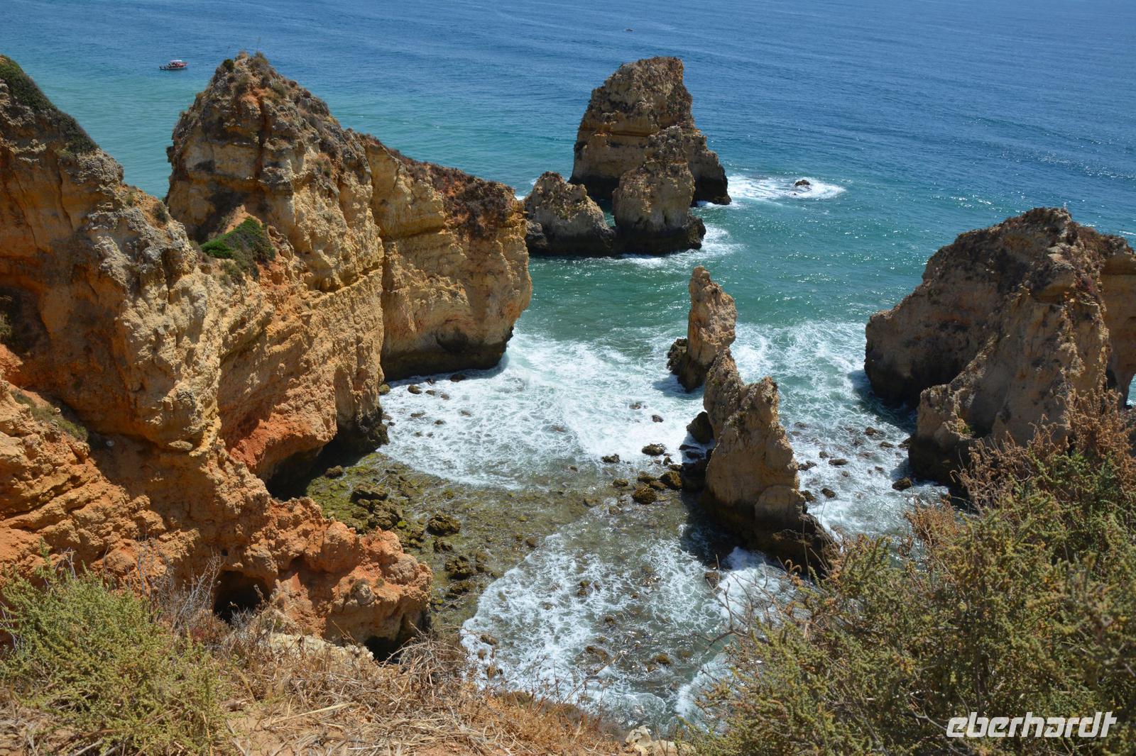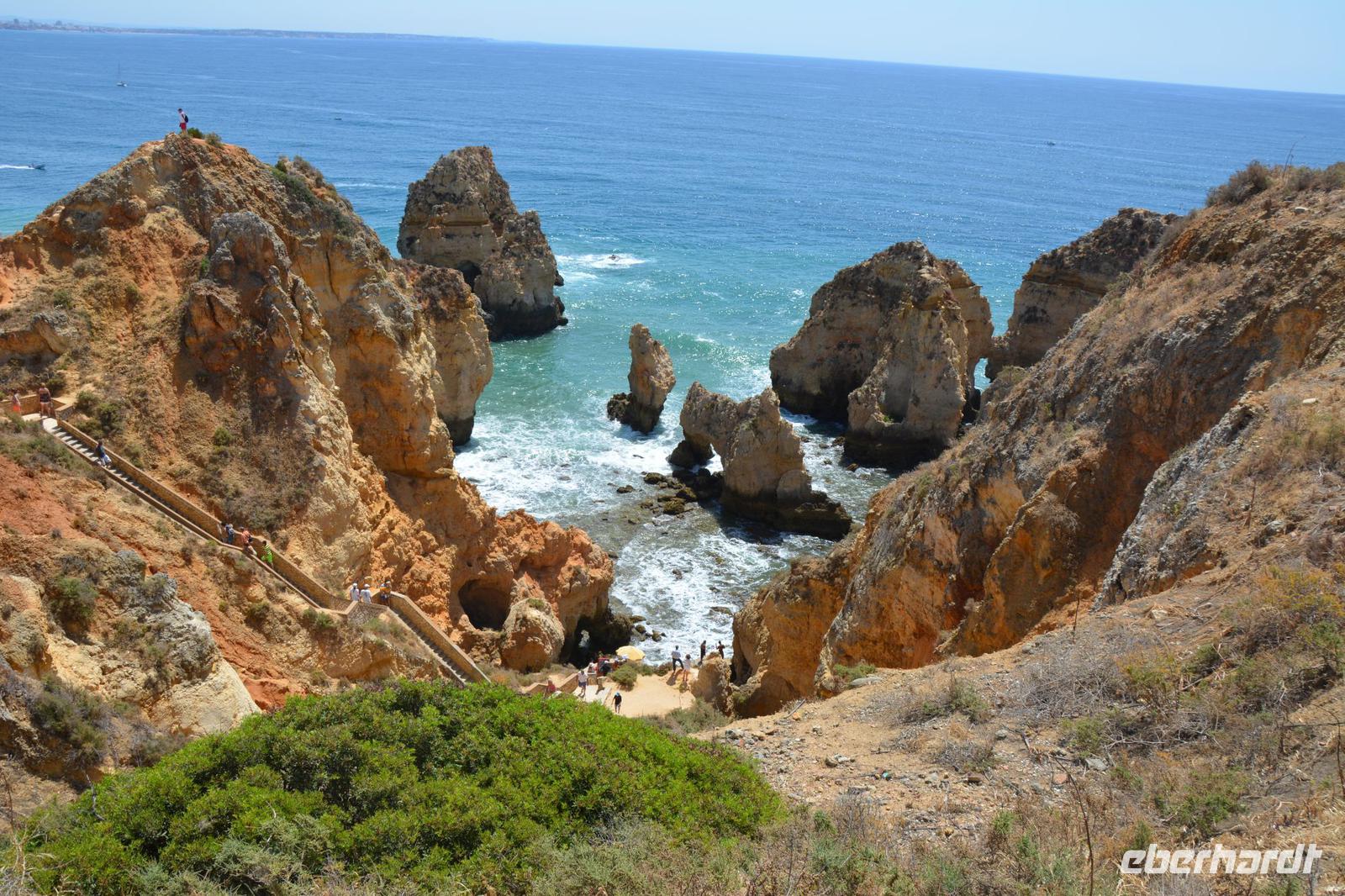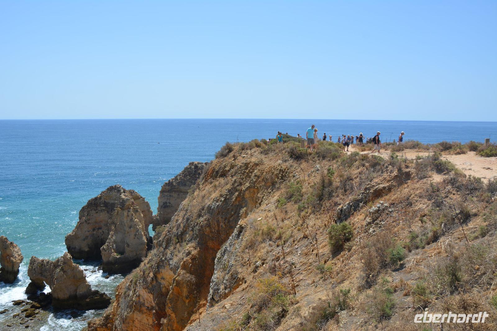 Nach dem leckeren Frühstücksbuffet lernten wir kurz von neun unsere dritte und somit letzte Reiseleiterin für diese Reise namens Sandra kennen. Sie kommt direkt von der Algarveküste und kennt sich hier bestens aus. Wenig später ging es bereits bei 27 Grad Außentemperatur auch schon los in den westlichen Teil der Algarve. Während der Fahrt in Richtung Sagres sprach Sandra ein wenig über den Tourimusbetrieb u die Regierung Portugals. Hier war die Landschaft auch schon wieder anders. Deutlich karger kargere Landschaft mit ein paar Bäumen und Ginsterbüschen blickte uns entgegen. Kurz nach zehn kamen wir dann an unserem Ziel für heute an: der Cabo de Sao Vicente. Diese wunderschöne Klippen der Algarve mit dem Leuchtturm, dem Felsen, der aus sah wie ein Schuh und dem Wagen, der die letzte Bratwurst vor Amerika verkaufte, wollten wir noch weitere Gruppenbilder machen. Hier war es nämlich nicht so windig, wie an der Cabo da Roca und außerdem waren noch nicht so viele Touristen da. waren. So machten wir zwei Gruppenfotos- einmal mit dem Leuchtturm im Hintergrund und dann vor dem Meer. Bei der Weiterfahrt durch Sagres machten wir noch weitere Fotostopps. Aber der absolute Höhepunkt war die Klippe bei Ponte da Piedade in Lagos. Hier befindet sich eins der bekanntesten Postkartenmotive der Alogarveküste. Auch hier gab es einen kleinen Leuchtturm. Aber die vielen Felsformationen und das in der Sonne glänzende Meer zogen eher unserer Aufmerksamkeit an. Nach diesem Stopp fuhren wir zur Mittagspause in das Städtchen Lagos ebenfalls natürlich an der Küste gelegen. Nach der Mittagspause ging es wieder zurück in unser Hotel, wo wir noch den Rest des Tages zur freien Verfügung hatten.