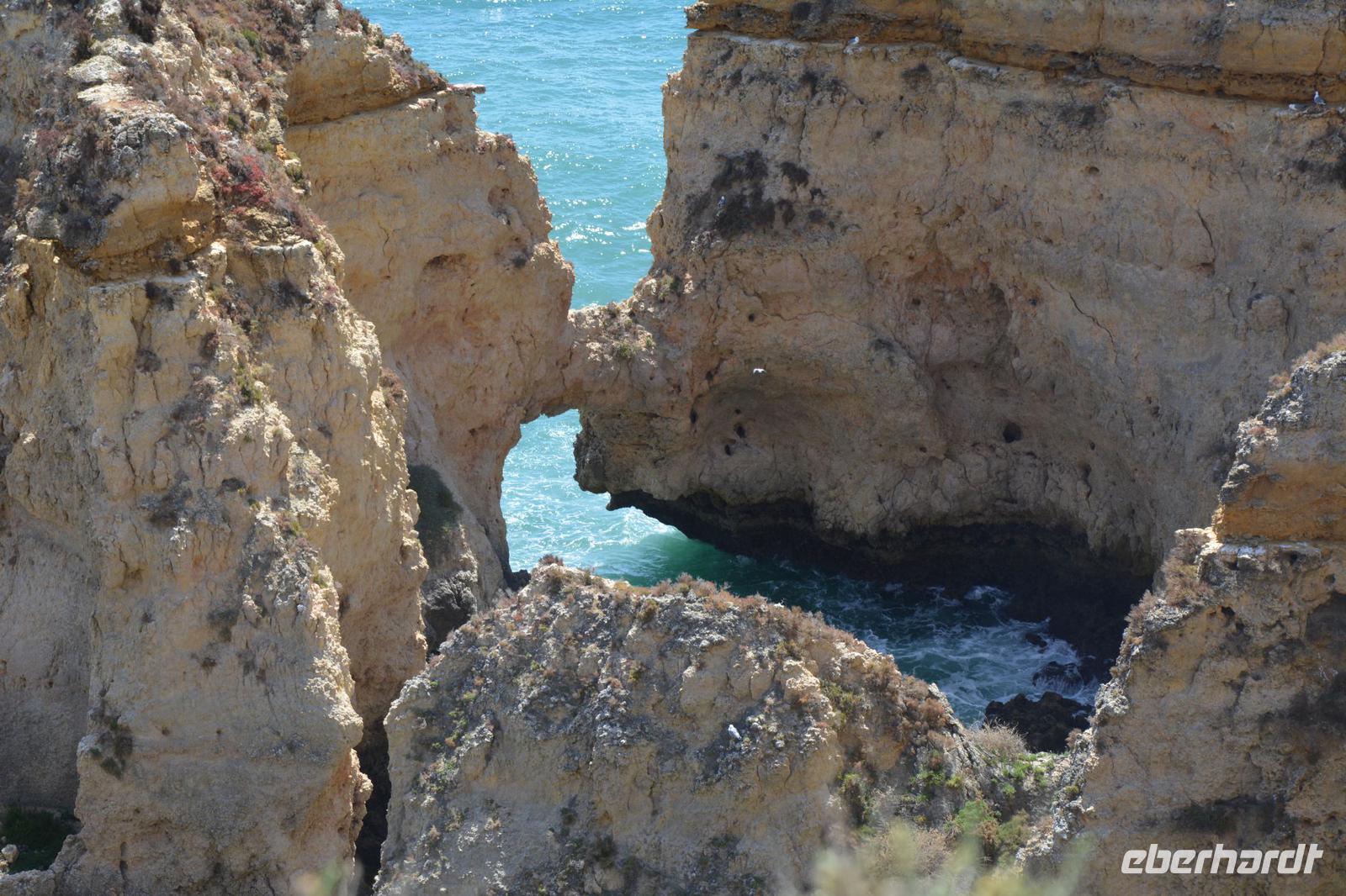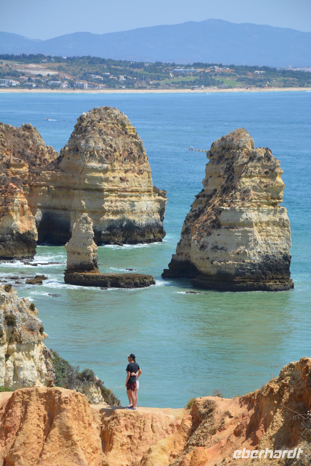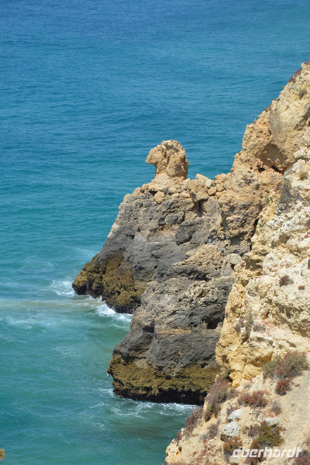 Nach dem leckeren Frühstücksbuffet lernten wir kurz von neun unsere dritte und somit letzte Reiseleiterin für diese Reise namens Sandra kennen. Sie kommt direkt von der Algarveküste und kennt sich hier bestens aus. Wenig später ging es bereits bei 27 Grad Außentemperatur auch schon los in den westlichen Teil der Algarve. Während der Fahrt in Richtung Sagres sprach Sandra ein wenig über den Tourimusbetrieb u die Regierung Portugals. Hier war die Landschaft auch schon wieder anders. Deutlich karger kargere Landschaft mit ein paar Bäumen und Ginsterbüschen blickte uns entgegen. Kurz nach zehn kamen wir dann an unserem Ziel für heute an: der Cabo de Sao Vicente. Diese wunderschöne Klippen der Algarve mit dem Leuchtturm, dem Felsen, der aus sah wie ein Schuh und dem Wagen, der die letzte Bratwurst vor Amerika verkaufte, wollten wir noch weitere Gruppenbilder machen. Hier war es nämlich nicht so windig, wie an der Cabo da Roca und außerdem waren noch nicht so viele Touristen da. waren. So machten wir zwei Gruppenfotos- einmal mit dem Leuchtturm im Hintergrund und dann vor dem Meer. Bei der Weiterfahrt durch Sagres machten wir noch weitere Fotostopps. Aber der absolute Höhepunkt war die Klippe bei Ponte da Piedade in Lagos. Hier befindet sich eins der bekanntesten Postkartenmotive der Alogarveküste. Auch hier gab es einen kleinen Leuchtturm. Aber die vielen Felsformationen und das in der Sonne glänzende Meer zogen eher unserer Aufmerksamkeit an. Nach diesem Stopp fuhren wir zur Mittagspause in das Städtchen Lagos ebenfalls natürlich an der Küste gelegen. Nach der Mittagspause ging es wieder zurück in unser Hotel, wo wir noch den Rest des Tages zur freien Verfügung hatten.