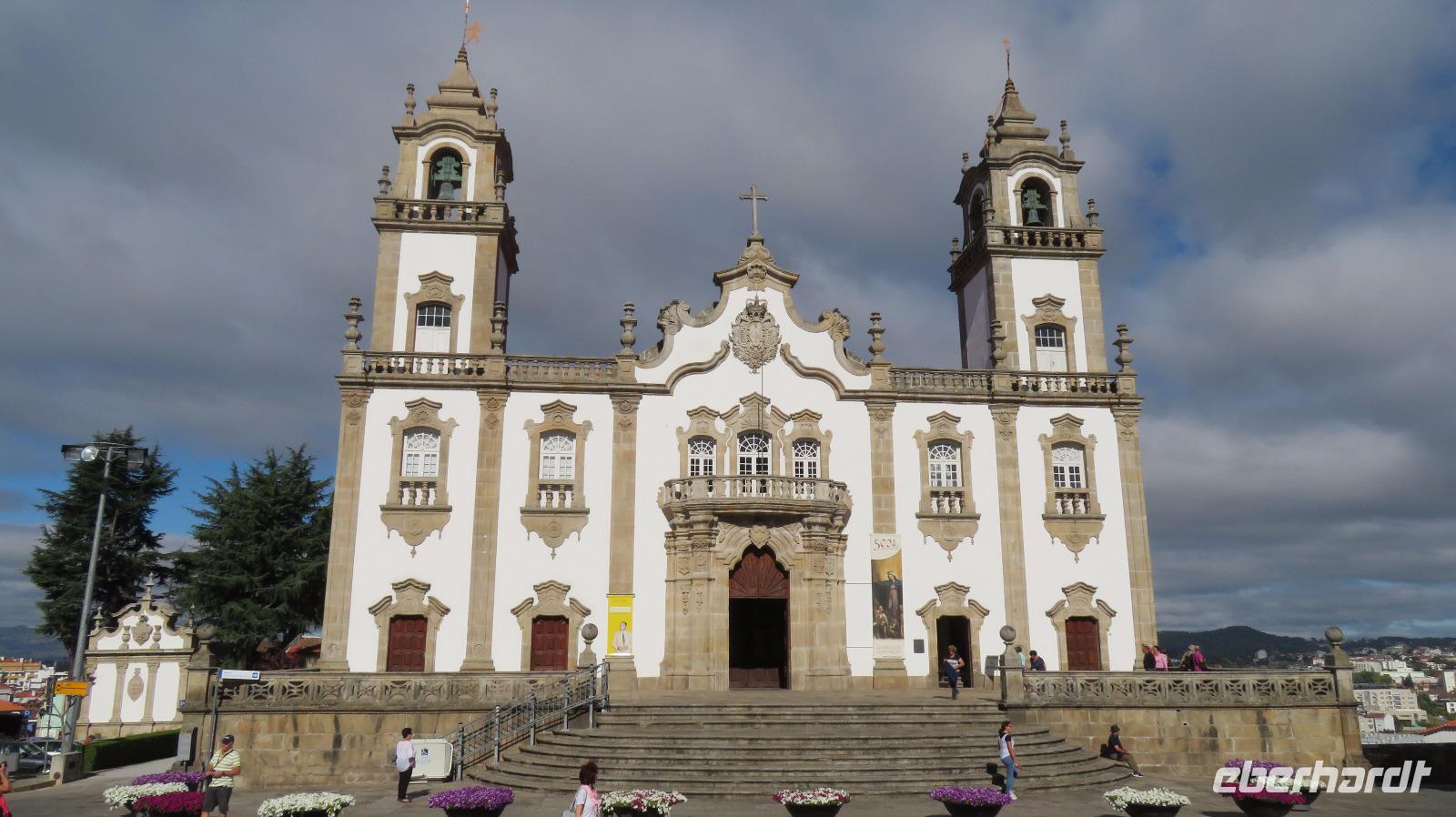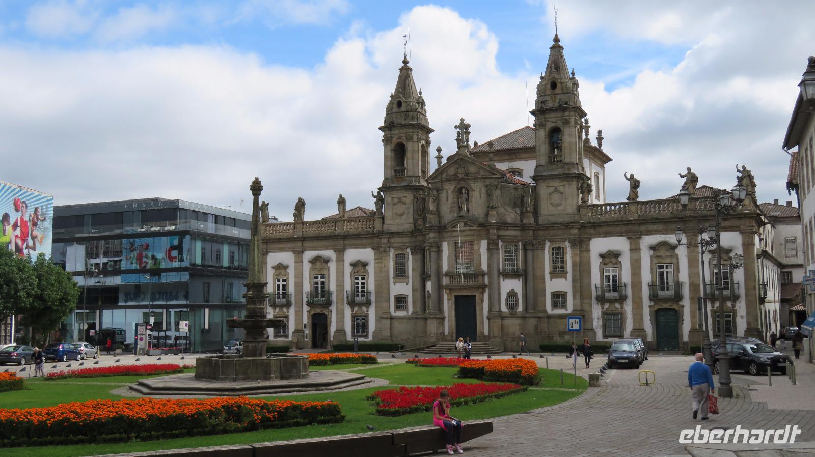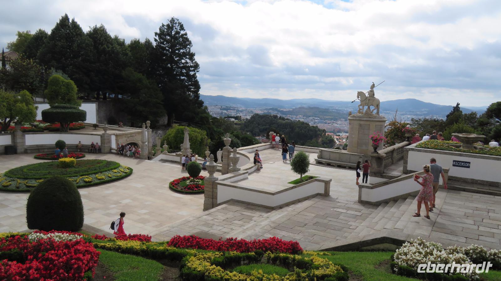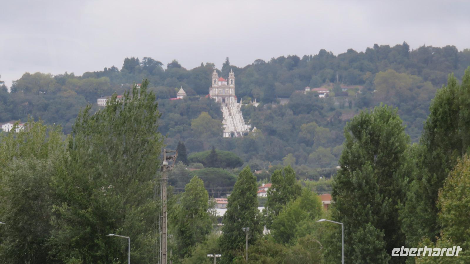 Unsere Mittagspause machen wir nach einem kleinen Stadtrundgang in Braga, der Hauptstadt der Region Minho, um anschließend die Hauptsehenswürdigkeit der Gegend zu besichtigen, Bom Jesus. Der Bau der heutigen Kirche wurde 1811 vollendet. Mit der Bergterrasse und der imposanten barocken Treppenanlage gilt Bom Jesus do Monte als schönste Wallfahrtskirche Portugals. Es ist natürlich ein berühmtes Ziel für Pilger. Manche rutschen die Freitreppe mit 581 Stufen und 116 m Höhenunterschied auf Knien hinauf. Wir machen es uns bequemer, und sind in wenigen Minuten mit der 1882 errichteten Drahtseilbahn am Kirchenvorplatz . Ein herrlicher Blick auf die Anlage aber auch auf die umliegende Landschaft bietet sich uns.
