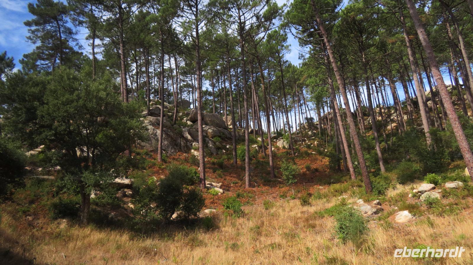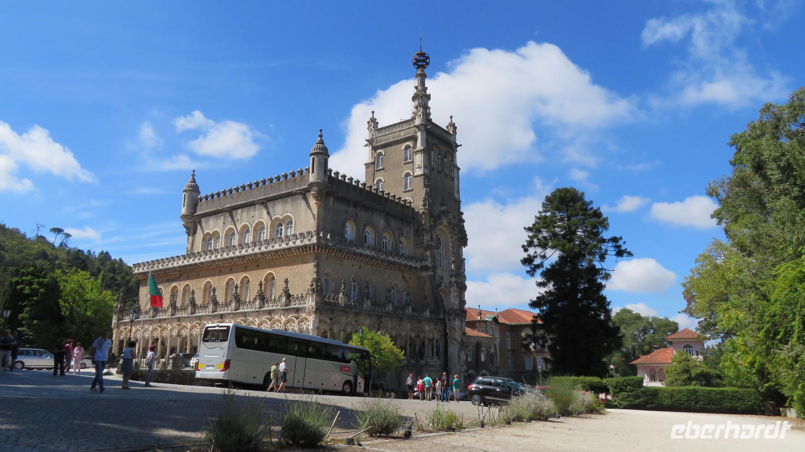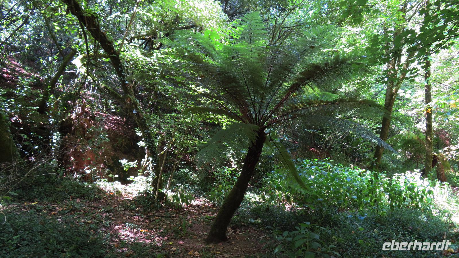 Gegen Mittag erreichen wir Bussaco, einen der schönsten Wälder Europas. Hier ließen sich schon im 6. Jahrhundert Benediktiner nieder. Wir umrunden zuerst das Ende des 19. Jahrhunderts als Königspalast errichtete heutige Palace Hotel do Bussaco, das von einem herrlichen Garten umgeben ist. Das Innere dürfen wir leider nicht besichtigen, obwohl wir schnell mal einen Blick in die Lobby hinein werfen. Wir wandern mit Isabell auf einem der vielen markierten Wanderwege, dem Farnweg. Seefahrer brachten im Laufe der portugiesischen Kolonialgeschichte viele Pflanzen aus den neuentdeckten Ländern mit, die dann hier für eine riesige Artenvielfalt sorgen. Gewaltige Bäume begleiten unseren Weg, Sequoias aus Amerika, Baumfarne aus Neuseeland, Zedern, ... Auch 400 einheimische Arten von Bäumen und Sträuchern konnten sich hier erhalten, da der Wald seit Jahrhunderten von einer Mauer umgeben ist und gut geschützt wurde.