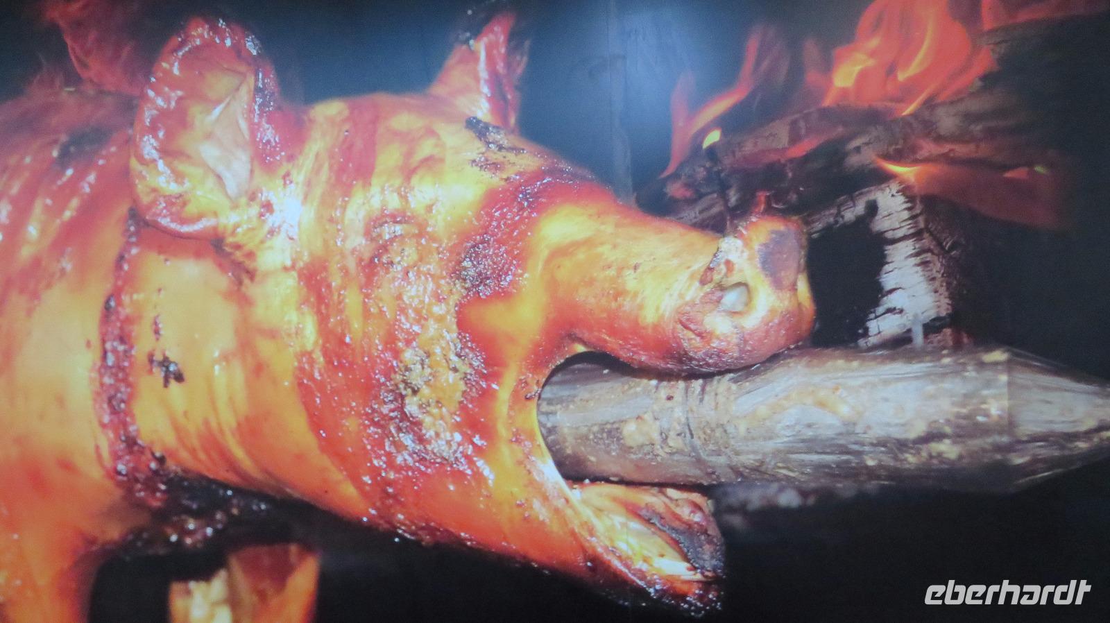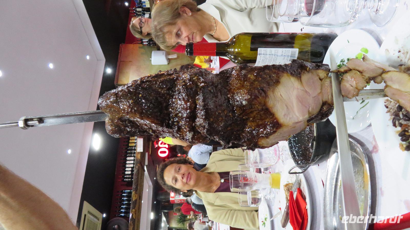 Wir gehen heute gemeinsam zum Abendessen in das Lokal Chimarrao, wo es Rodizio gibt. Immer wieder werden uns verschiedene frisch gegrillte Fleischarten vom Spieß angeboten. Auch ein umfangreiches Vorspeisen und Beilagenbuffet gehört dazu, ebenso wie Wein, Wasser, Kaffee.