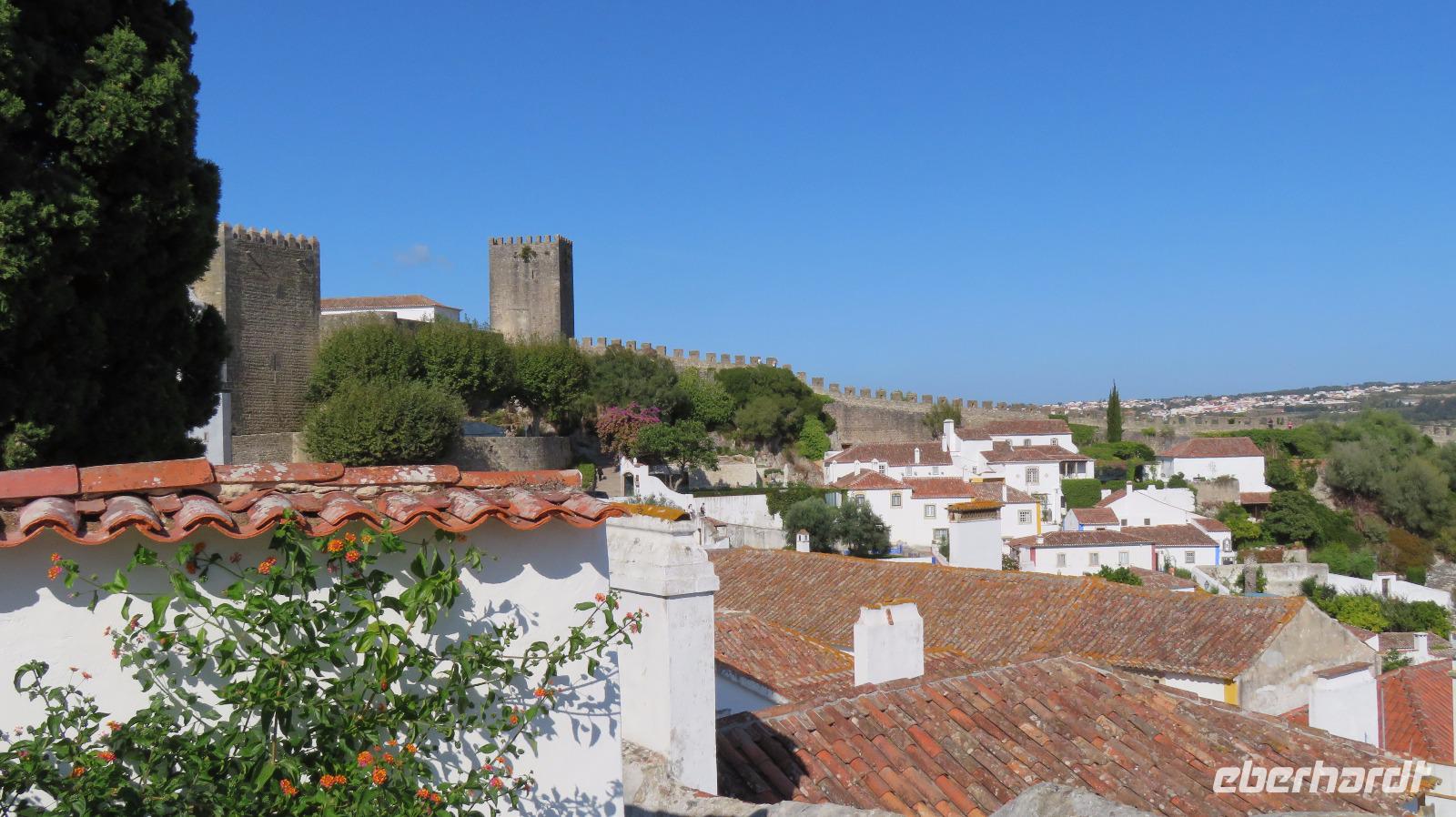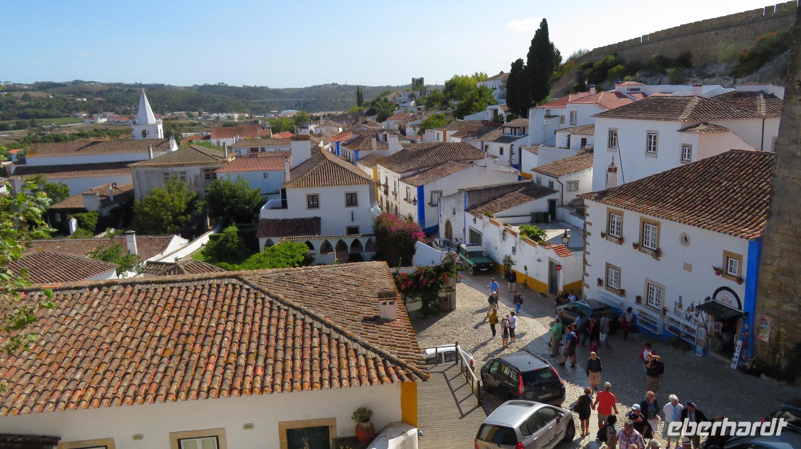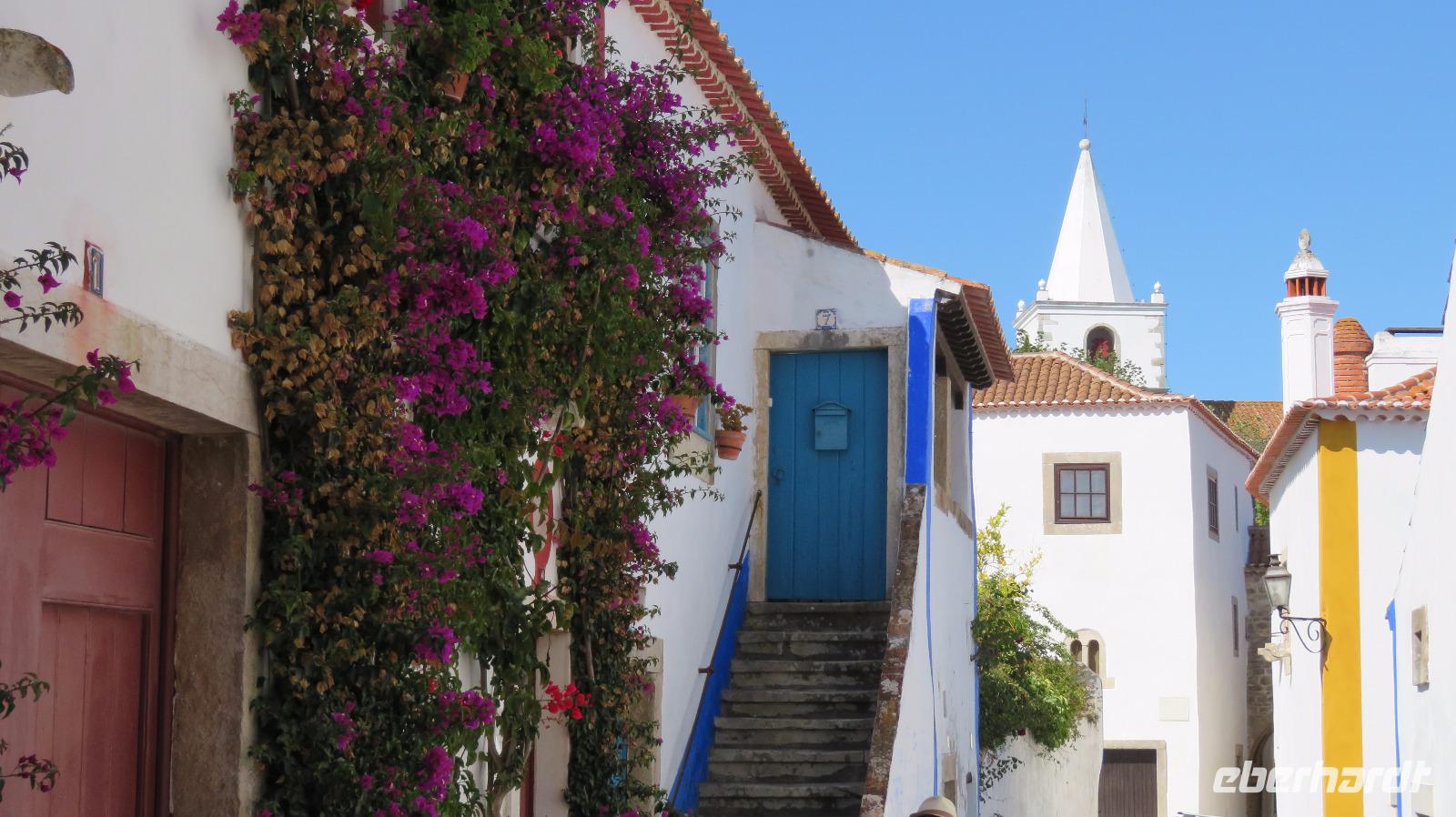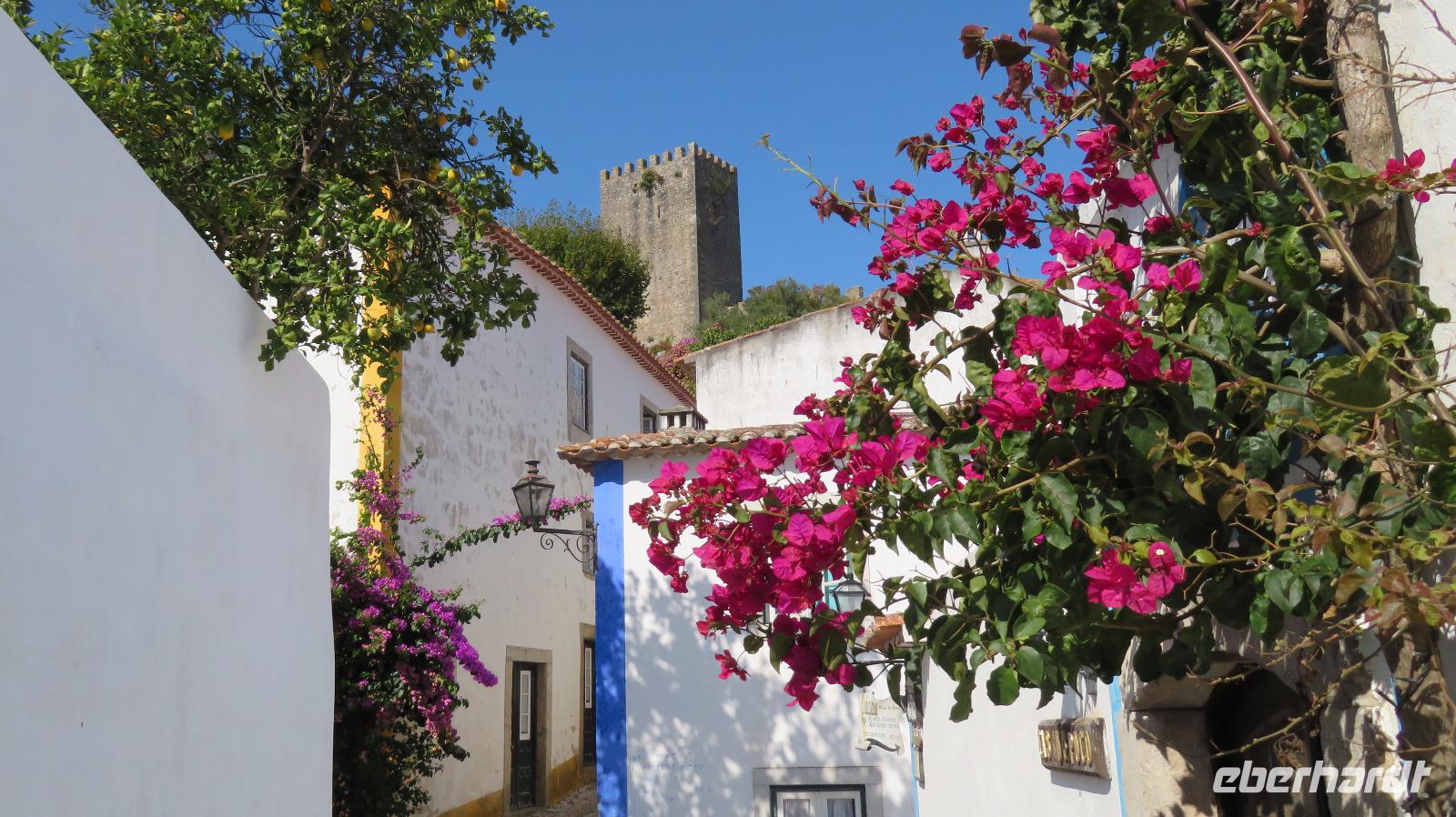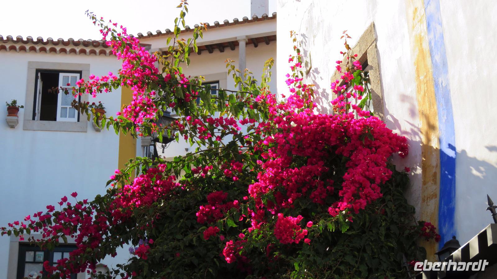 Wir besuchen noch das idyllische Städtchen Obidos, schon von weitem sichtbar. Es wird von einem mächtigen mittelalterlichen Mauergürtel umschlossen. Eine kleine Gasse führt auf einen Hügel zur maurischen Burg, die heute ein Hotel beherbergt. Kleine weiße Häuschen mit Bougainvilleas bewachsen, einige Kirchen, viele Geschäfte und noch viel mehr Touristen ...
