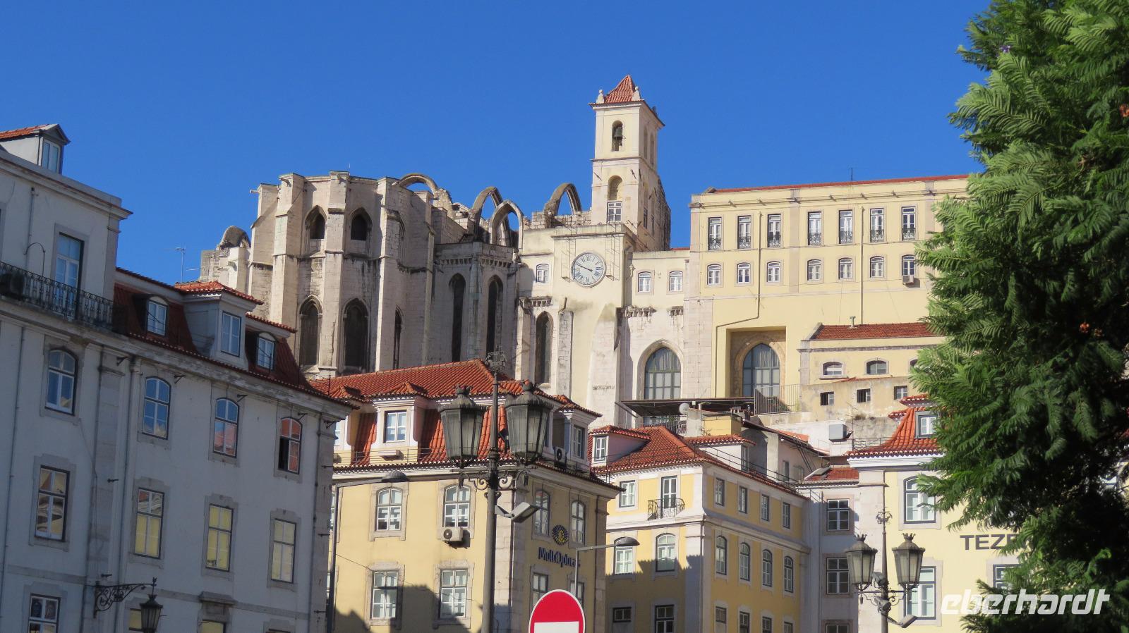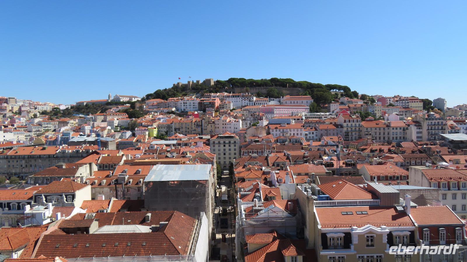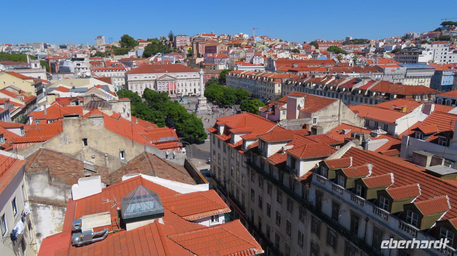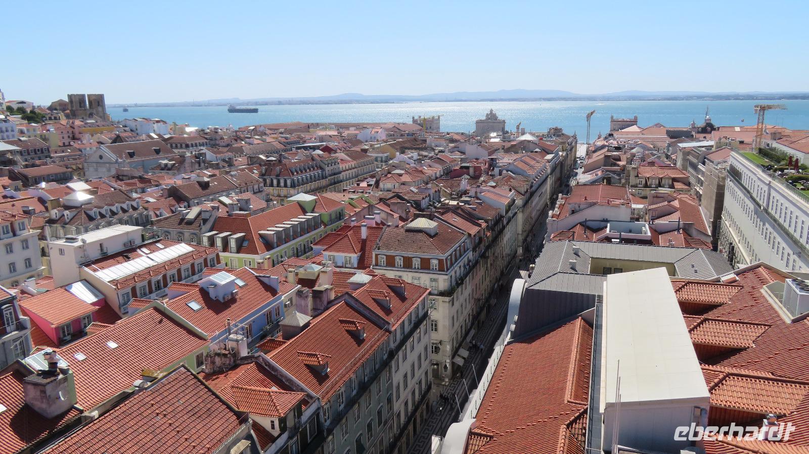 Petra läuft mit einigen Gästen zur Aussichtsplattform vom Lift des berühmten Elevador de Santa Justa. Der schmiedeeiserne Aufzug aus Gusseisen wurde 1901 von einem Eiffelschüler errichtet, und verbindet die Unterstadt Baixa mit der Oberstadt Chiado und dem Bairro Alto. Zu Fuß sind wir schneller. Besser, als unsere kostbare Freizeit mit Anstehen zu verbummeln. Aber der Ausblick ist berauschend. Natürlich sollte auch ein Spaziergang zur Praça do Comércio am Tejo, dem großen eleganten Palast- Platz, wie er auch genannt wird, nicht fehlen. Allerdings fiel der Königspalast dem großen Erdbeben 1755 zum Opfer, aber den König Jose I. kann man noch immer (oder wieder) auf seinem Pferd bewundern. Ein monumentaler Triumphbogen schließt den Platz zur Baixa ab.