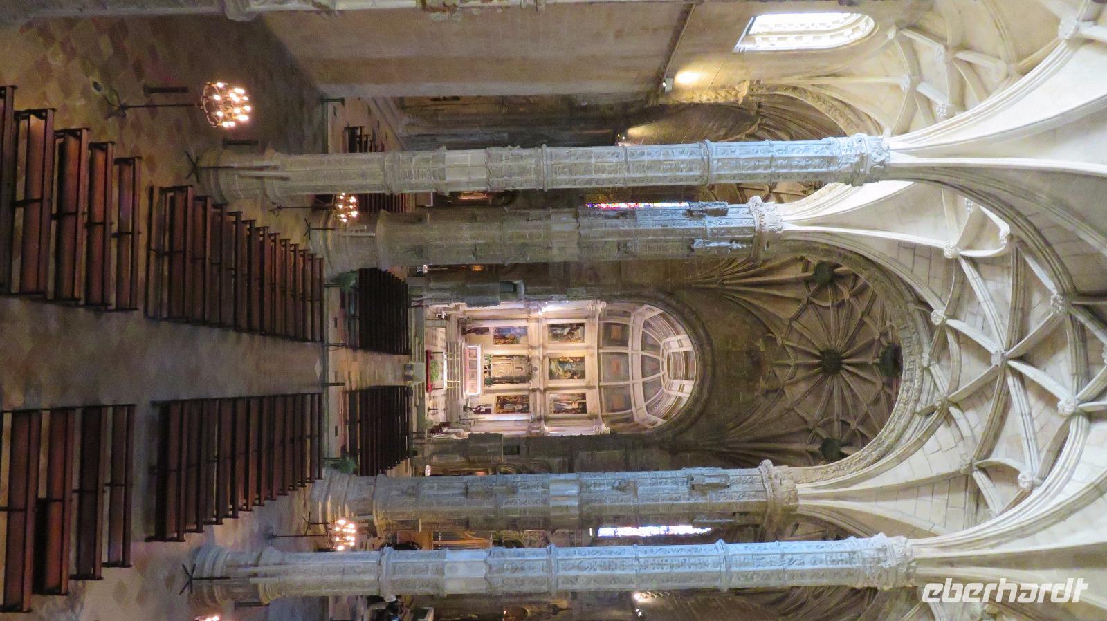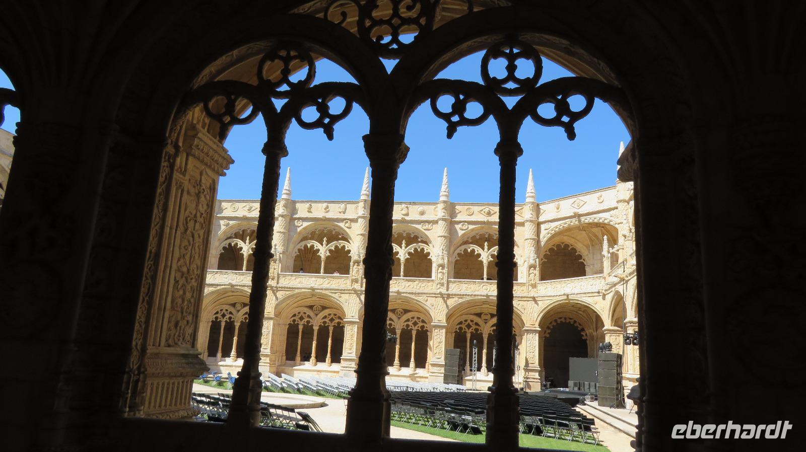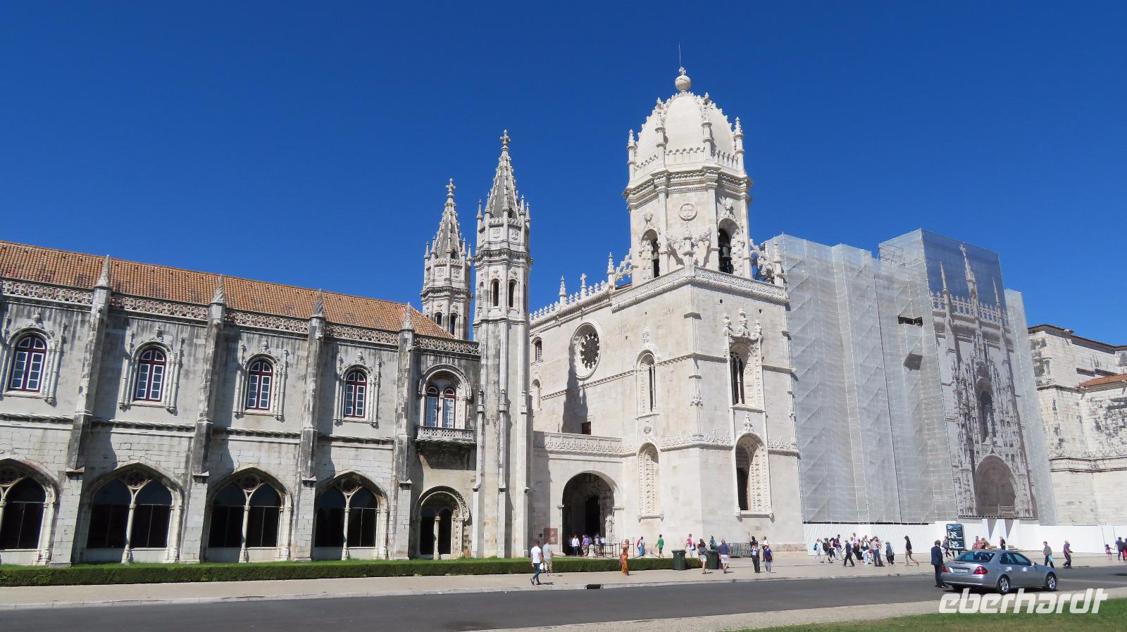 Wir fahren noch in den Stadtteil Belem, denn hier befinden sich einige der Hauptsehenswürdigkeiten von Portugal. Zuerst besichtigen wir mit Isabell das portugiesische Nationaldenkmal, das Hieronymuskloster, das mit dem Turm von Belem (der noch folgt) als Weltkulturerbe gilt. Da eine Hochzeit stattfindet, beginnen wir die Besichtigung im Kreuzgang und Obergeschoss. Die spezielle spätgotische Bauweise, die Manuelinik erinnert an König Manuel I., der das Gebäude in Auftrag gegeben hat. 1544 wurde das Gotteshaus nach 42 Jahren Bauzeit fertig gestellt. Wir bekommen dann noch die Gelegenheit, die Kirche von innen zu besichtigen und können an den Sarkophag vom großen portugiesischen Seefahrer und Entdecker Vasco da Gama und anderen berühmten Portugiesen treten.