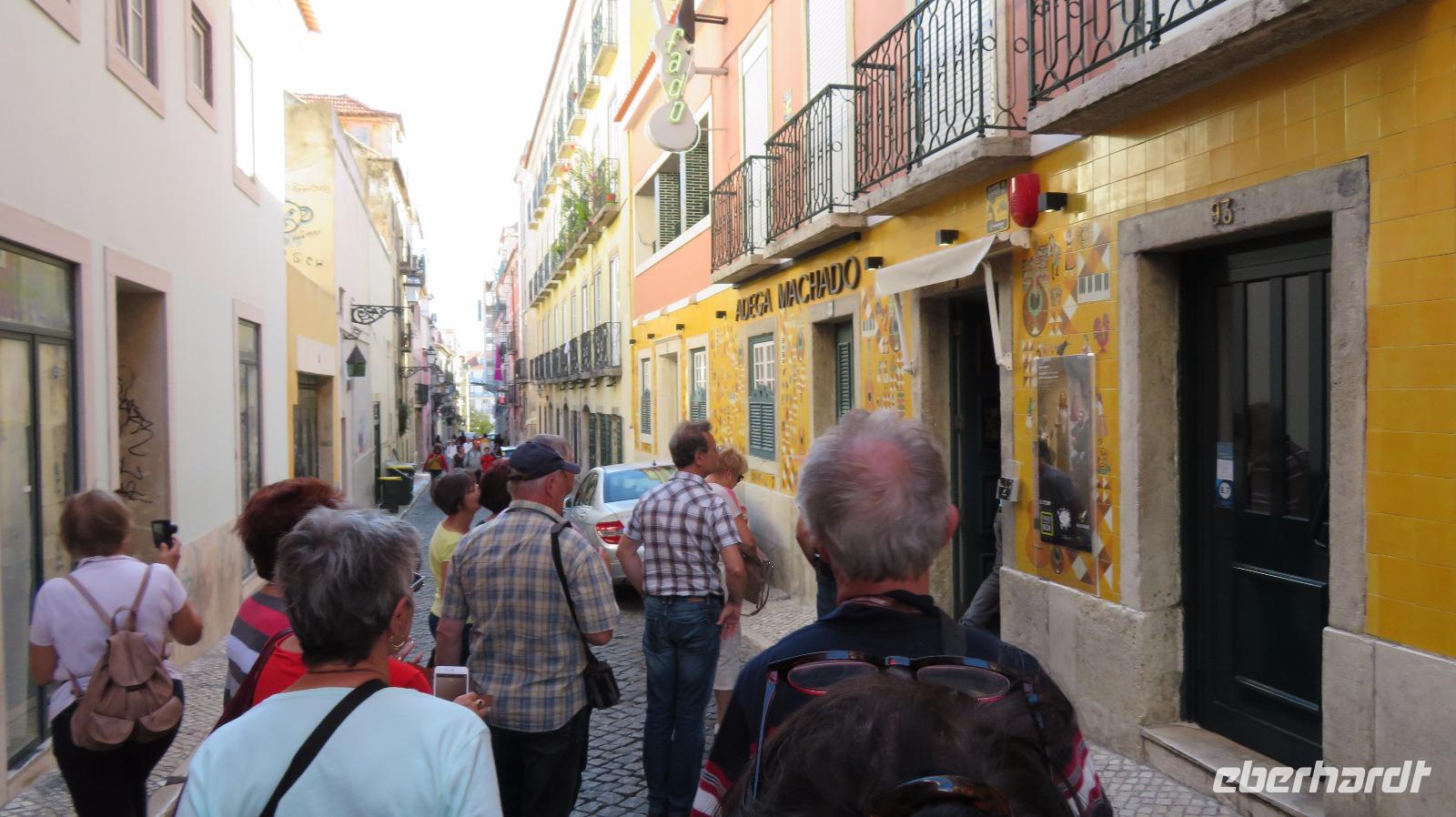 Mit der alten Standseilbahn fahren wir hinauf ins Viertel Bairro Alto. Auch das ist schon ein Erlebnis! Wir werden im Fado-Restaurant Adega Machado mit einem Gläschen Wein und einem kleinen Imbiss erwartet und genießen diese Musik. Fado ist nicht nur eine portugiesische Musikrichtung, es ist ein Ausdruck des typisch portugiesischen Lebensgefühls, sagt man.