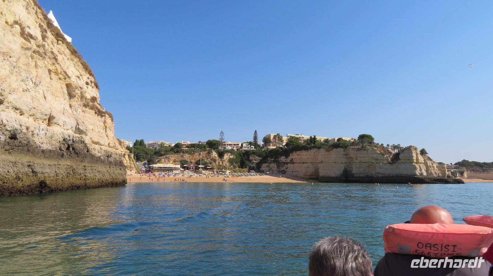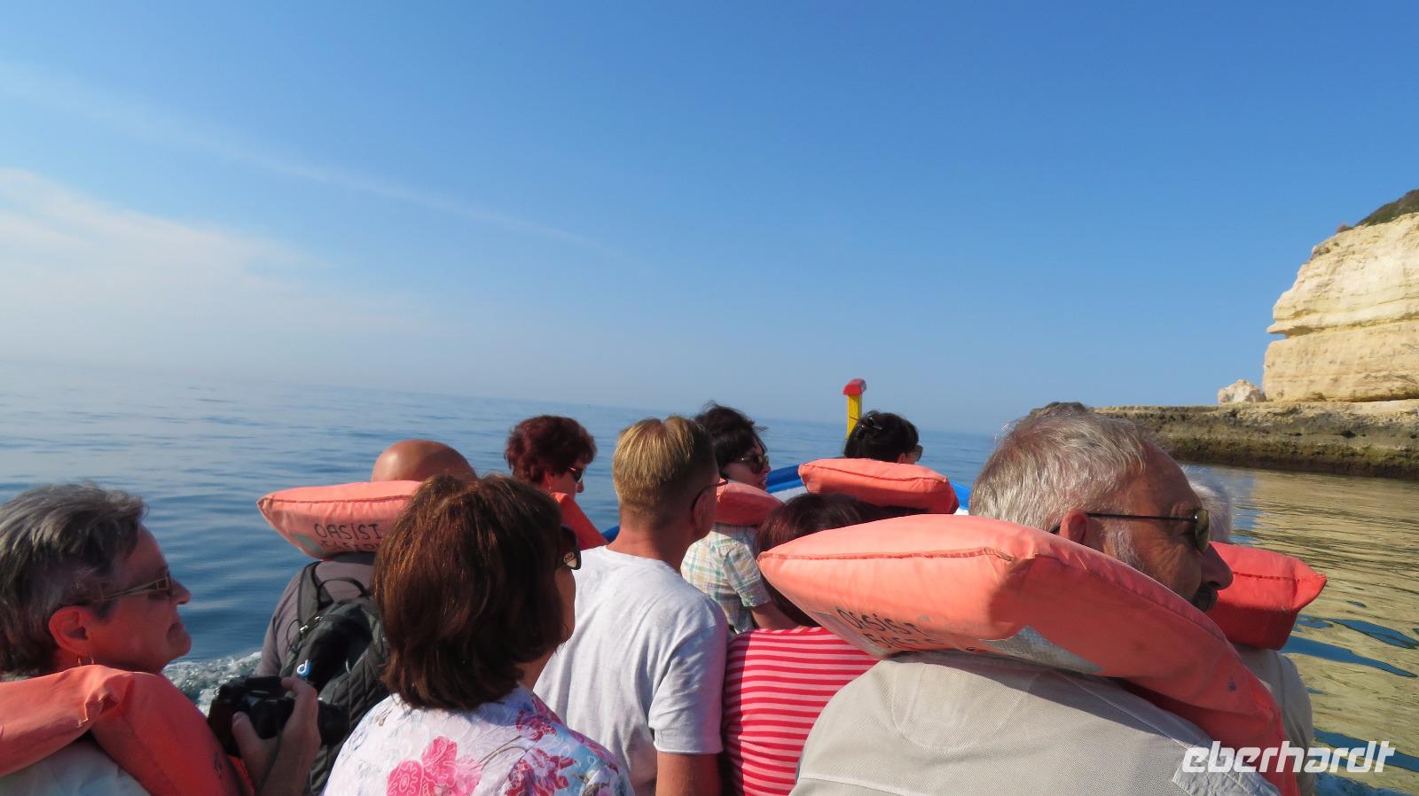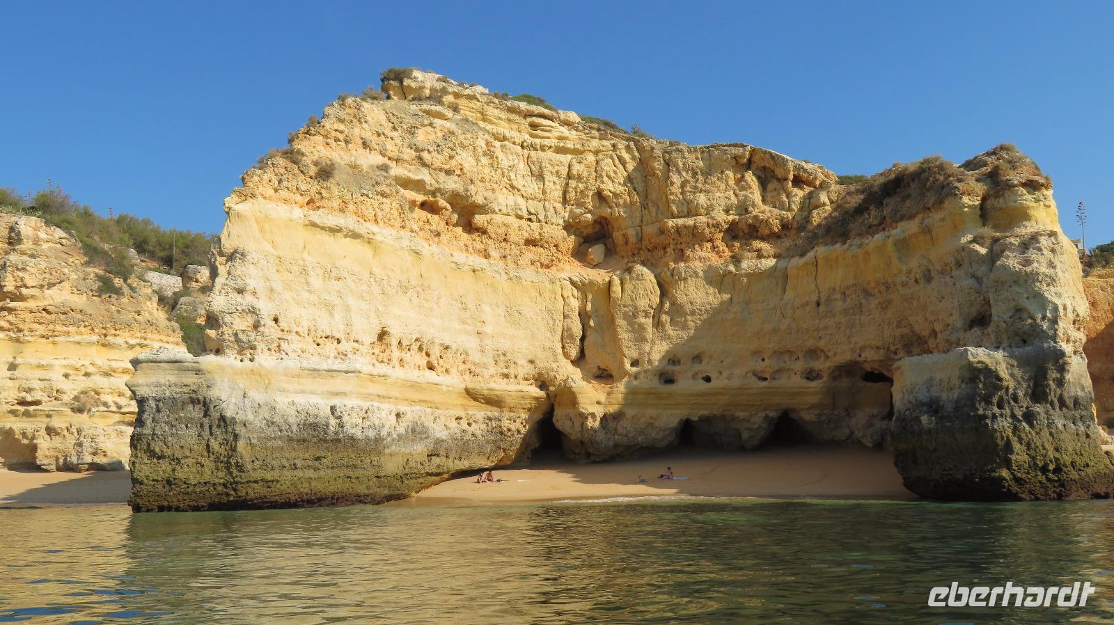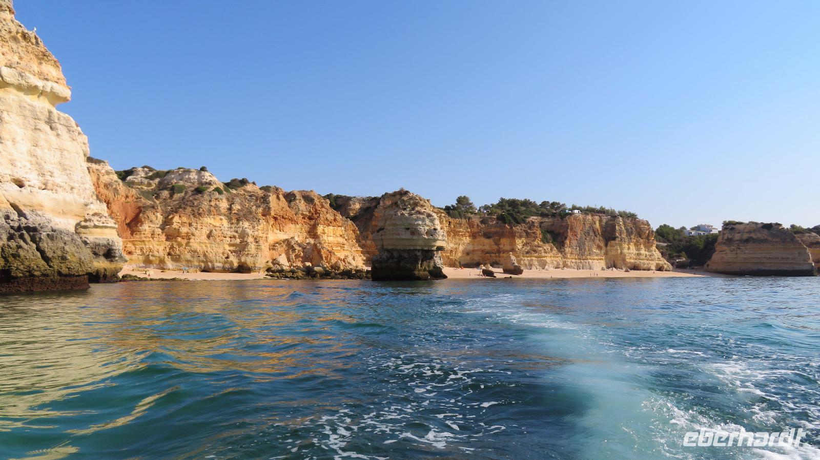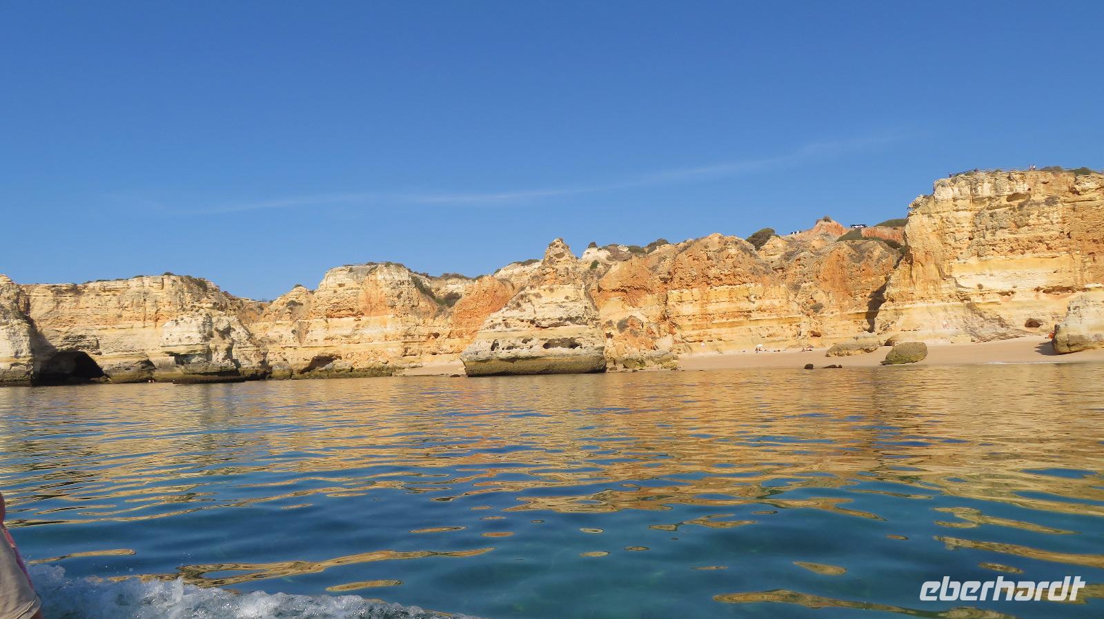 Doch Reisebegleitung Petra hat für uns morgens eine Bootstour organisiert. Sicher eines der Highlights der Reise für Naturliebhaber. Nur das Einsteigen direkt am Strand ist etwas beschwerlich. Mit einem kleinen Boot fahren wir an der Steilküste entlang gen Westen. Herrliche Klippen, Buchten und Höhlen können wir bewundern. Hier zeigt sich die Algarve von ihrer schönsten Seite. Am Nachmittag kann man noch ein Stück an der Steilküste umherwandern, aber es ist recht heiß.