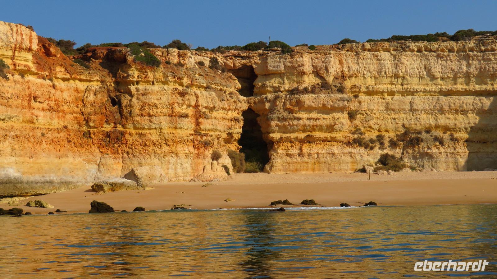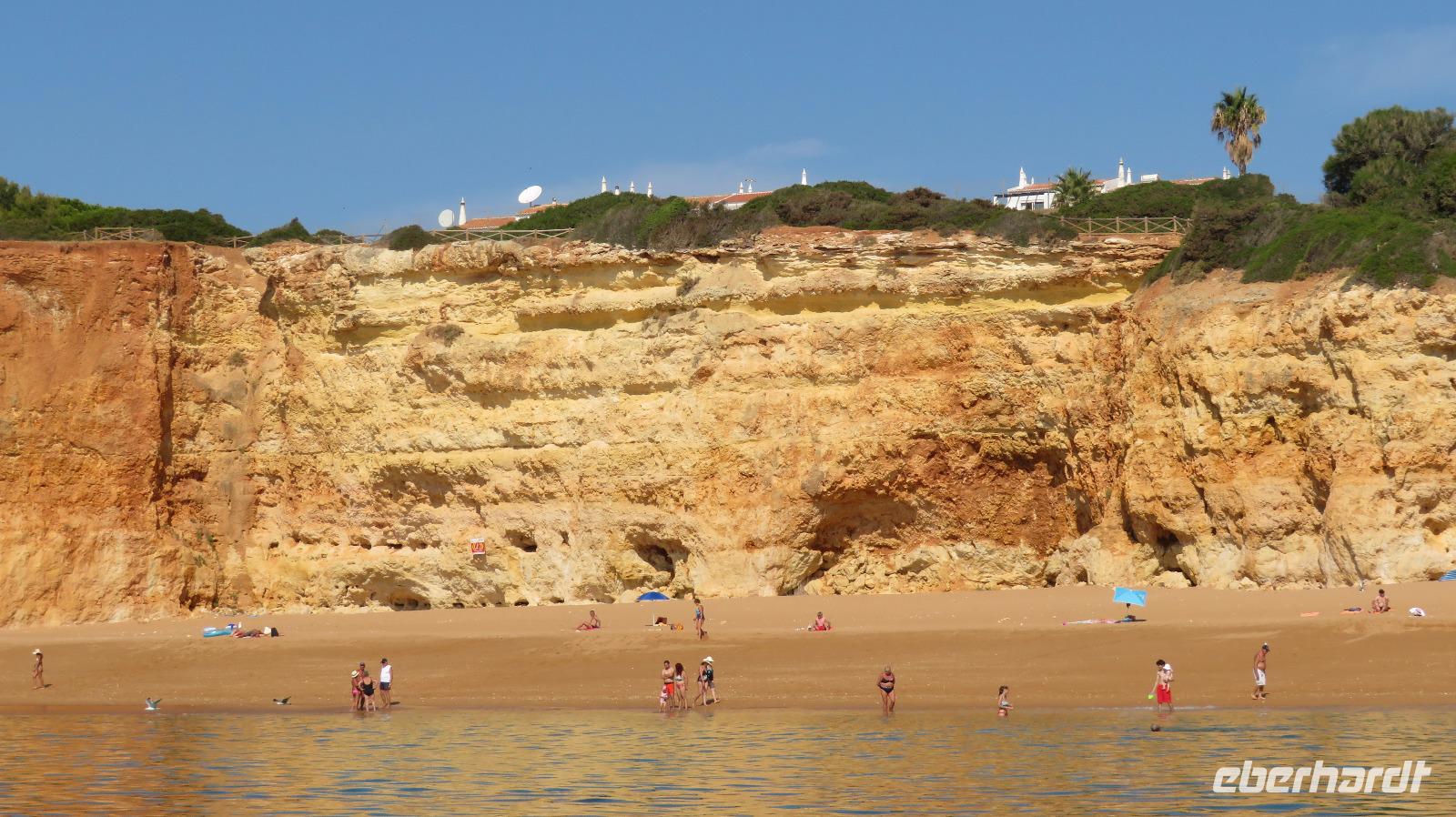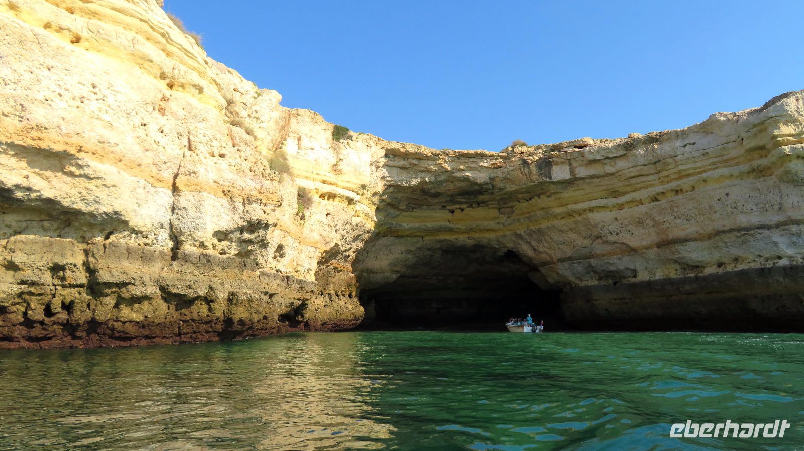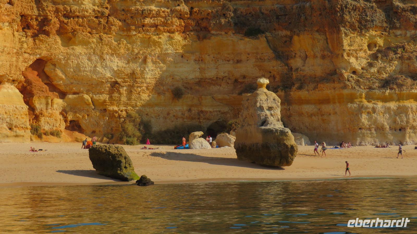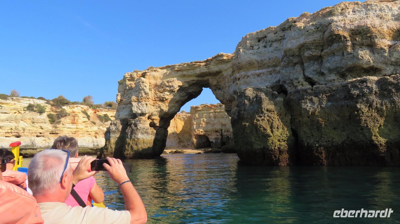 Doch Reisebegleitung Petra hat für uns morgens eine Bootstour organisiert. Sicher eines der Highlights der Reise für Naturliebhaber. Nur das Einsteigen direkt am Strand ist etwas beschwerlich. Mit einem kleinen Boot fahren wir an der Steilküste entlang gen Westen. Herrliche Klippen, Buchten und Höhlen können wir bewundern. Hier zeigt sich die Algarve von ihrer schönsten Seite. Am Nachmittag kann man noch ein Stück an der Steilküste umherwandern, aber es ist recht heiß.