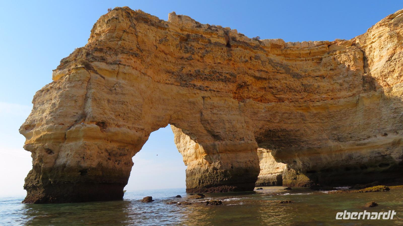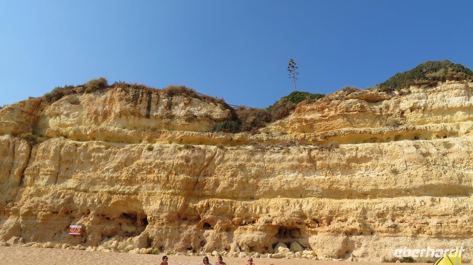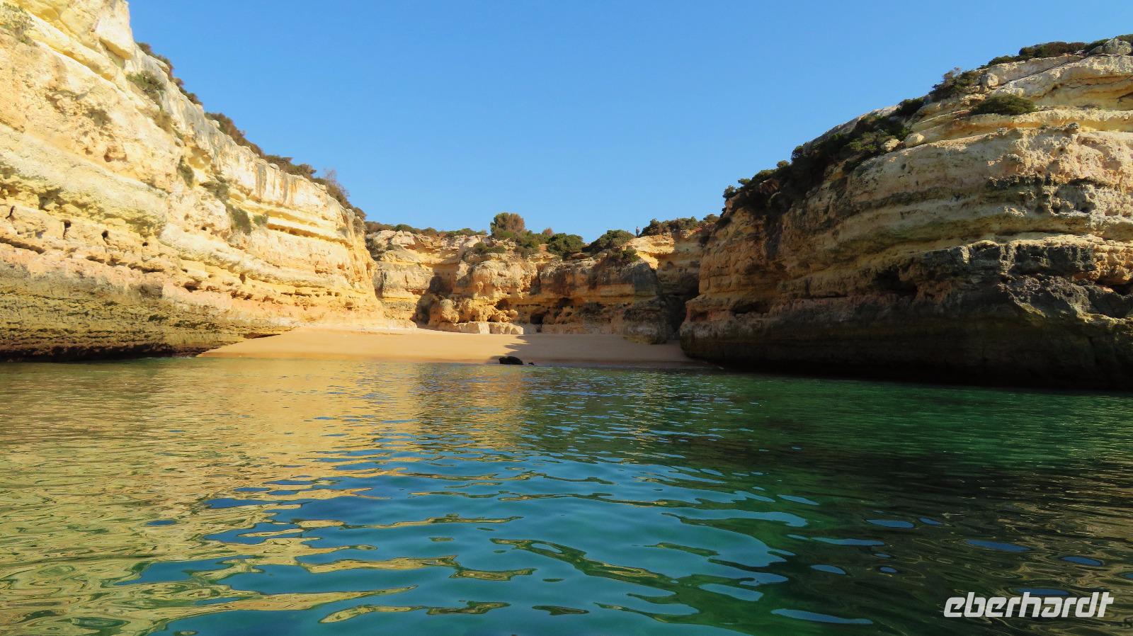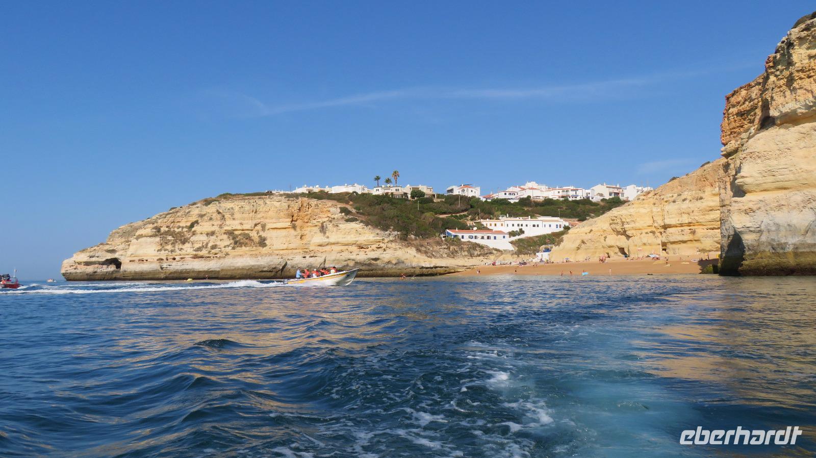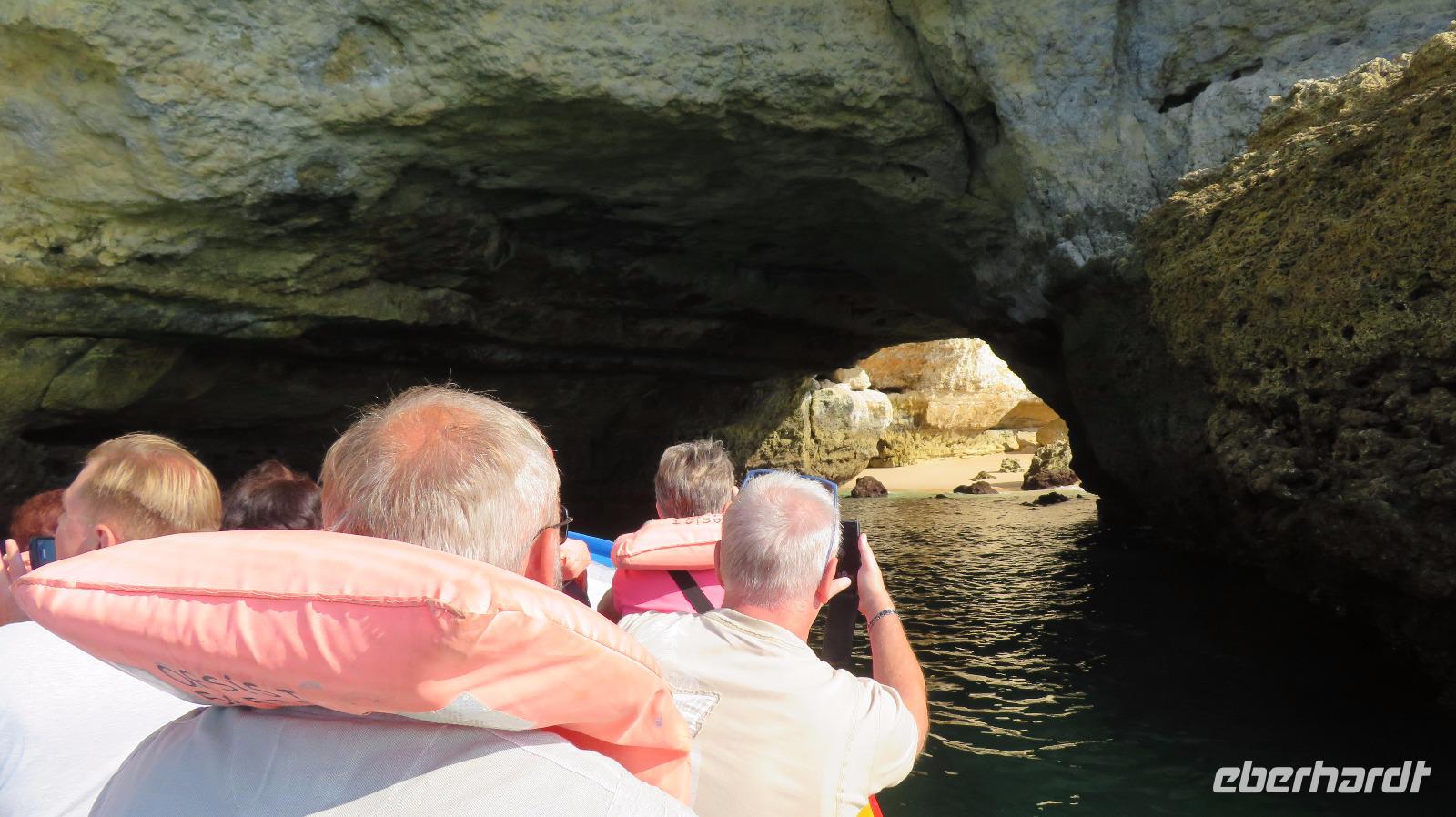 Doch Reisebegleitung Petra hat für uns morgens eine Bootstour organisiert. Sicher eines der Highlights der Reise für Naturliebhaber. Nur das Einsteigen direkt am Strand ist etwas beschwerlich. Mit einem kleinen Boot fahren wir an der Steilküste entlang gen Westen. Herrliche Klippen, Buchten und Höhlen können wir bewundern. Hier zeigt sich die Algarve von ihrer schönsten Seite. Am Nachmittag kann man noch ein Stück an der Steilküste umherwandern, aber es ist recht heiß.