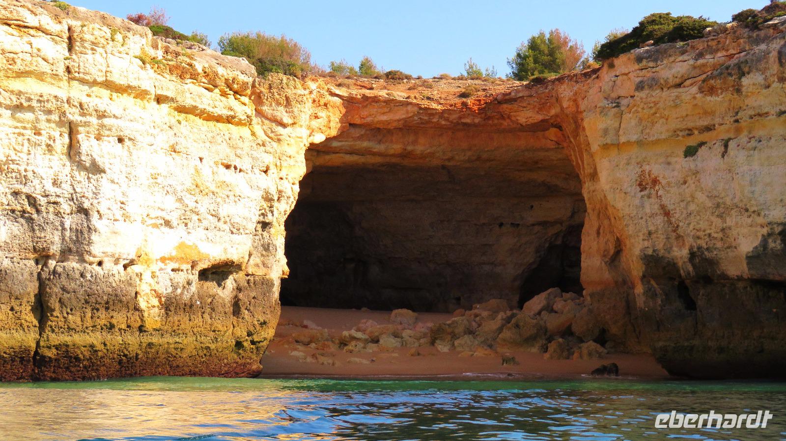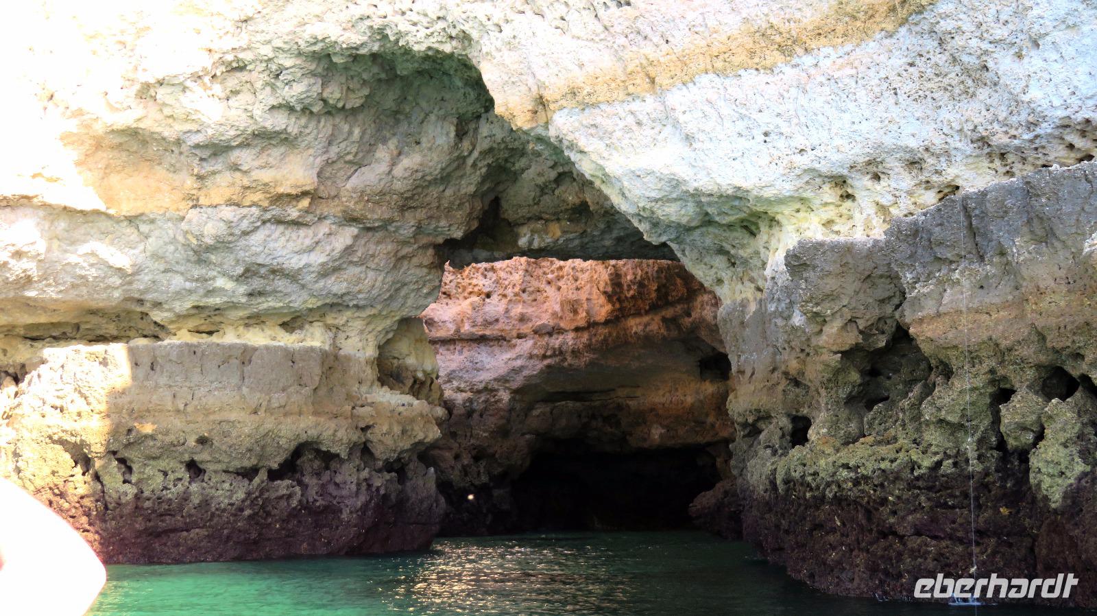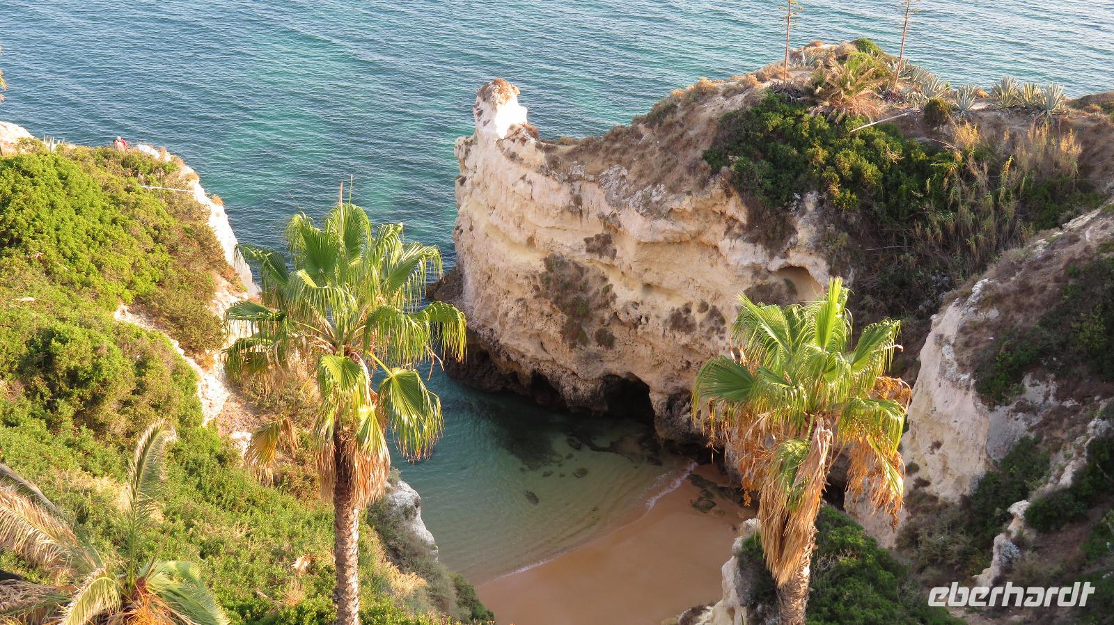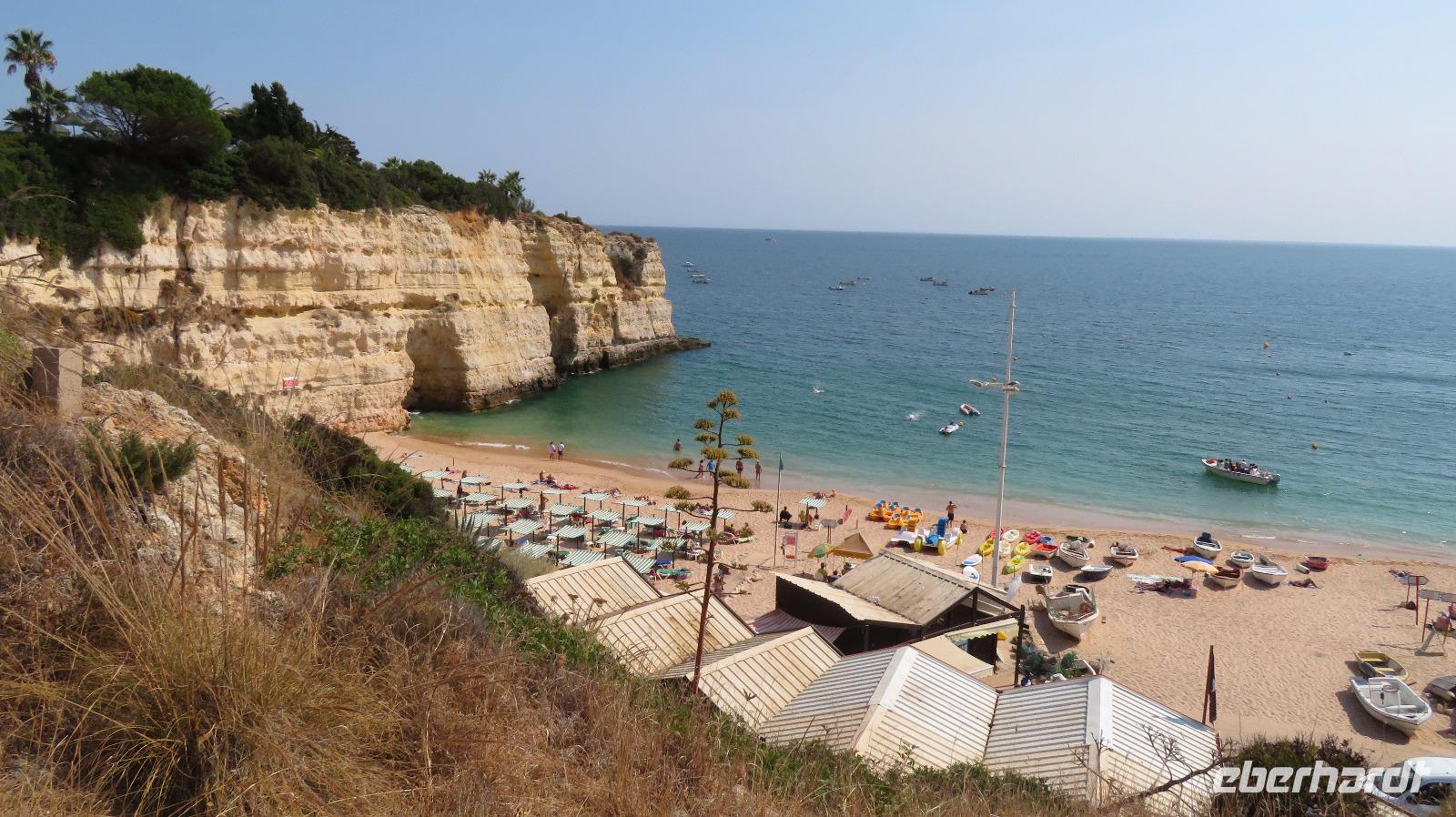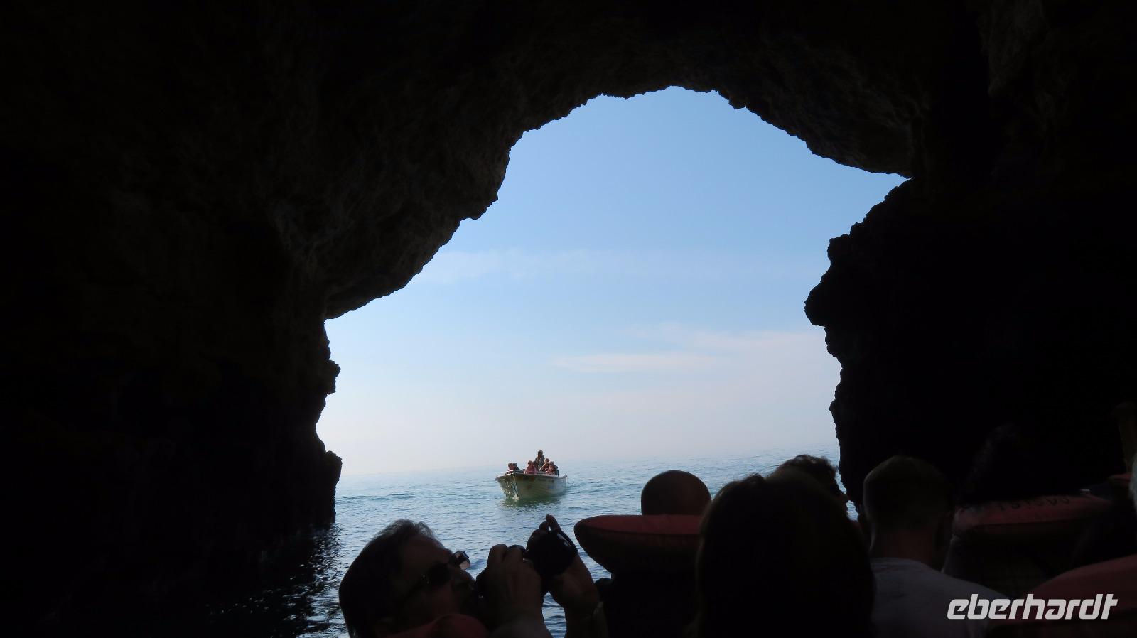 Doch Reisebegleitung Petra hat für uns morgens eine Bootstour organisiert. Sicher eines der Highlights der Reise für Naturliebhaber. Nur das Einsteigen direkt am Strand ist etwas beschwerlich. Mit einem kleinen Boot fahren wir an der Steilküste entlang gen Westen. Herrliche Klippen, Buchten und Höhlen können wir bewundern. Hier zeigt sich die Algarve von ihrer schönsten Seite. Am Nachmittag kann man noch ein Stück an der Steilküste umherwandern, aber es ist recht heiß.