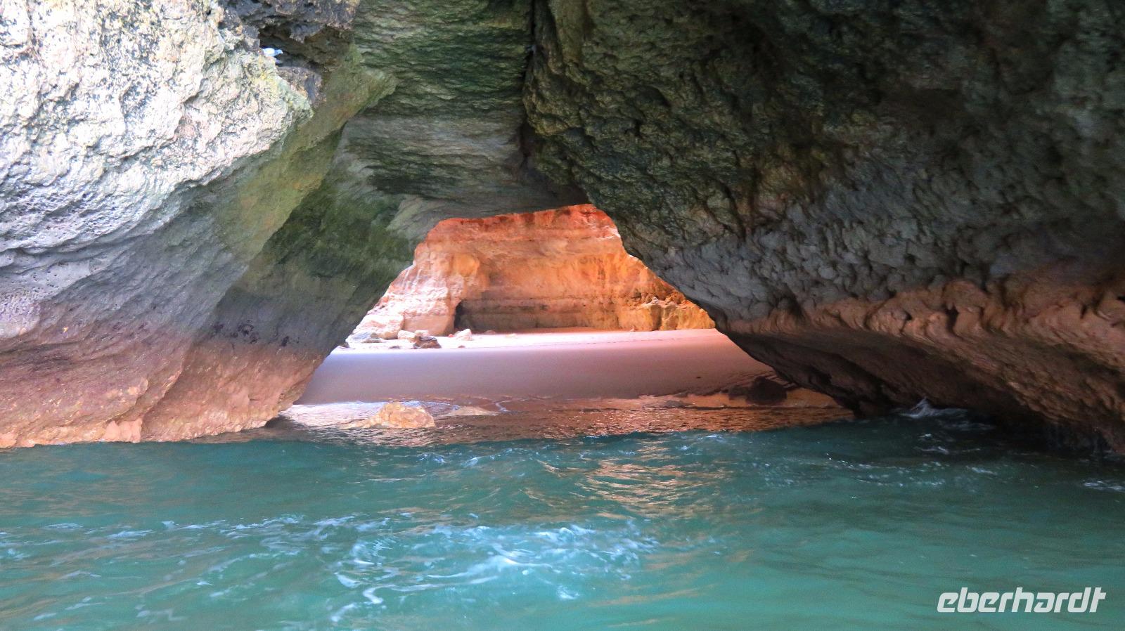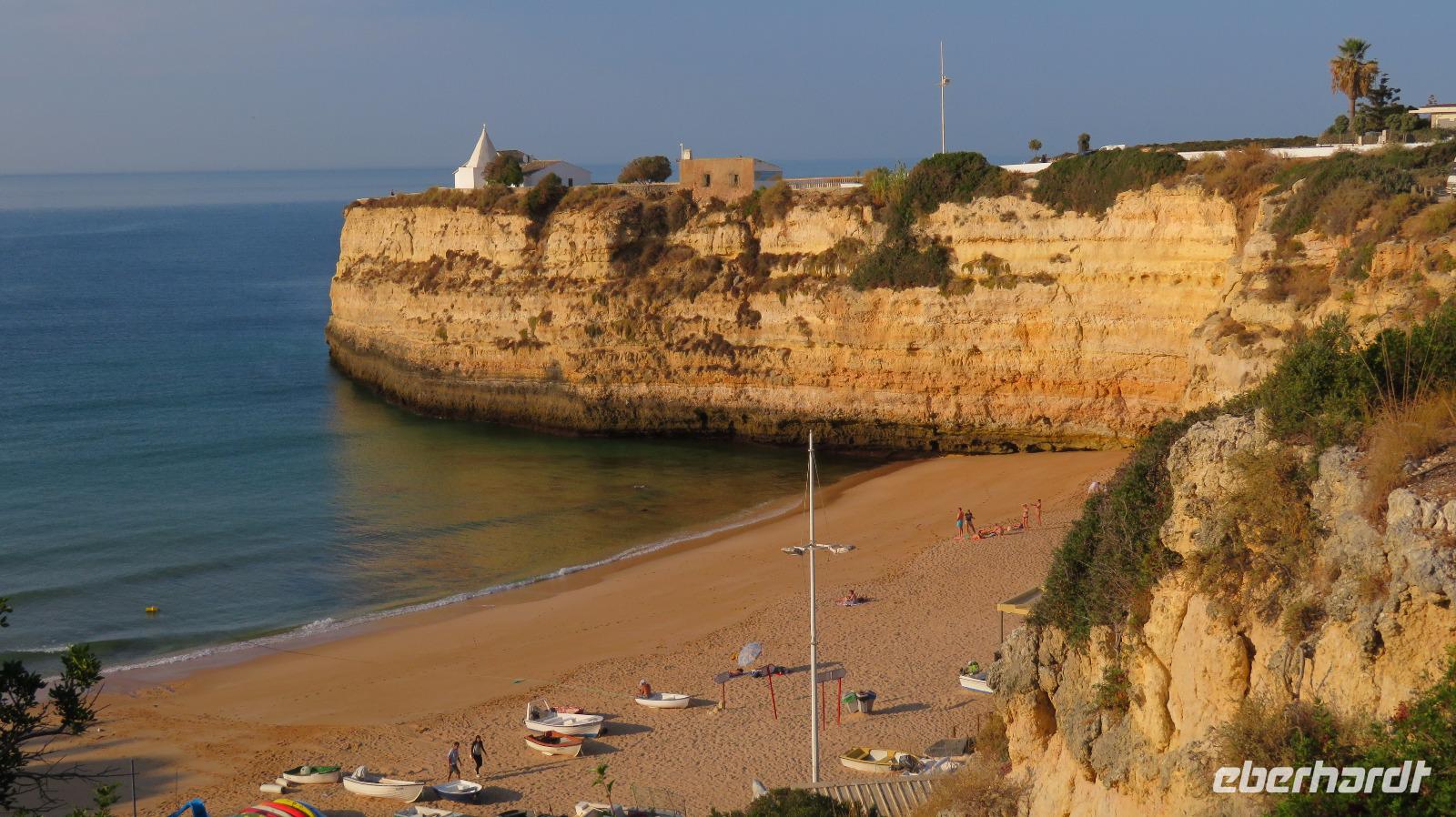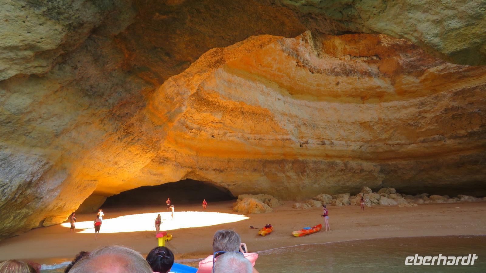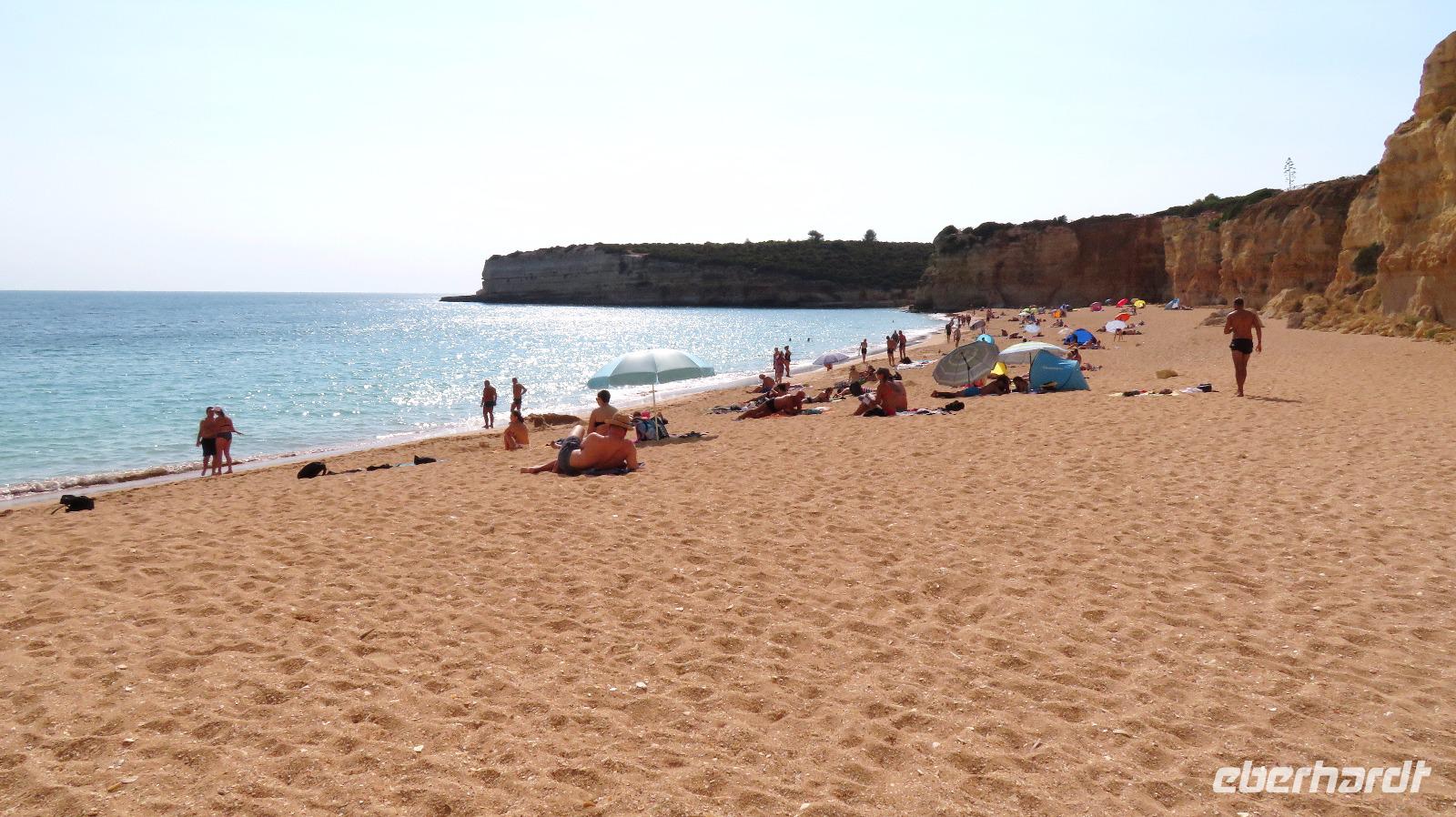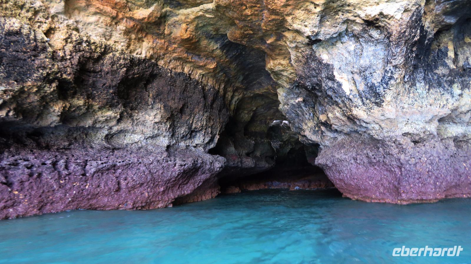 Doch Reisebegleitung Petra hat für uns morgens eine Bootstour organisiert. Sicher eines der Highlights der Reise für Naturliebhaber. Nur das Einsteigen direkt am Strand ist etwas beschwerlich. Mit einem kleinen Boot fahren wir an der Steilküste entlang gen Westen. Herrliche Klippen, Buchten und Höhlen können wir bewundern. Hier zeigt sich die Algarve von ihrer schönsten Seite. Am Nachmittag kann man noch ein Stück an der Steilküste umherwandern, aber es ist recht heiß.