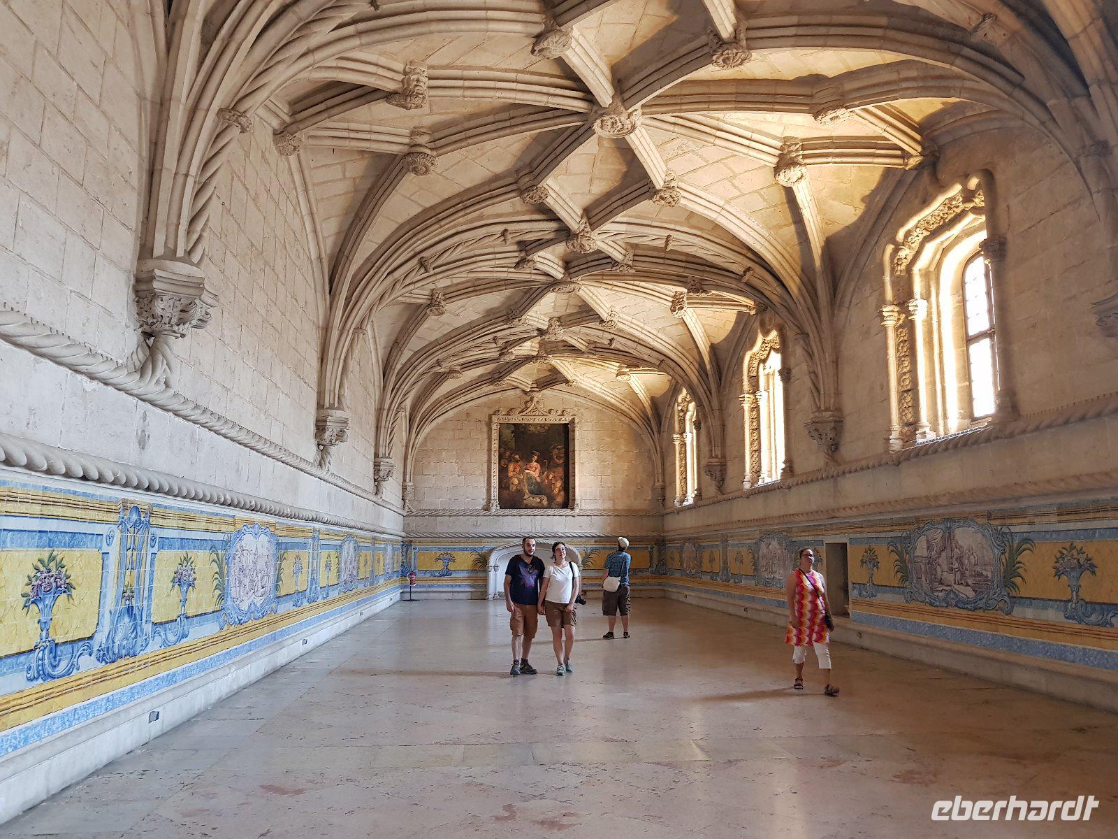 Wir starten unseren ersten Tag in Porto mit einer entspannten Stadtrundfahrt in unserem Bus. Es ist wunderbar warm und sonnig. Entlang des Atlantiks fahren wir Richtung Flussmündung des Rio Douro bis wir das historische Zentrum von Porto erreichen. Hier und da ein kleiner Foto Stopp und dann parken wir den Bus direkt an der Börse/ Handelskammer. Wir schauen uns das imposante Gebäude auch von innen an. Das ehemalige Kloster, was später als Börse in Porto diente, erinnert mit seinem lichtdurchfluteten Innenhof noch eben an ein solches. An den Wänden finden sich zahlreiche Wappen von Ländern, mit denen Porto einst Handel betrieben hat. Der Fußboden ist aufwendig mit Mosaik gepflastert. Das Highlight des Gebäudes ist der große arabische Saal mit feinstem vergoldetem Stucke und arabischen Fragmenten und Schriften.