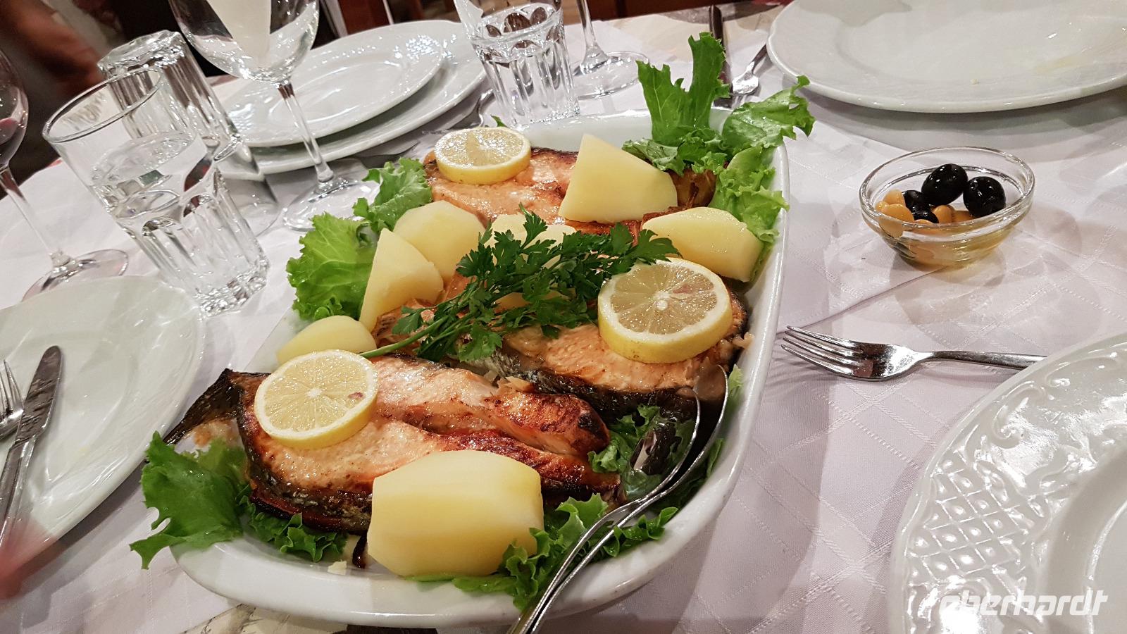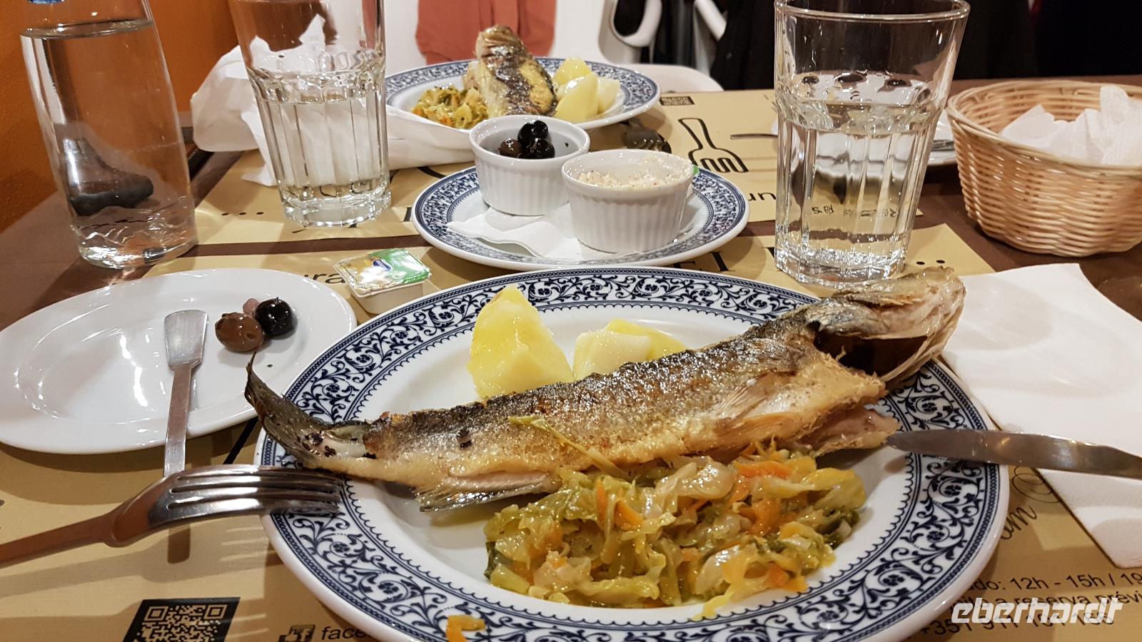 Das Hotel begrüßt uns freundlich und nachdem wir problemlos eingecheckt hatten blieb Zeit, die Gegend ein wenig zu erkunden. Der Supermarkt in der Nähe hat auch sonntags geöffnet- gut so für einige vergessene oder noch zu besorgende Dinge und dann unternehmen viele noch einen Spaziergang zur nahen Casa da Musica oder in den Park. Wer direkt von München nach Porto geflogen war konnte den Tag ohnehin bereits in der Stadt unterwegs sein und erste Eindrücke sammeln. Am Abend trafen wir uns dann erstmals alle zusammen und los ging es zum nahen "Sei La!!", was in etwa heißt "woher soll ich das wissen..." ein geflügeltes Wort, wie uns Maria erzählt. Traditionell bekamen wir vorab eine Suppe- Portugiesen sind bekannt für ihre Eintöpfe- und dann konnte jeder wählen ob Fisch oder Geflügel. Ganz Mutige wagten sich an Bacalhau- das traditionelle portugiesische Gericht: Kabeljau getrocknet zu Stockfisch, der dann gewässert wieder ganz normal zubereitet werden kann. Leckere Kuchen rundeten unser Abendessen ab. Durch das abendliche Porto ging es zurück zum Hotel, kurze Absprachen noch zum morgigen Tag und dann forderte ein langer Tag seinen Tribut, alle freuten sich auf die Betten.