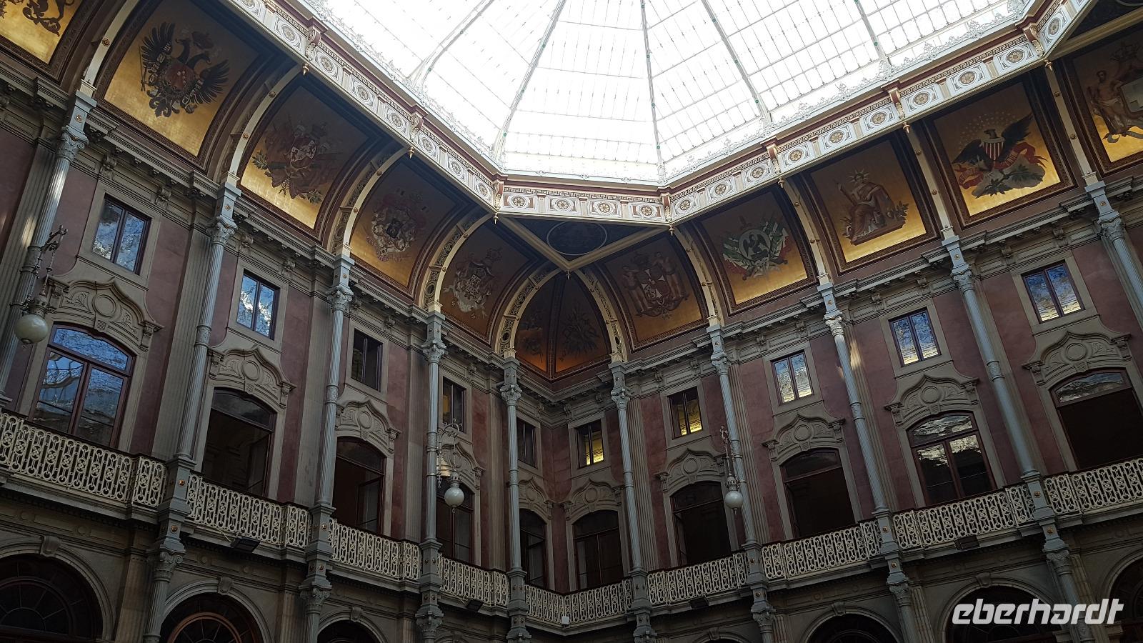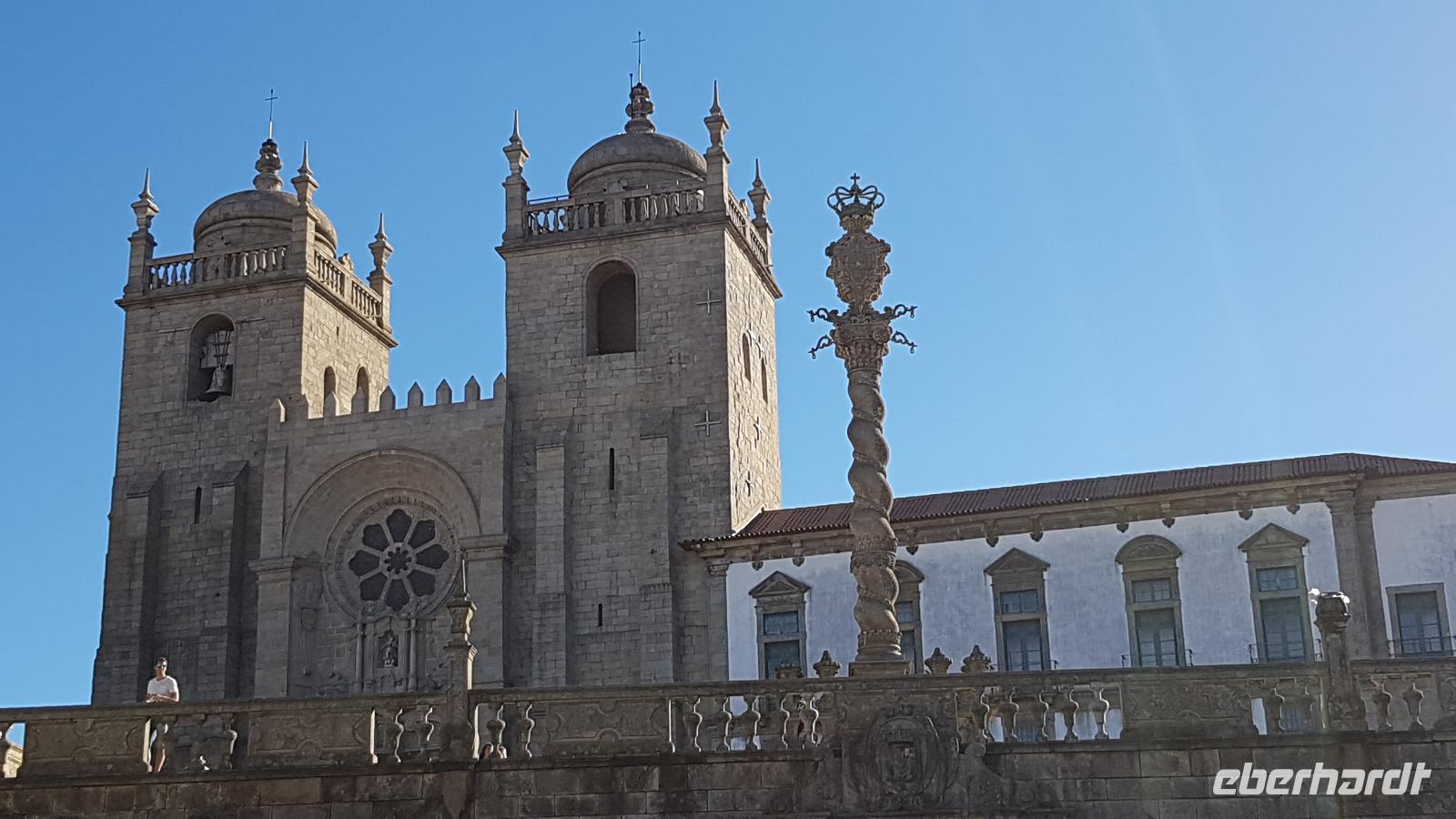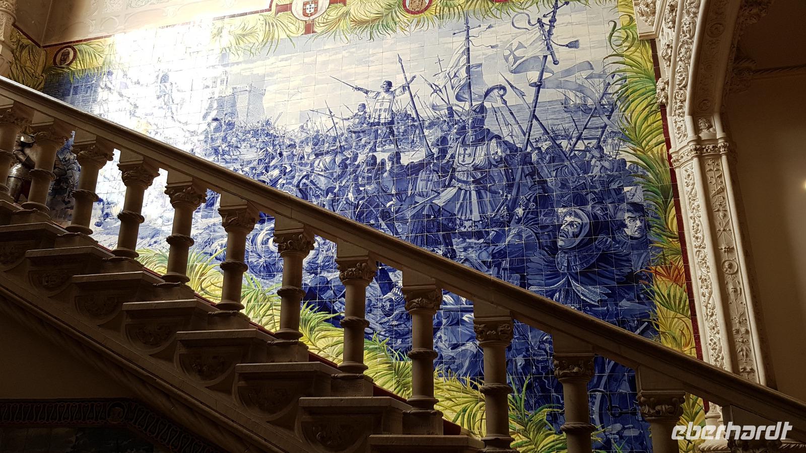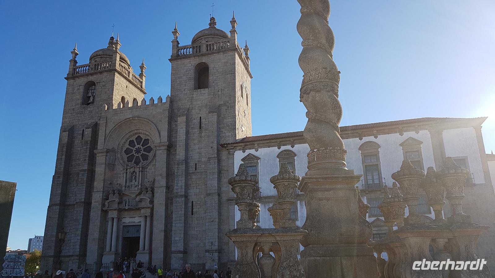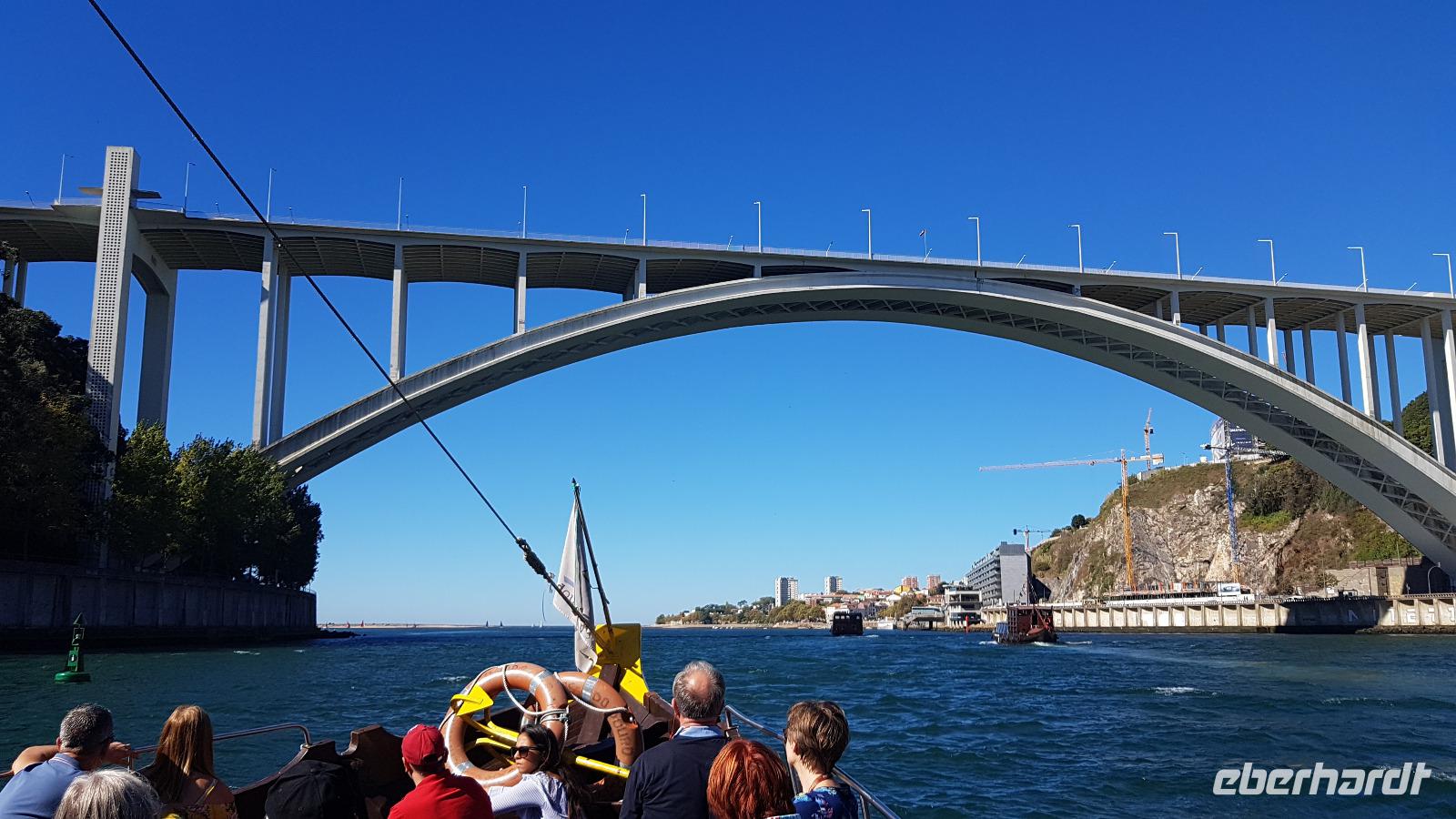 Frisch und ausgeruht starteten wir mit einem tollen Frühstück in den Tag. Heute hieß es "Porto kennenlernen", unsere erste Station war die Kathedrale. Doch zuvor erhielten wir noch unsere "Hörgeräte", wie Maria sie nennt und das erwies sich als ziemlich perfekt. Jeder bekam die Freiheit für eigene Blicke und viele Fotos ohne etwas von dem zu verpassen, was uns Maria so toll nahebringen konnte. Unser Busfahrer Alvaro brachte uns dann sicher in das alte Viertel und unterwegs erzählte uns Maria, warum es die Fliesen (oder Kacheln) - also die Azulejos an den Häusern gab. Viele Fassaden waren damit geschmückt, es ist aber auch ein Schutz vor dem Verfall, die Azulejos halten viele Jahre, länger als Putz und Farbe je halten könnten. Hier bewahrheitet sich eine alte Weisheit sagt Maria: "Wer sparen will kauft teuer". Die Azulejos sind zwar sehr teuer, aber die gesparten Kosten für Renovierungen summieren sich letztendlich. So erfahren wir quasi nebenbei viel über Land und Tradition und Maria verspricht uns, dass wir irgendwann am Ende unserer Reise das Wort "Azulejos" auch richtig aussprechen können ...Dann besuchen wir die Kathedrale und den Bischofssitz. In der Kathedrale wird gerade gebaut, wir können aber trotzdem einen kurzen Blick hineinwerfen. Umwerfend dann die Aussicht von hier oben! Durch die alten Gassen unterhalb der Kathedrale schlendern wir an Resten der alten Stadtmauer vorbei, an gigantischen Ficus (Gummibäumen), Marienschreinen in den Fenstern der Häuser, an neu gebauten und alten, fast verfallenen Häusern, an Läden und Lädchen vorbei. Unser nächstes Ziel ist der Börsenpalast, einst Börse und Handelsgericht, heute noch Sitz der Handelskammer. Wir betreten die Empfangshalle und sind beeindruckt, das riesige Glaskuppeldach läßt viel Licht in die reich geschmückte Halle hinein. Über die breite Treppe erreichen wir den ehemaligen Gerichtssaal und etliche Sitzungs- und Ausstellungsräume. Absolut beeindruckend dann jedoch der Salao Arabe, der arabische Saal- wie aus 1001er Nacht, ein Saal in einem Saal, überaus reich verziert, vergoldet und faszinierend. Nach einem letzten Blick in die Halle der Nationen, vorbei an der Bibliothek und den unvermeidlichen Souvenir-Shops verlassen wir den Palast und genießen in der Sonne den Blick auf die alte Markthalle und auf das Denkmal von Heinrich, dem Seefahrer. Mit Maria spazieren wir hinunter zum Douro, zum Fluß, der, aus den spanischen Gebirgen kommend, unweit von hier in den Atlantik mündet. Am gegenüberliegenden Ufer ist bereits die Stadt Gaia. Das Ufer ist gesäumt von Weinkellern- warum, das sollten wir später erfahren. Unser nächster Programmpunkt dann ist traumhaft schön: wir lernen Portos Altstadt vom Wasser des Douro aus kennen. Mit einem Schiff unterqueren wir die berühmten Brücken über den Douro und schippern sogar ein Stück flußabwärts Richtung Atlantik. Strahlender Sonnenschein begleitet uns und wir fühlen uns rundum wohl. Nach einer knappen Stunde heißt es aber zurück zum Bus, am Börsenpalast wartet Alvaro bereits auf uns. Er bringt uns hinauf zum Rathaus mit seinem riesigen Vorplatz, wir spazieren ein wenig durch die Gassen und verwinkelten Straßen, dann ist Zeit für einen Mittagsimbiss. Viele probieren eine Empfehlung von Maria: Francesinha, eigentlich eine Kleinigkeit für zwischendurch, bei dem Zusatz Speciale sollte man aber vorsichtig sein...