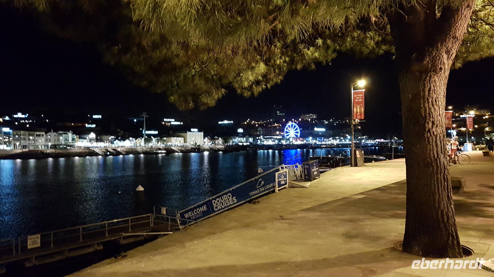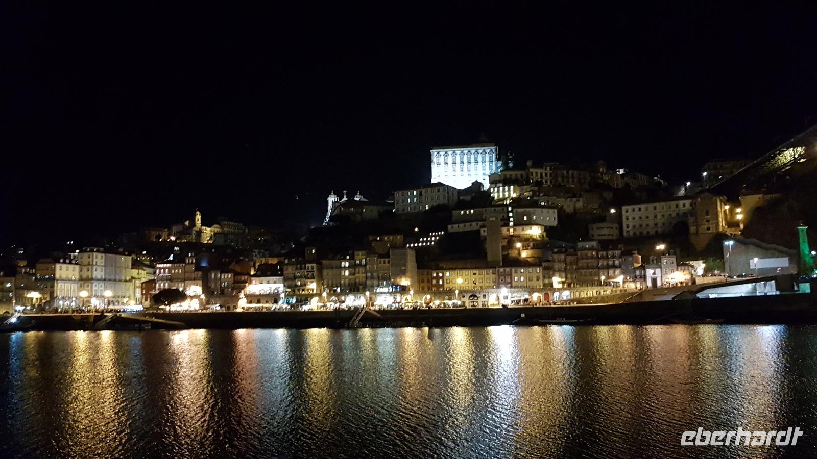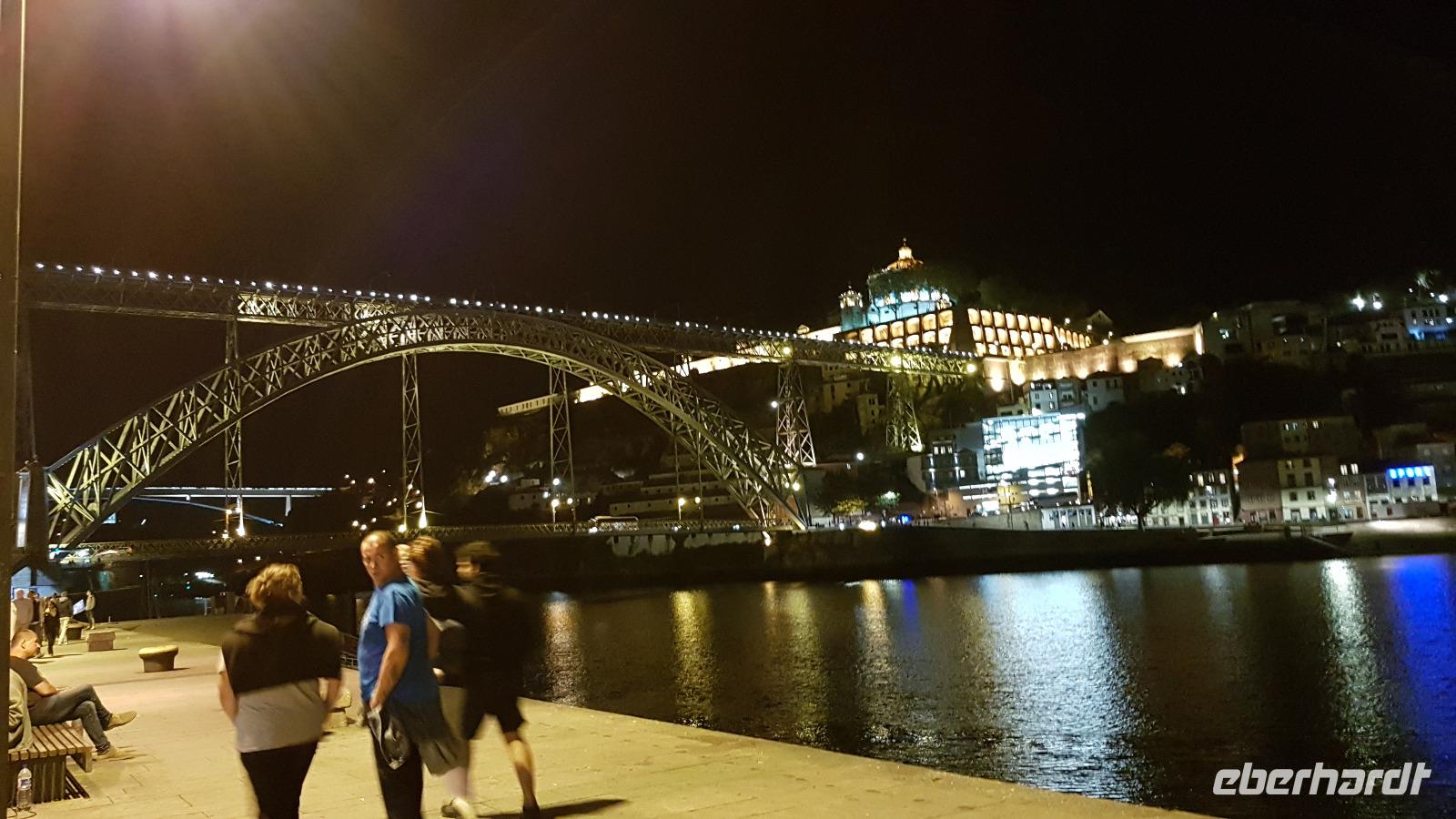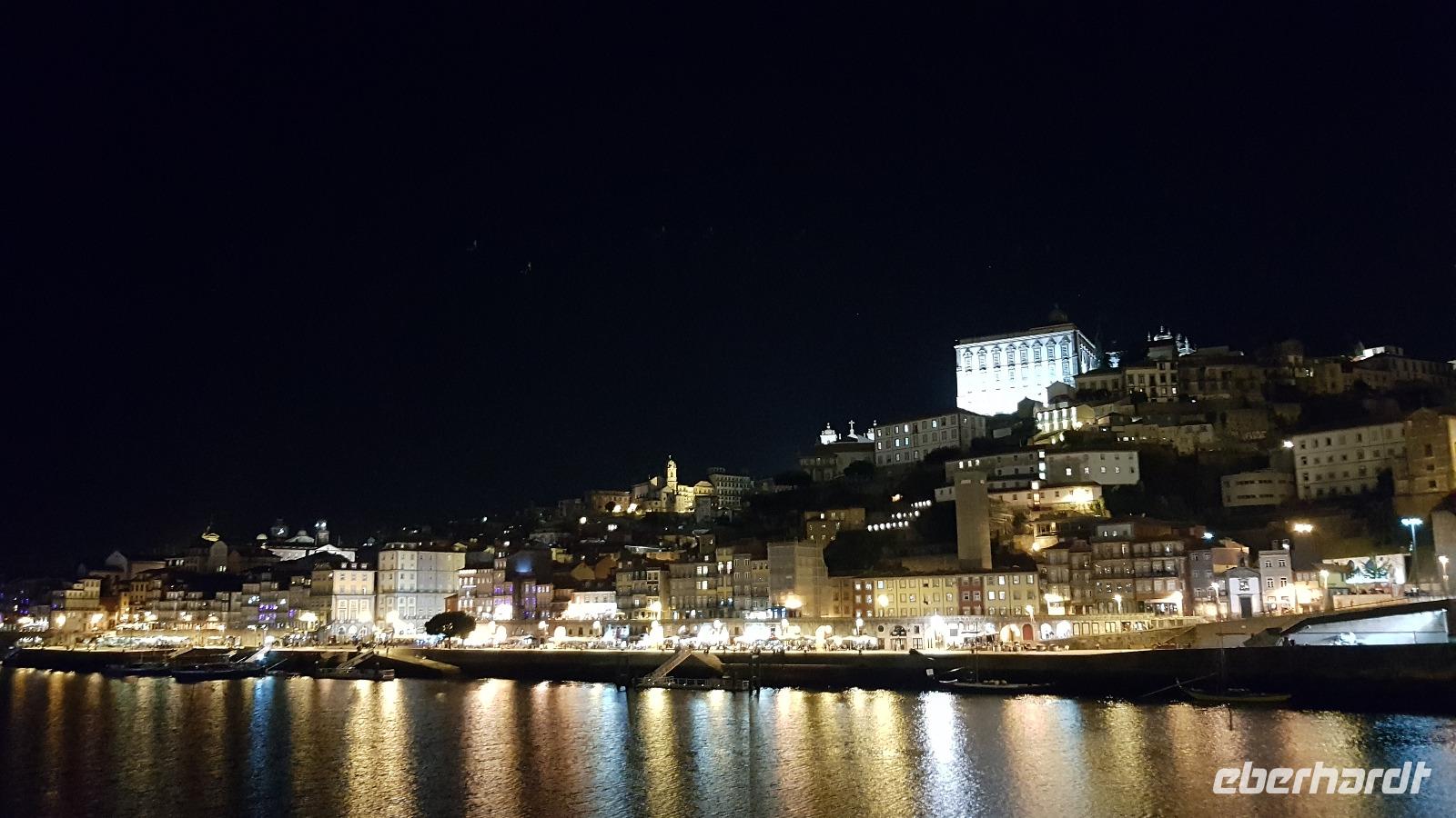 So vergeht die Zeit wir im Flug, die historische Straßenbahn, heute fast nur noch von Touristen genutzt, rumpelt über den Platz und wir starten schon wieder Richtung Fluß. Überqueren die Brücke und lernen dann bei "Burmester" das 1x1 des Portweines. Zuallererst, dass die Fluss-Seite in Porto viel mehr Sonne bekommt und die Seite in Gaia viel länger im Schatten bleibt- also der ideale Lagerplatz für Wein in den Felsen hier. Das Geheimnis des Portweines liegt darin, dass die Gärung am 3. Tag unterbrochen wird, hochprozentiges Weindestillat wird zugegeben, der verbliebene Zucker sorgt für die Süße und zusammen mit dem Weinbrand dafür, dass Portwein um die 20 % Alkohol hat. Das durften wir dann auch kosten: ein weißer und ein rubi warteten auf uns. WOW! Und nachdem das eine oder andere Fläschchen am Ende den Besitzer gewechselt hatte ging es gemütlich zurück zum Bus. Alvaro fuhr uns dann in einer ganz speziellen Panoramafahrt zurück. Wir folgten dem Douro bis zu seiner Mündung in den Atlantik, am Hafen dann durfte natürlich ein Fotostopp nicht fehlen und dann ging es zurück zum Hotel. Relaxen, Spazierengehen oder wieder in die Stadt- die Zeit bis zum Abendessen verbrachte jeder individuell. Alvaro fuhr uns wieder bis zum Börsenpalast und von hier aus spazierten wir durch die Blumengasse direkt zum Ufer des Duoro zum "Chez Lapin". Hier bekamen wir einen tollen Lachs serviert, dazu Wein und leckeres Obst als Dessert. Niemand wollte jetzt schon zurück ins Hotel, also verschoben wir die Rückfahrt und spazierten am Ufer entlang und über die Brücke hinüber nach Gaia. Das nächtliche Porto faszinierte uns und wir genossen diesen Anblick in vollen Zügen. Doch dann war es Zeit, Alvaro brachte uns mit einer kleinen nächtlichen "Lichterfahrt" durch die Szeneviertel der Studenten zurück zu unserem Casa da Musica. Hier verabschiedeten wir uns für heute voneinander- was für ein schöner Tag!