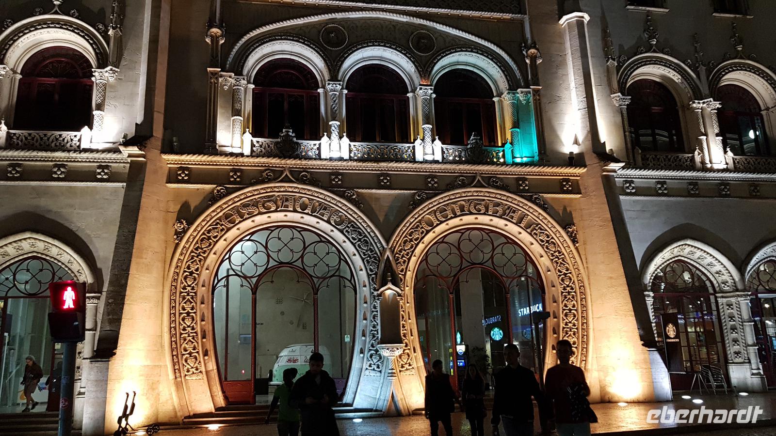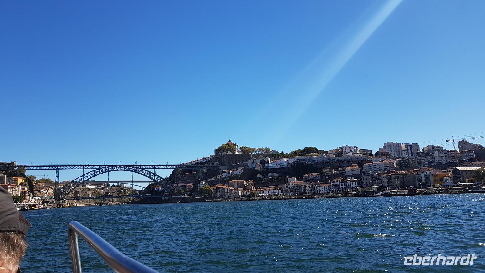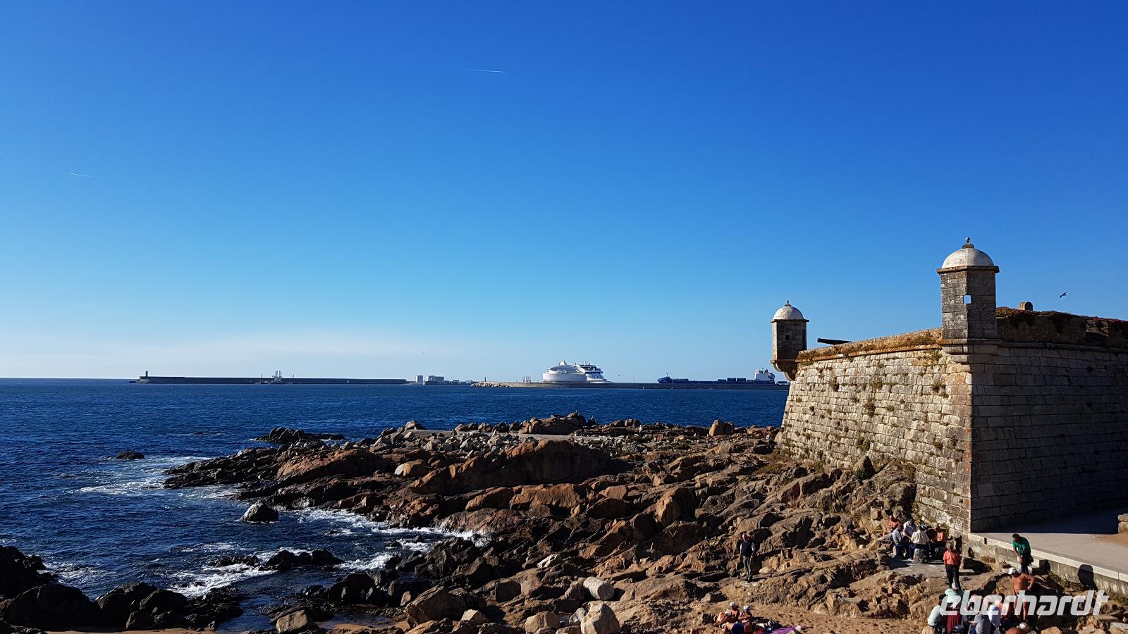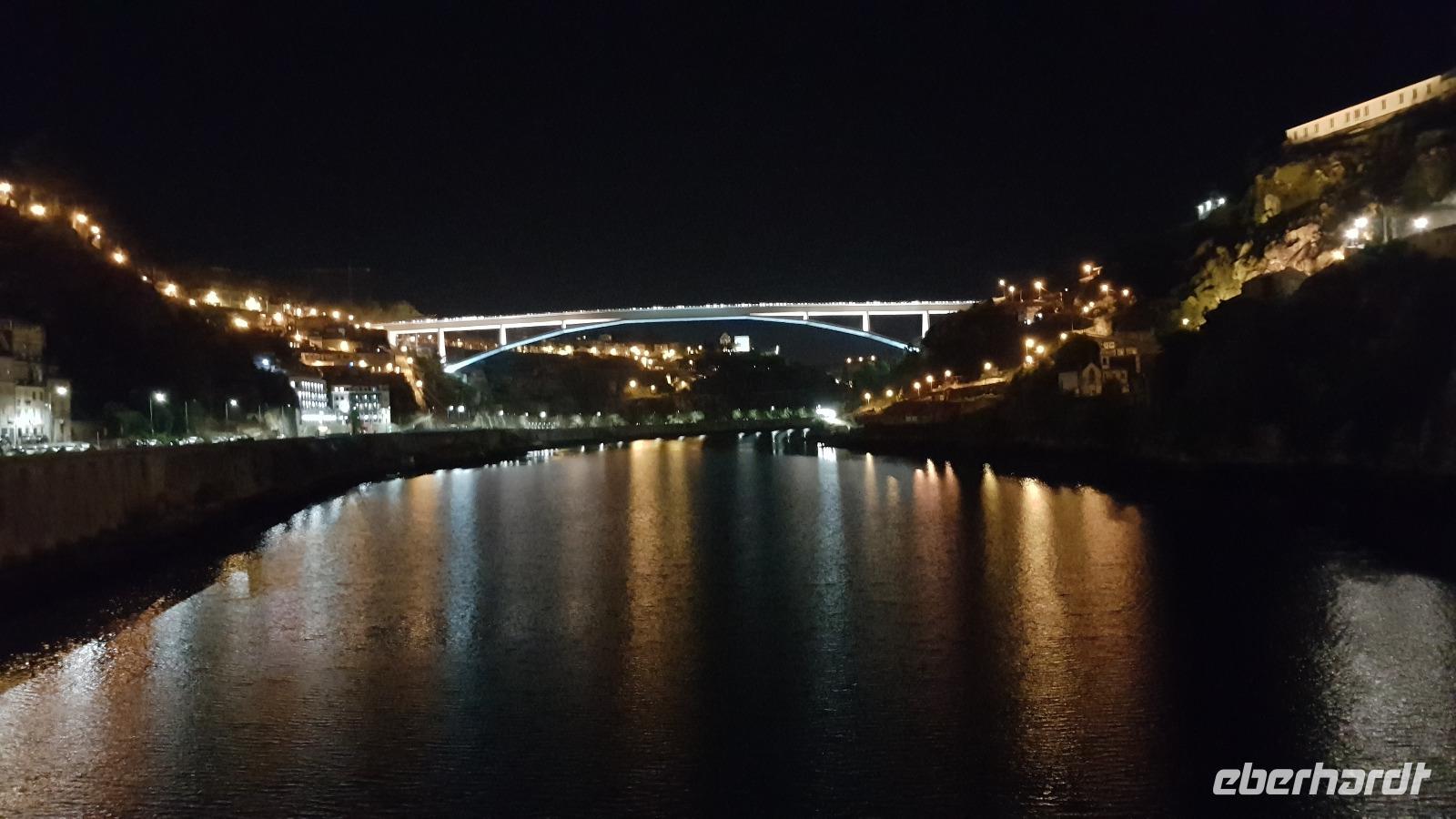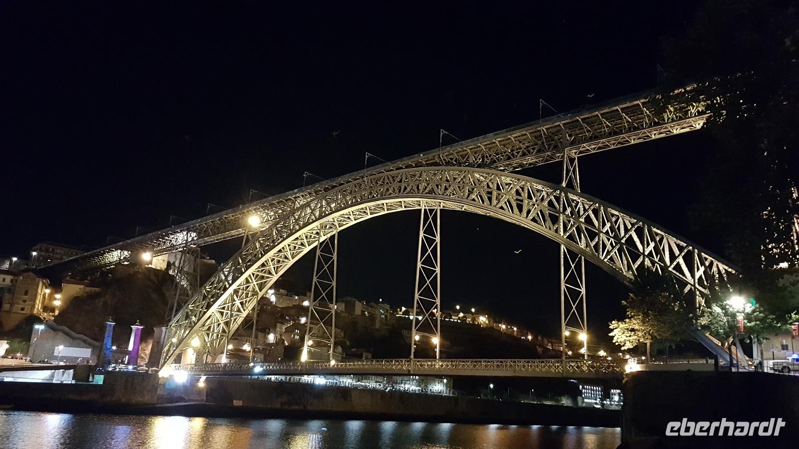 So vergeht die Zeit wir im Flug, die historische Straßenbahn, heute fast nur noch von Touristen genutzt, rumpelt über den Platz und wir starten schon wieder Richtung Fluß. Überqueren die Brücke und lernen dann bei "Burmester" das 1x1 des Portweines. Zuallererst, dass die Fluss-Seite in Porto viel mehr Sonne bekommt und die Seite in Gaia viel länger im Schatten bleibt- also der ideale Lagerplatz für Wein in den Felsen hier. Das Geheimnis des Portweines liegt darin, dass die Gärung am 3. Tag unterbrochen wird, hochprozentiges Weindestillat wird zugegeben, der verbliebene Zucker sorgt für die Süße und zusammen mit dem Weinbrand dafür, dass Portwein um die 20 % Alkohol hat. Das durften wir dann auch kosten: ein weißer und ein rubi warteten auf uns. WOW! Und nachdem das eine oder andere Fläschchen am Ende den Besitzer gewechselt hatte ging es gemütlich zurück zum Bus. Alvaro fuhr uns dann in einer ganz speziellen Panoramafahrt zurück. Wir folgten dem Douro bis zu seiner Mündung in den Atlantik, am Hafen dann durfte natürlich ein Fotostopp nicht fehlen und dann ging es zurück zum Hotel. Relaxen, Spazierengehen oder wieder in die Stadt- die Zeit bis zum Abendessen verbrachte jeder individuell. Alvaro fuhr uns wieder bis zum Börsenpalast und von hier aus spazierten wir durch die Blumengasse direkt zum Ufer des Duoro zum "Chez Lapin". Hier bekamen wir einen tollen Lachs serviert, dazu Wein und leckeres Obst als Dessert. Niemand wollte jetzt schon zurück ins Hotel, also verschoben wir die Rückfahrt und spazierten am Ufer entlang und über die Brücke hinüber nach Gaia. Das nächtliche Porto faszinierte uns und wir genossen diesen Anblick in vollen Zügen. Doch dann war es Zeit, Alvaro brachte uns mit einer kleinen nächtlichen "Lichterfahrt" durch die Szeneviertel der Studenten zurück zu unserem Casa da Musica. Hier verabschiedeten wir uns für heute voneinander- was für ein schöner Tag!