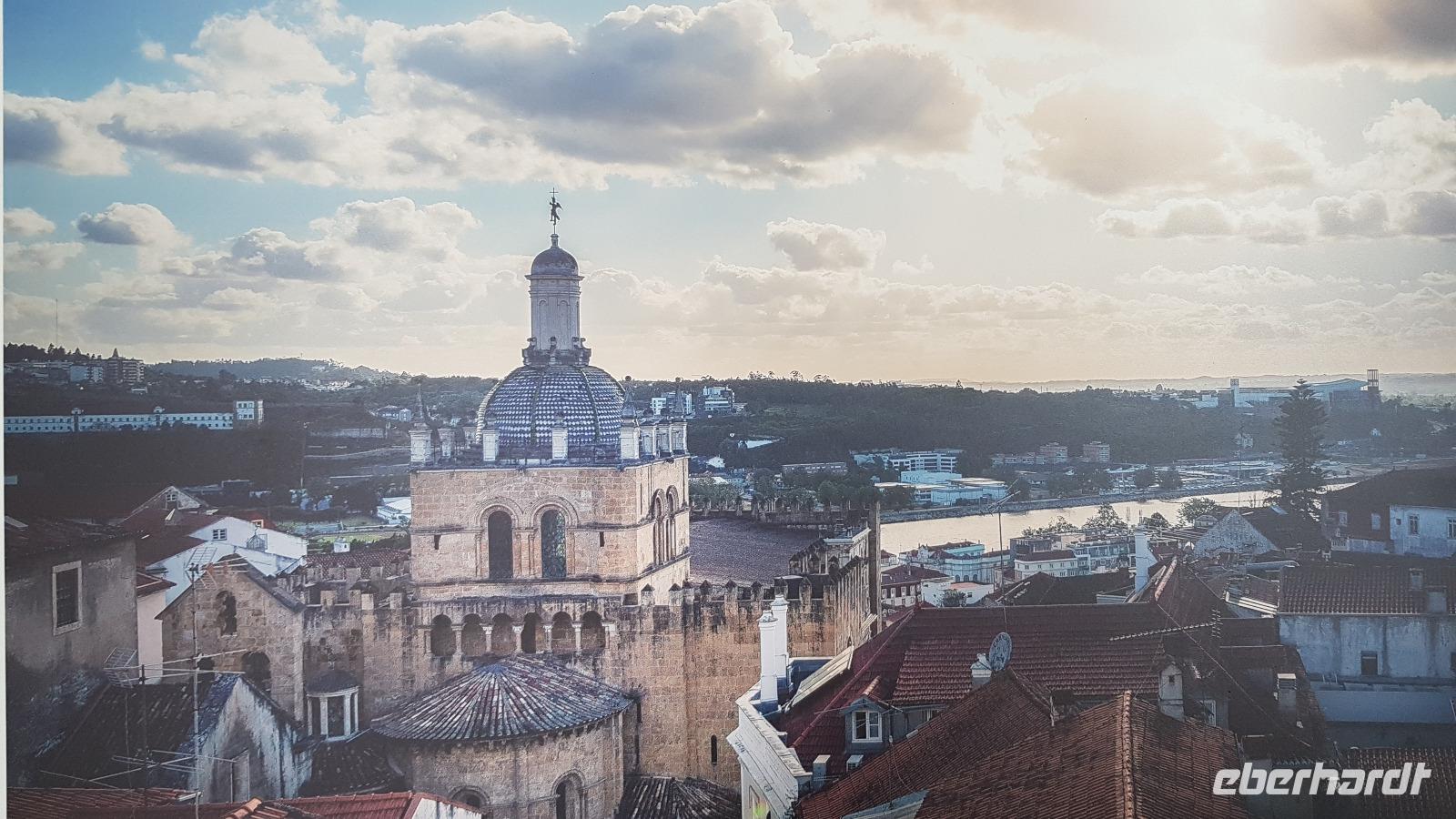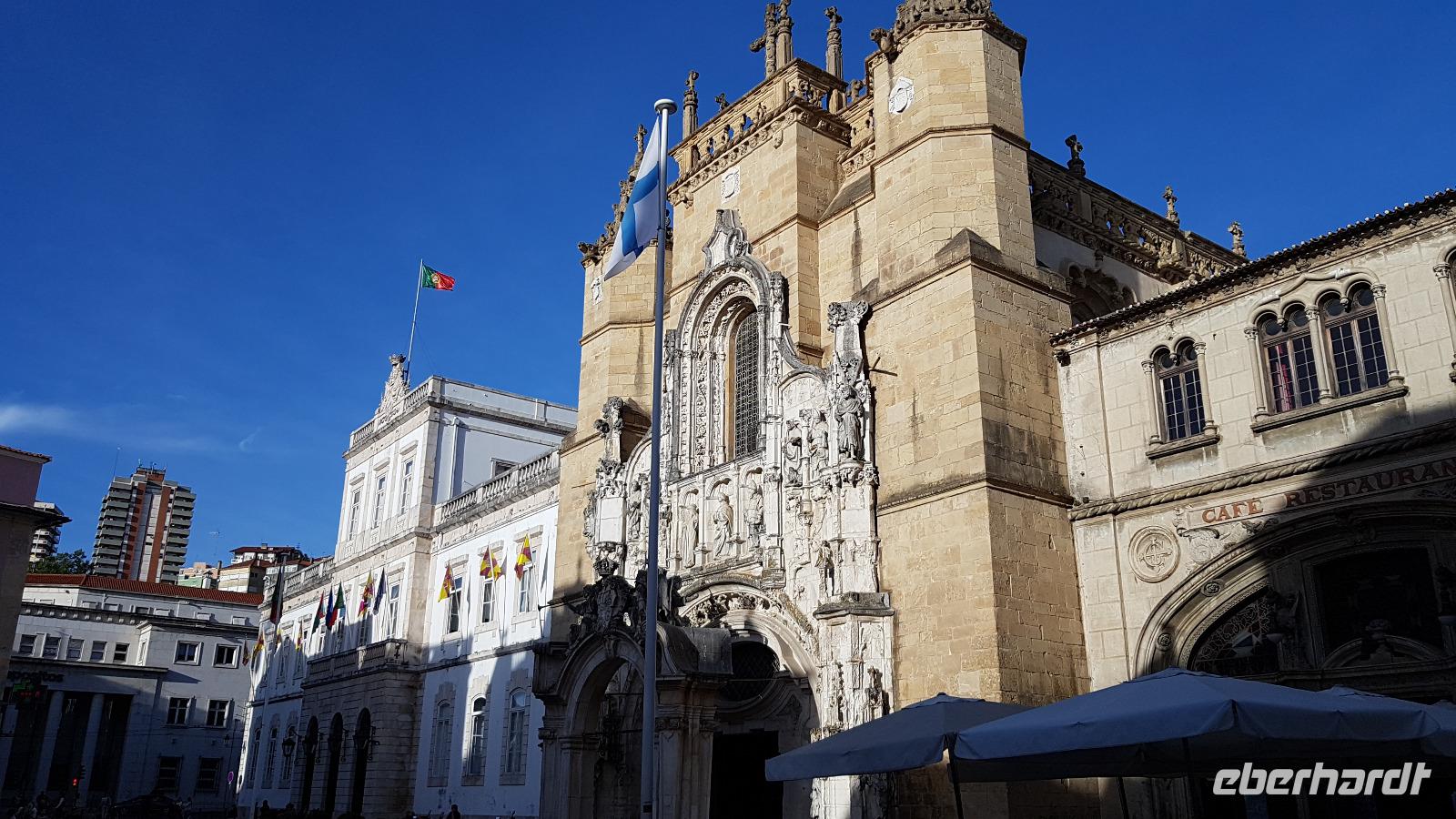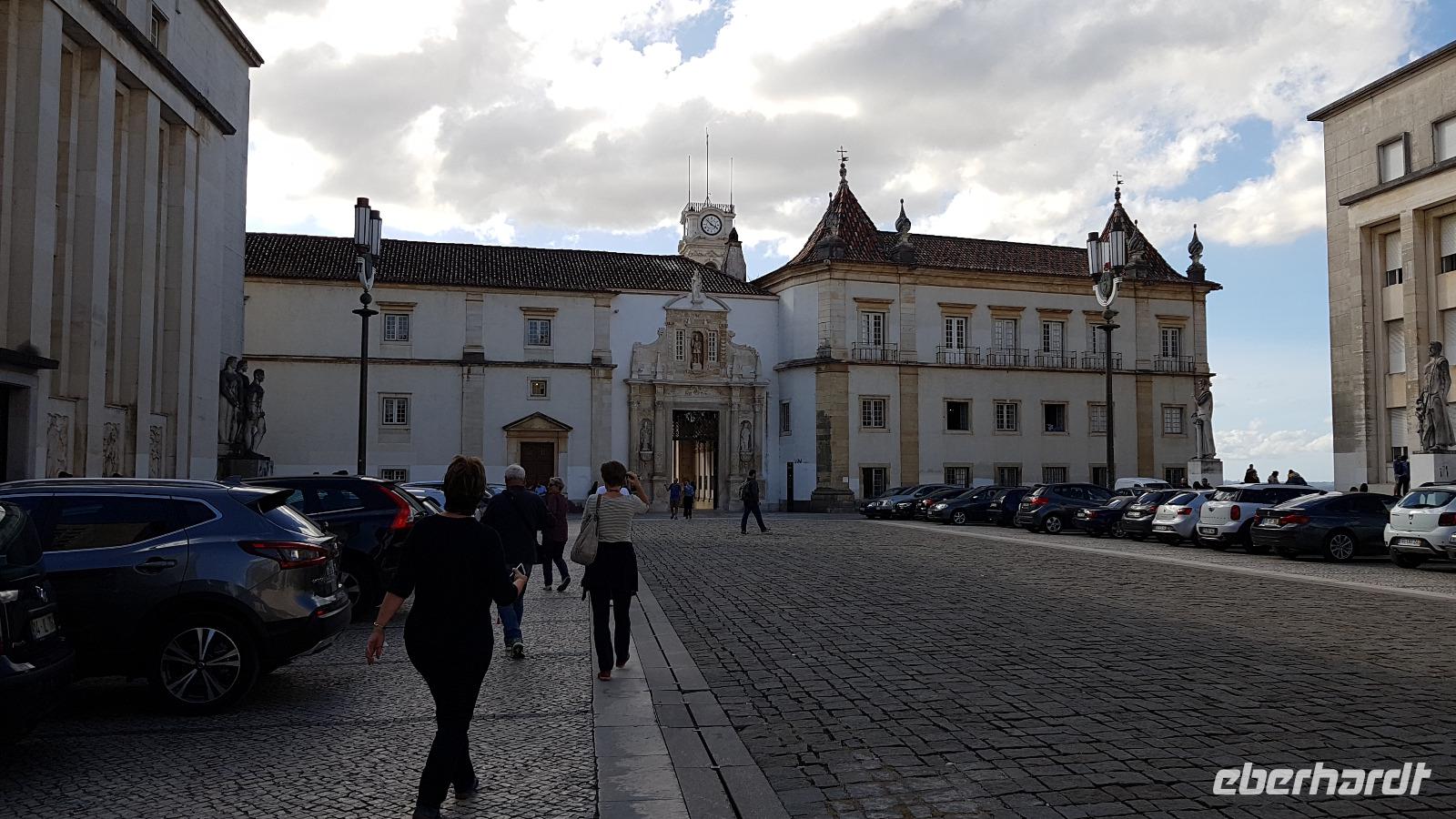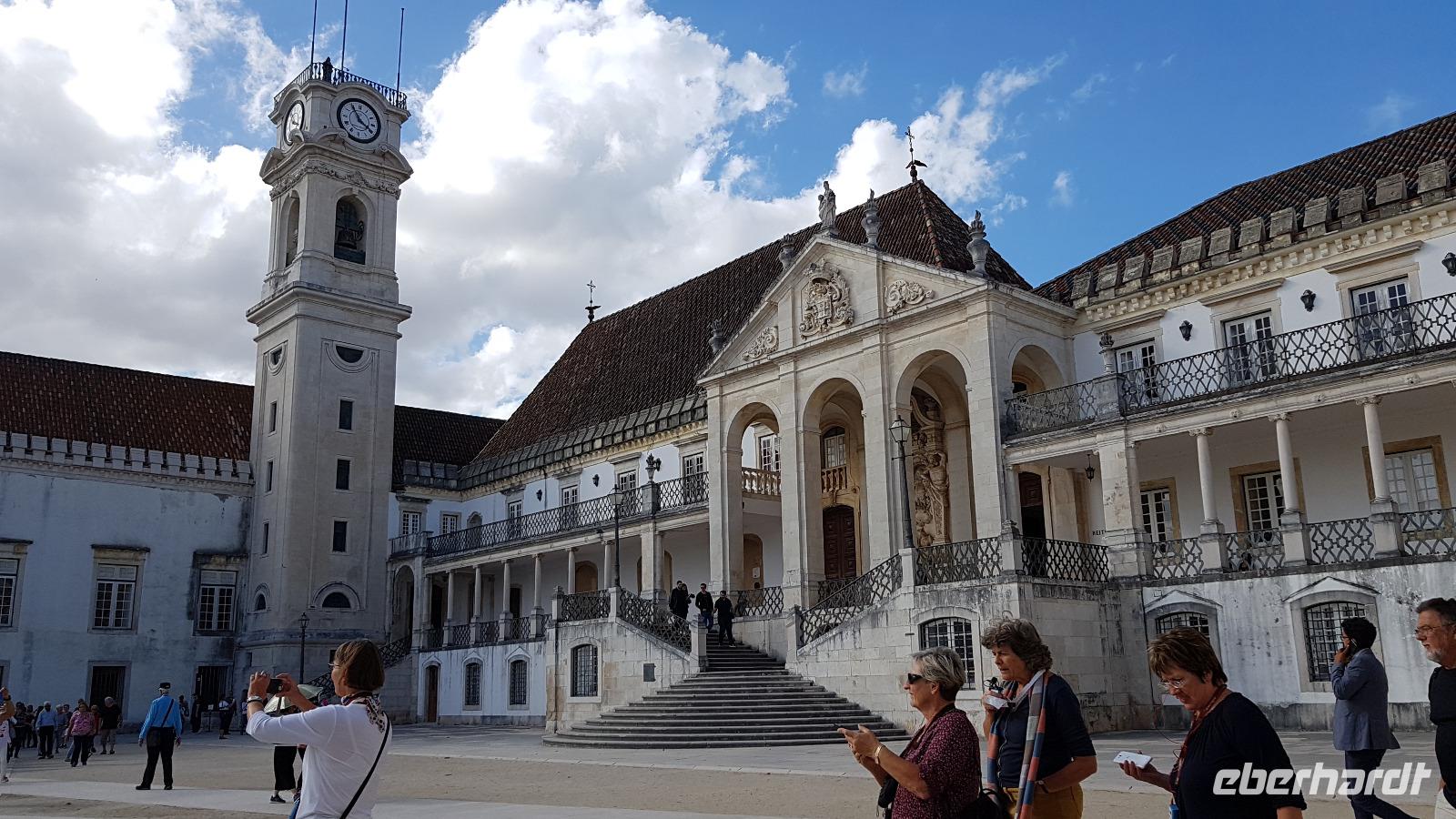 Natürlich wollen wir die berühmte Bibliothek der Universität besuchen, doch vorher ist Zeit für einen späten Mittagsimbiss. Wir staunen über riesige Baisser in den Auslagen, entscheiden uns dann aber doch lieber für eine kleine Mittagsmahlzeit. Punkt 16 Uhr sind wir dann überpünktlich auf dem Universitätsgelände und an der Bibliothek. Maria erzählt uns, warum der Turm hier die "Ziege" genannt wird: er regelte das Leben der Studenten. Sie wohnten außerhalb der Universitätsgebäude und der Turm kündete den Lernbeginn an und nach dem Läuten abends hatten Studenten nichts mehr auf den Straßen zu suchen...Unser Ziel ist aber die berühmte Bibliothek. Mehr als 50.000 Bände lagern hier in Räumen, ausgekleidet mit von Gold überzogenem Ebenholz, vergoldeten Wappen und Kronen über jedem Portal. Wir sind beeindruckt und folgen Maria auf einem Rundgang durch die Hallen und Gänge, die der König D. João III. der Universität überlassen hatte. Den Prunksaal können wir leider nicht besichtigen, hier findet gerade die Verteidigung einer Doktorarbeit statt. Fotos vom Universitätsplatz folgen und dann spazieren wir zur Kathedrale. Sie stammt tatsächlich aus der Gründungszeit Portugals und wir staunen, dass diese Größe und Höhe im romanischen Baustil möglich waren. Dann spazieren wir weiter durch die Gassen und "Studentenrepubliken", bewundern eine "portugiesische Gitarre" am Stadttor und erreichen schließlich die Kirche de Santa Cruz. Hier befinden sich im Inneren wunderschöne Azulejos, da aber gerade eine Messe gelesen wird bleiben wir nur kurz und stören nicht weiter. Mit unserem Bus geht es dann ins Hotel "Dona Ines" und hier verabschieden wir uns mit einem Applaus von Alvaro, unserem Busfahrer. Am Abend wartet ein gutes Buffett auf uns und mit einem Gläschen Wein klingt der Abend aus.